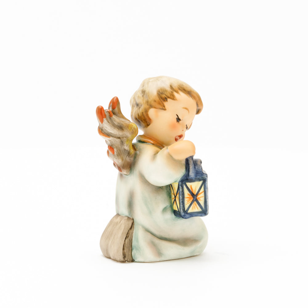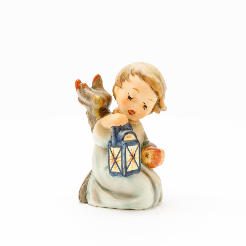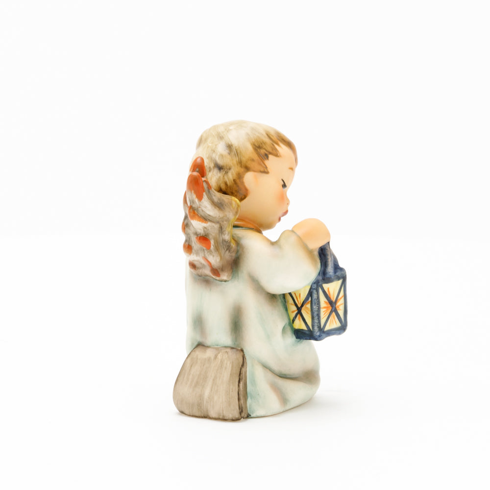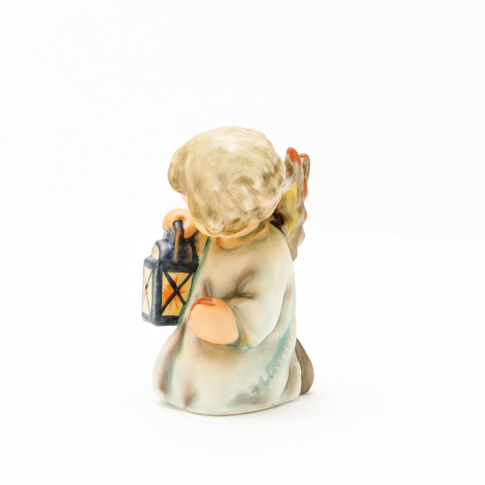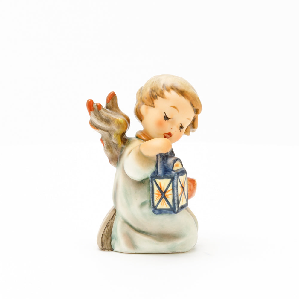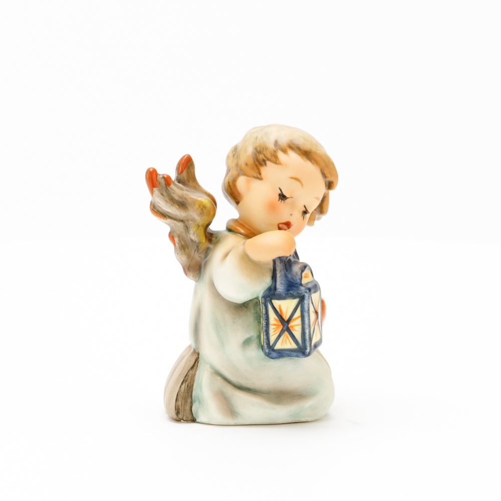 Mit der Laterne in der Hand sorgt der kleine Engel aus der Hummel Manufaktur Rödental für eine behagliche Stimmung. Der kniende Engel kümmert sich sorgsam um sein kleines Licht, damit es nicht erlischt. Diese Figur wurde im Jahr 1958 von Reinhold Unger modelliert und war ab 1972 auf dem amerikanischen Markt erhältlich. Zusammen mit der Hummel 358, "Kniender Engel mit Kerze" (HUM 358), und "Sitzender Engel mit Horn" (HUM 359) bilden die drei Engel ein hübsches Trio.