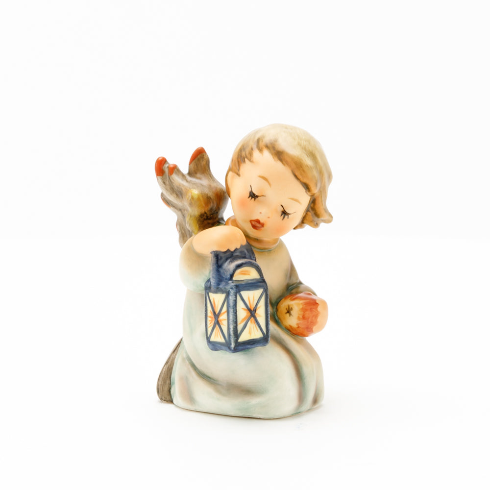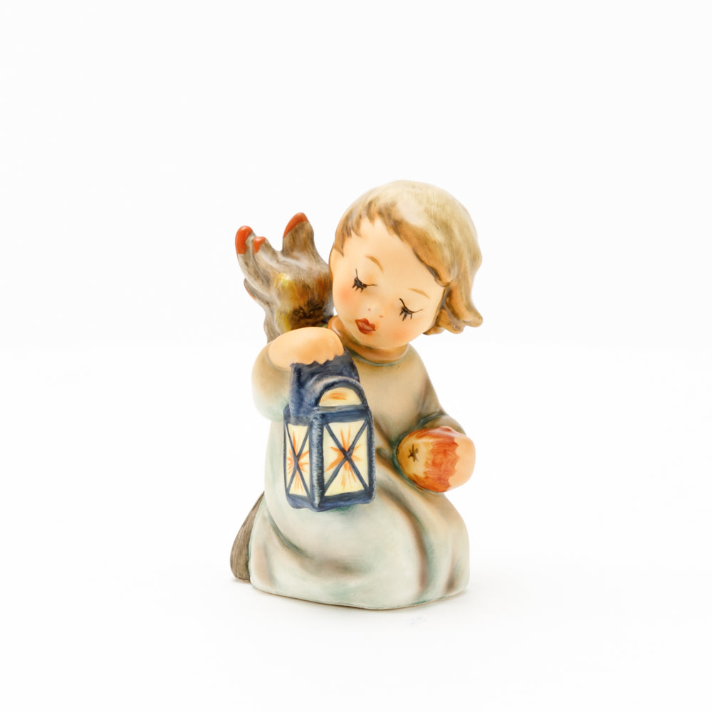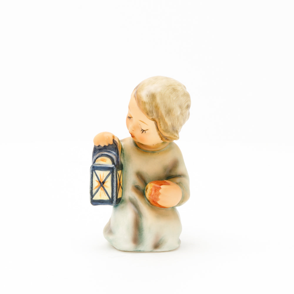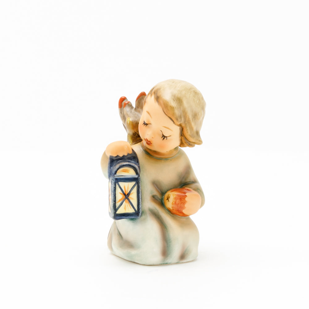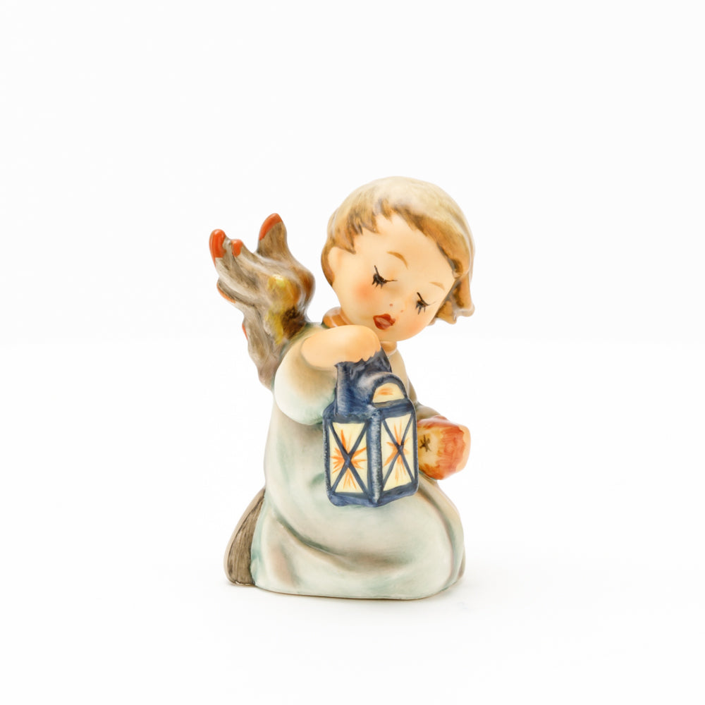 Mit der Laterne in der Hand sorgt der kleine Engel aus der Hummel Manufaktur Rödental für eine behagliche Stimmung. Der kniende Engel kümmert sich sorgsam um sein kleines Licht, damit es nicht erlischt. Diese Figur wurde im Jahr 1958 von Reinhold Unger modelliert und war ab 1972 auf dem amerikanischen Markt erhältlich. Zusammen mit der Hummel 358, "Kniender Engel mit Kerze" (HUM 358), und "Sitzender Engel mit Horn" (HUM 359) bilden die drei Engel ein hübsches Trio.