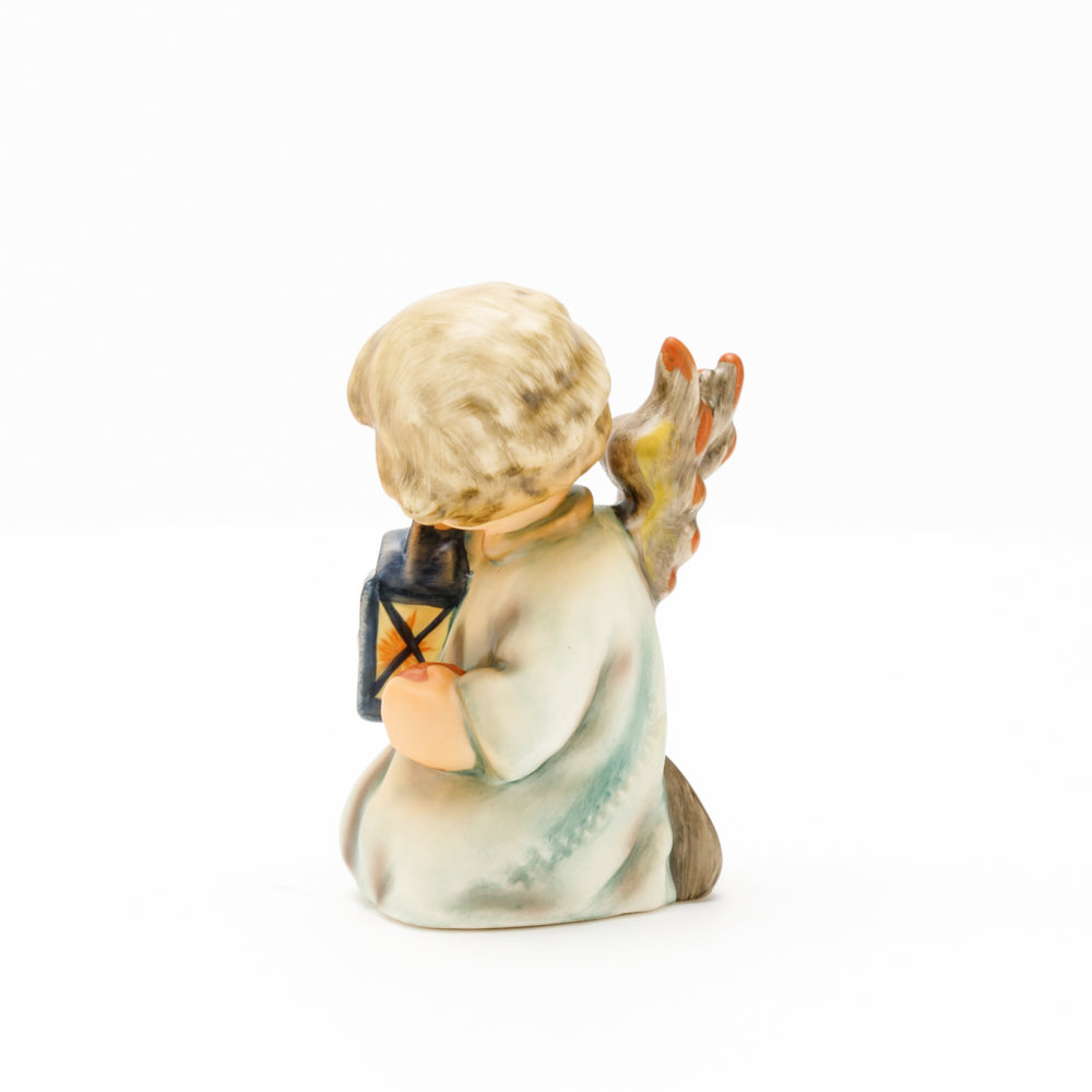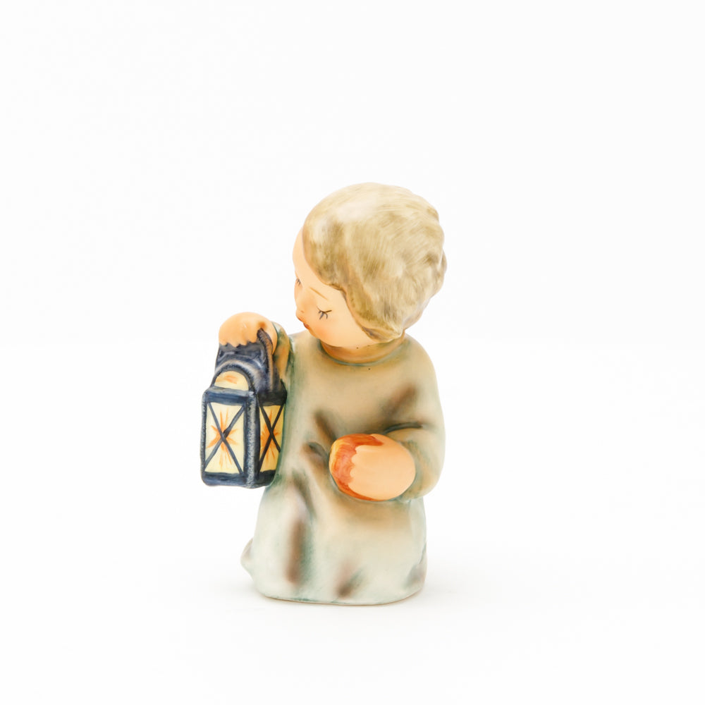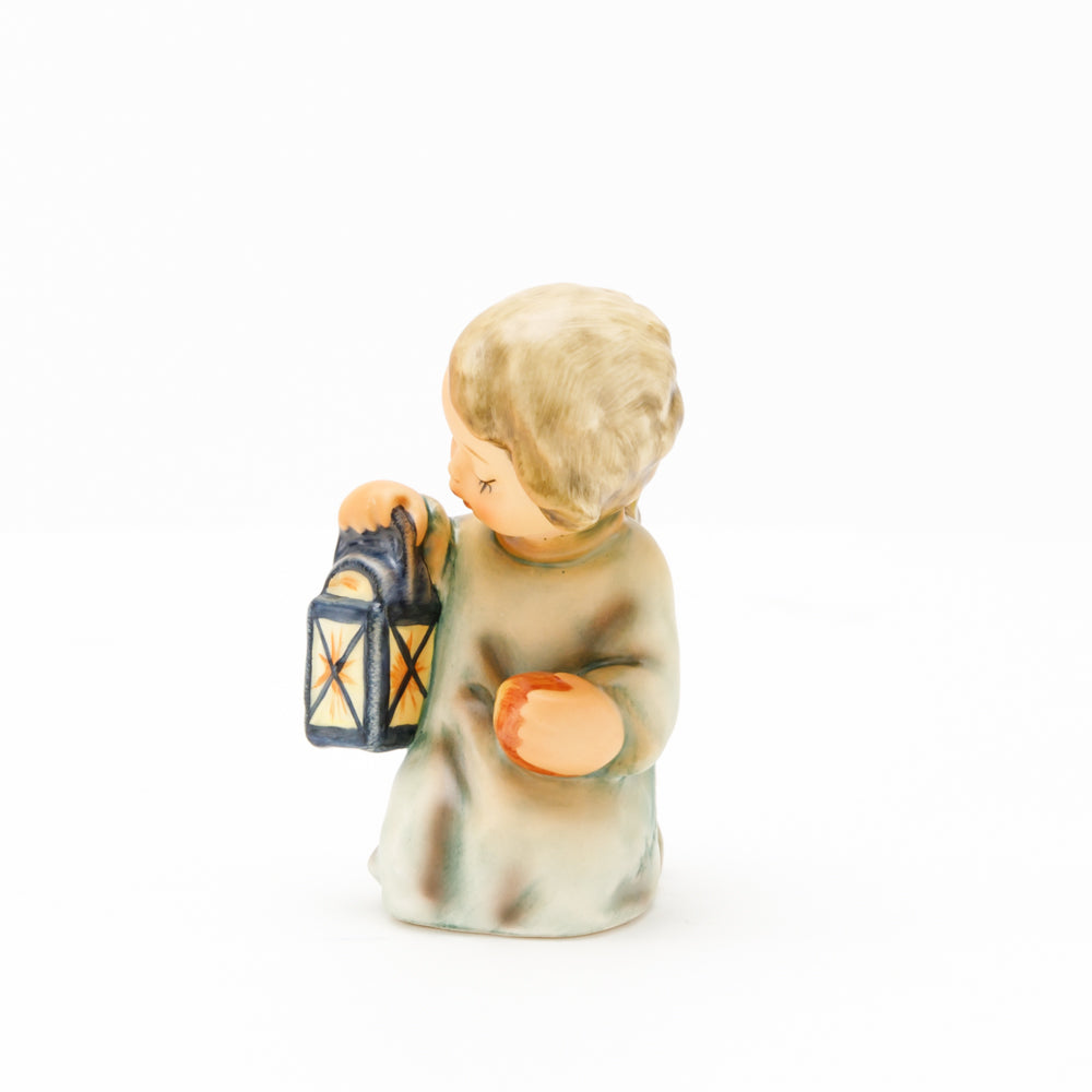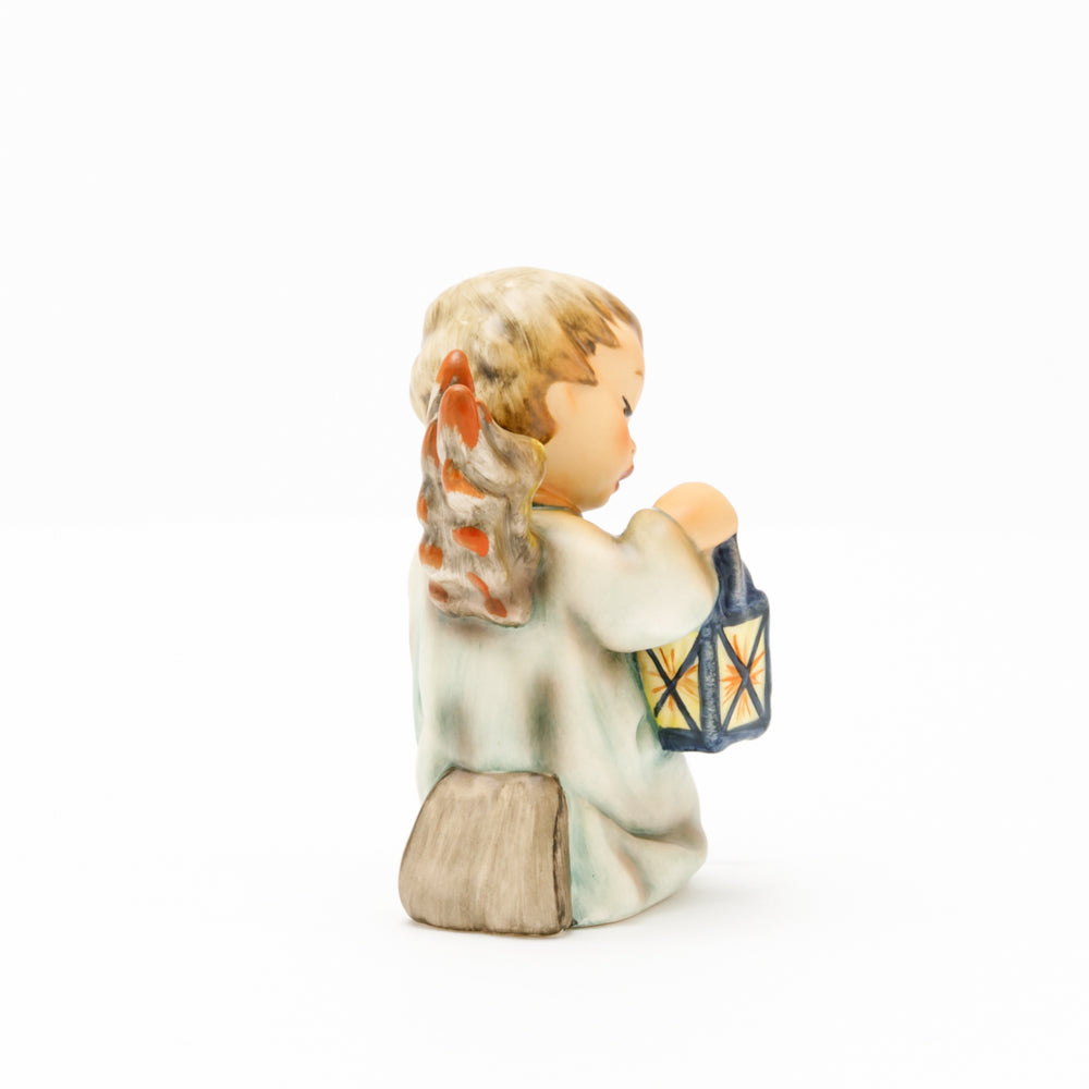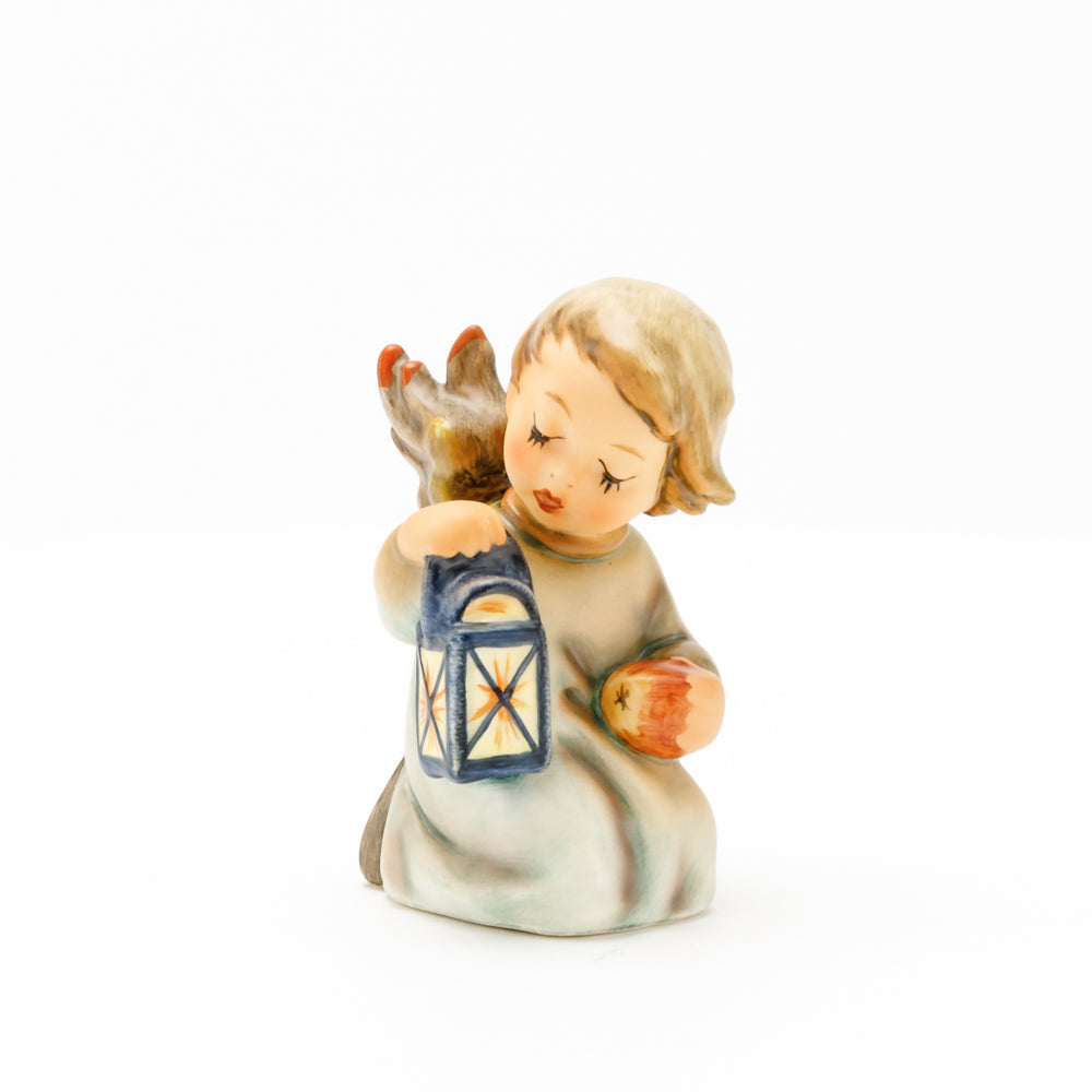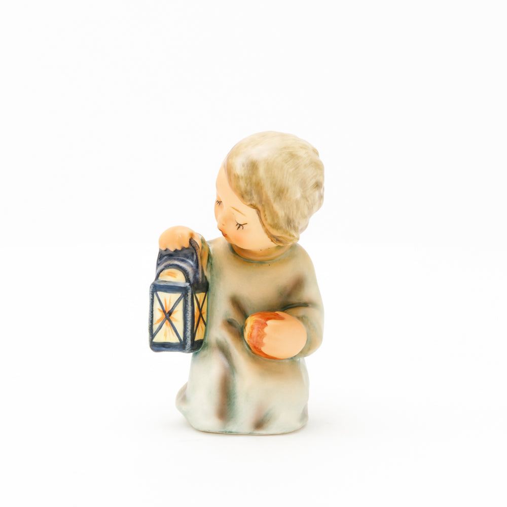 Mit der Laterne in der Hand sorgt der kleine Engel aus der Hummel Manufaktur Rödental für eine behagliche Stimmung. Der kniende Engel kümmert sich sorgsam um sein kleines Licht, damit es nicht erlischt. Diese Figur wurde im Jahr 1958 von Reinhold Unger modelliert und war ab 1972 auf dem amerikanischen Markt erhältlich. Zusammen mit der Hummel 358, "Kniender Engel mit Kerze" (HUM 358), und "Sitzender Engel mit Horn" (HUM 359) bilden die drei Engel ein hübsches Trio.