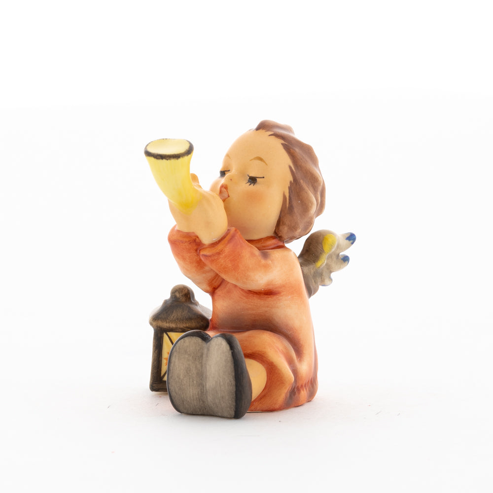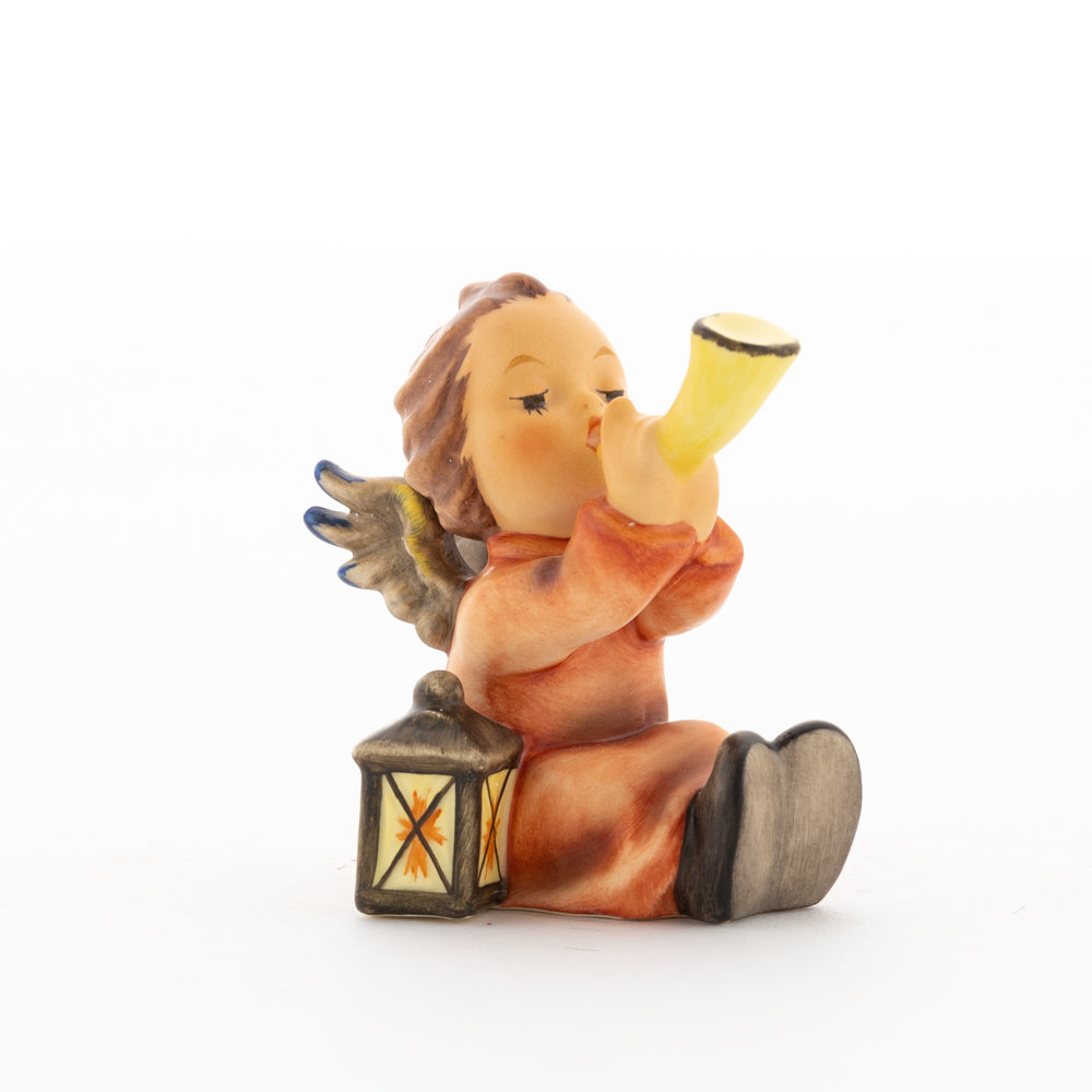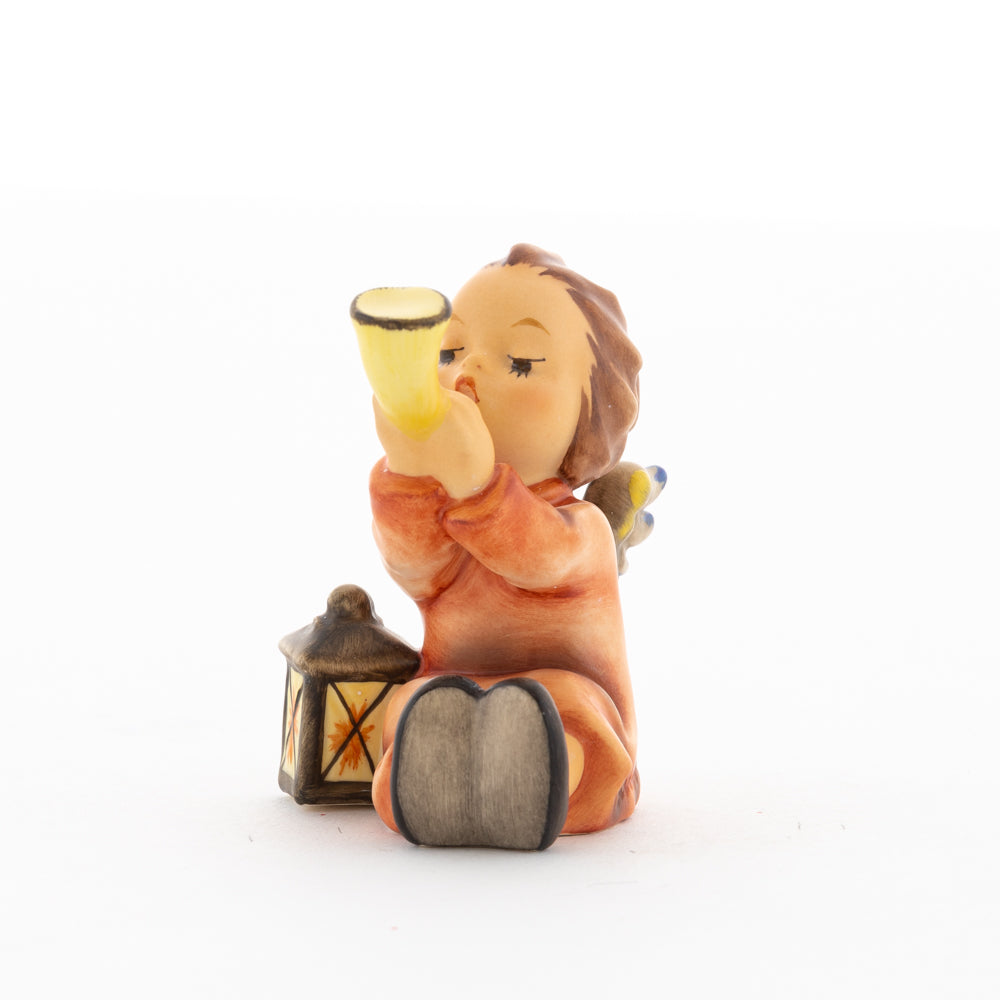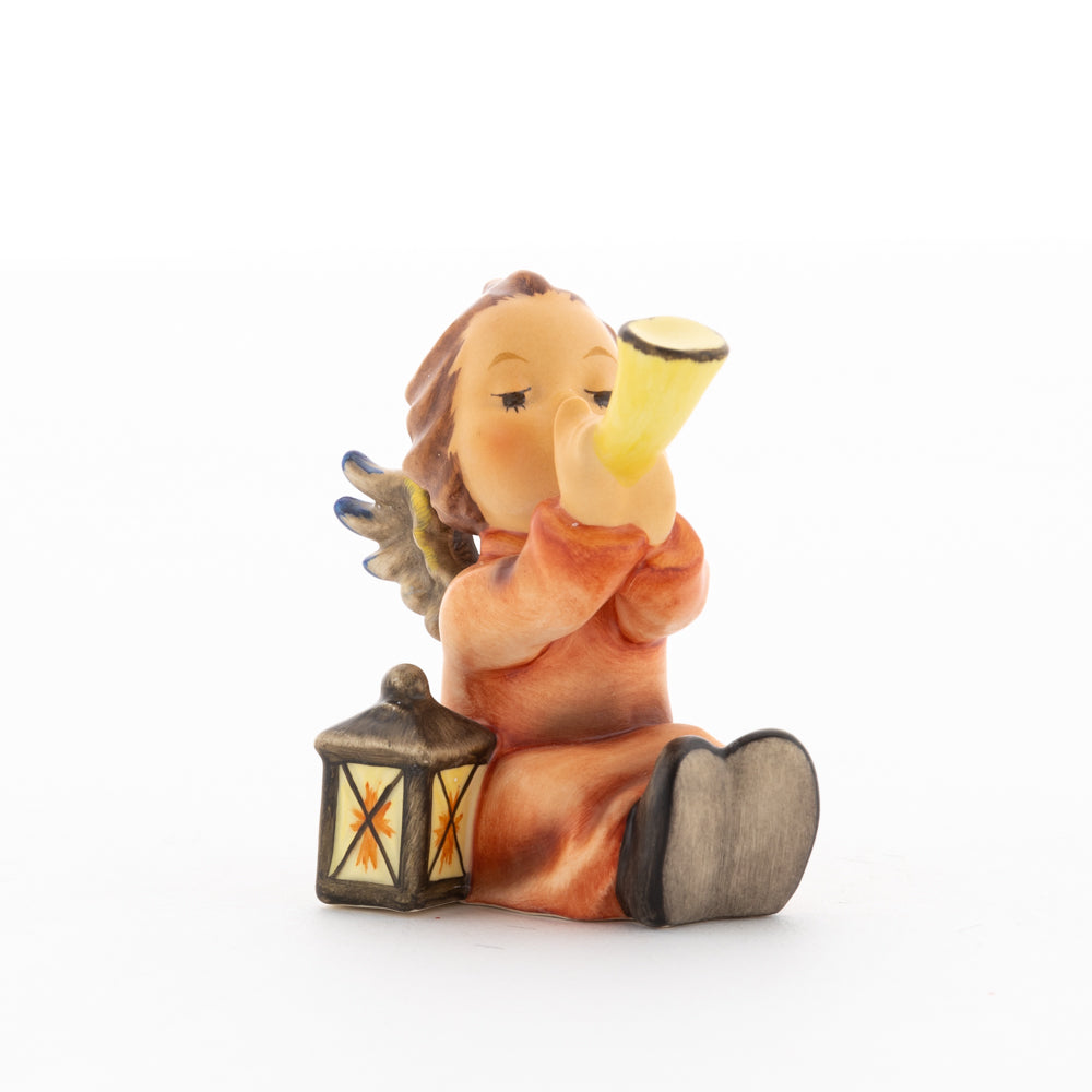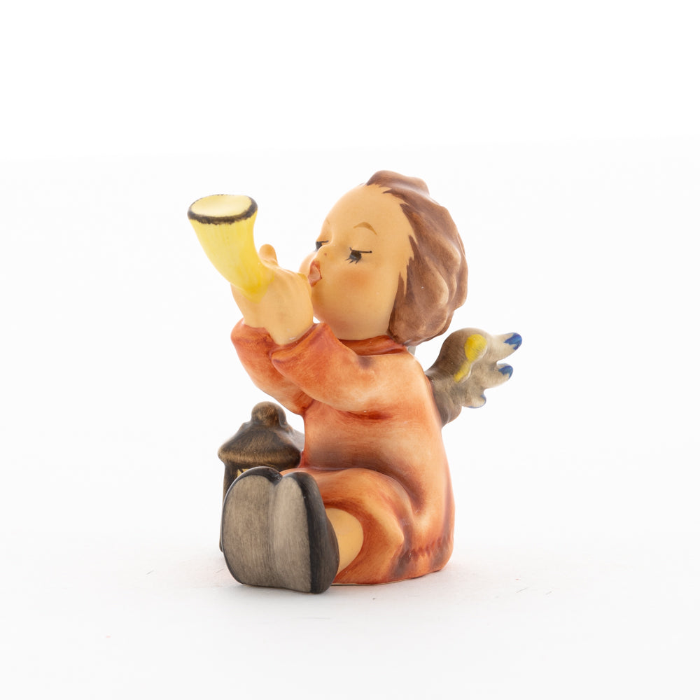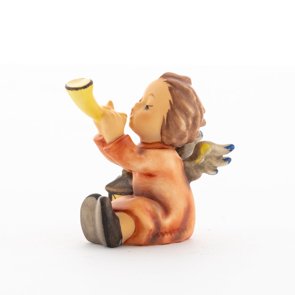 Der kleine Engel bläst ins Horn! Jesus Christus ist geboren! Ein jeder soll es wissen, ein jeder soll es hören. Voller Konzentration bläst unser Engelchen zum Wunder der Heiligen Nacht und vergisst alles um sich herum. Modelliert wurde der musikalische Verkünder im Jahr 1972 von Reinhold Unger. Zusammen mit der Hummel 358, Kniender Engel mit Kerze, und der Hummel 357, Kniender Engel mit Laterne, bilden die drei Engel ein hübsches Trio.