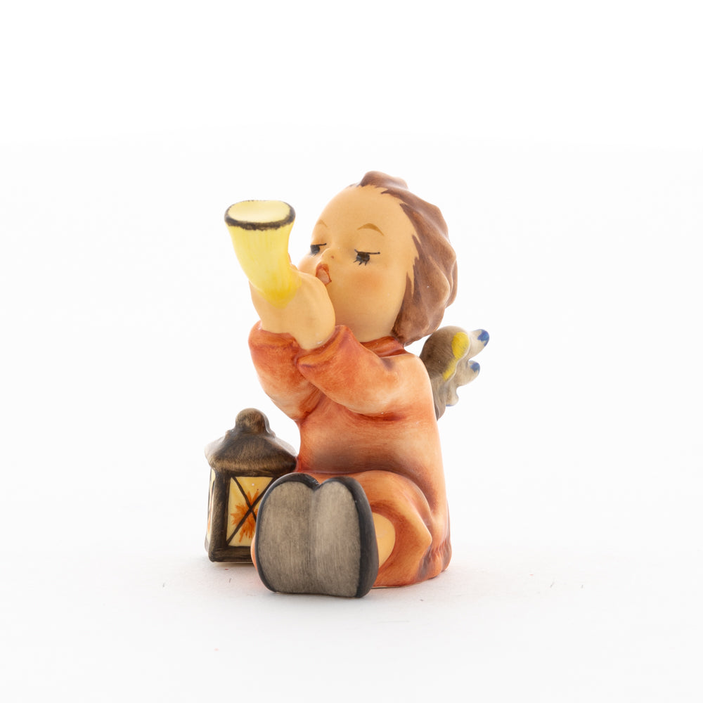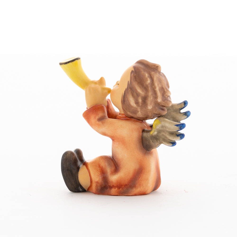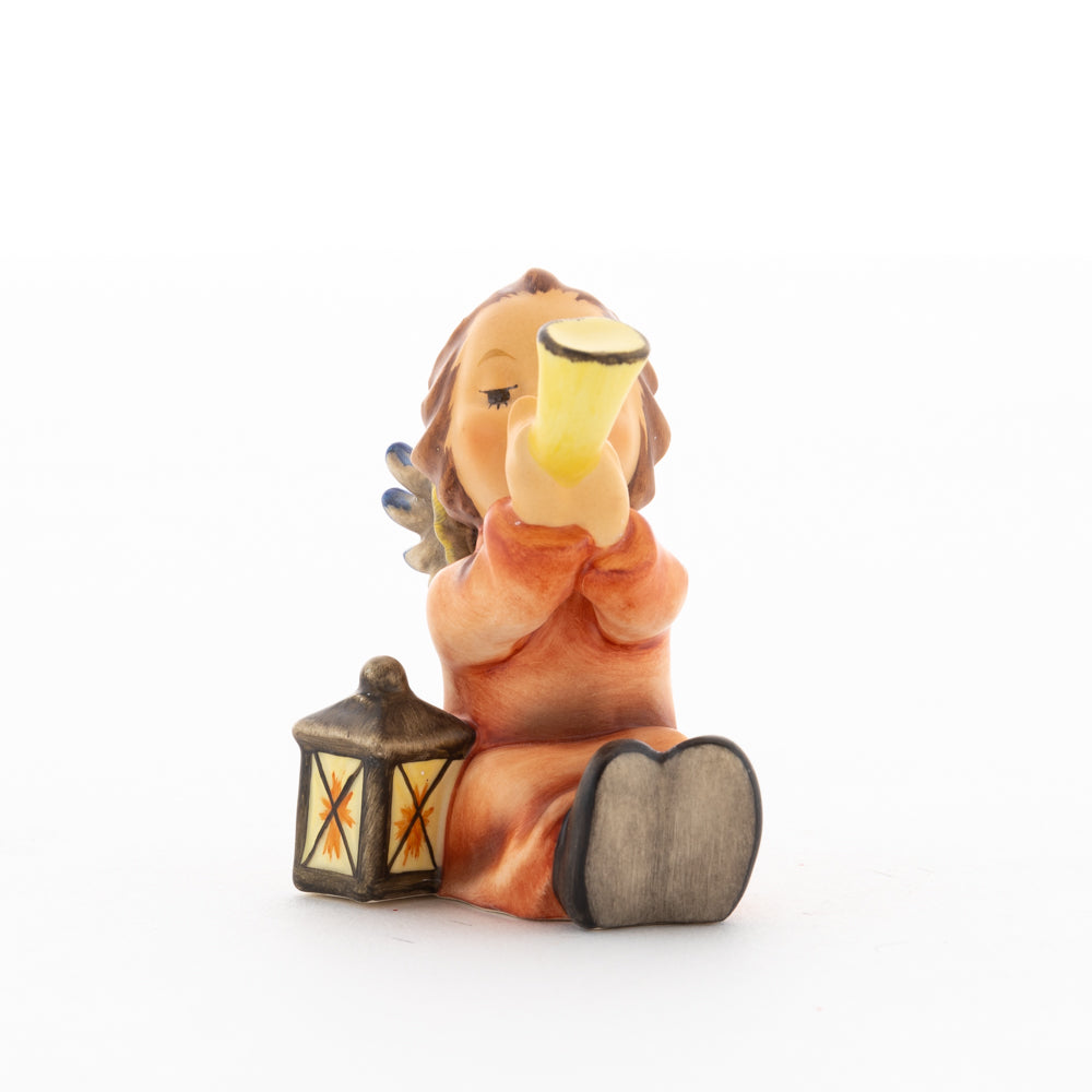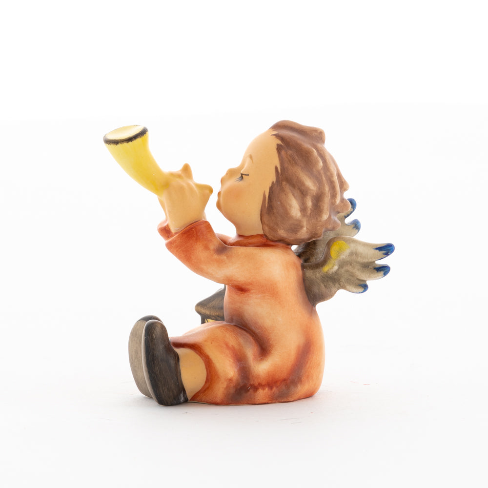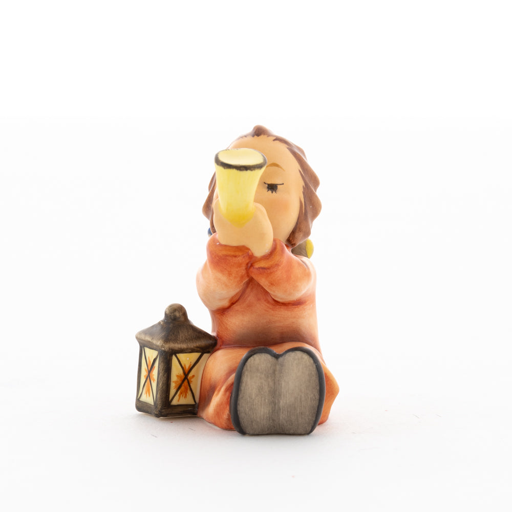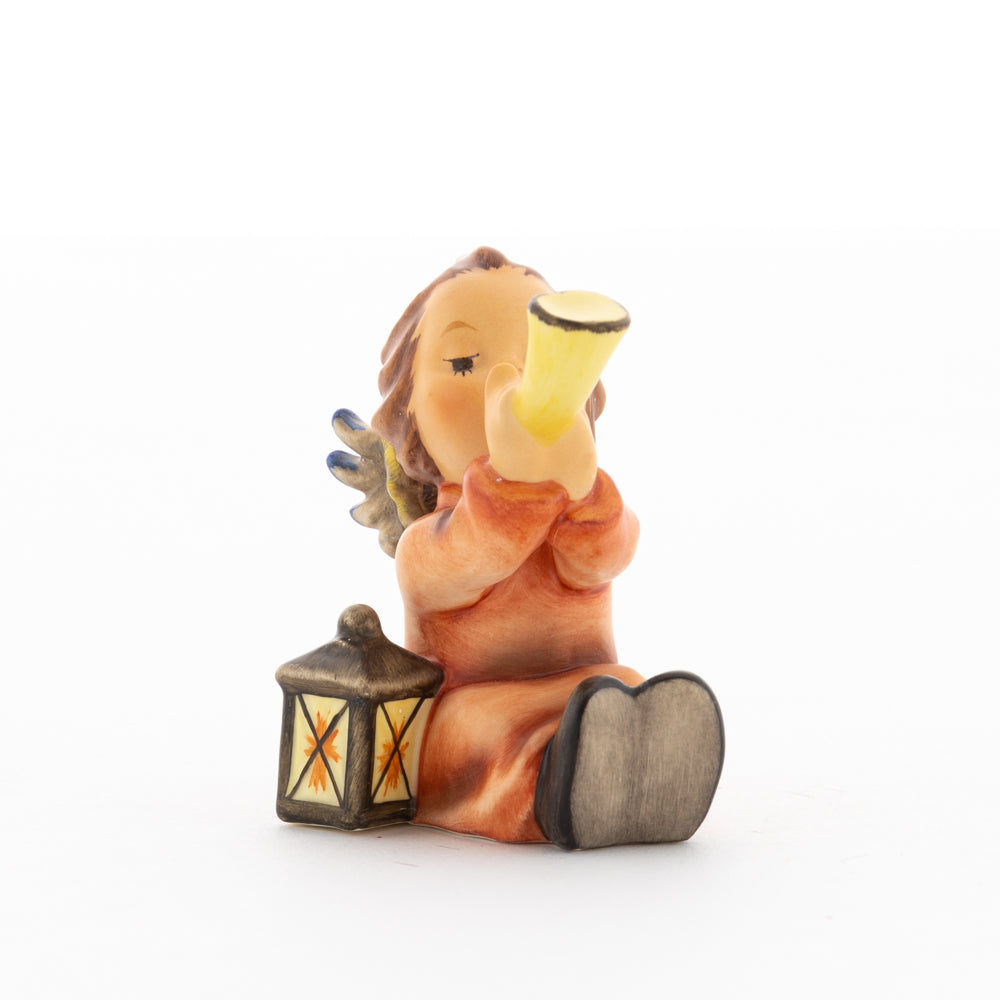Der kleine Engel bläst ins Horn! Jesus Christus ist geboren! Ein jeder soll es wissen, ein jeder soll es hören. Voller Konzentration bläst unser Engelchen zum Wunder der Heiligen Nacht und vergisst alles um sich herum. Modelliert wurde der musikalische Verkünder im Jahr 1972 von Reinhold Unger. Zusammen mit der Hummel 358, Kniender Engel mit Kerze, und der Hummel 357, Kniender Engel mit Laterne, bilden die drei Engel ein hübsches Trio.