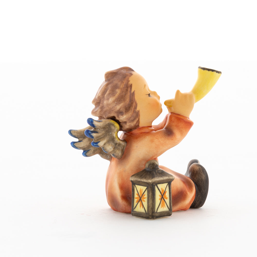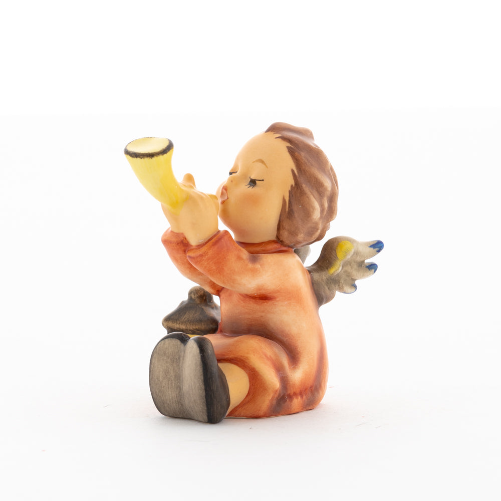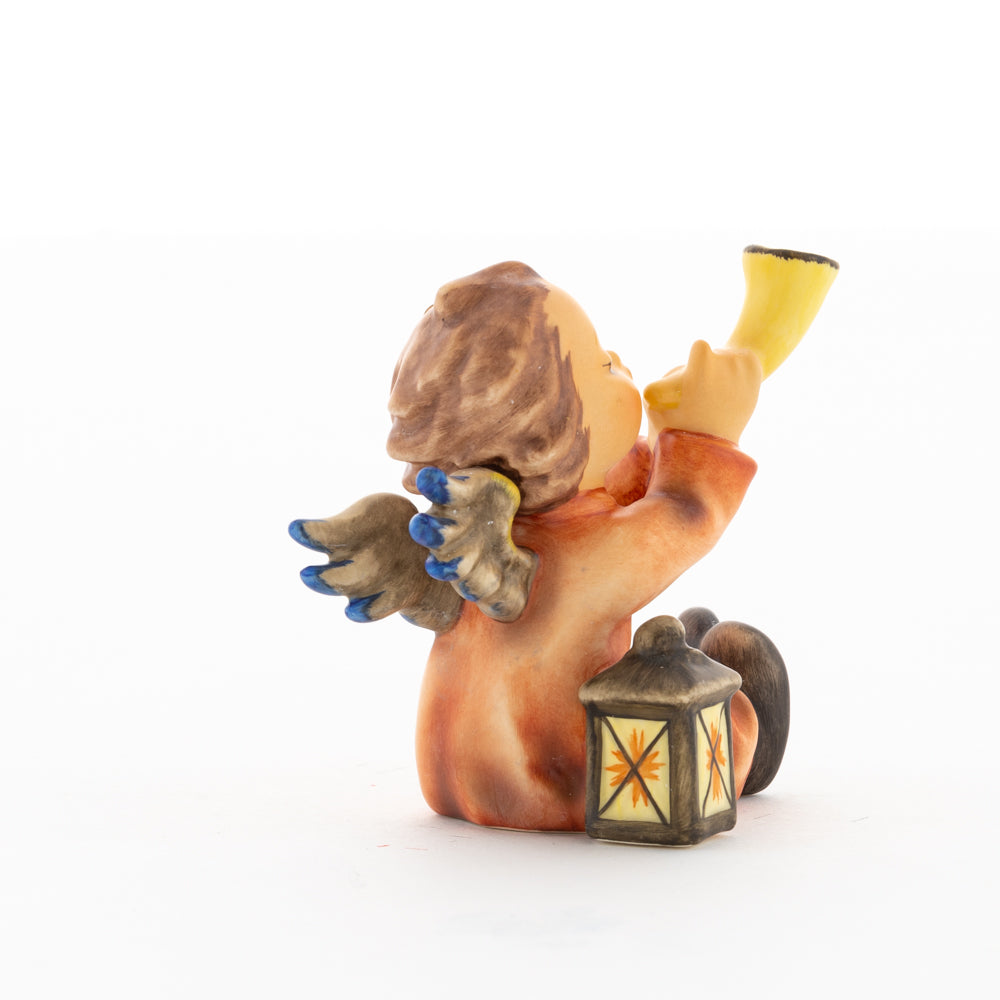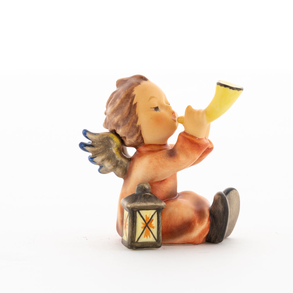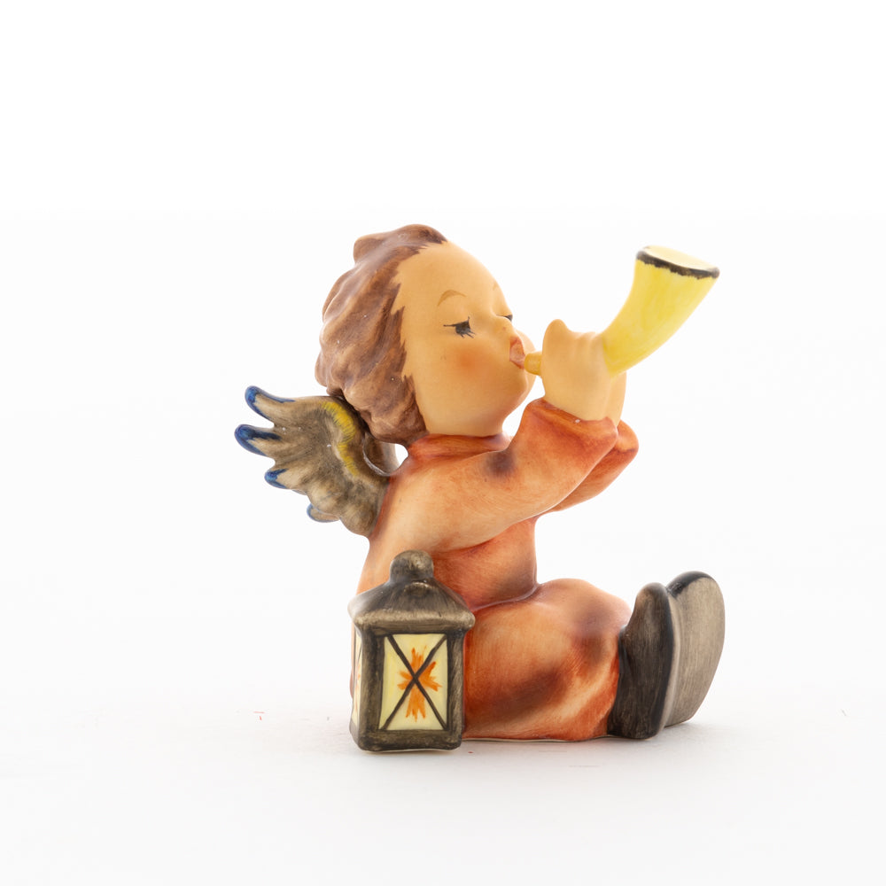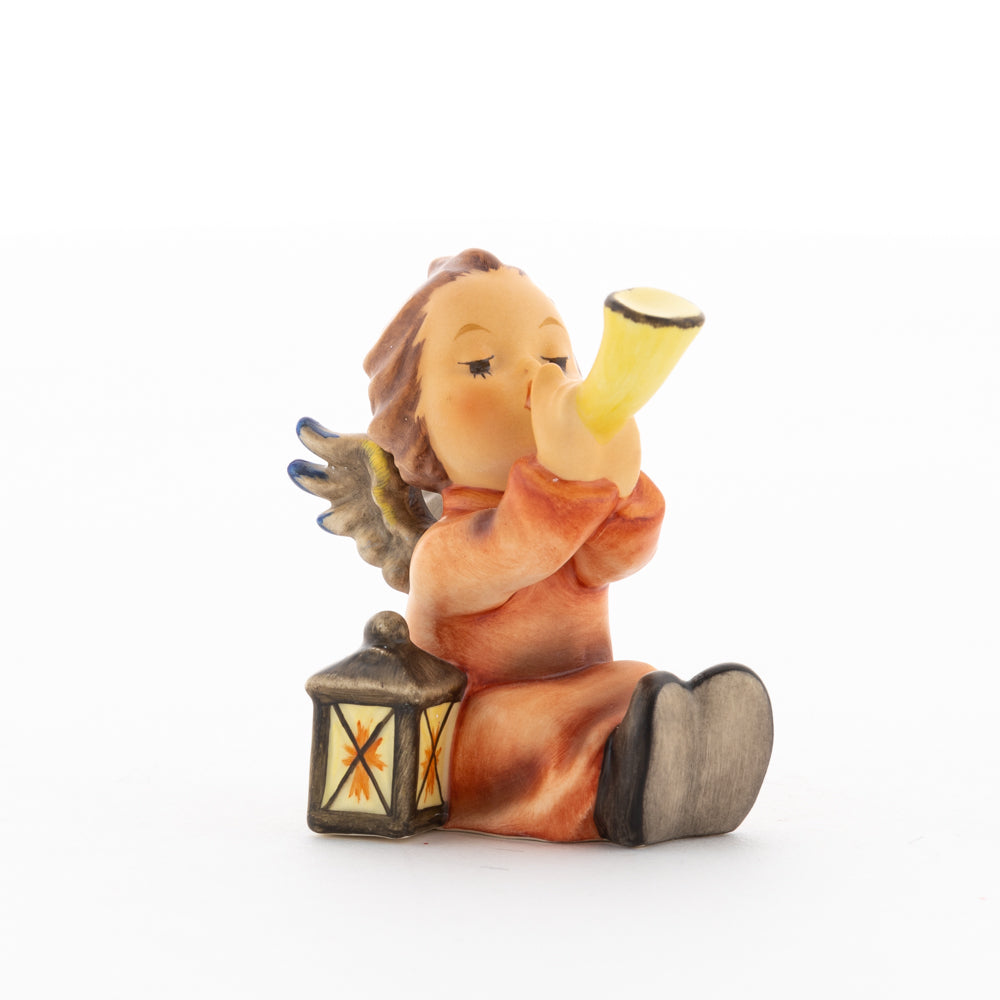 Der kleine Engel bläst ins Horn! Jesus Christus ist geboren! Ein jeder soll es wissen, ein jeder soll es hören. Voller Konzentration bläst unser Engelchen zum Wunder der Heiligen Nacht und vergisst alles um sich herum. Modelliert wurde der musikalische Verkünder im Jahr 1972 von Reinhold Unger. Zusammen mit der Hummel 358, Kniender Engel mit Kerze, und der Hummel 357, Kniender Engel mit Laterne, bilden die drei Engel ein hübsches Trio.