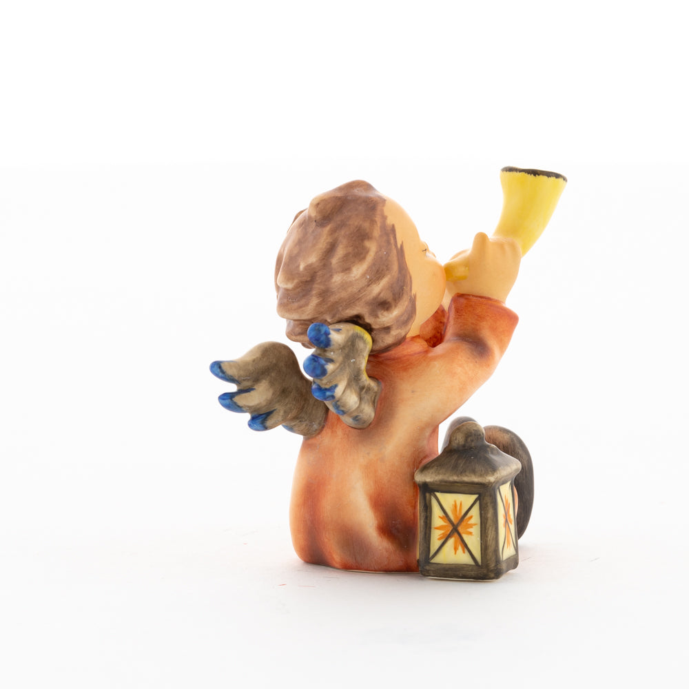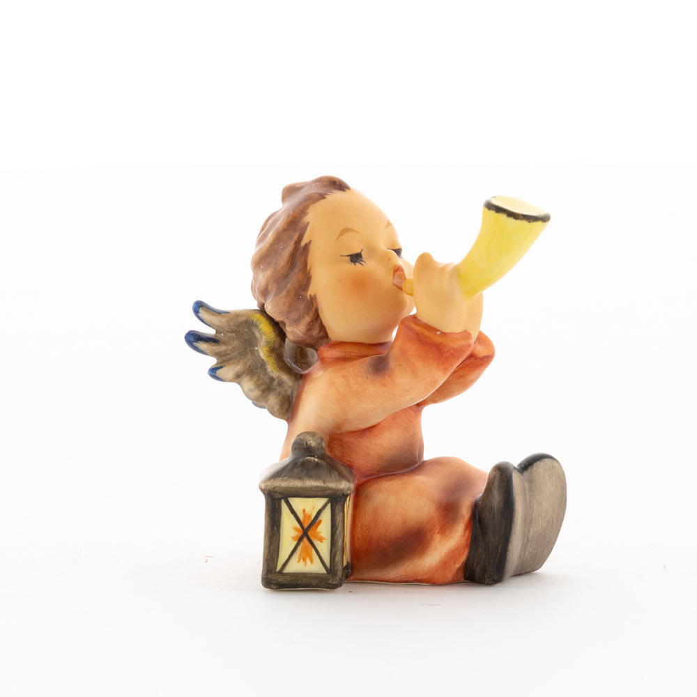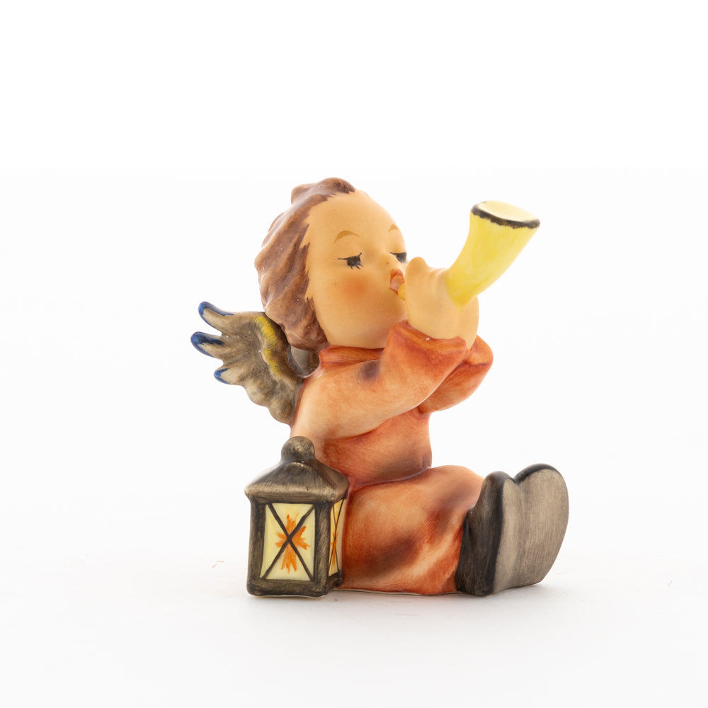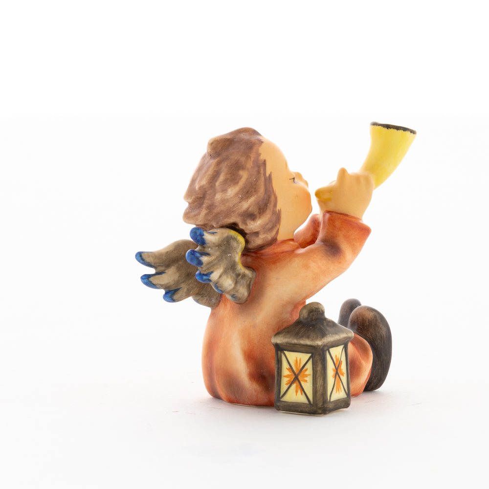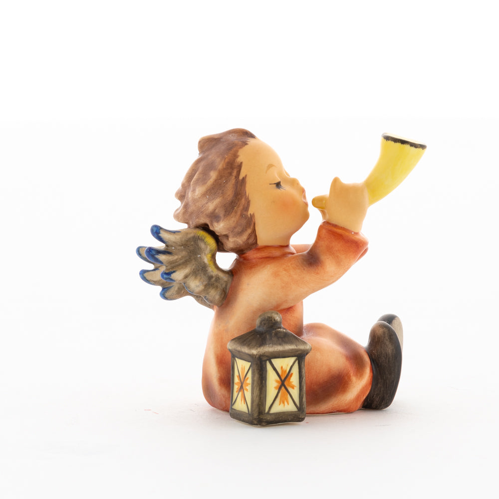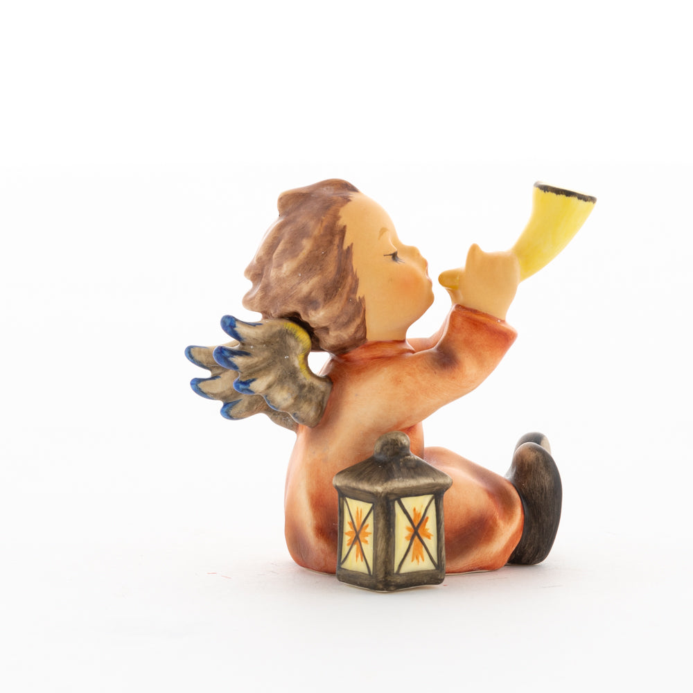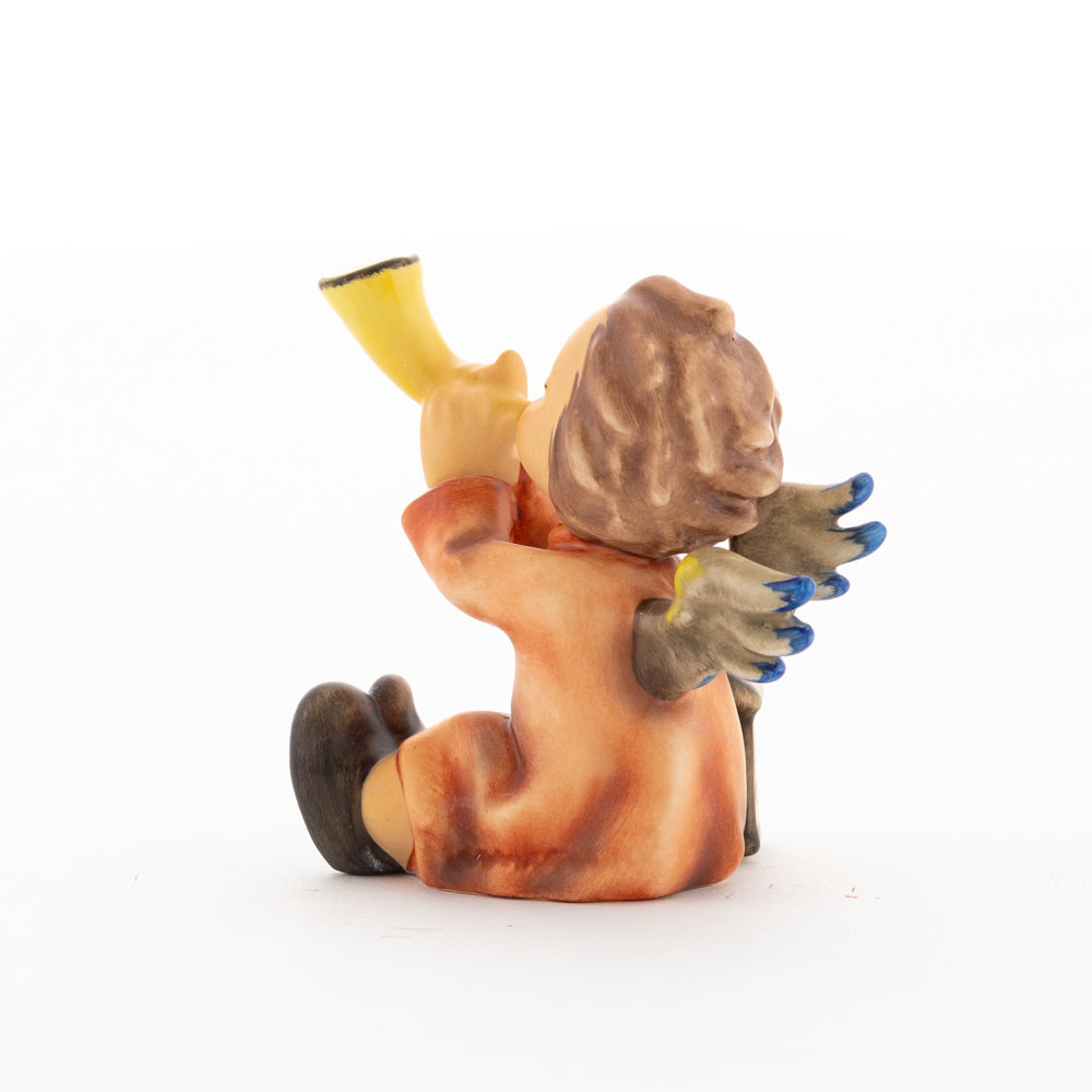 Der kleine Engel bläst ins Horn! Jesus Christus ist geboren! Ein jeder soll es wissen, ein jeder soll es hören. Voller Konzentration bläst unser Engelchen zum Wunder der Heiligen Nacht und vergisst alles um sich herum. Modelliert wurde der musikalische Verkünder im Jahr 1972 von Reinhold Unger. Zusammen mit der Hummel 358, Kniender Engel mit Kerze, und der Hummel 357, Kniender Engel mit Laterne, bilden die drei Engel ein hübsches Trio.