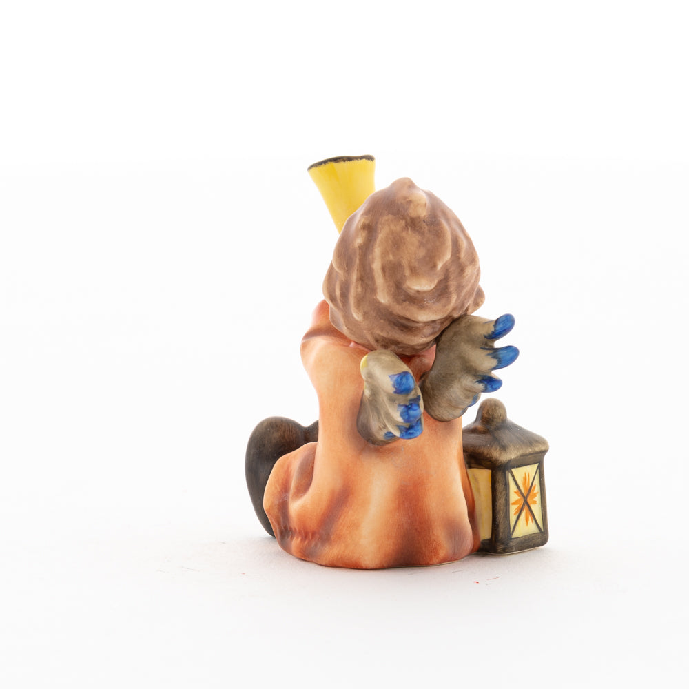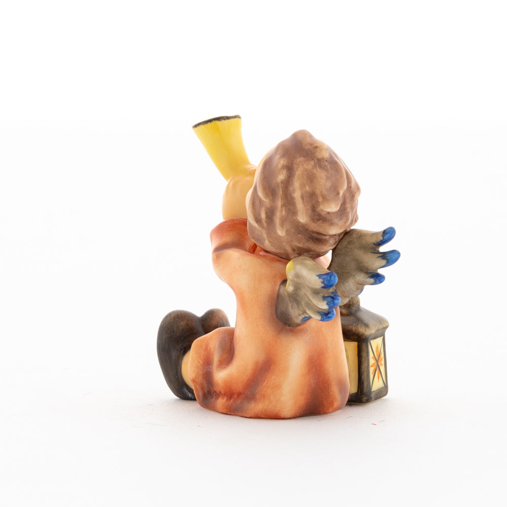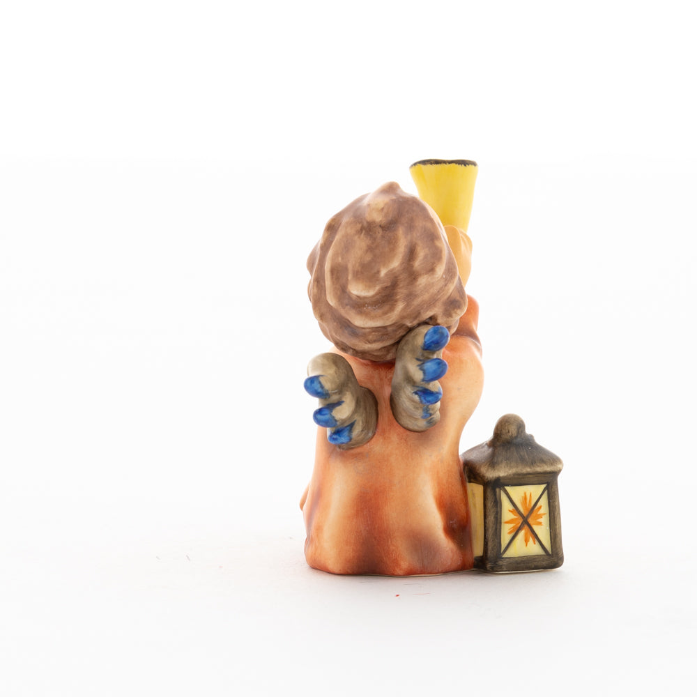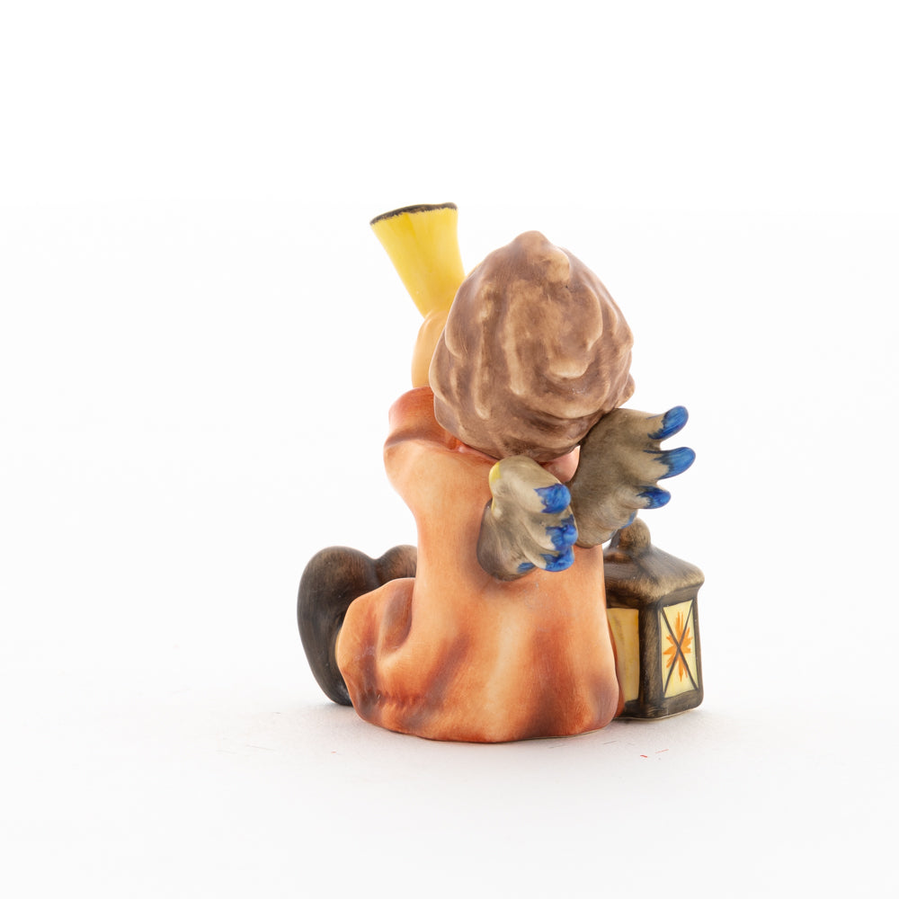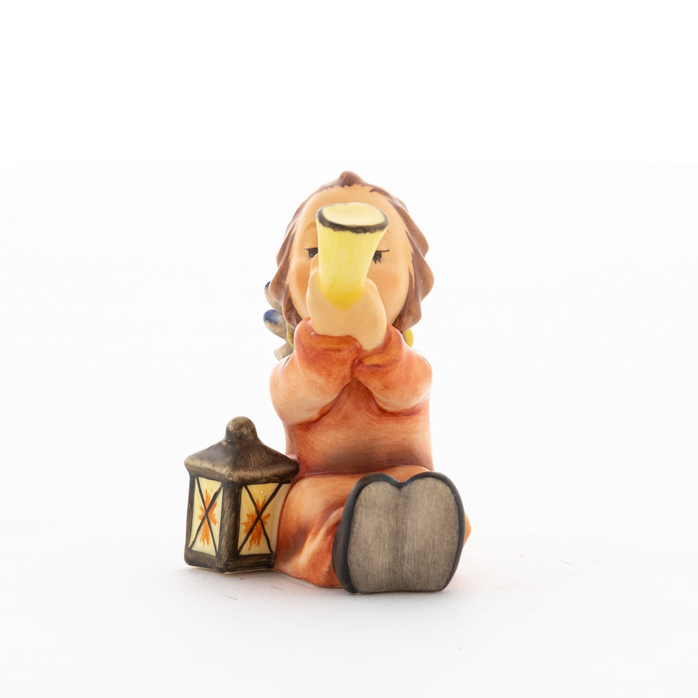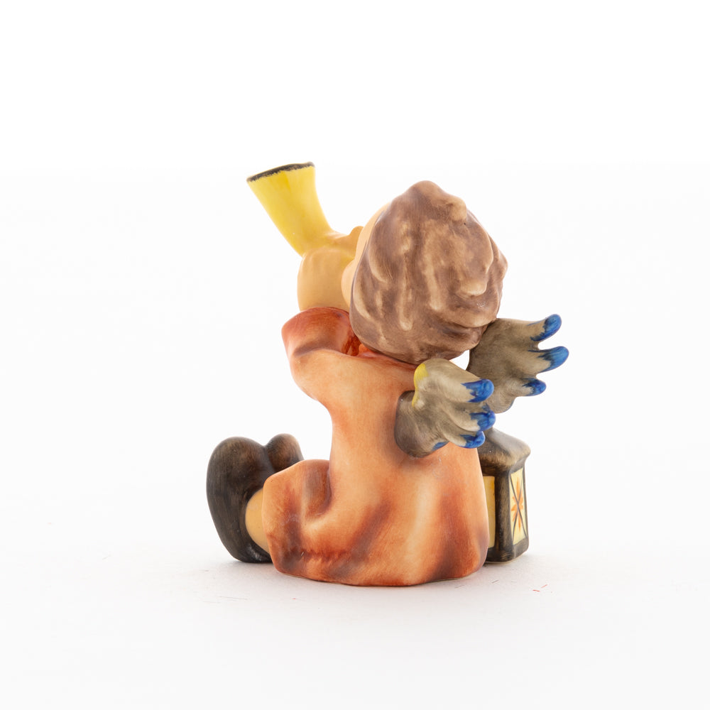 Der kleine Engel bläst ins Horn! Jesus Christus ist geboren! Ein jeder soll es wissen, ein jeder soll es hören. Voller Konzentration bläst unser Engelchen zum Wunder der Heiligen Nacht und vergisst alles um sich herum. Modelliert wurde der musikalische Verkünder im Jahr 1972 von Reinhold Unger. Zusammen mit der Hummel 358, Kniender Engel mit Kerze, und der Hummel 357, Kniender Engel mit Laterne, bilden die drei Engel ein hübsches Trio.