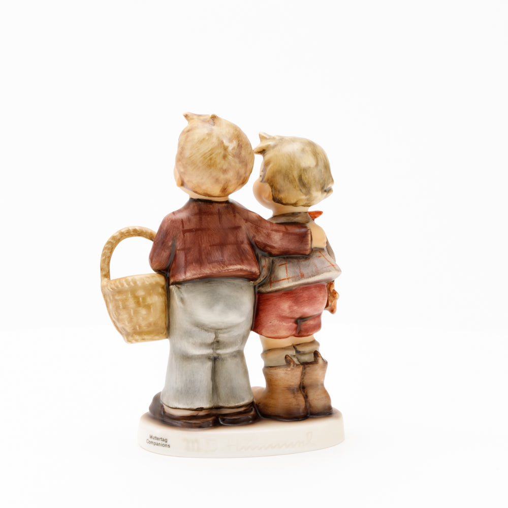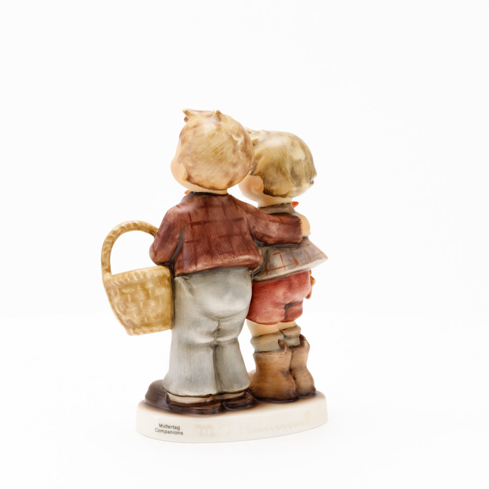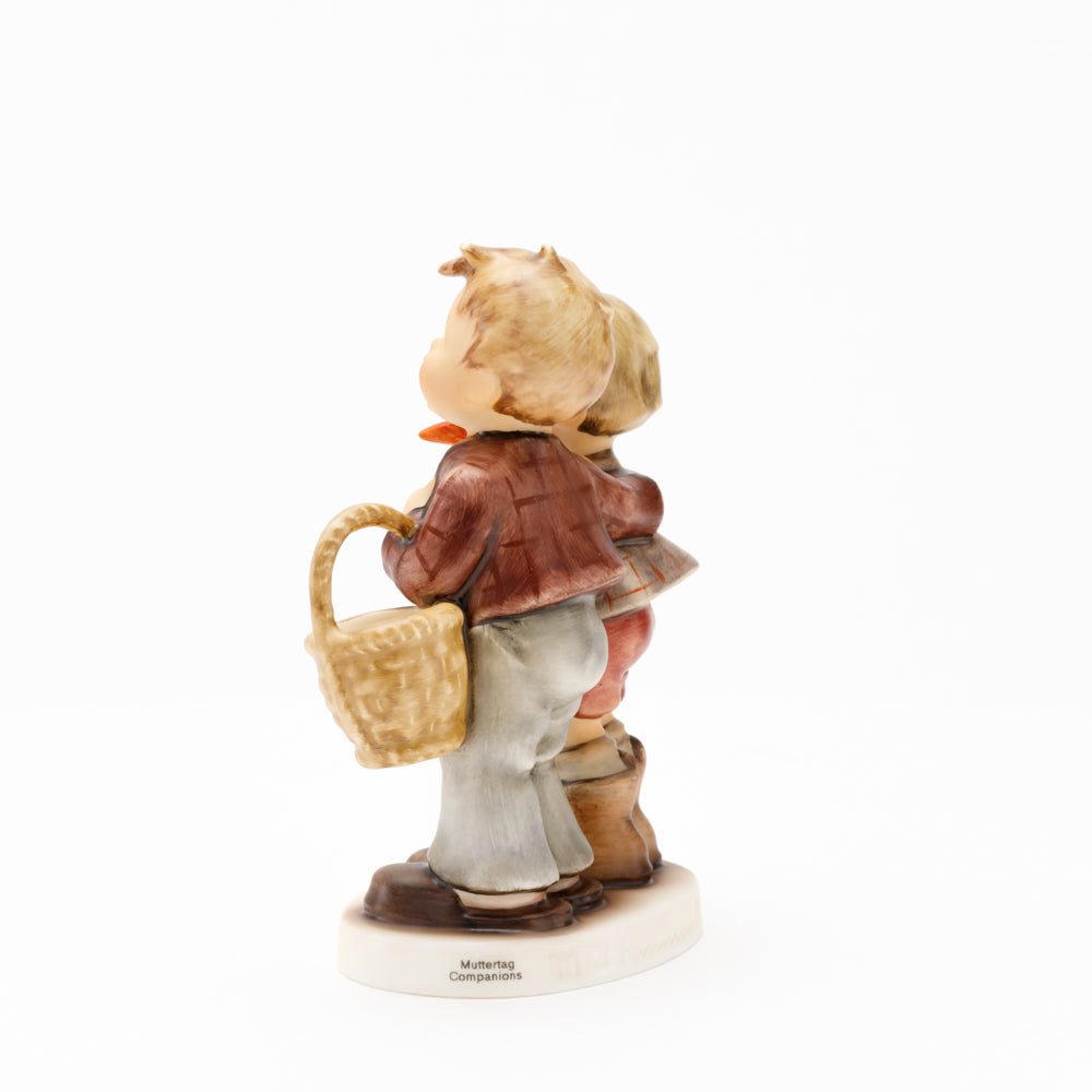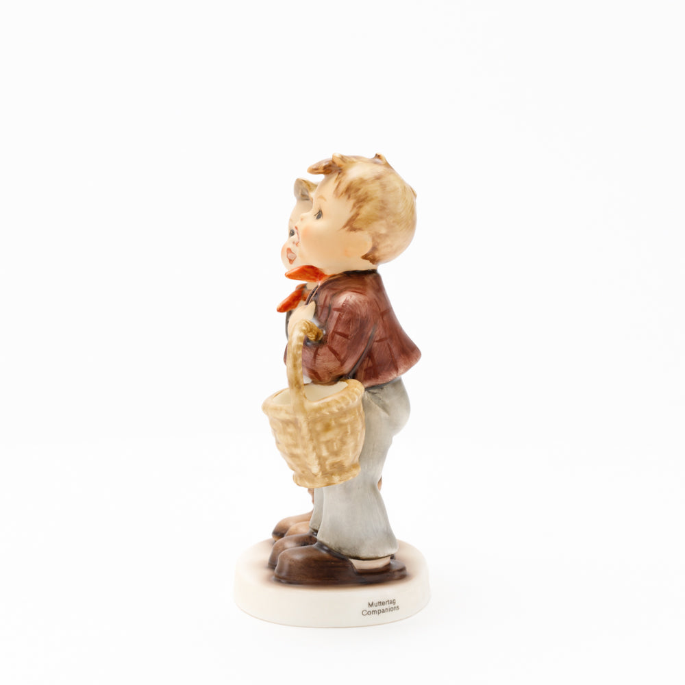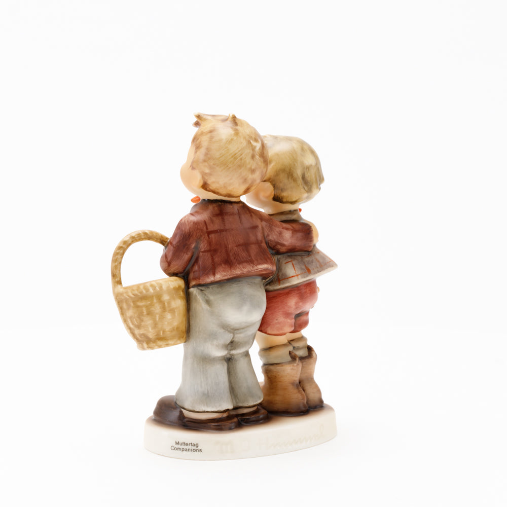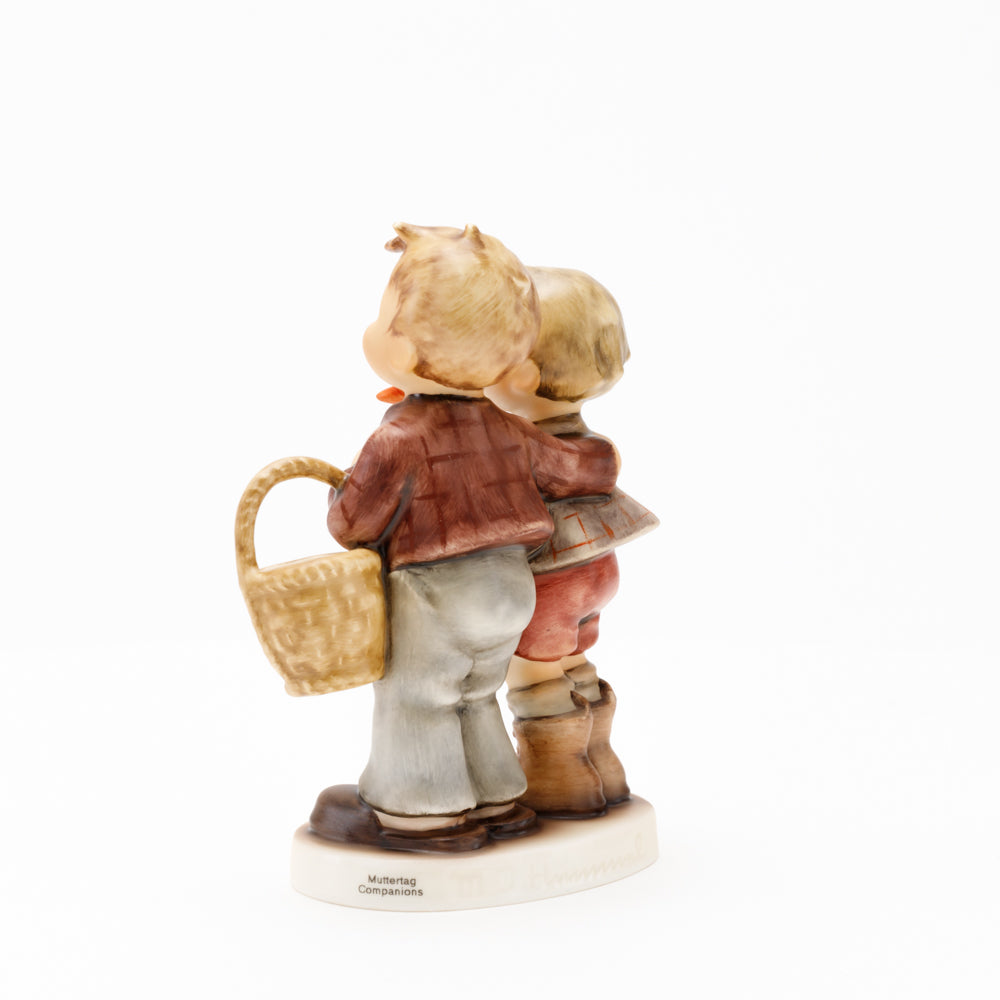 Ursprünglich auf den Namen "Bruderliebe" getauft wartete diese von Gerhard Skrobek im Mai 1964 gestaltete Hummel-Figur über ein halbes Jahrhundert auf ihren großen Auftritt. Die zwei bayerischen Lausbuben, ausgestattet mit einem kleinen Körbchen, lassen offen, was genau sie noch vorhaben. Aufgrund des aktuellen Namens "Muttertag" liegt es nahe, dass die zwei Buben auf der Suche nach einem Muttertagsgeschenk sind. Aber die original Hummel-Figur selbst ist ein ideales Muttertagsgeschenk. Die Figur ist, wie alle anderen original Hummel-Figuren, nach den Zeichnungen von Schwester Maria Innocentia Hummel gestaltet. Die Hummel-Figur erscheint neben weiteren Figuren, die als Muttertagspräsente gedacht sind. So zum Beispiel auch die Hummel-Figur "Für Mami" (HUM 2258).