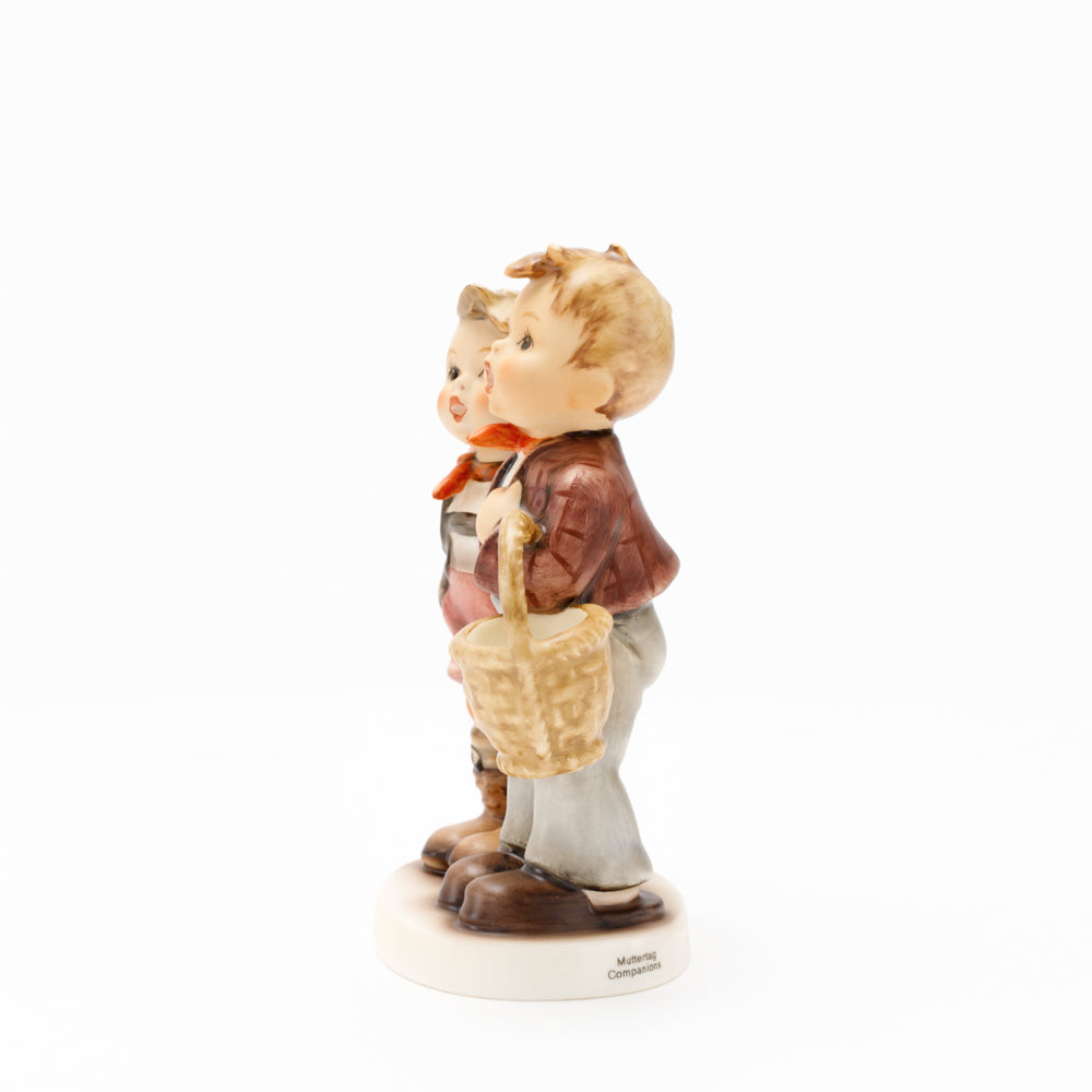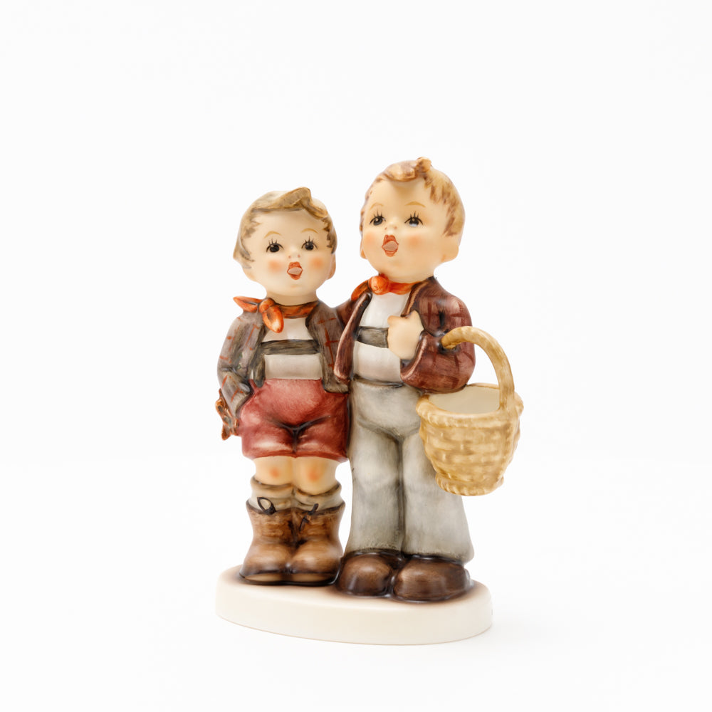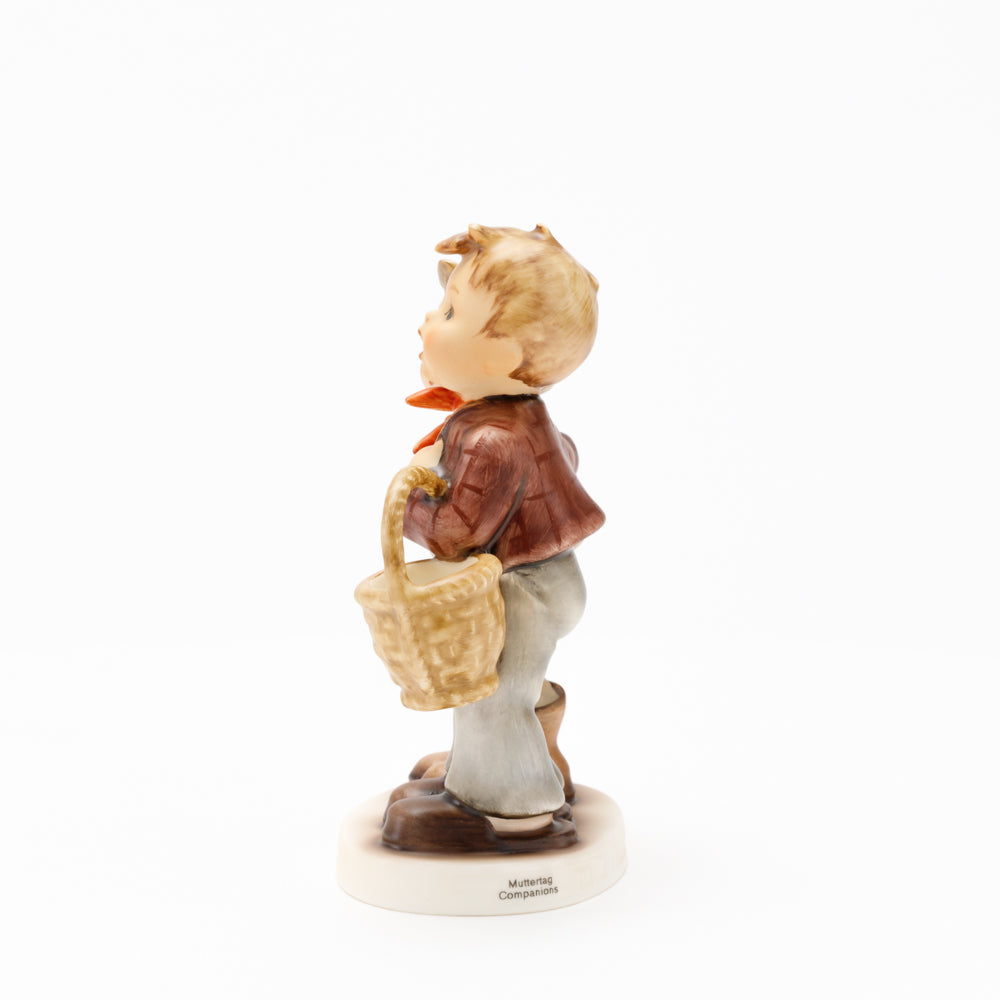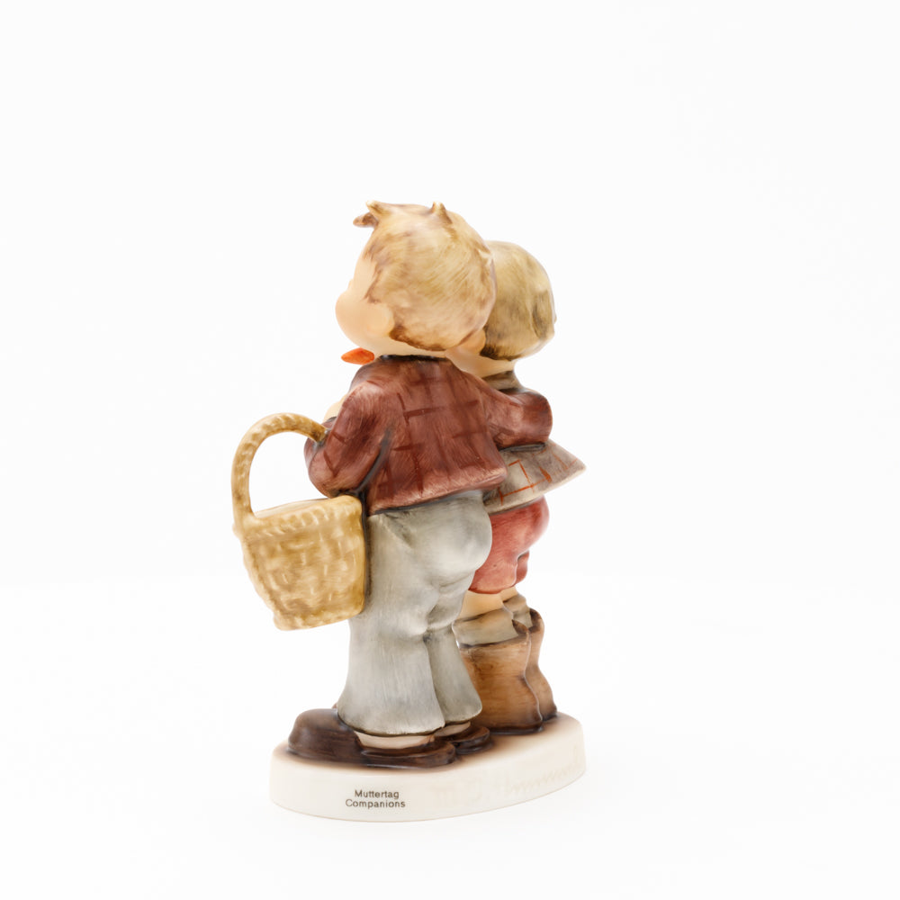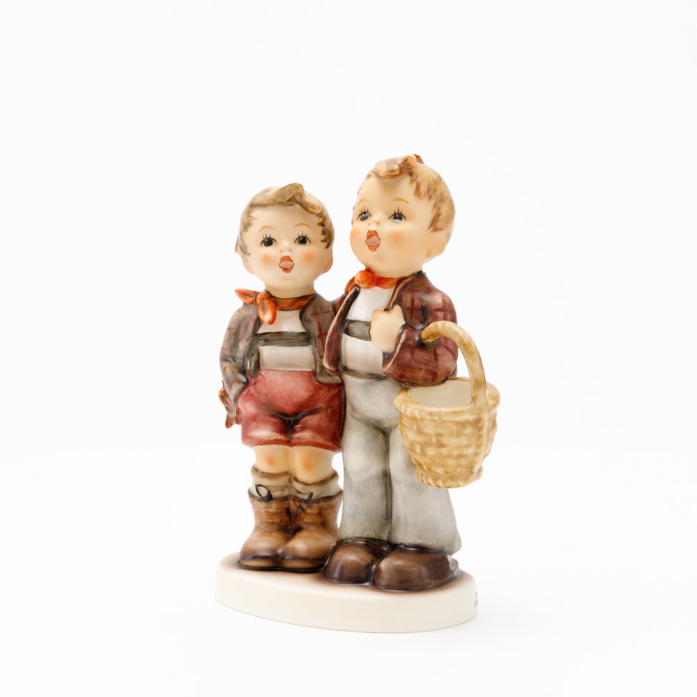 Ursprünglich auf den Namen "Bruderliebe" getauft wartete diese von Gerhard Skrobek im Mai 1964 gestaltete Hummel-Figur über ein halbes Jahrhundert auf ihren großen Auftritt. Die zwei bayerischen Lausbuben, ausgestattet mit einem kleinen Körbchen, lassen offen, was genau sie noch vorhaben. Aufgrund des aktuellen Namens "Muttertag" liegt es nahe, dass die zwei Buben auf der Suche nach einem Muttertagsgeschenk sind. Aber die original Hummel-Figur selbst ist ein ideales Muttertagsgeschenk. Die Figur ist, wie alle anderen original Hummel-Figuren, nach den Zeichnungen von Schwester Maria Innocentia Hummel gestaltet. Die Hummel-Figur erscheint neben weiteren Figuren, die als Muttertagspräsente gedacht sind. So zum Beispiel auch die Hummel-Figur "Für Mami" (HUM 2258).