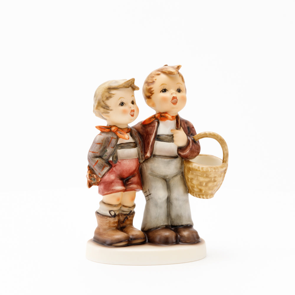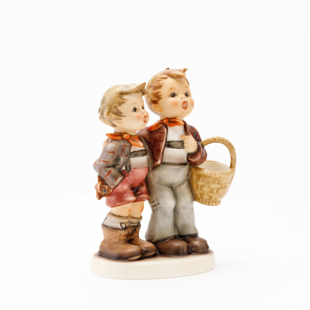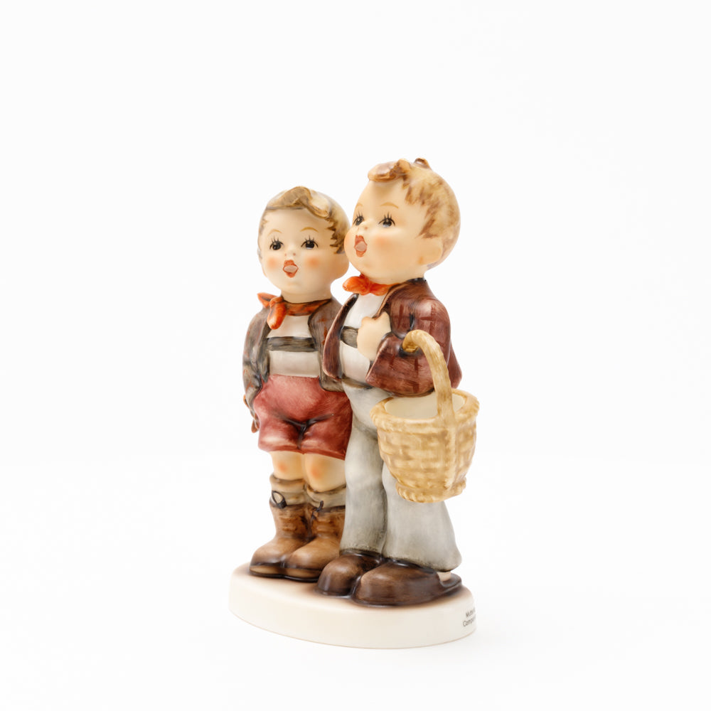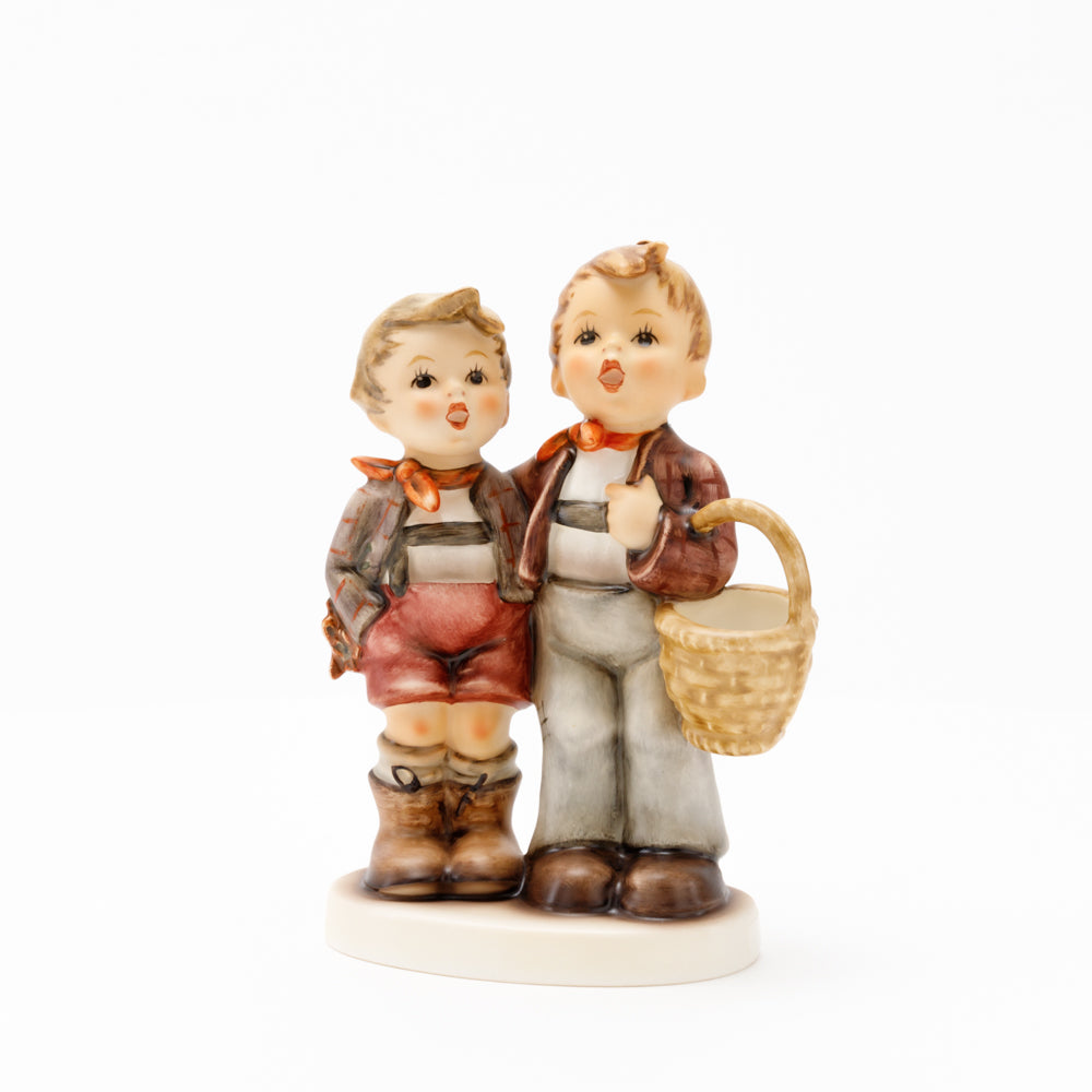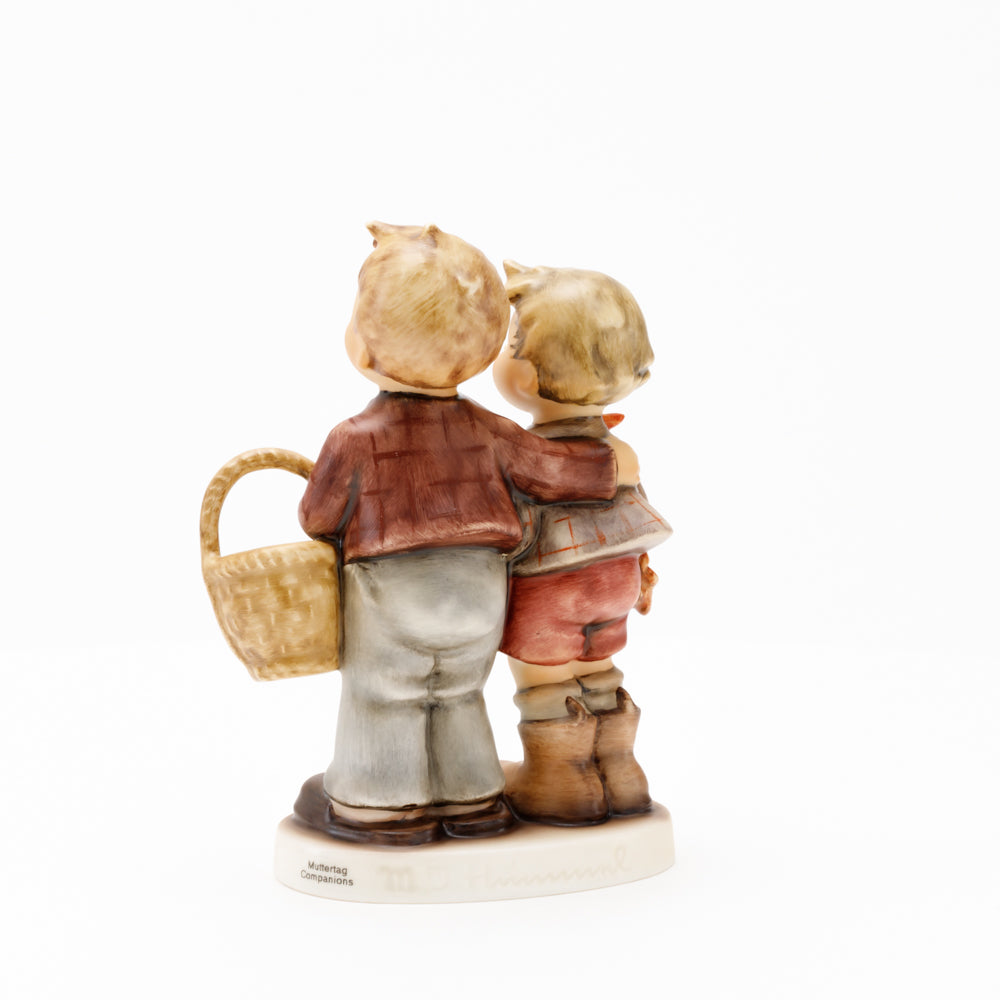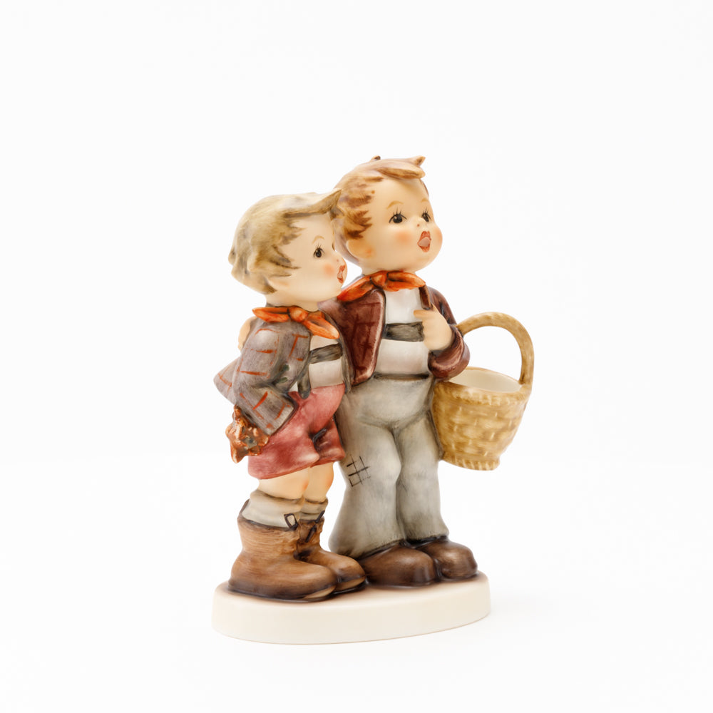 Ursprünglich auf den Namen "Bruderliebe" getauft wartete diese von Gerhard Skrobek im Mai 1964 gestaltete Hummel-Figur über ein halbes Jahrhundert auf ihren großen Auftritt. Die zwei bayerischen Lausbuben, ausgestattet mit einem kleinen Körbchen, lassen offen, was genau sie noch vorhaben. Aufgrund des aktuellen Namens "Muttertag" liegt es nahe, dass die zwei Buben auf der Suche nach einem Muttertagsgeschenk sind. Aber die original Hummel-Figur selbst ist ein ideales Muttertagsgeschenk. Die Figur ist, wie alle anderen original Hummel-Figuren, nach den Zeichnungen von Schwester Maria Innocentia Hummel gestaltet. Die Hummel-Figur erscheint neben weiteren Figuren, die als Muttertagspräsente gedacht sind. So zum Beispiel auch die Hummel-Figur "Für Mami" (HUM 2258).