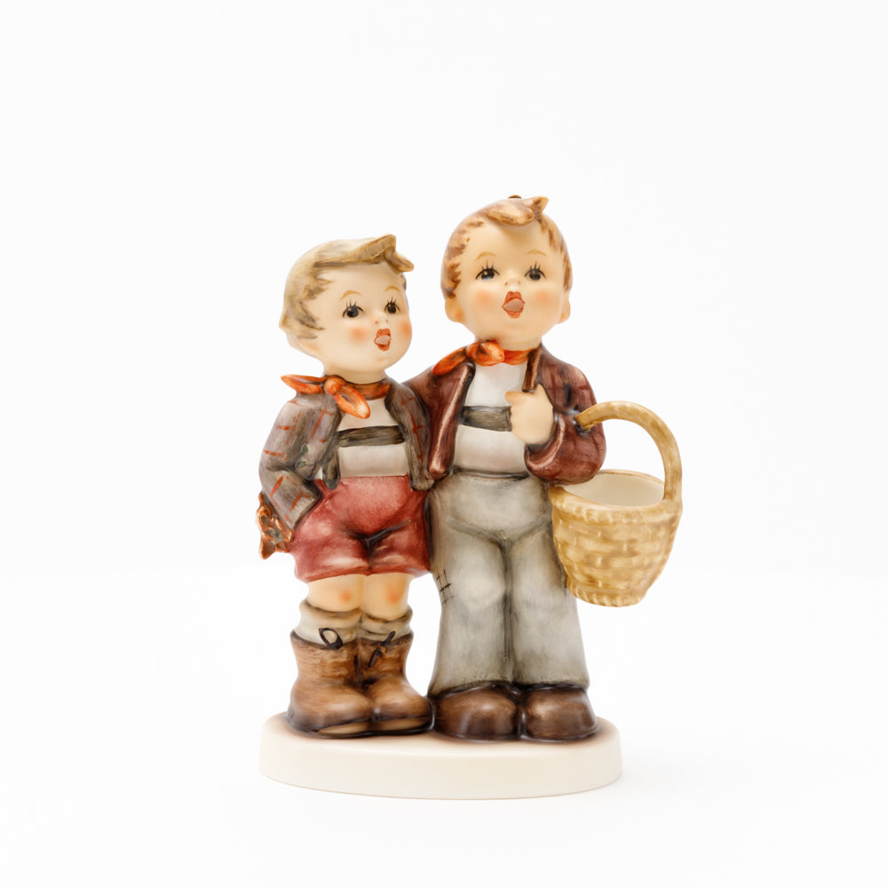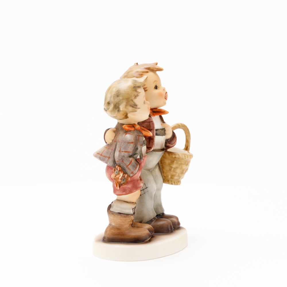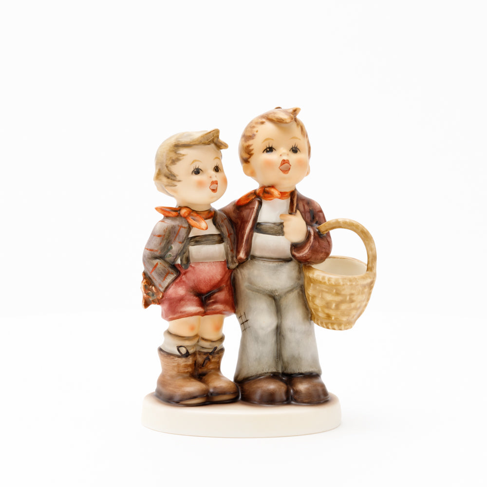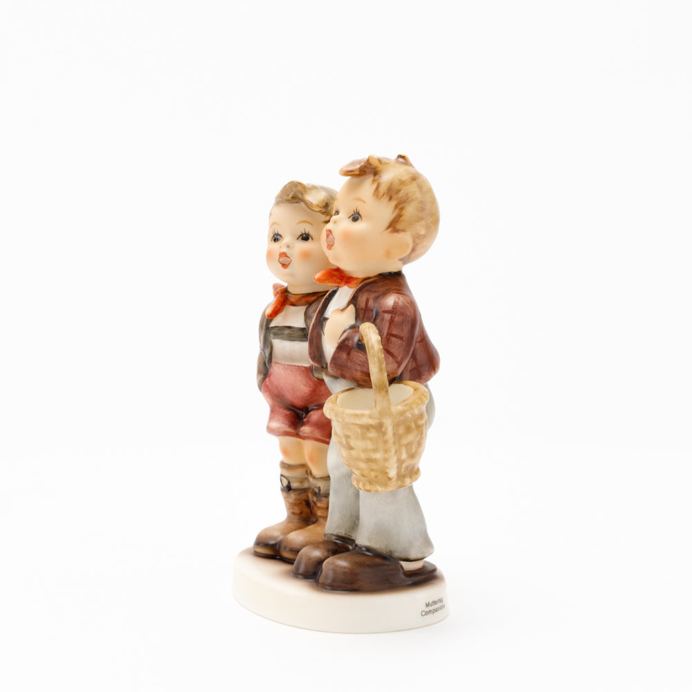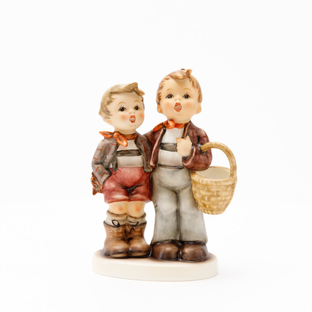 Ursprünglich auf den Namen "Bruderliebe" getauft wartete diese von Gerhard Skrobek im Mai 1964 gestaltete Hummel-Figur über ein halbes Jahrhundert auf ihren großen Auftritt. Die zwei bayerischen Lausbuben, ausgestattet mit einem kleinen Körbchen, lassen offen, was genau sie noch vorhaben. Aufgrund des aktuellen Namens "Muttertag" liegt es nahe, dass die zwei Buben auf der Suche nach einem Muttertagsgeschenk sind. Aber die original Hummel-Figur selbst ist ein ideales Muttertagsgeschenk. Die Figur ist, wie alle anderen original Hummel-Figuren, nach den Zeichnungen von Schwester Maria Innocentia Hummel gestaltet. Die Hummel-Figur erscheint neben weiteren Figuren, die als Muttertagspräsente gedacht sind. So zum Beispiel auch die Hummel-Figur "Für Mami" (HUM 2258).