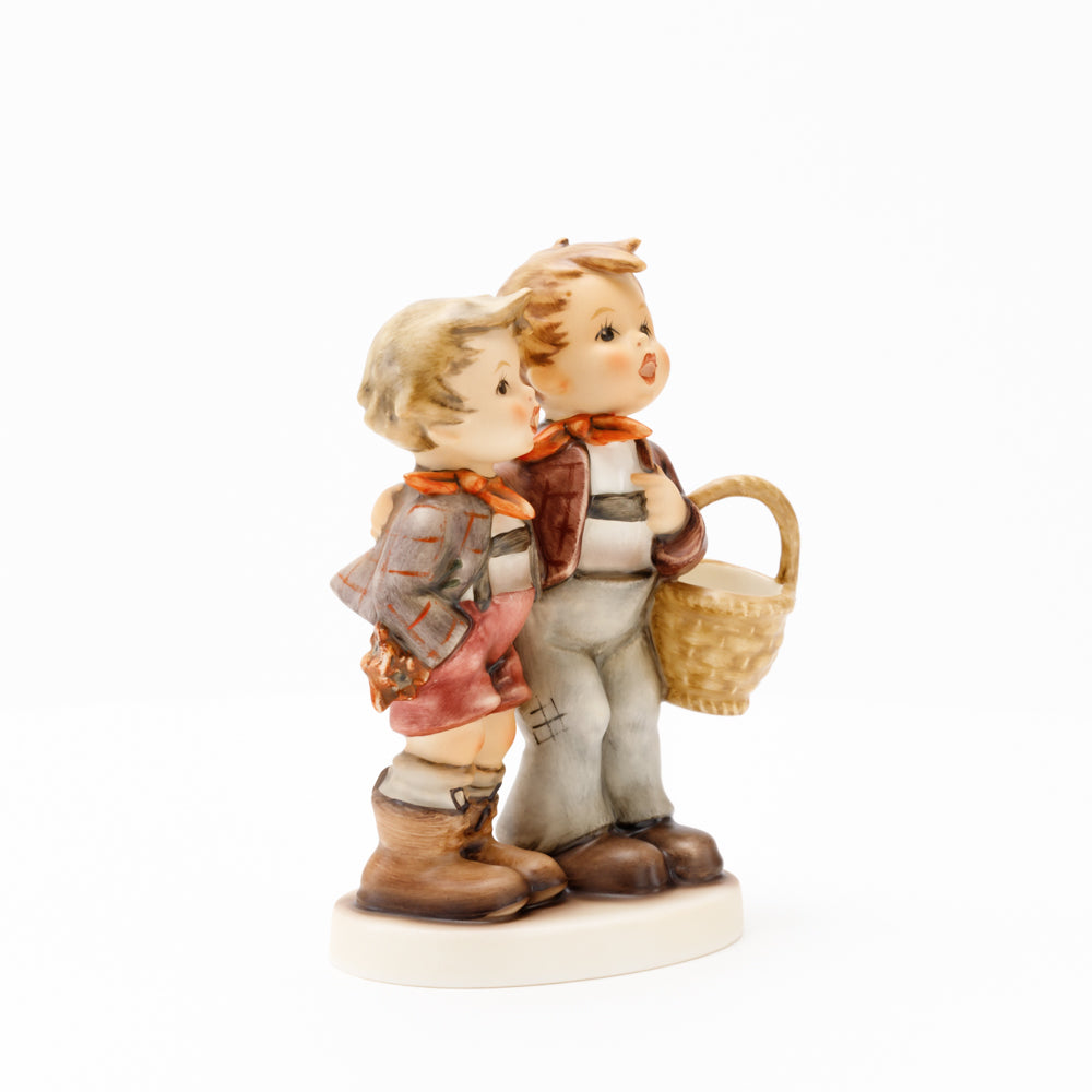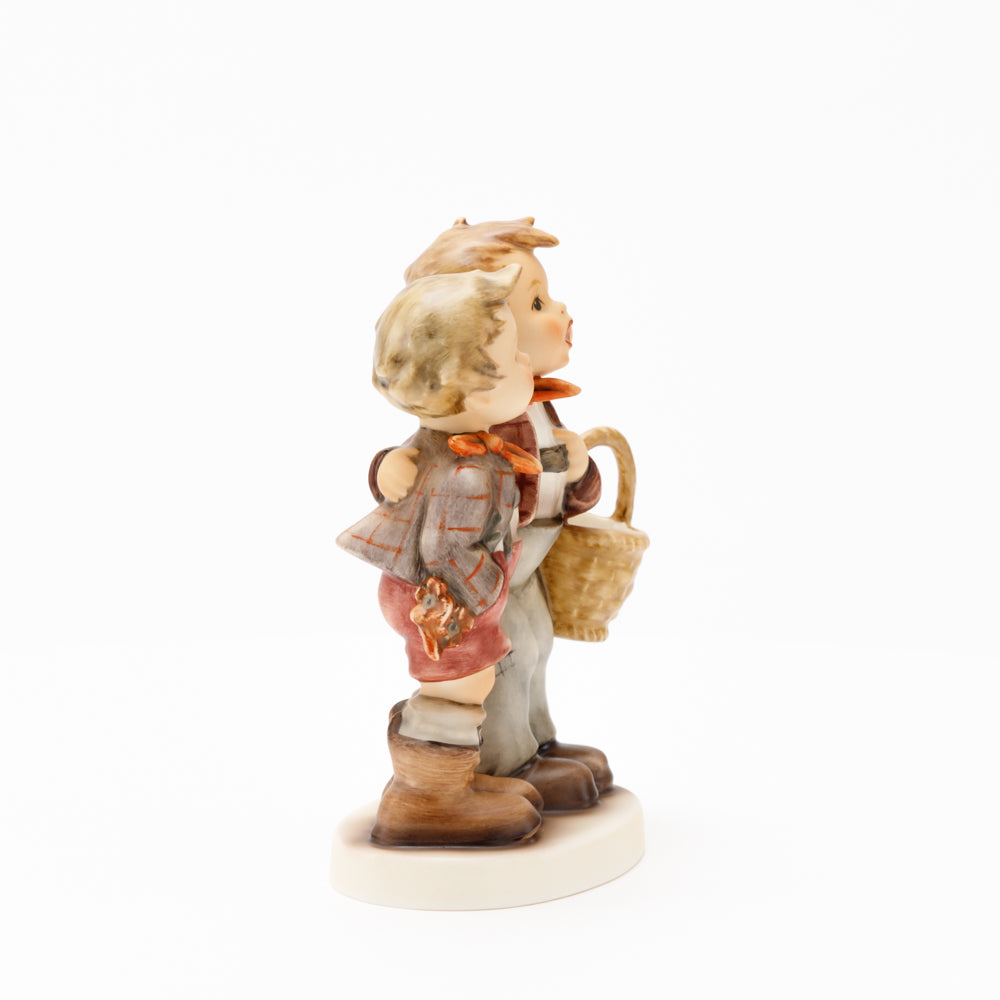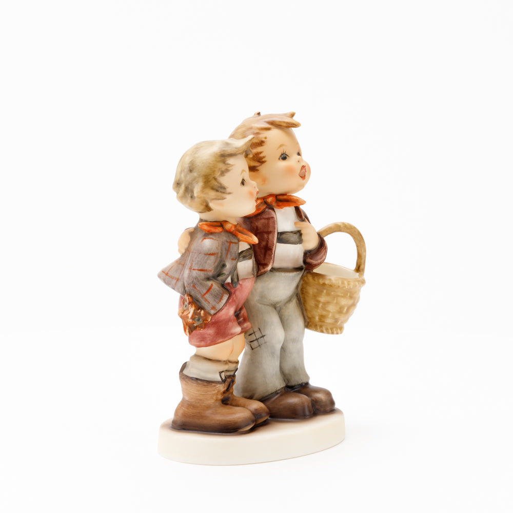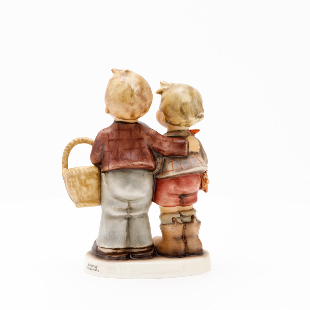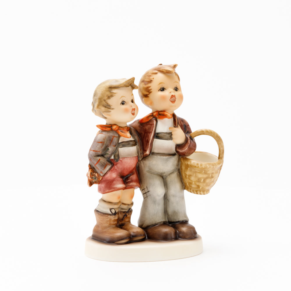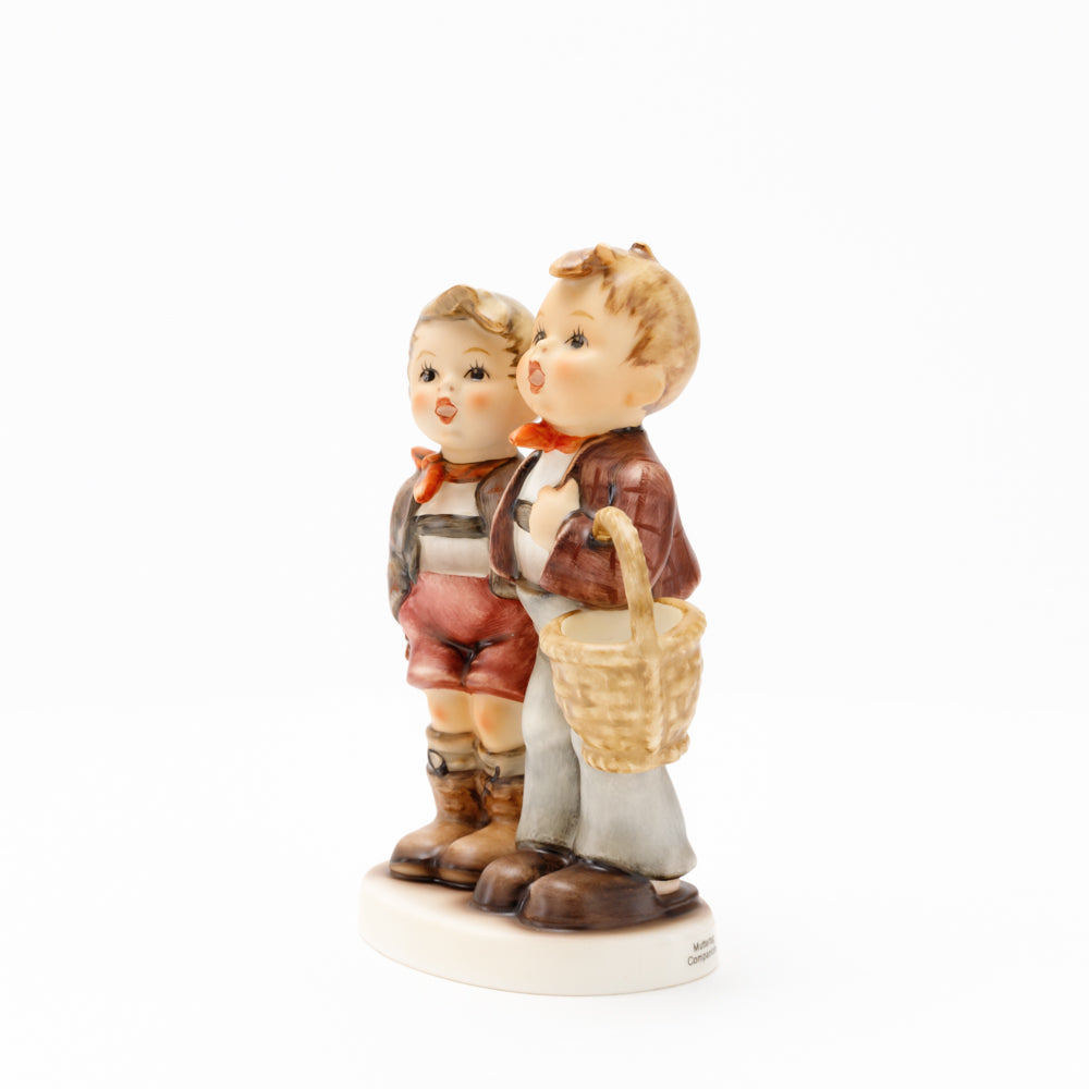 Ursprünglich auf den Namen "Bruderliebe" getauft wartete diese von Gerhard Skrobek im Mai 1964 gestaltete Hummel-Figur über ein halbes Jahrhundert auf ihren großen Auftritt. Die zwei bayerischen Lausbuben, ausgestattet mit einem kleinen Körbchen, lassen offen, was genau sie noch vorhaben. Aufgrund des aktuellen Namens "Muttertag" liegt es nahe, dass die zwei Buben auf der Suche nach einem Muttertagsgeschenk sind. Aber die original Hummel-Figur selbst ist ein ideales Muttertagsgeschenk. Die Figur ist, wie alle anderen original Hummel-Figuren, nach den Zeichnungen von Schwester Maria Innocentia Hummel gestaltet. Die Hummel-Figur erscheint neben weiteren Figuren, die als Muttertagspräsente gedacht sind. So zum Beispiel auch die Hummel-Figur "Für Mami" (HUM 2258).