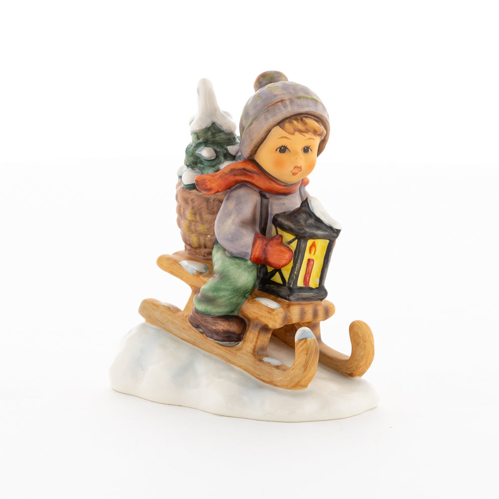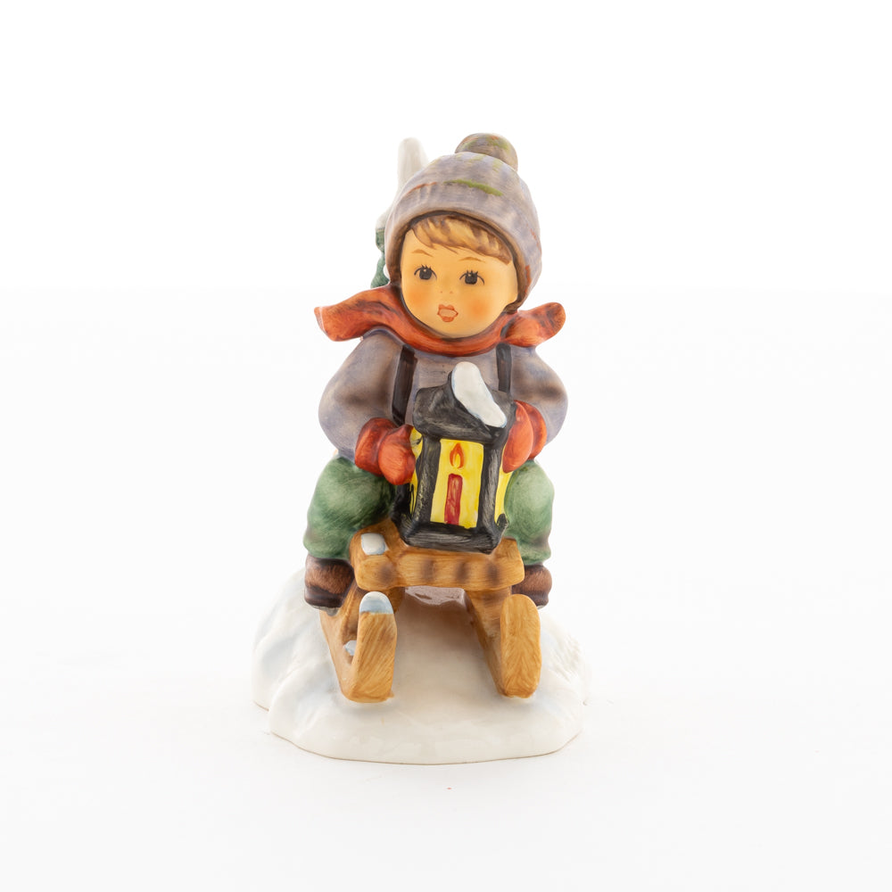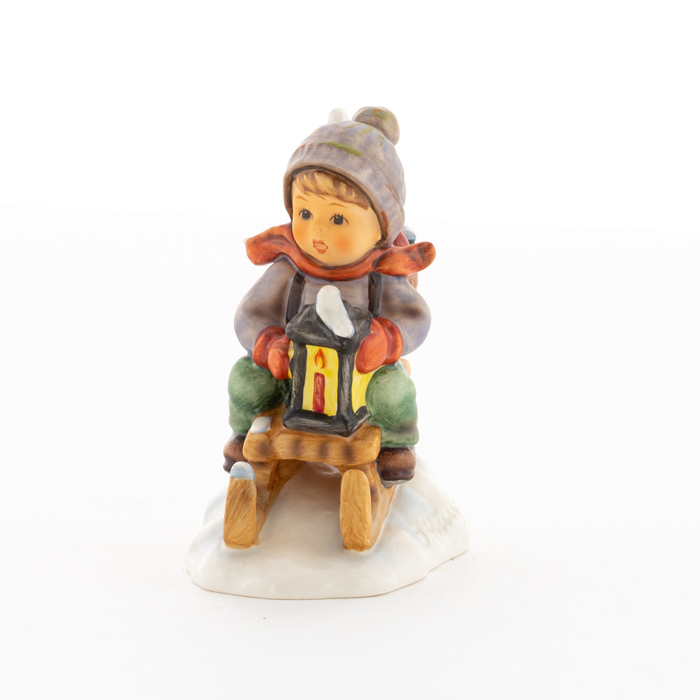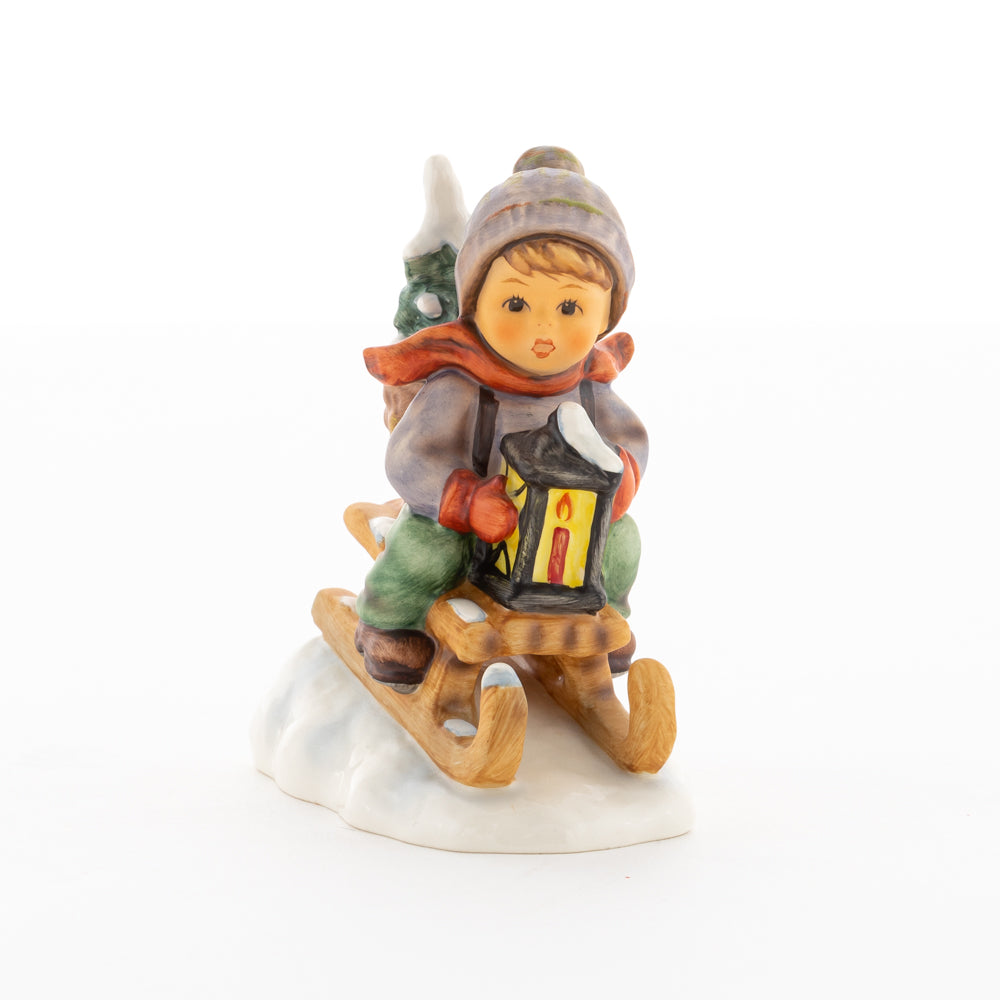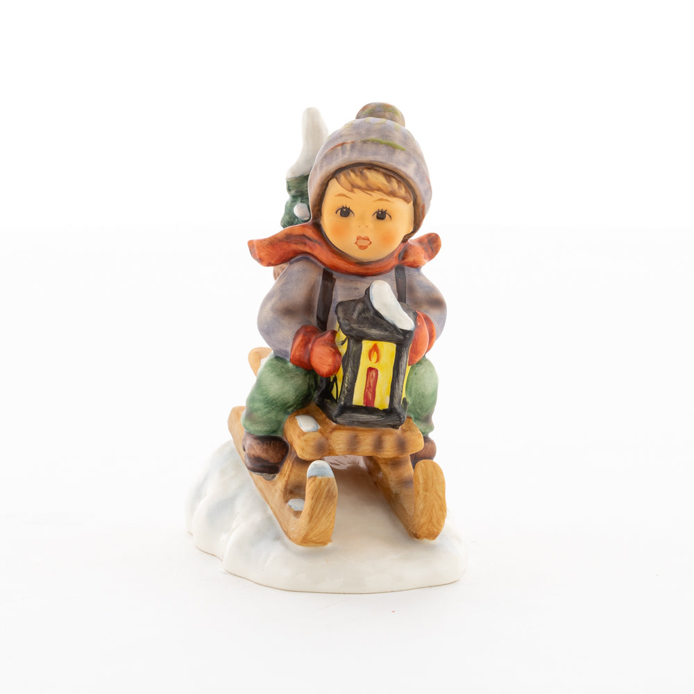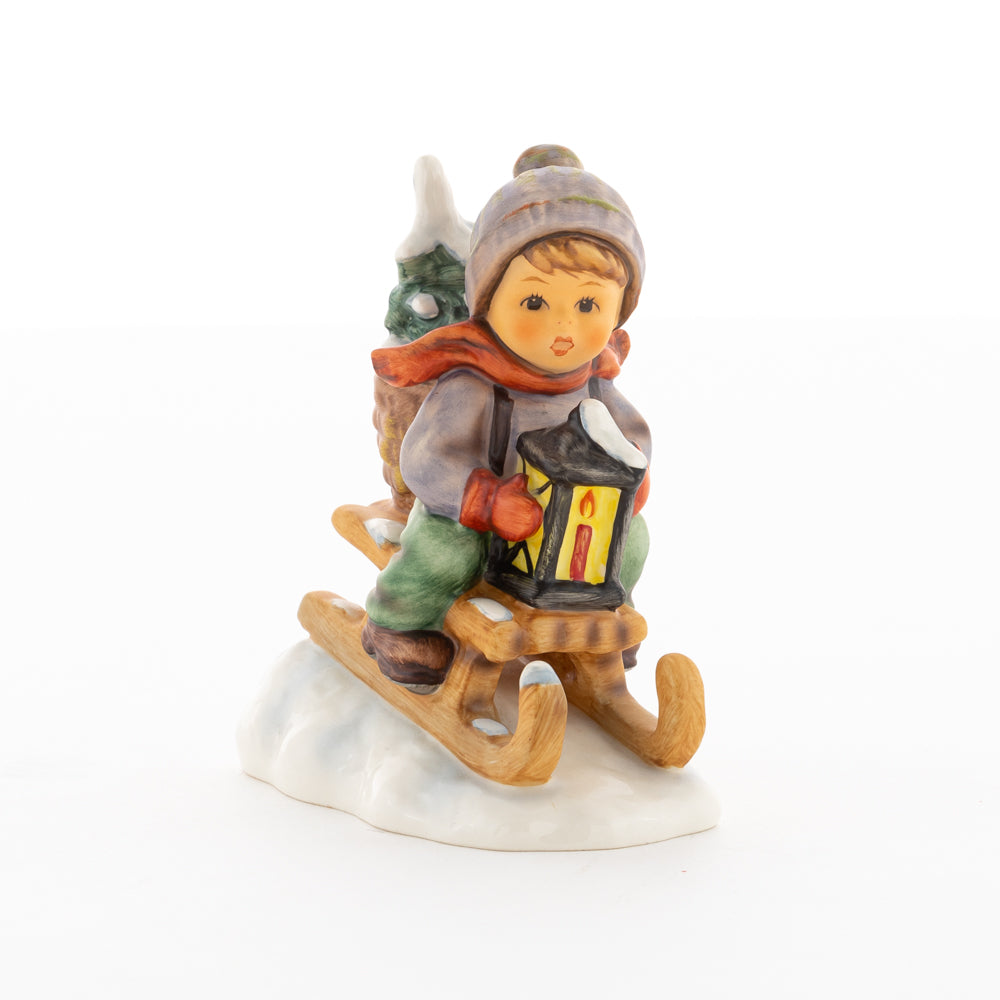 Hui! Schneller als gedacht saust der kleine Hummel-Bub auf seinem Schlitten den verschneiten Hügel hinab. Ganz fest hält er seine Laterne, die ihm den Weg leuchtet. Keinesfalls darf das Licht ausgehen, das ihm den Weg leuchtet! Hoffentlich denkt der junge Mann aus der Hummel Manufaktur auch an den Tannenbaum am Ende seines Schlittens? Nicht, dass er das liebevoll ausgesuchte Bäumchen noch verliert. Dabei soll das Tannengrün doch die gute Stube schmücken!