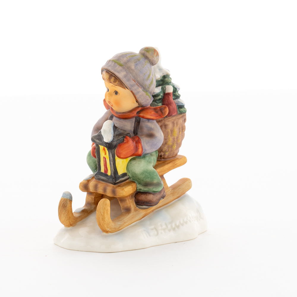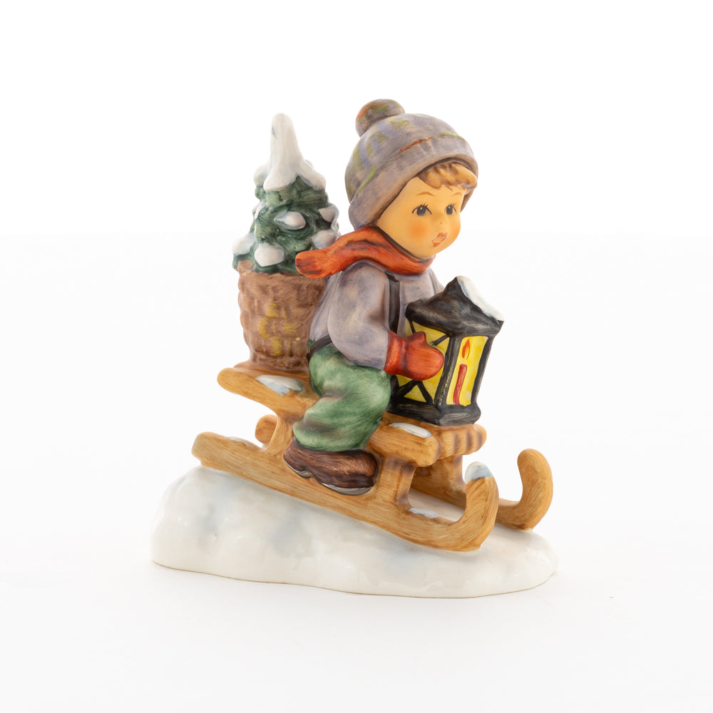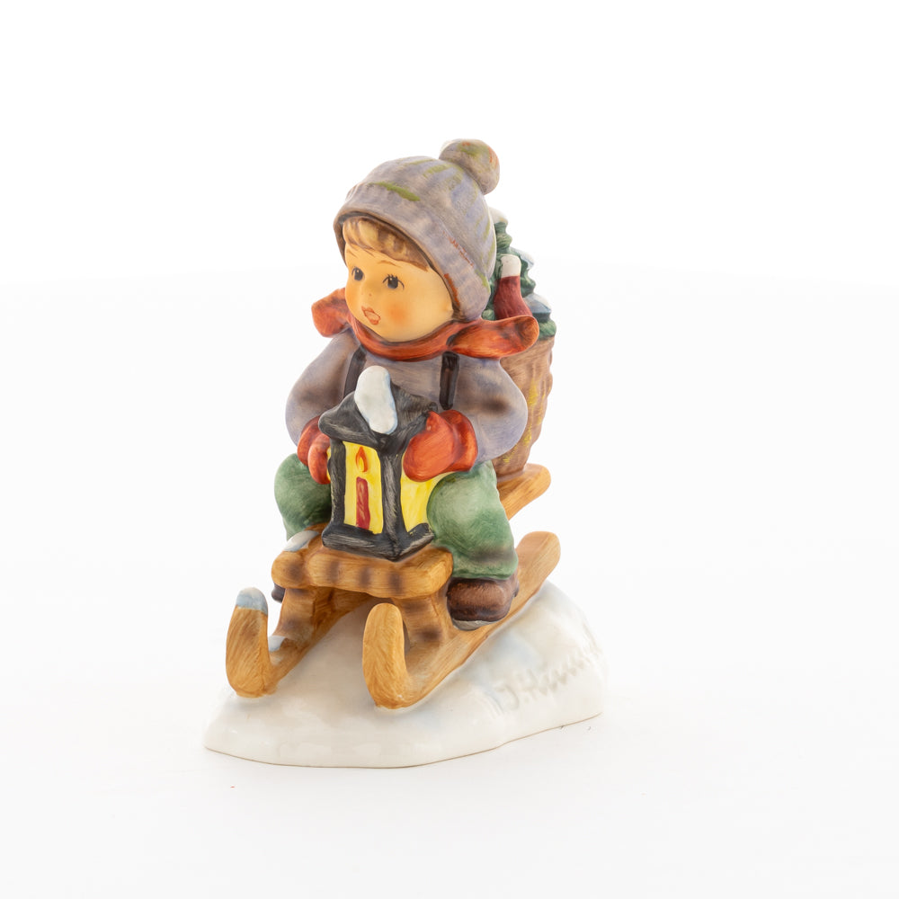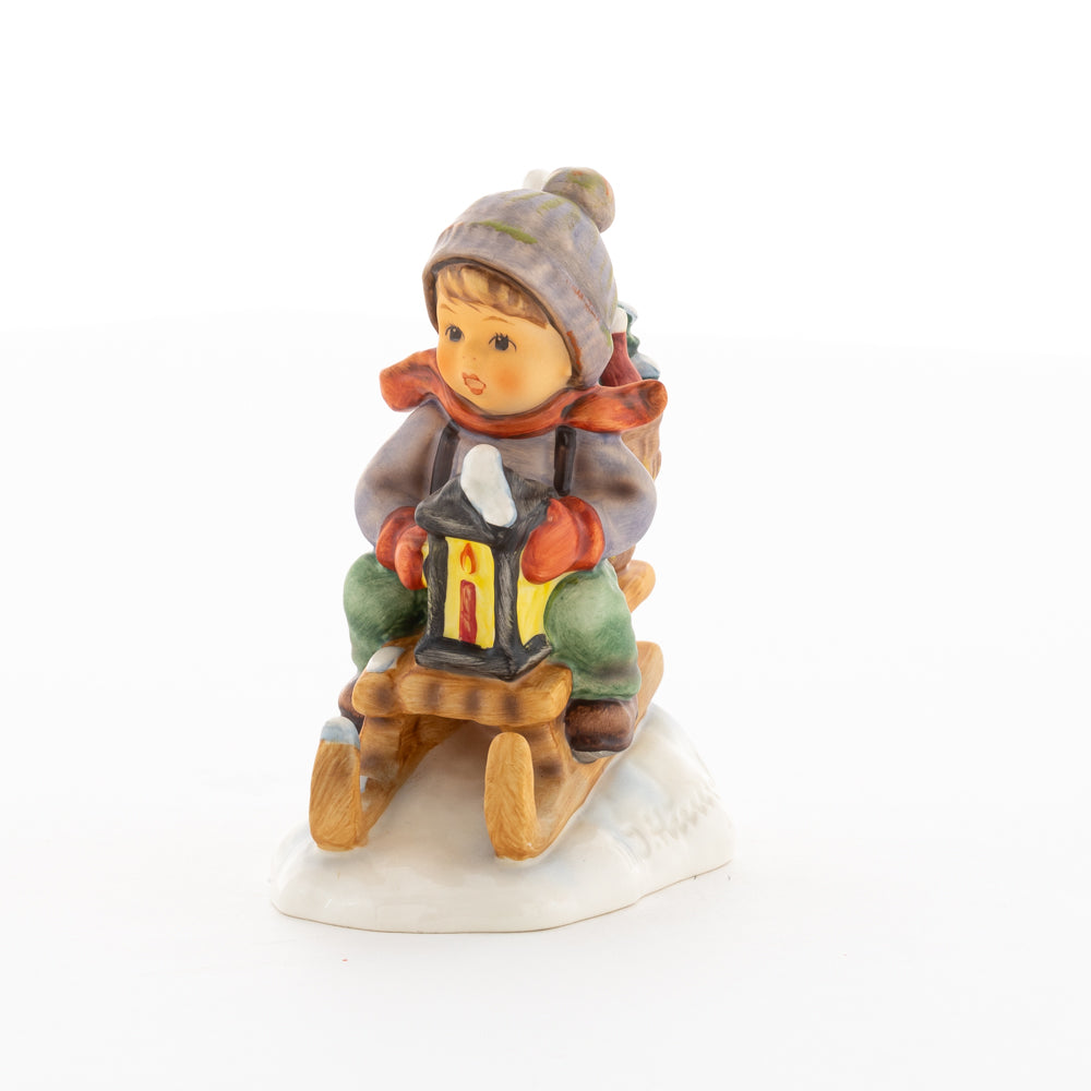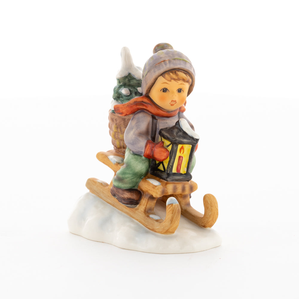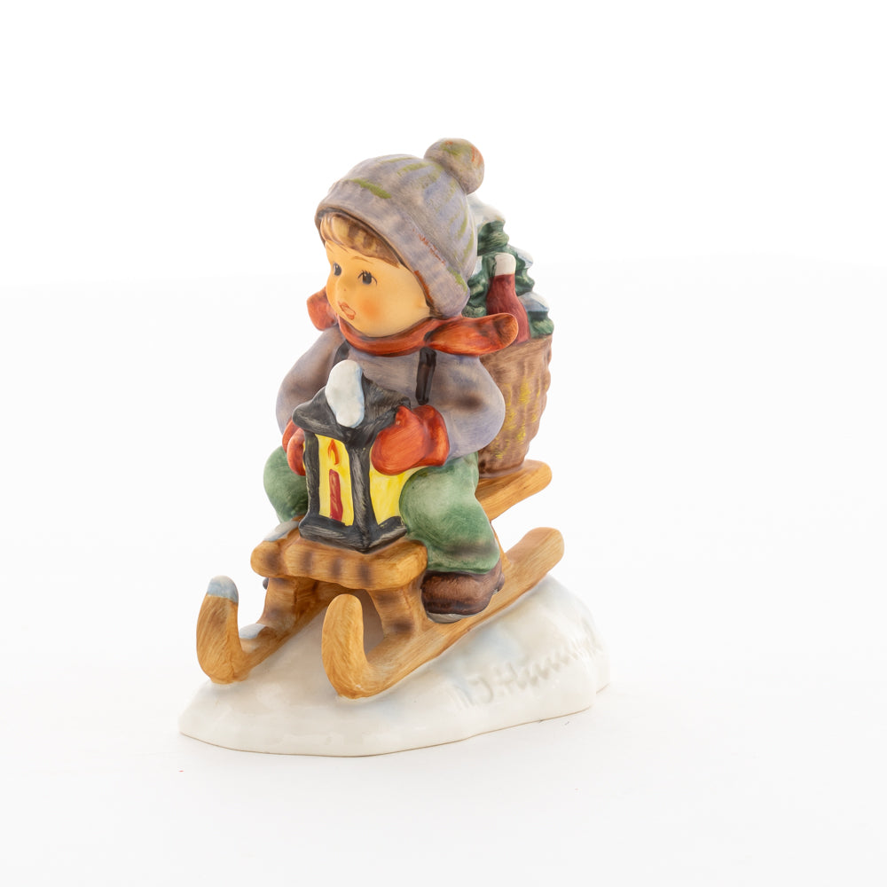 Hui! Schneller als gedacht saust der kleine Hummel-Bub auf seinem Schlitten den verschneiten Hügel hinab. Ganz fest hält er seine Laterne, die ihm den Weg leuchtet. Keinesfalls darf das Licht ausgehen, das ihm den Weg leuchtet! Hoffentlich denkt der junge Mann aus der Hummel Manufaktur auch an den Tannenbaum am Ende seines Schlittens? Nicht, dass er das liebevoll ausgesuchte Bäumchen noch verliert. Dabei soll das Tannengrün doch die gute Stube schmücken!