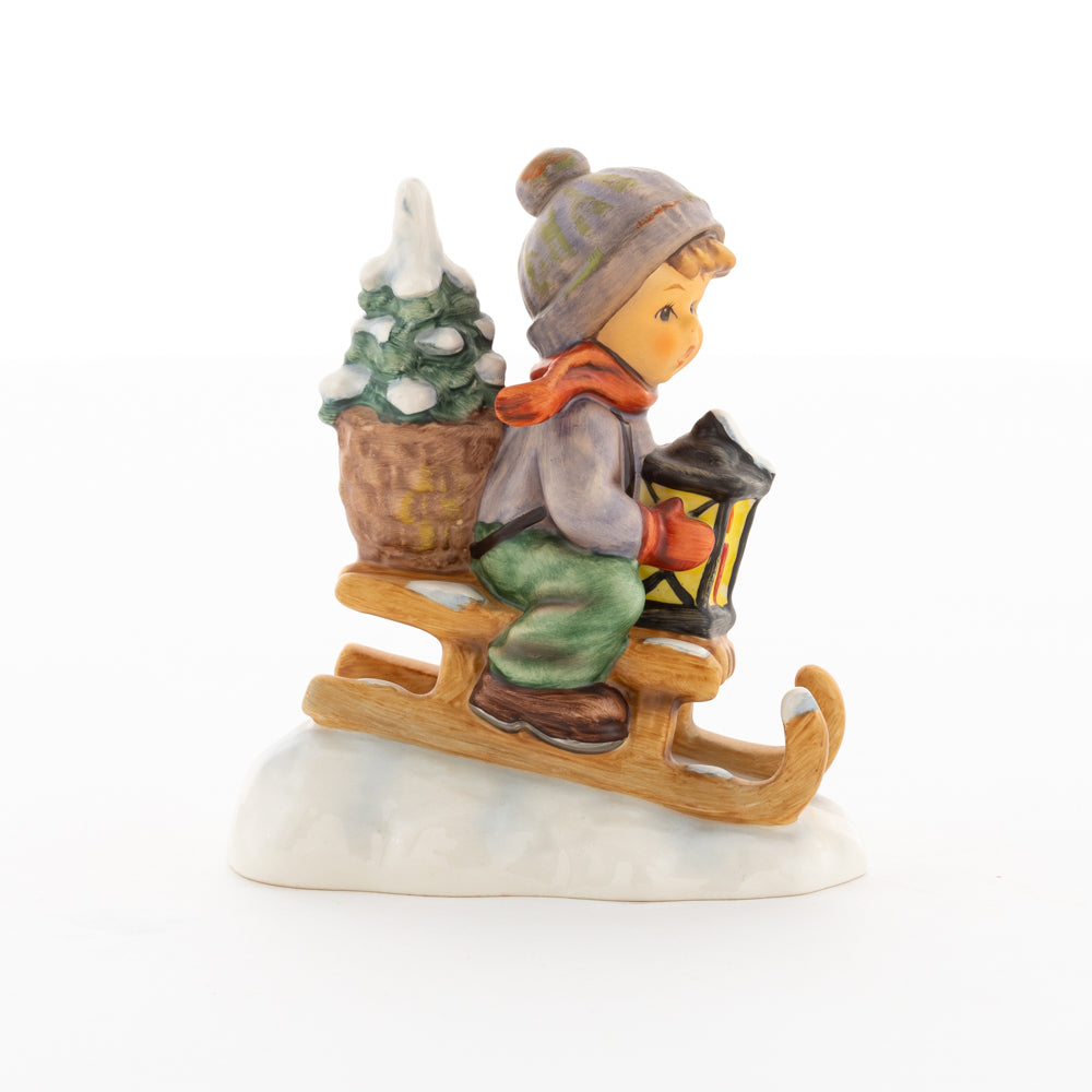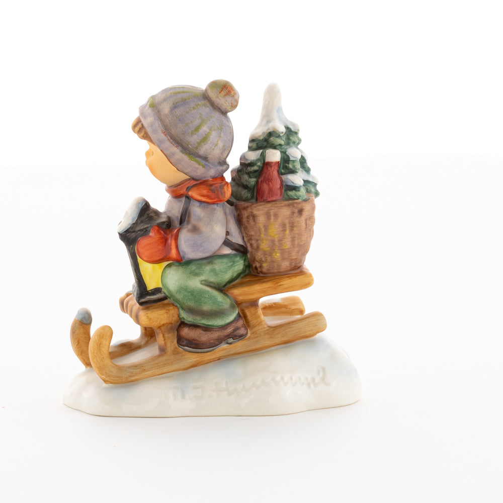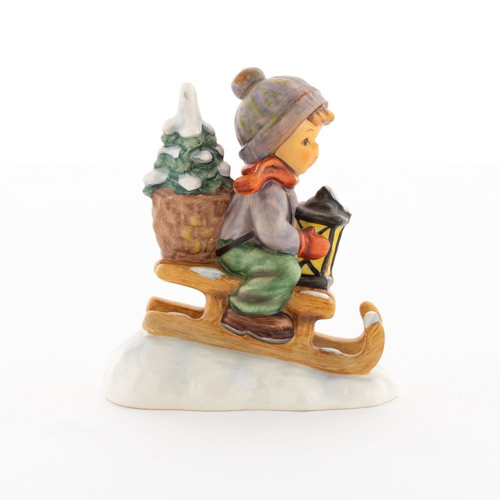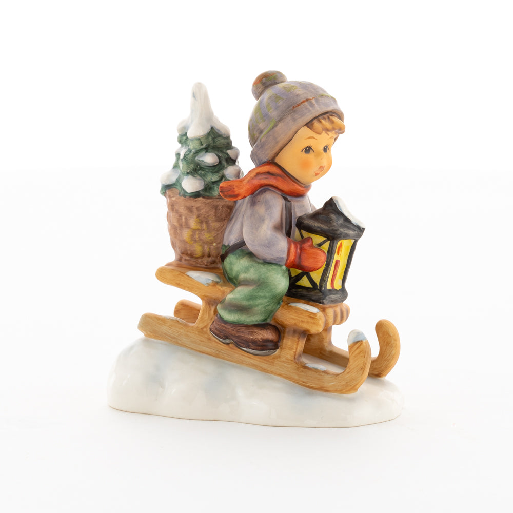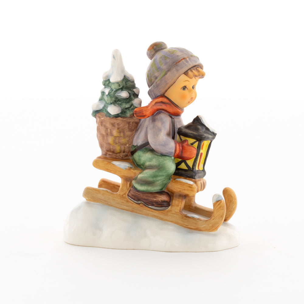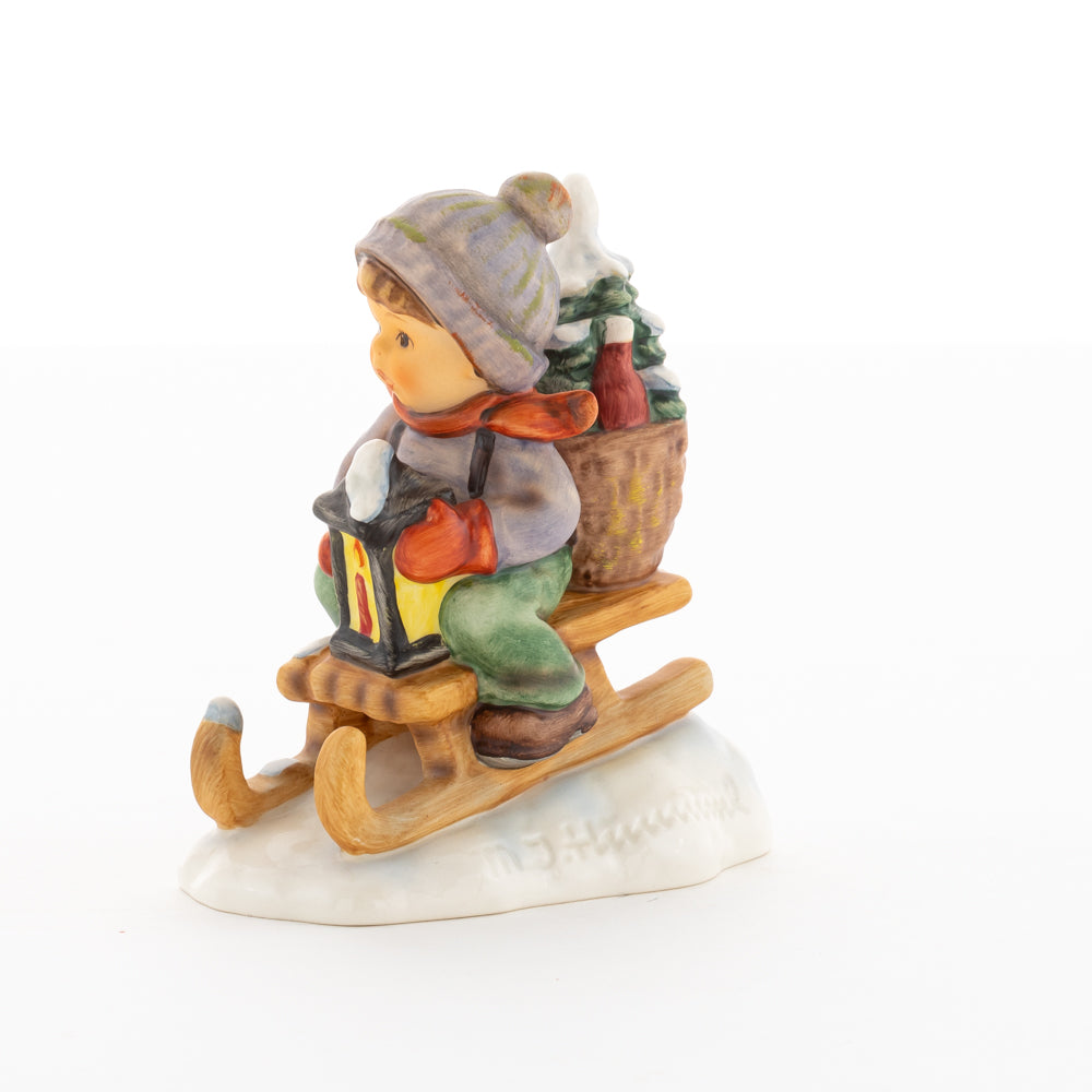 Hui! Schneller als gedacht saust der kleine Hummel-Bub auf seinem Schlitten den verschneiten Hügel hinab. Ganz fest hält er seine Laterne, die ihm den Weg leuchtet. Keinesfalls darf das Licht ausgehen, das ihm den Weg leuchtet! Hoffentlich denkt der junge Mann aus der Hummel Manufaktur auch an den Tannenbaum am Ende seines Schlittens? Nicht, dass er das liebevoll ausgesuchte Bäumchen noch verliert. Dabei soll das Tannengrün doch die gute Stube schmücken!