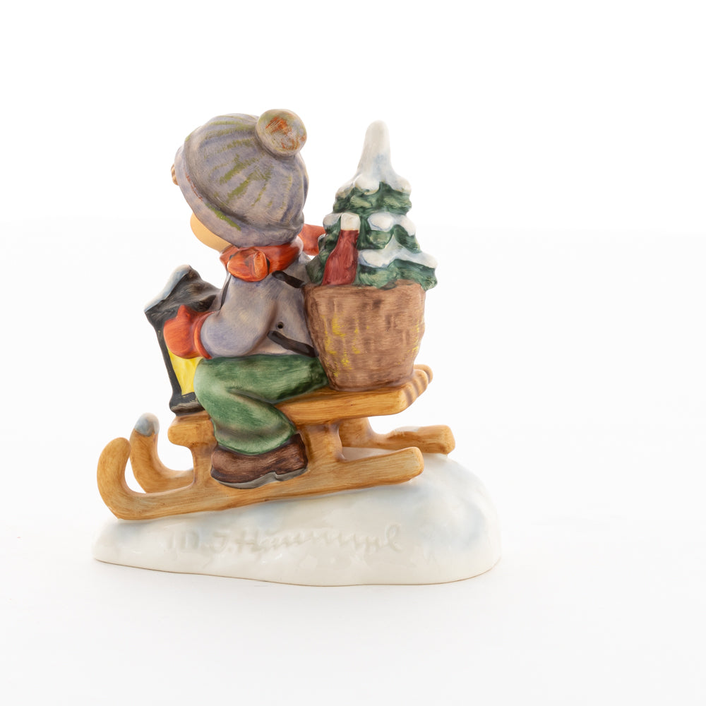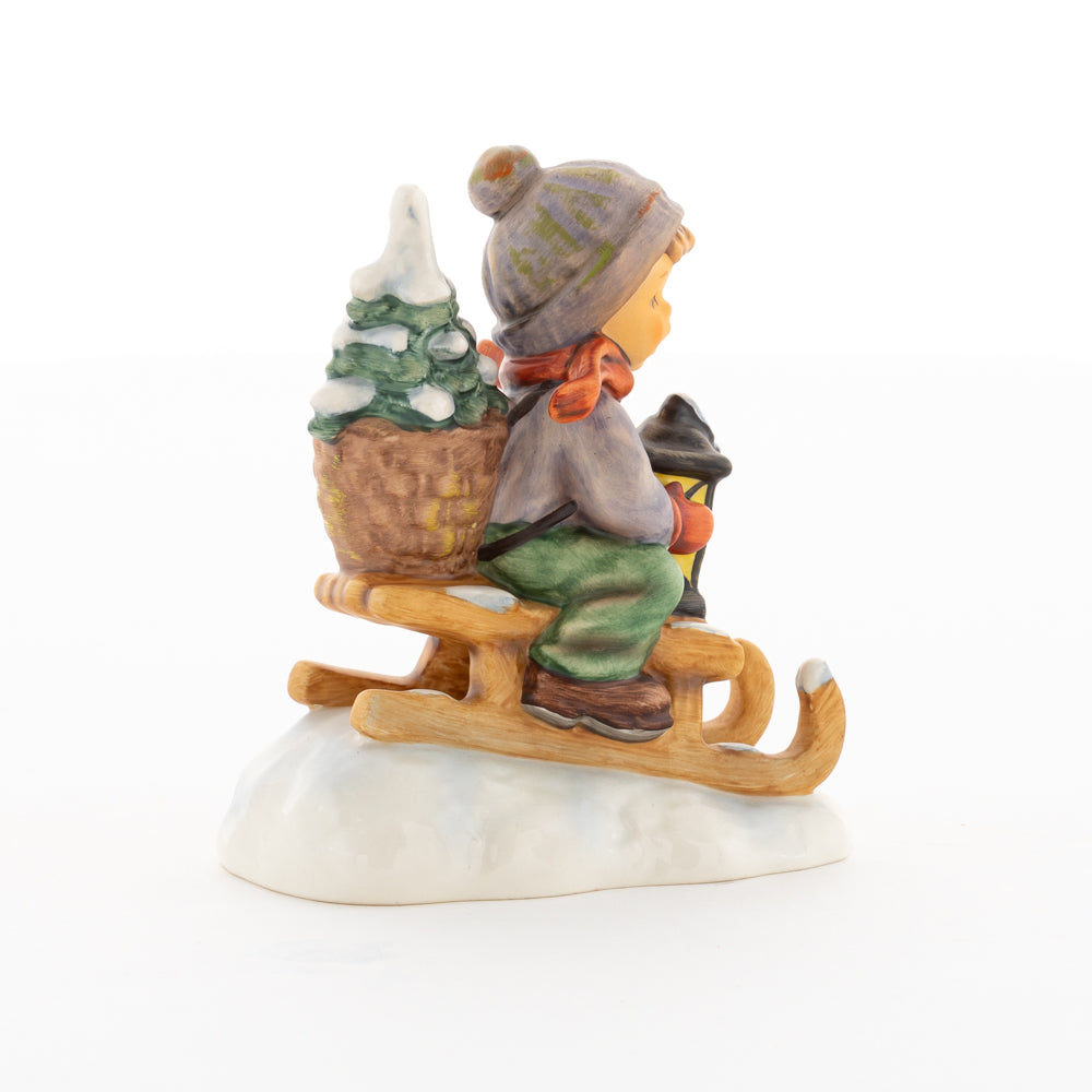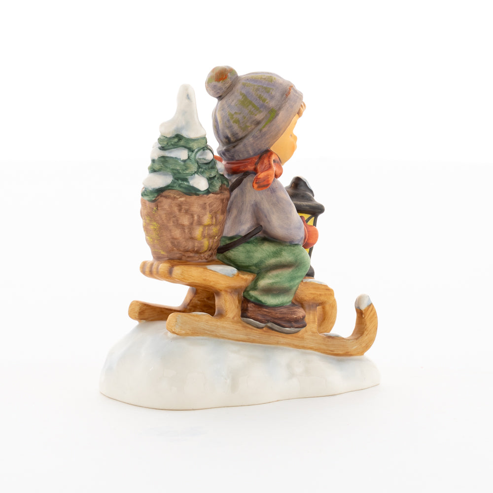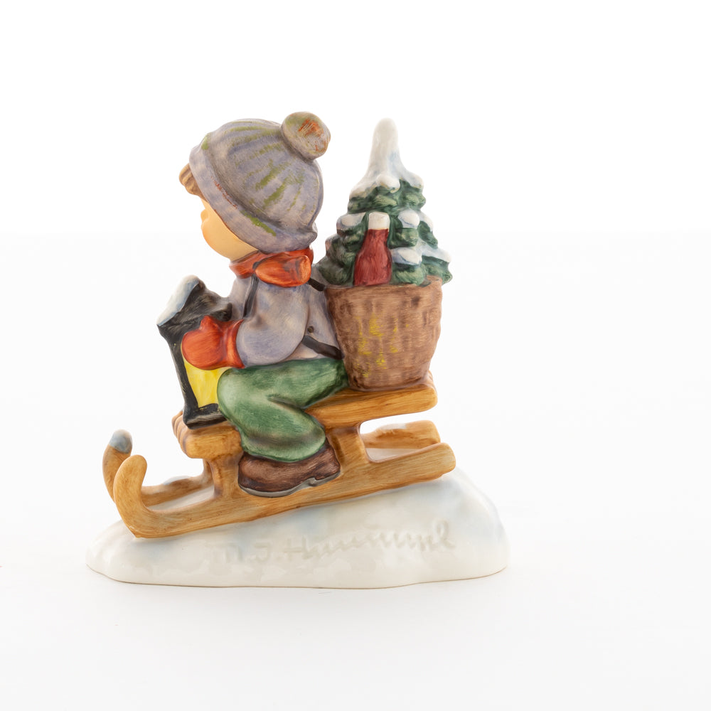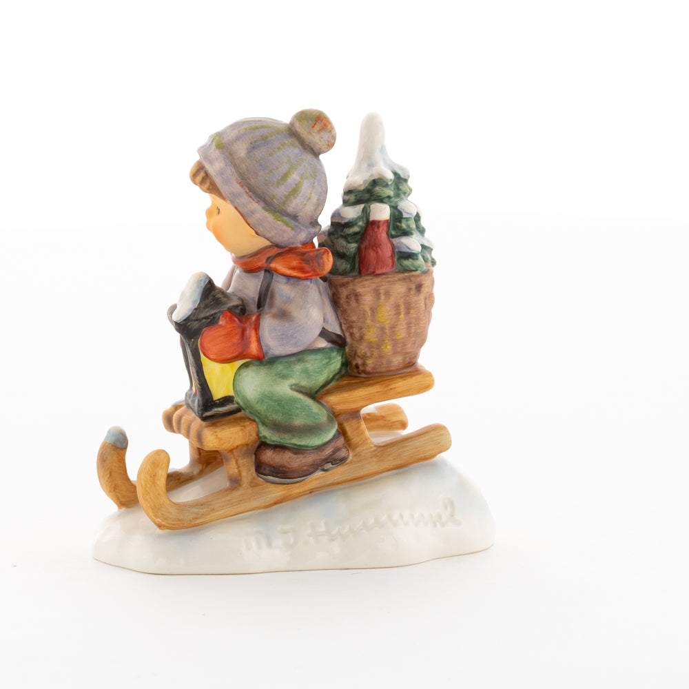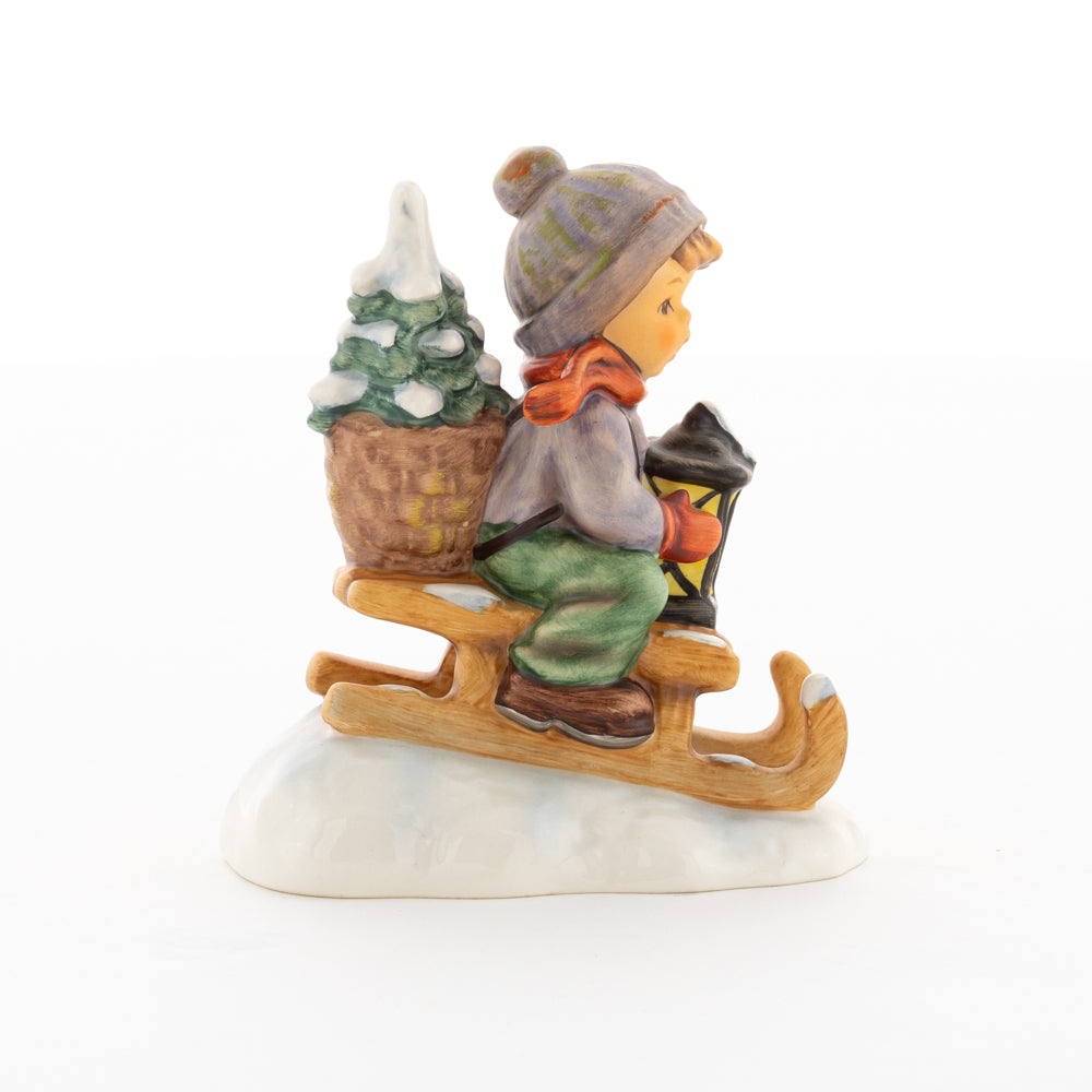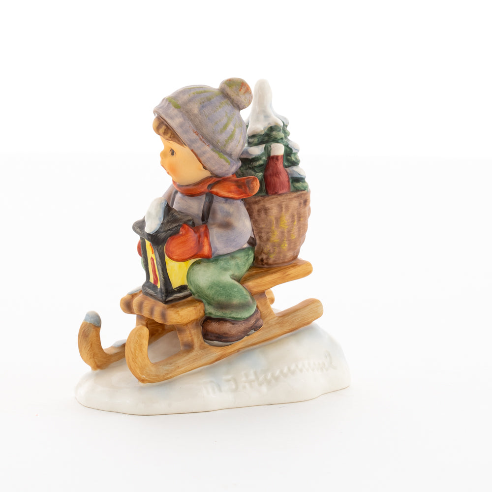 Hui! Schneller als gedacht saust der kleine Hummel-Bub auf seinem Schlitten den verschneiten Hügel hinab. Ganz fest hält er seine Laterne, die ihm den Weg leuchtet. Keinesfalls darf das Licht ausgehen, das ihm den Weg leuchtet! Hoffentlich denkt der junge Mann aus der Hummel Manufaktur auch an den Tannenbaum am Ende seines Schlittens? Nicht, dass er das liebevoll ausgesuchte Bäumchen noch verliert. Dabei soll das Tannengrün doch die gute Stube schmücken!