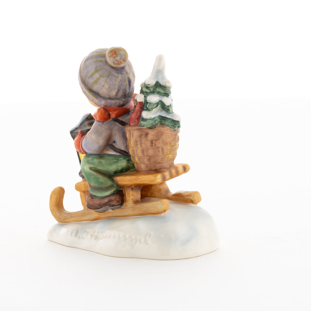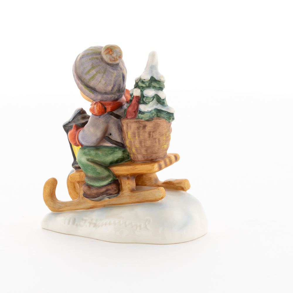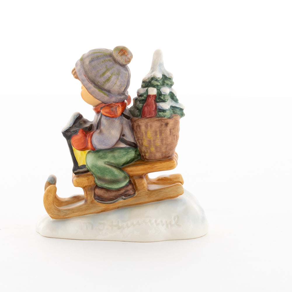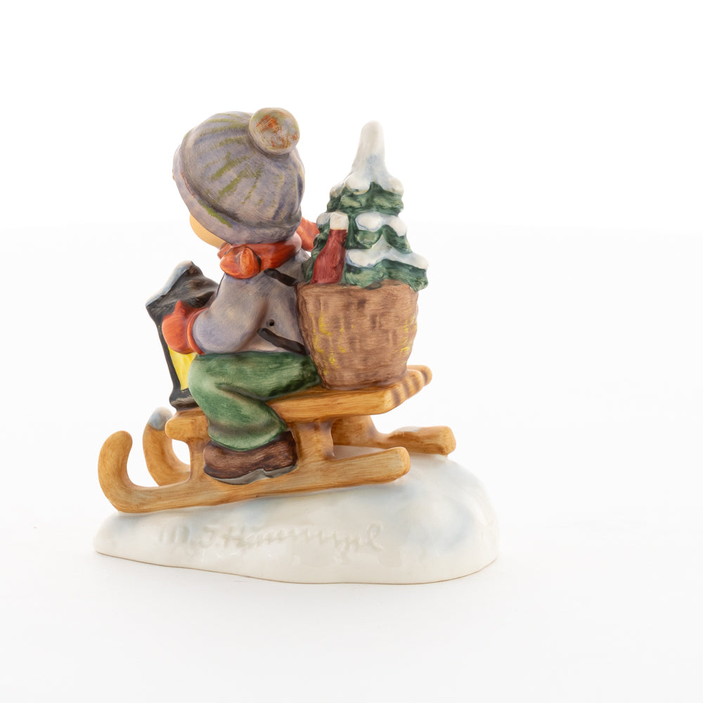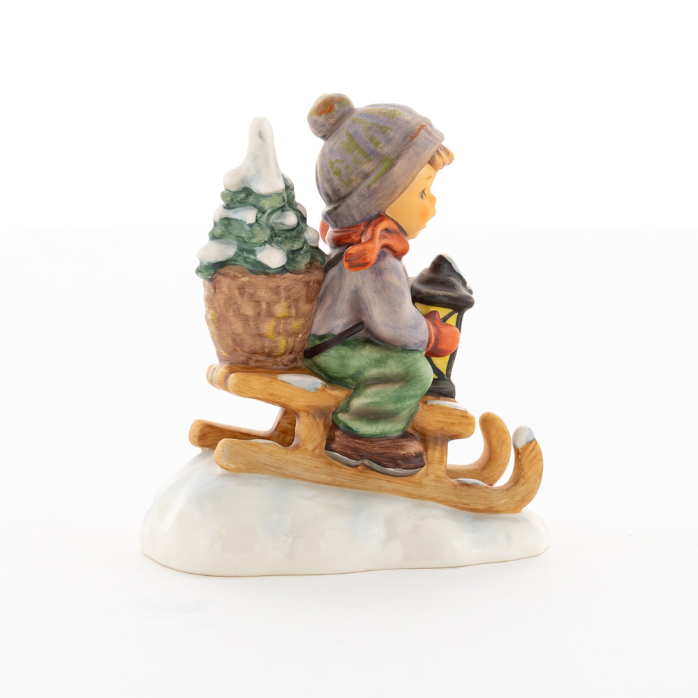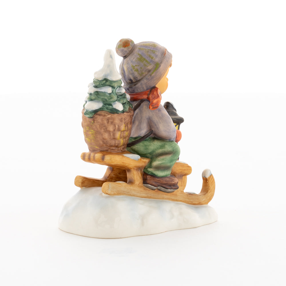 Hui! Schneller als gedacht saust der kleine Hummel-Bub auf seinem Schlitten den verschneiten Hügel hinab. Ganz fest hält er seine Laterne, die ihm den Weg leuchtet. Keinesfalls darf das Licht ausgehen, das ihm den Weg leuchtet! Hoffentlich denkt der junge Mann aus der Hummel Manufaktur auch an den Tannenbaum am Ende seines Schlittens? Nicht, dass er das liebevoll ausgesuchte Bäumchen noch verliert. Dabei soll das Tannengrün doch die gute Stube schmücken!