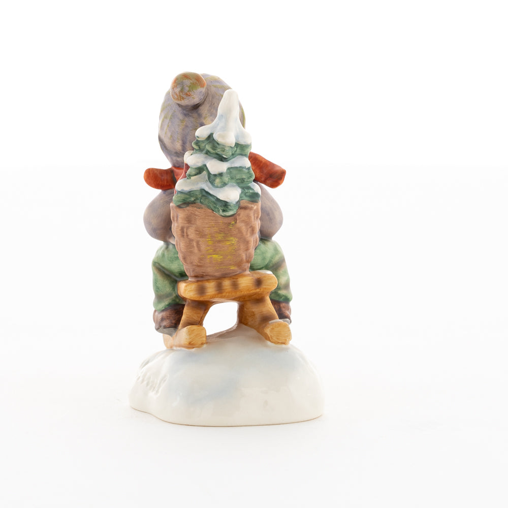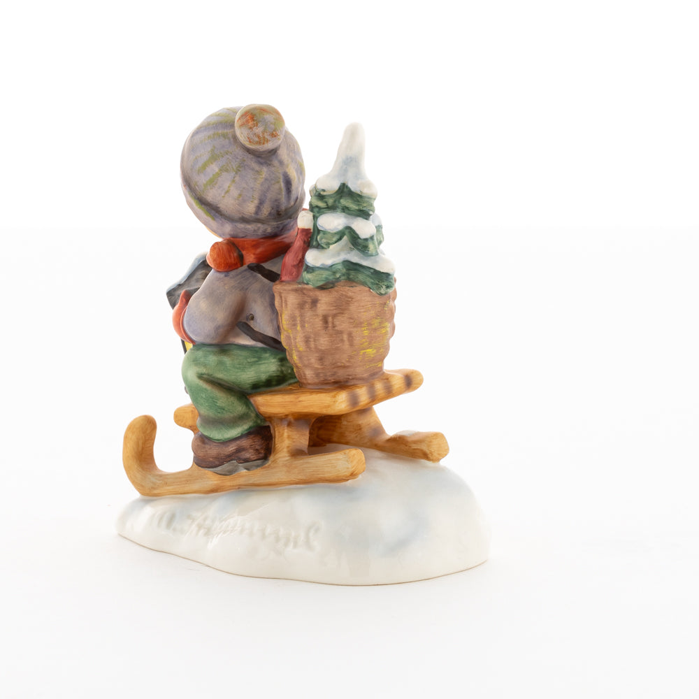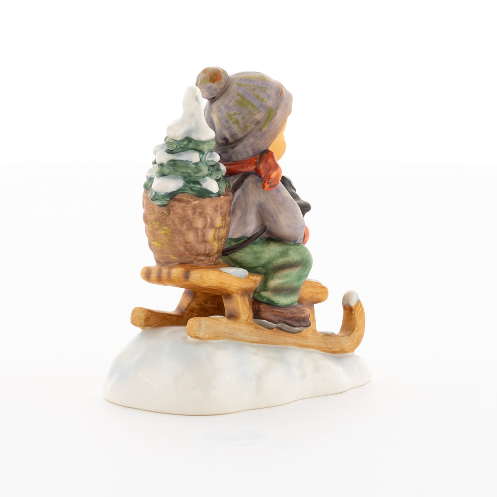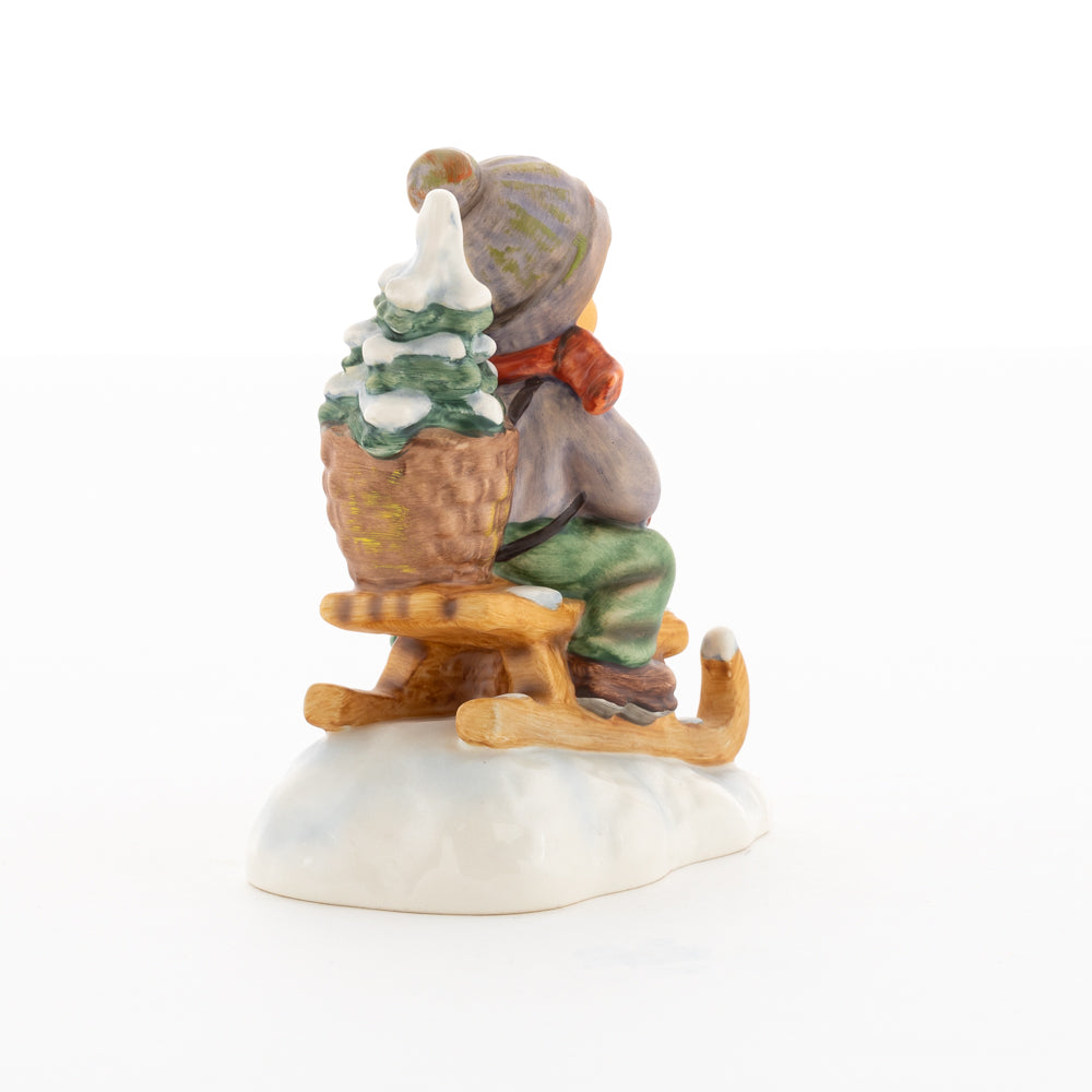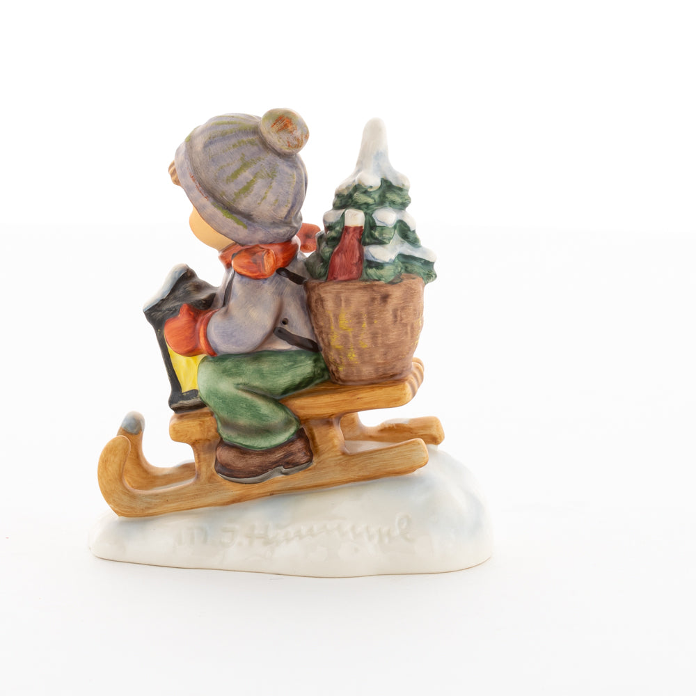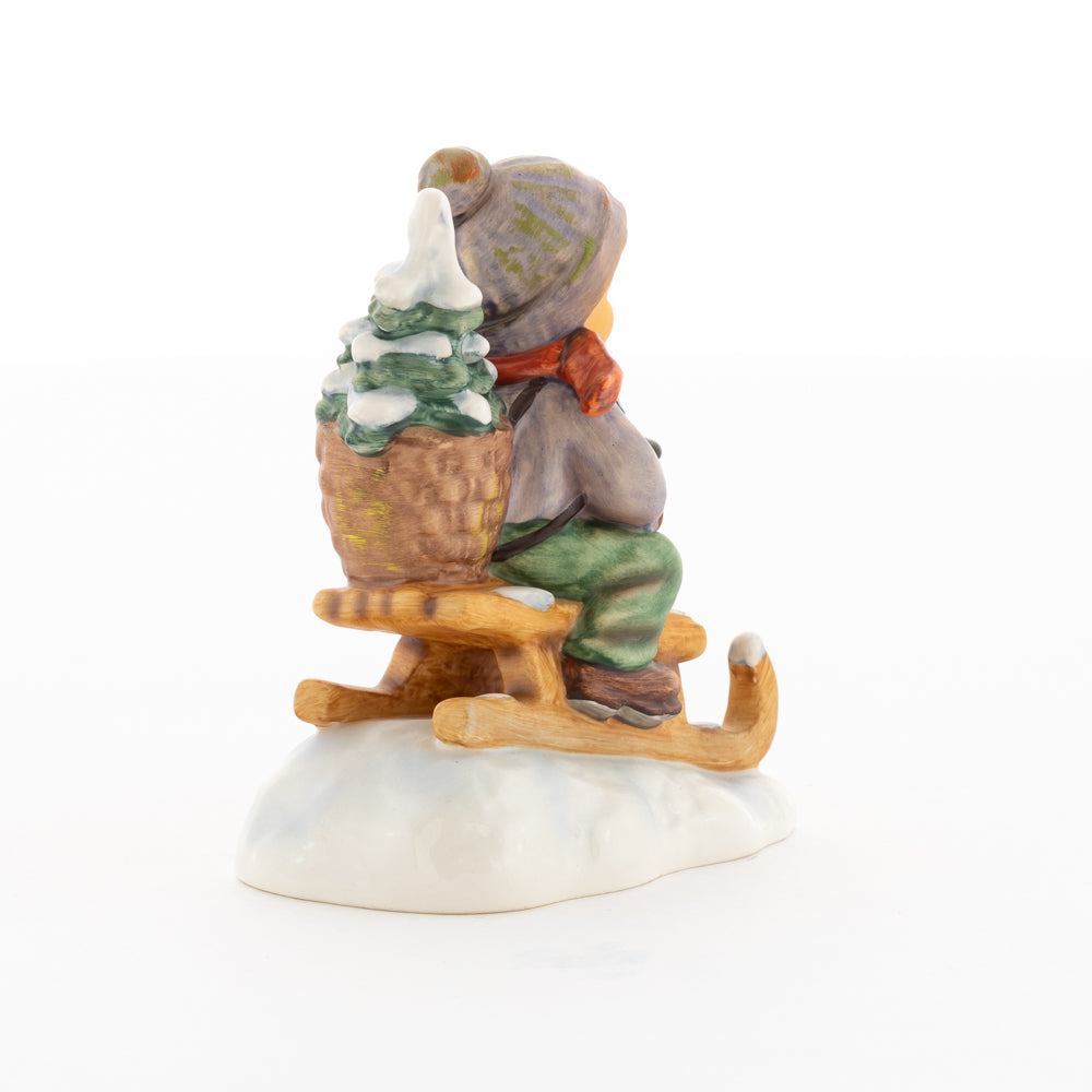 Hui! Schneller als gedacht saust der kleine Hummel-Bub auf seinem Schlitten den verschneiten Hügel hinab. Ganz fest hält er seine Laterne, die ihm den Weg leuchtet. Keinesfalls darf das Licht ausgehen, das ihm den Weg leuchtet! Hoffentlich denkt der junge Mann aus der Hummel Manufaktur auch an den Tannenbaum am Ende seines Schlittens? Nicht, dass er das liebevoll ausgesuchte Bäumchen noch verliert. Dabei soll das Tannengrün doch die gute Stube schmücken!