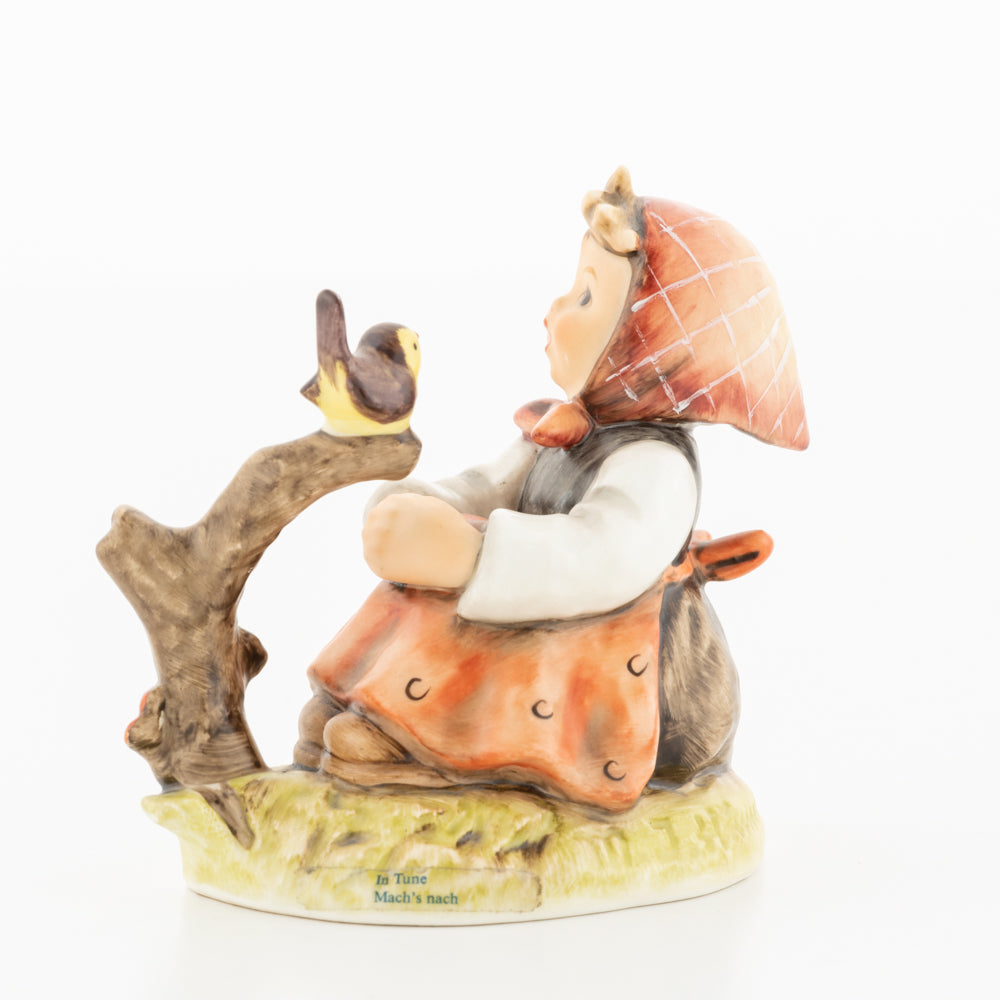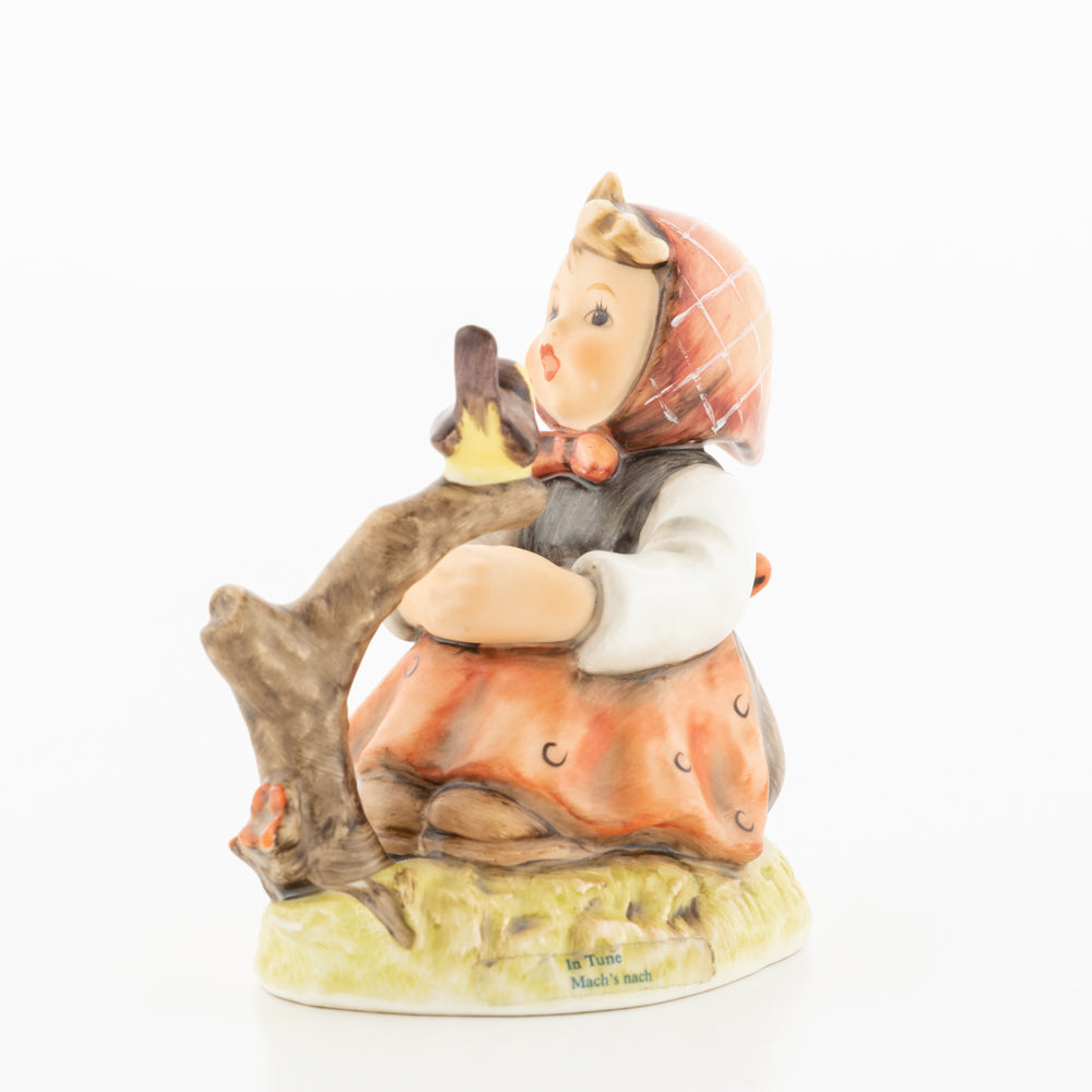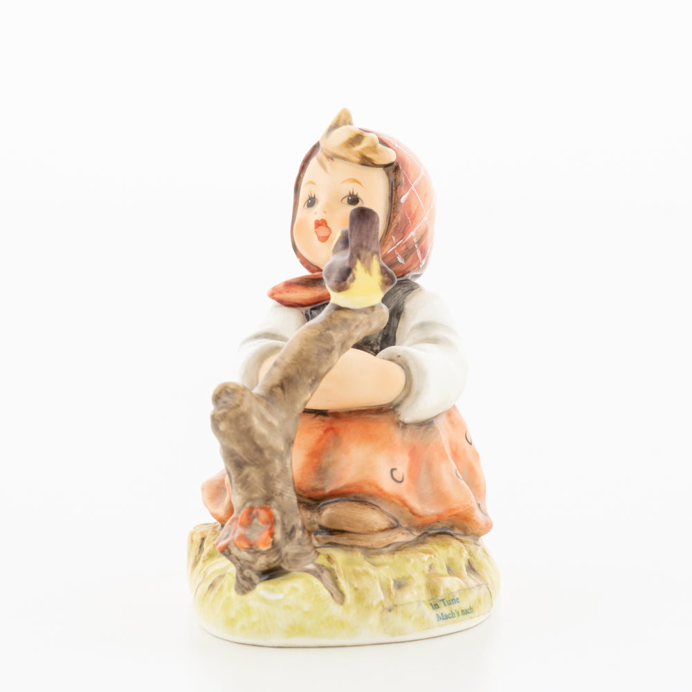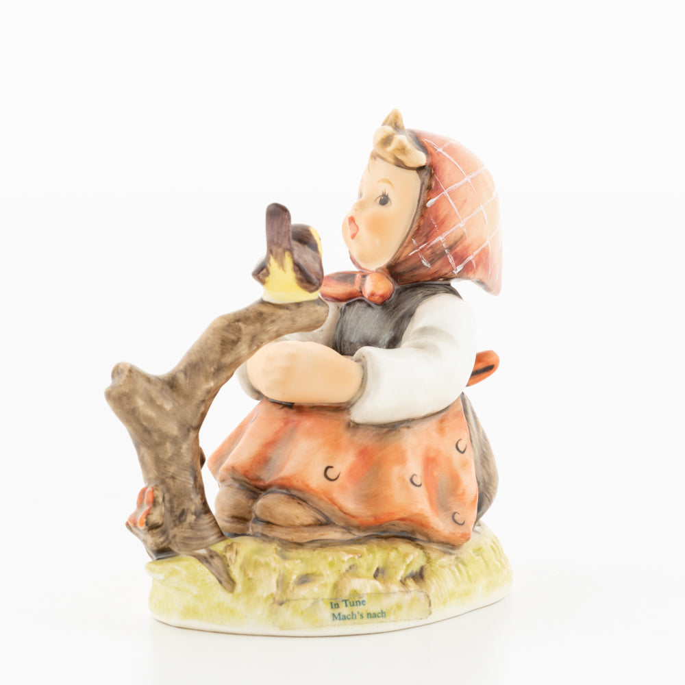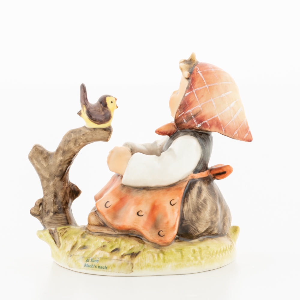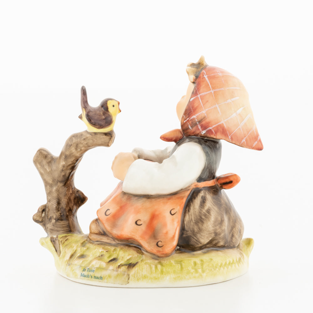 Wer wohl zuerst sein Liedchen angestimmt hat? Das reizende Duett "Mach´s nach" aus Hummel-Mädchen und dem kleinen Vögelchen wurde im Jahr 1981 erstmalig für den amerikanischen Markt produziert. Meistermodelleur Gerhard Skrobek hauchte der original M.I. Hummel-Figur Leben ein. Die beiden fröhlichen Gesellen aus der Hummel Manufaktur Rödental sind auch auf der Hummel-Glocke HUM 703 und dem Springtime Teller HUM 297 als Motiv zu finden.