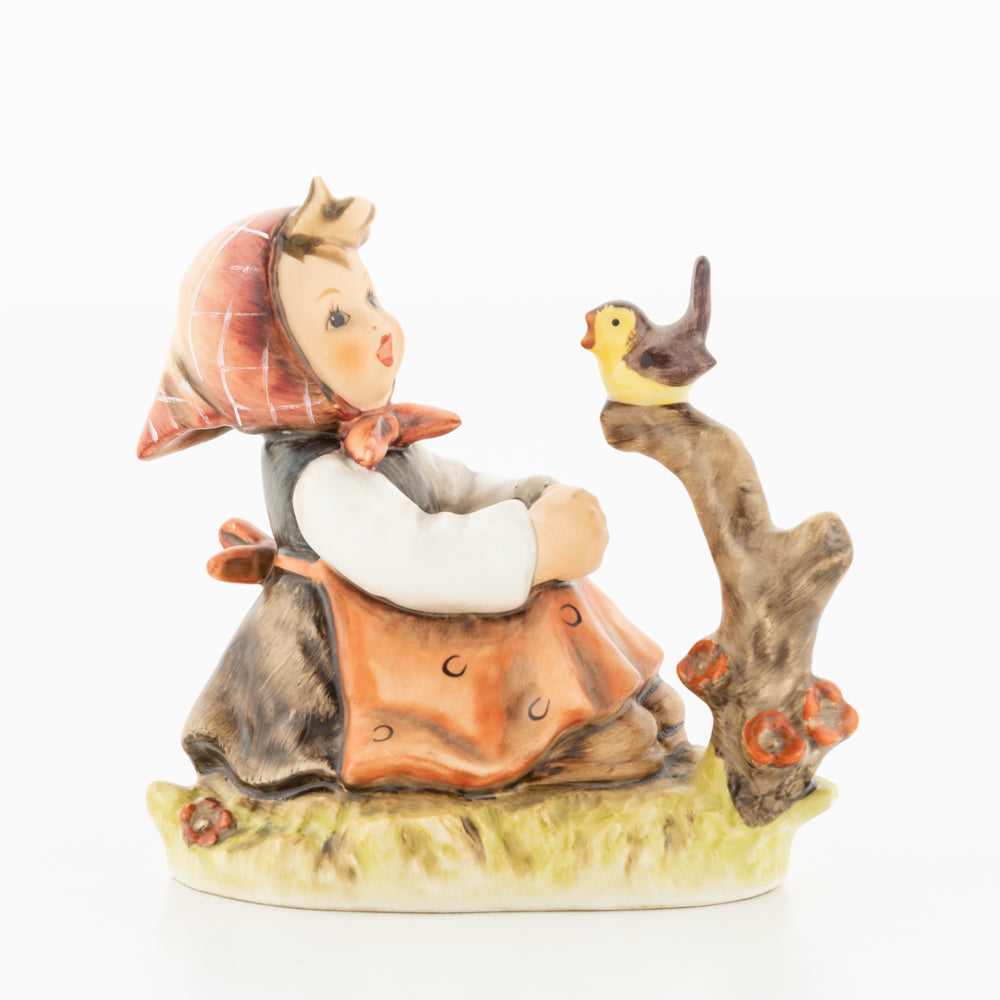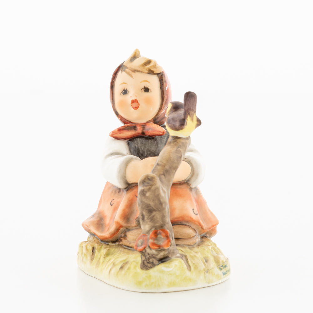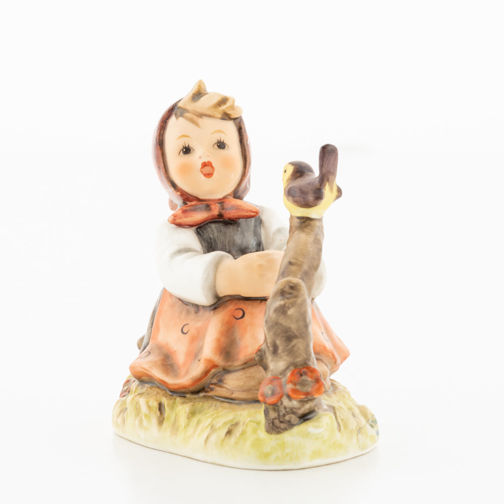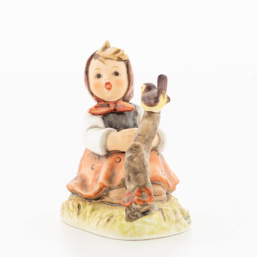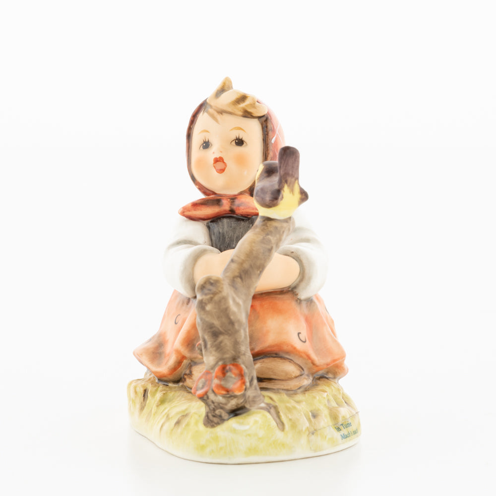 Wer wohl zuerst sein Liedchen angestimmt hat? Das reizende Duett "Mach´s nach" aus Hummel-Mädchen und dem kleinen Vögelchen wurde im Jahr 1981 erstmalig für den amerikanischen Markt produziert. Meistermodelleur Gerhard Skrobek hauchte der original M.I. Hummel-Figur Leben ein. Die beiden fröhlichen Gesellen aus der Hummel Manufaktur Rödental sind auch auf der Hummel-Glocke HUM 703 und dem Springtime Teller HUM 297 als Motiv zu finden.