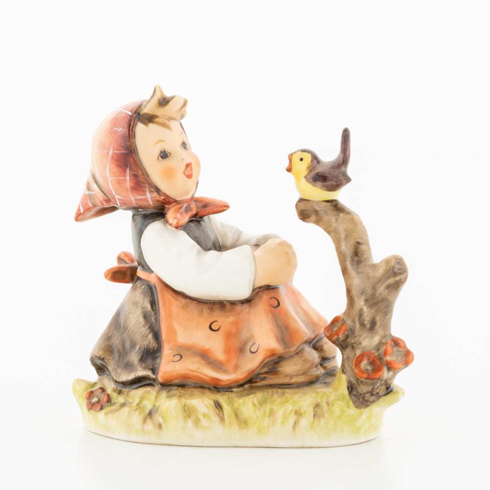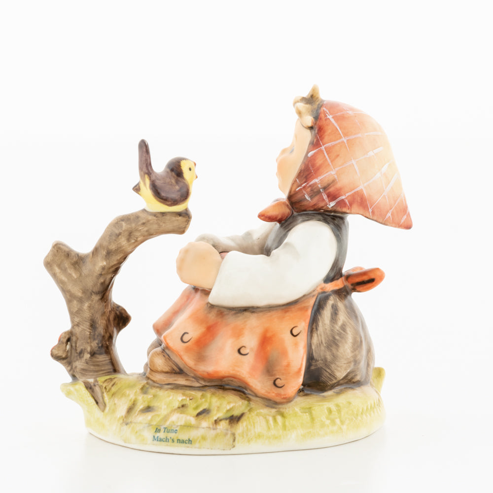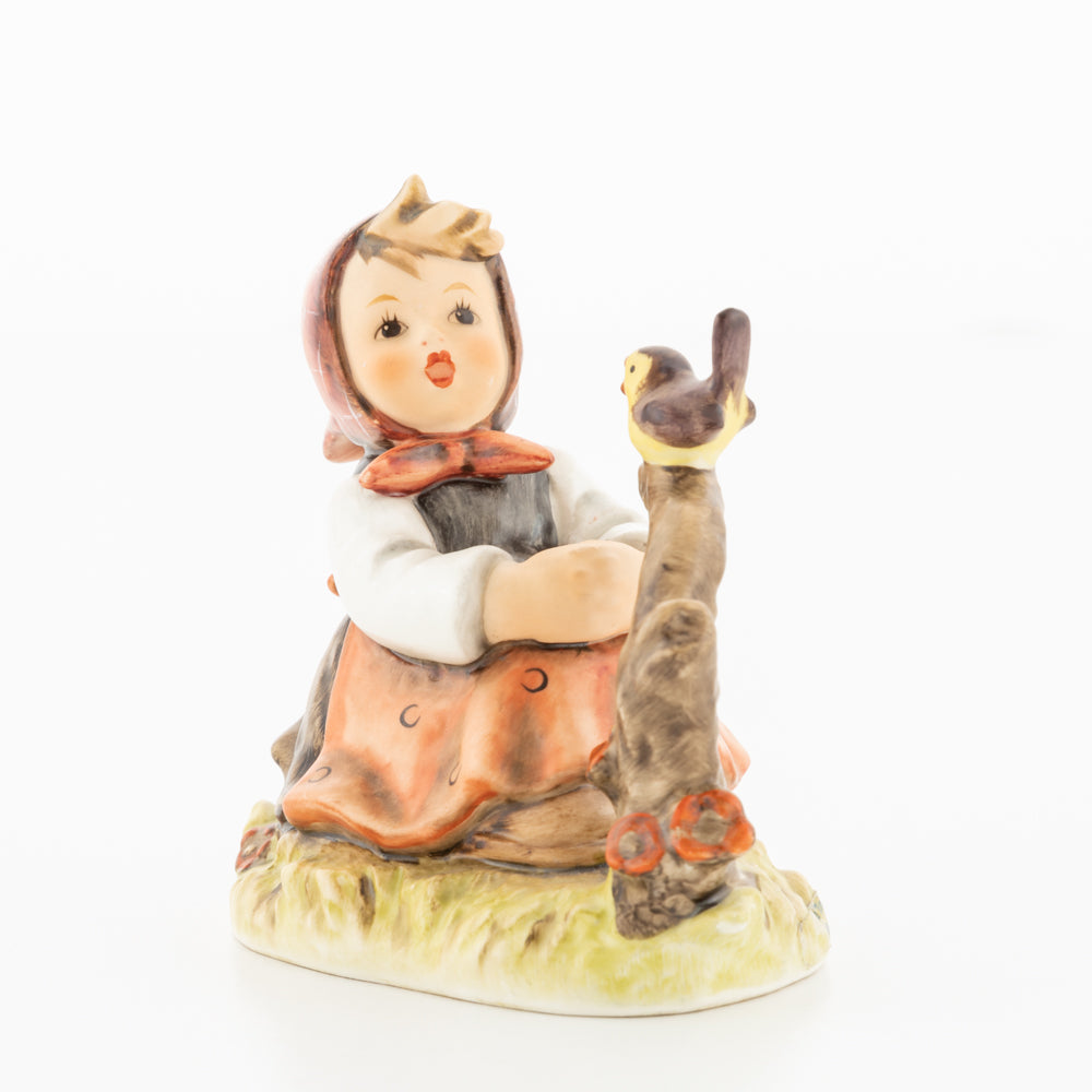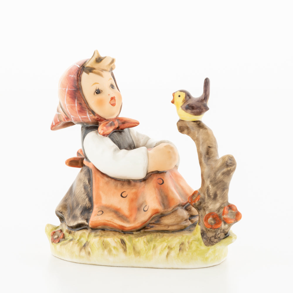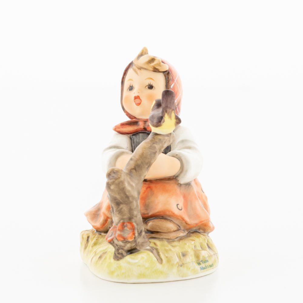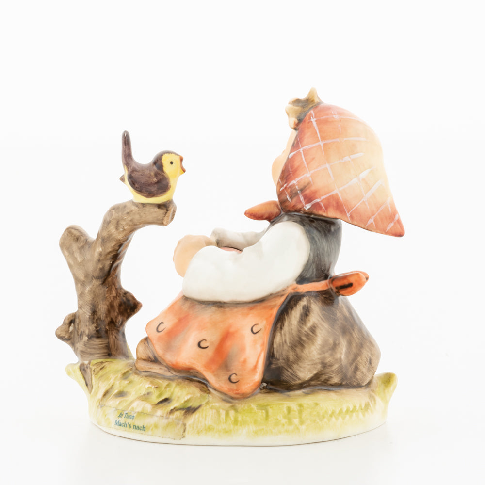 Wer wohl zuerst sein Liedchen angestimmt hat? Das reizende Duett "Mach´s nach" aus Hummel-Mädchen und dem kleinen Vögelchen wurde im Jahr 1981 erstmalig für den amerikanischen Markt produziert. Meistermodelleur Gerhard Skrobek hauchte der original M.I. Hummel-Figur Leben ein. Die beiden fröhlichen Gesellen aus der Hummel Manufaktur Rödental sind auch auf der Hummel-Glocke HUM 703 und dem Springtime Teller HUM 297 als Motiv zu finden.