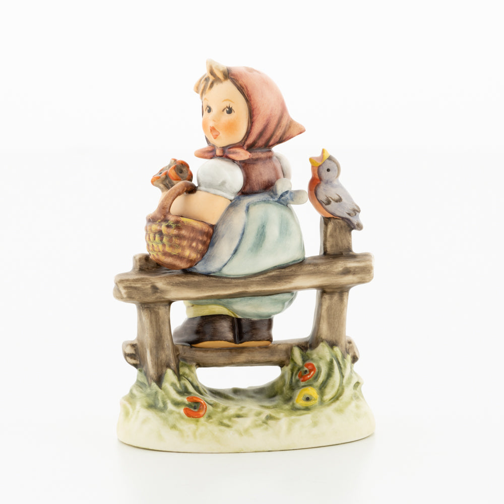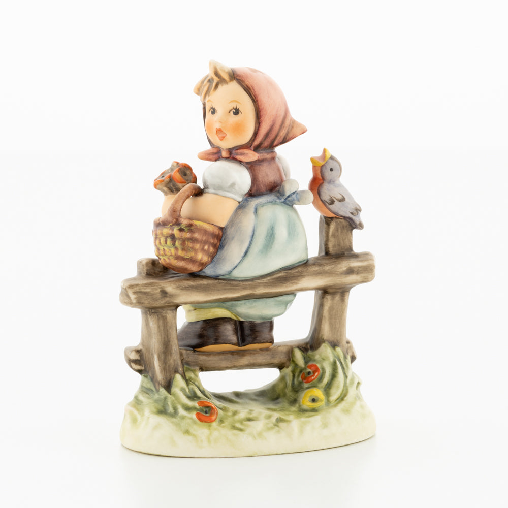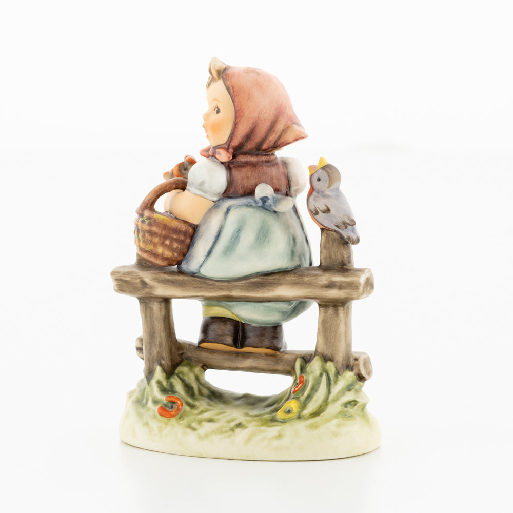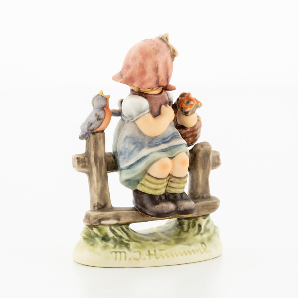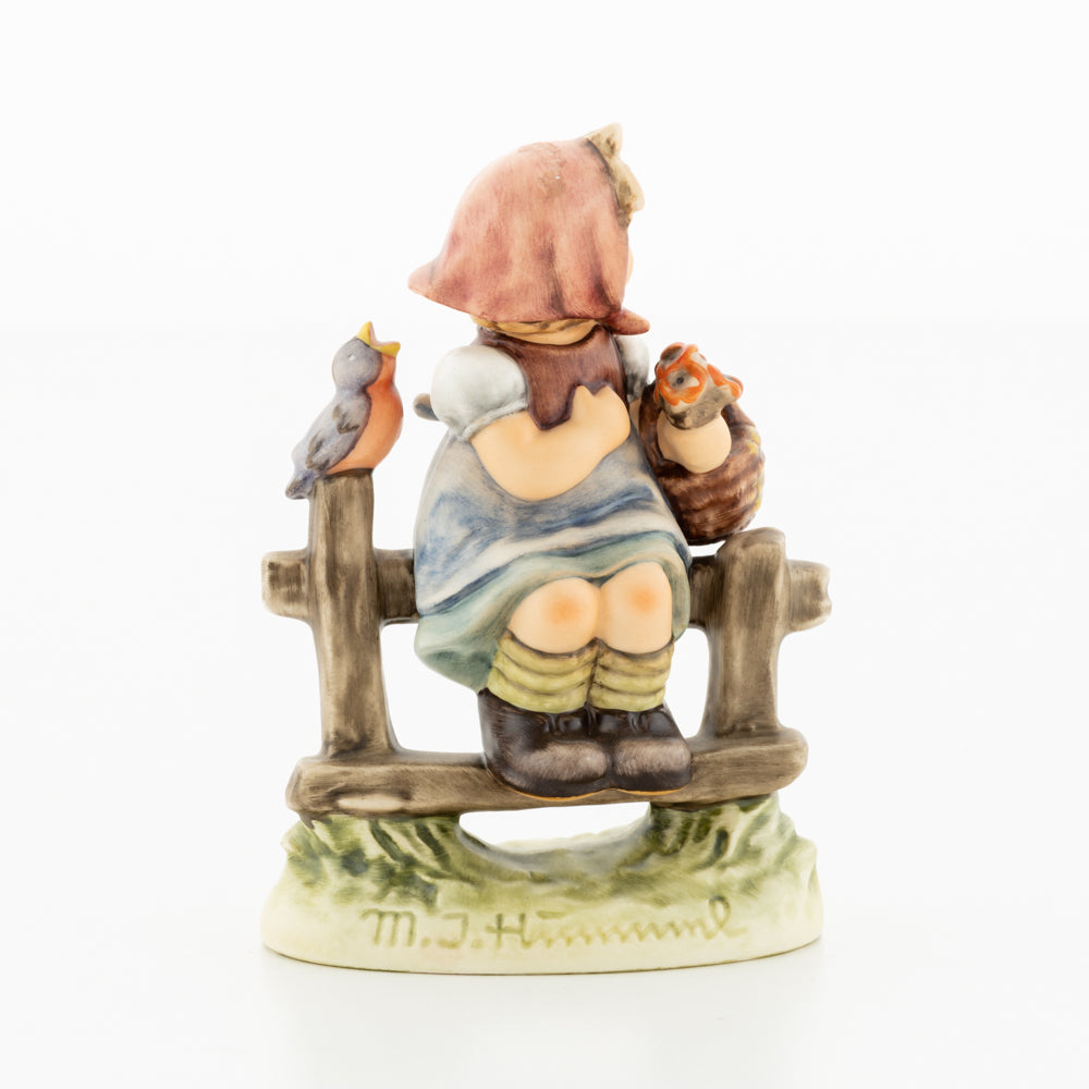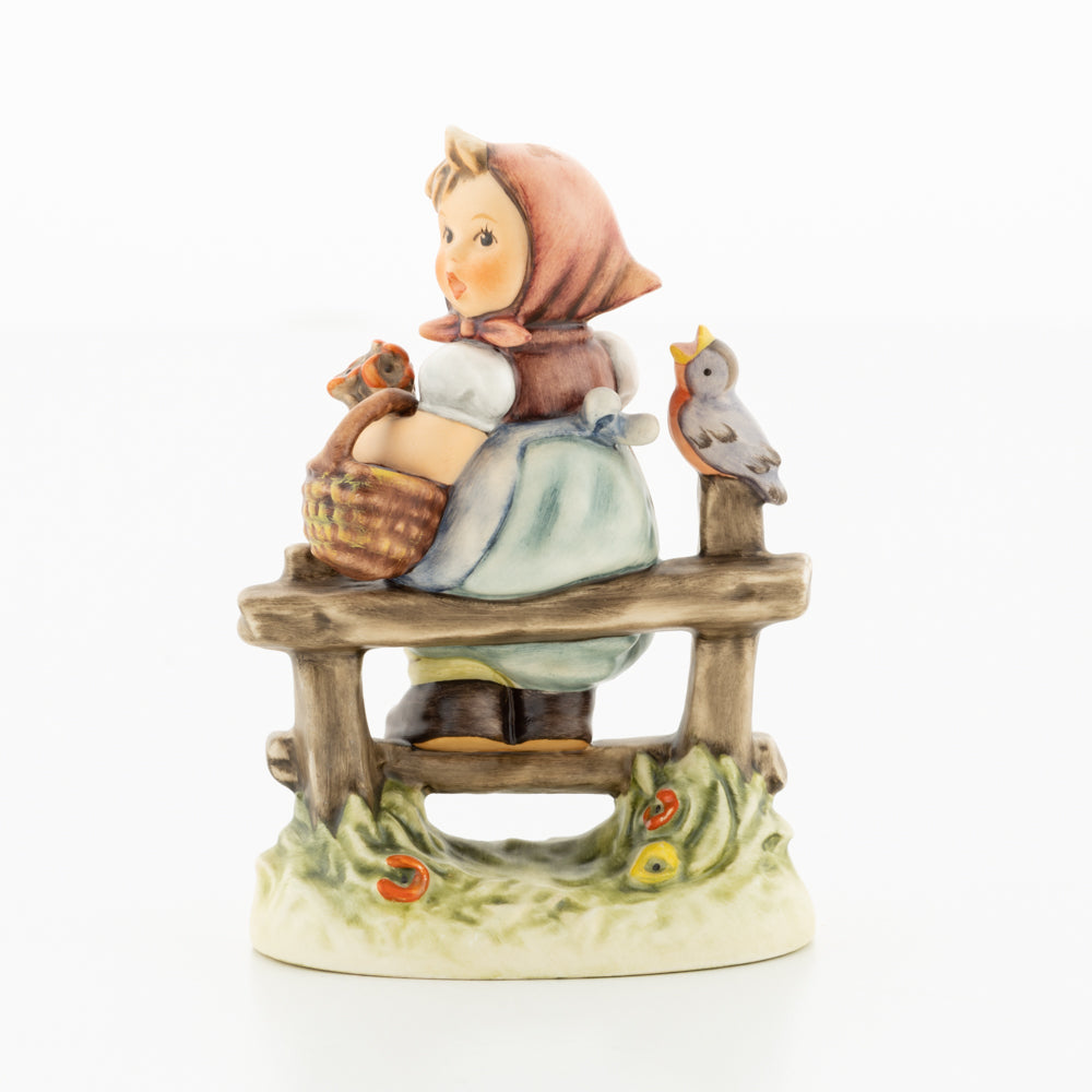 Eine kleine Rast am Wegrand wird doch wohl noch erlaubt sein? Das kleine Hummel-Mädchen hat unterwegs Blumen gepflückt. Ob für den Vater, die Mutter oder die Großeltern. Wer weiß? Ein Vögelchen setzt sich zu dem Mädchen aus dem Hause Hummel und bringt ihm ein Ständchen. Die original M.I. Hummel-Figur wurde 1980 von Meistermodelleur Gerhard Skrobek geschaffen und bezaubert ihren Betrachter durch kindlichen Charme. 1997 wurde ein weiteres Modell dieser original Hummel-Figur von Modelleur Helmut Fischer gestaltet.
