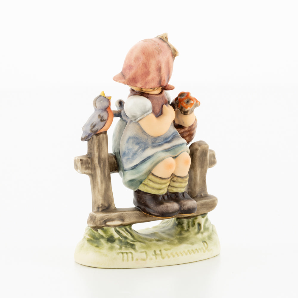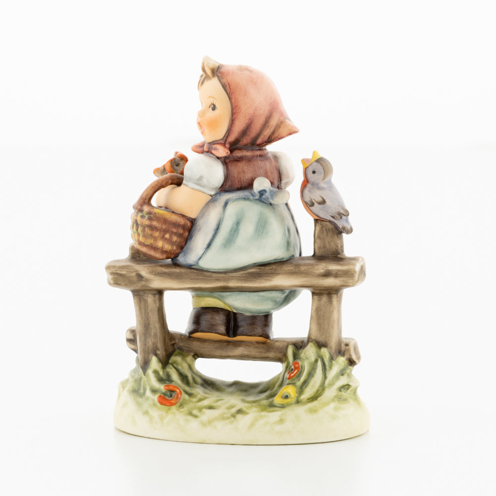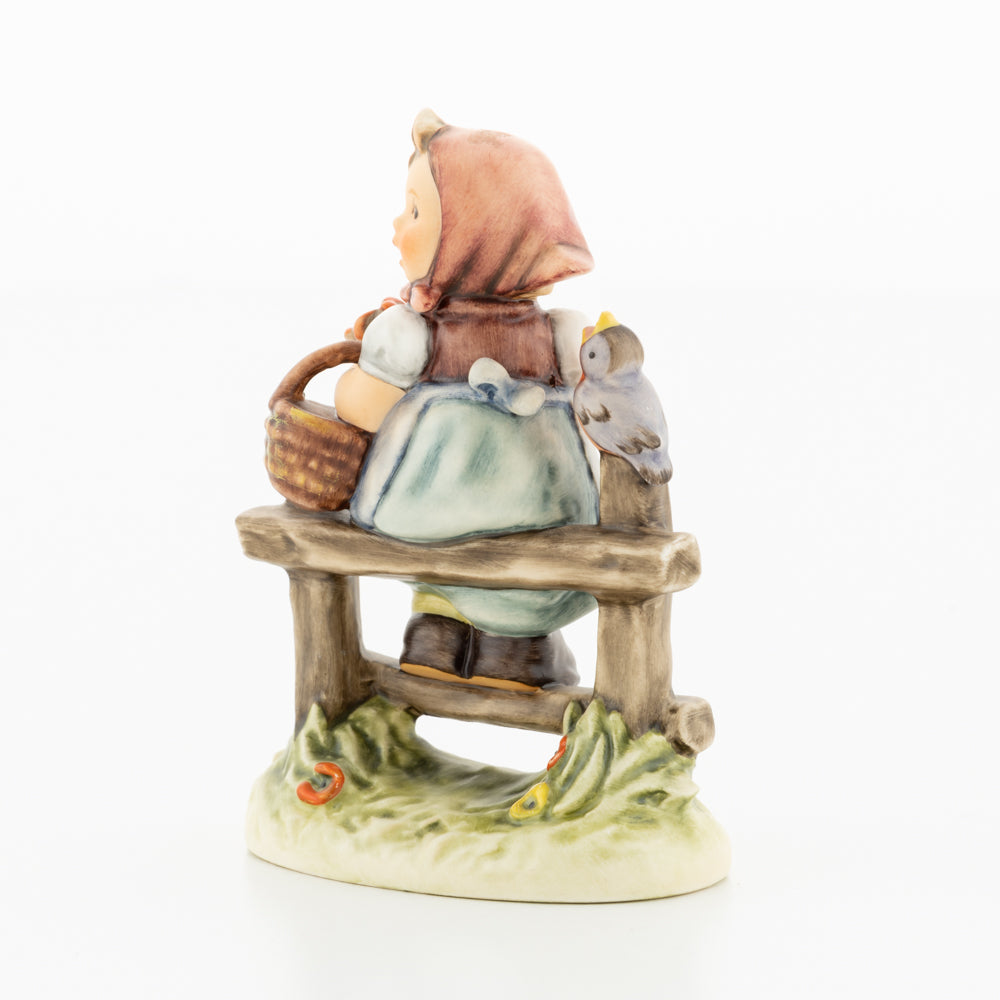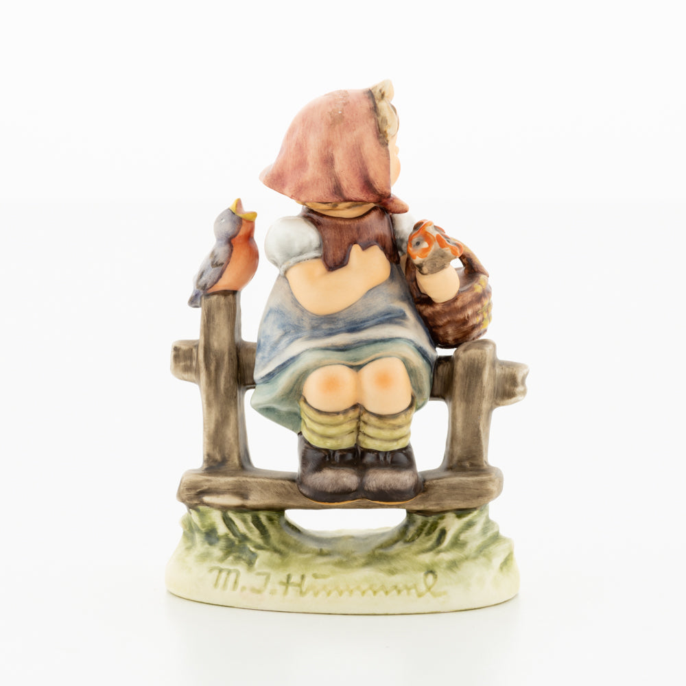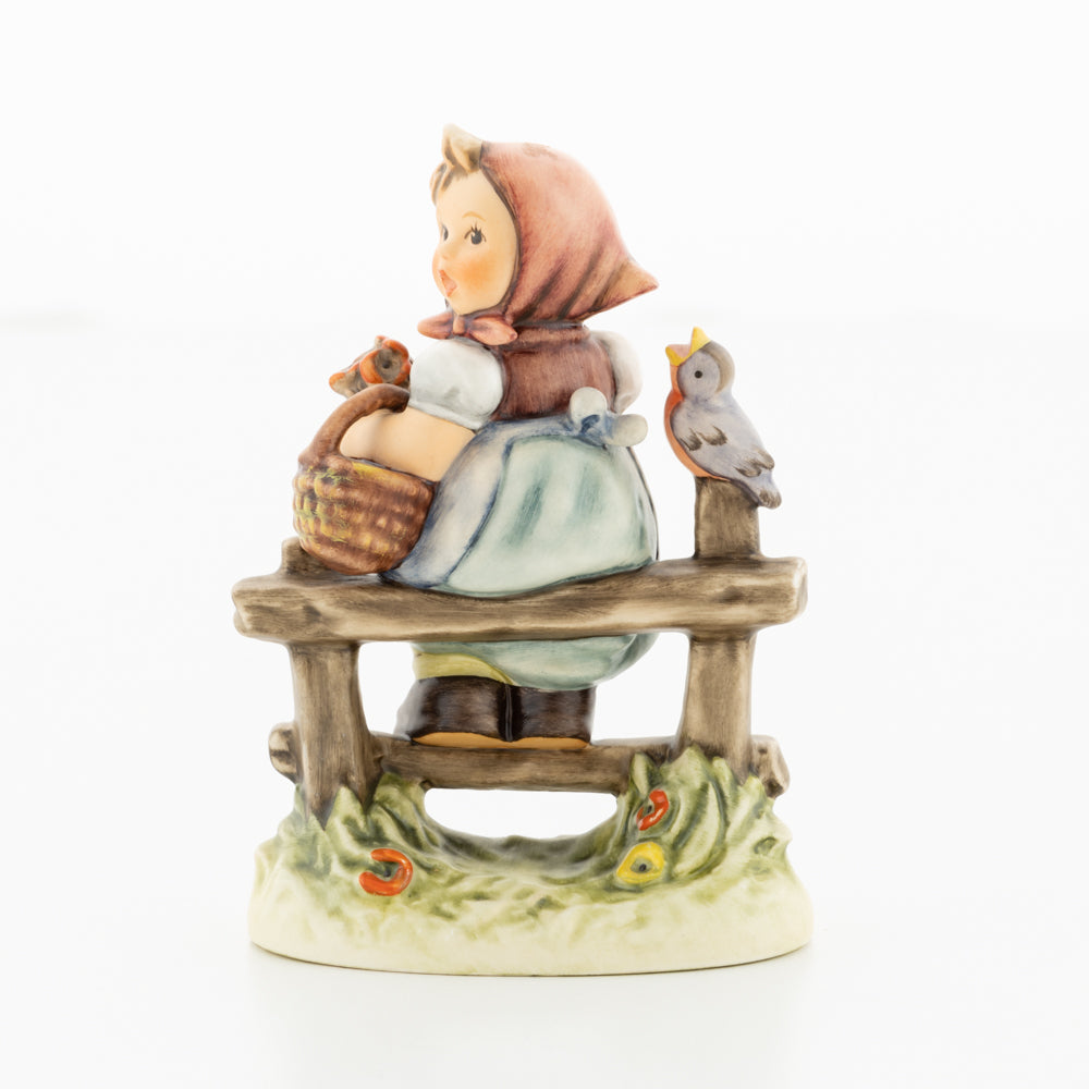 Eine kleine Rast am Wegrand wird doch wohl noch erlaubt sein? Das kleine Hummel-Mädchen hat unterwegs Blumen gepflückt. Ob für den Vater, die Mutter oder die Großeltern. Wer weiß? Ein Vögelchen setzt sich zu dem Mädchen aus dem Hause Hummel und bringt ihm ein Ständchen. Die original M.I. Hummel-Figur wurde 1980 von Meistermodelleur Gerhard Skrobek geschaffen und bezaubert ihren Betrachter durch kindlichen Charme. 1997 wurde ein weiteres Modell dieser original Hummel-Figur von Modelleur Helmut Fischer gestaltet.
