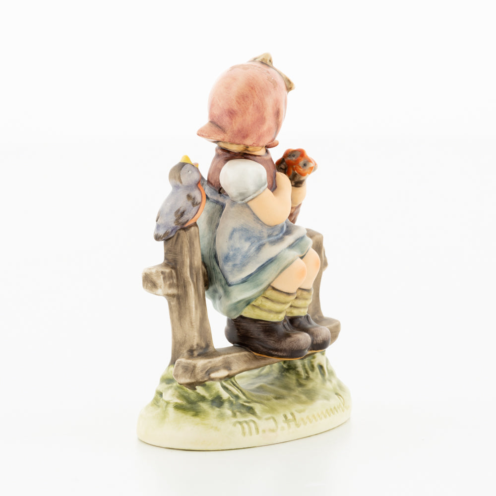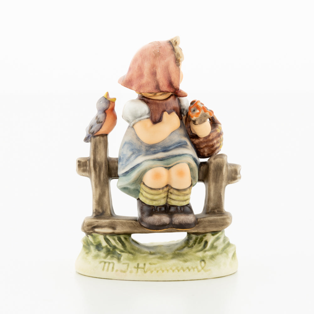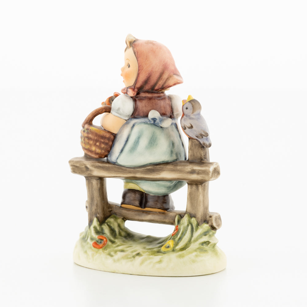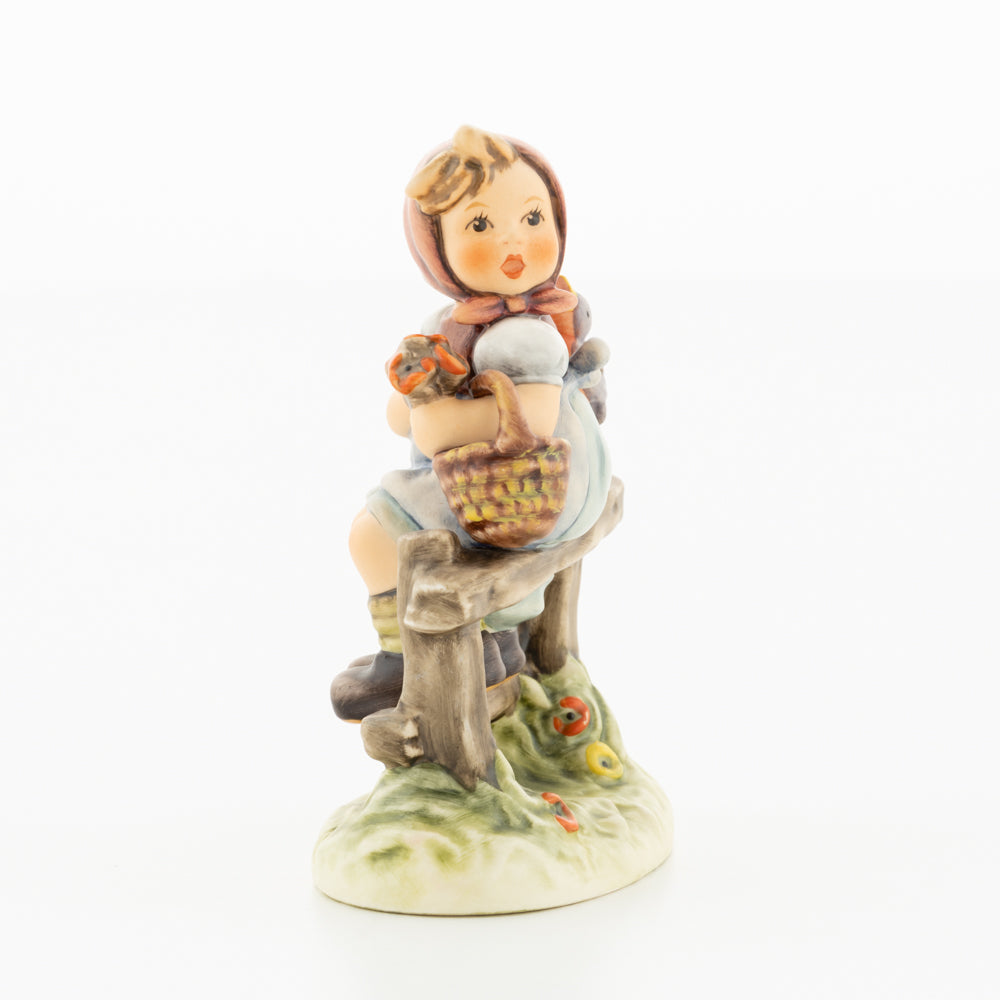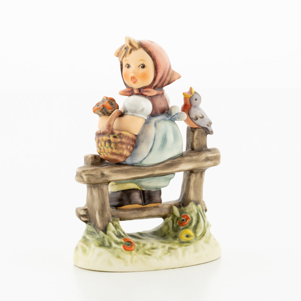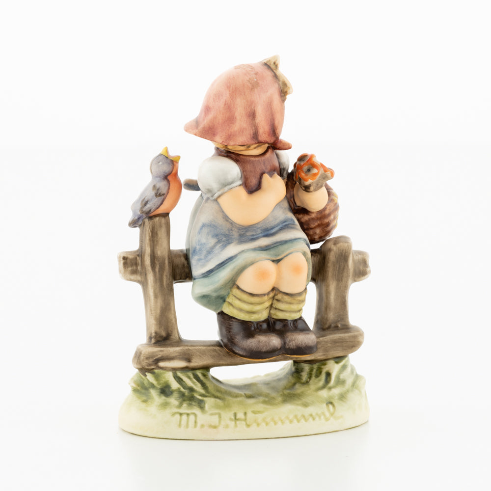 Eine kleine Rast am Wegrand wird doch wohl noch erlaubt sein? Das kleine Hummel-Mädchen hat unterwegs Blumen gepflückt. Ob für den Vater, die Mutter oder die Großeltern. Wer weiß? Ein Vögelchen setzt sich zu dem Mädchen aus dem Hause Hummel und bringt ihm ein Ständchen. Die original M.I. Hummel-Figur wurde 1980 von Meistermodelleur Gerhard Skrobek geschaffen und bezaubert ihren Betrachter durch kindlichen Charme. 1997 wurde ein weiteres Modell dieser original Hummel-Figur von Modelleur Helmut Fischer gestaltet.
