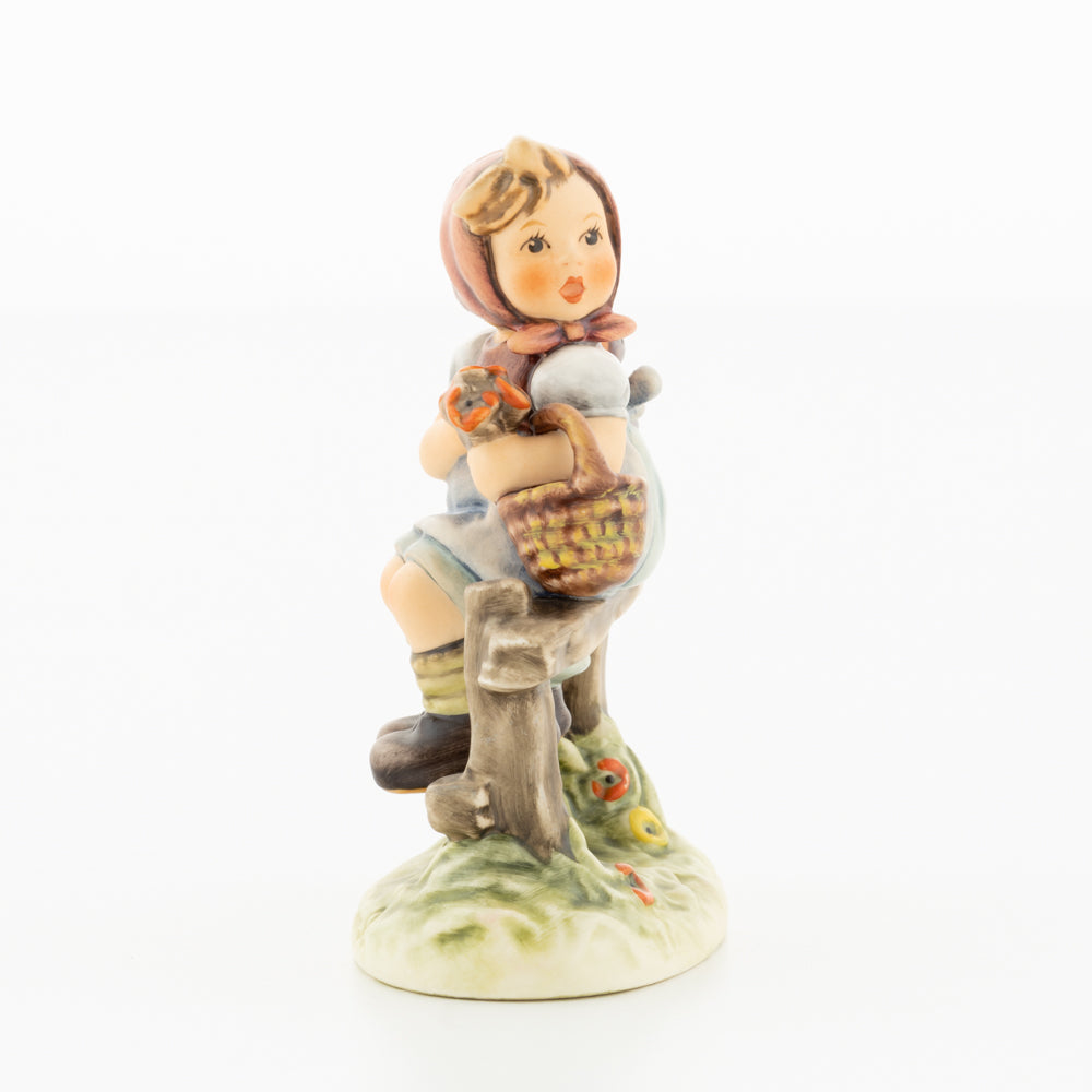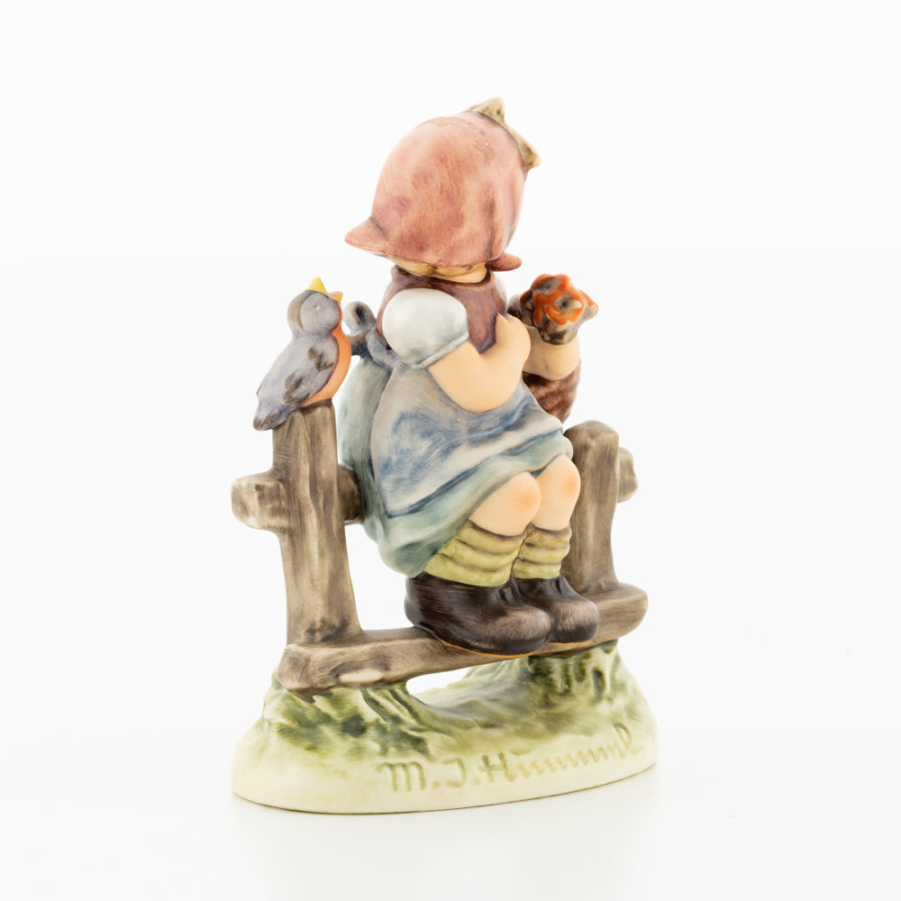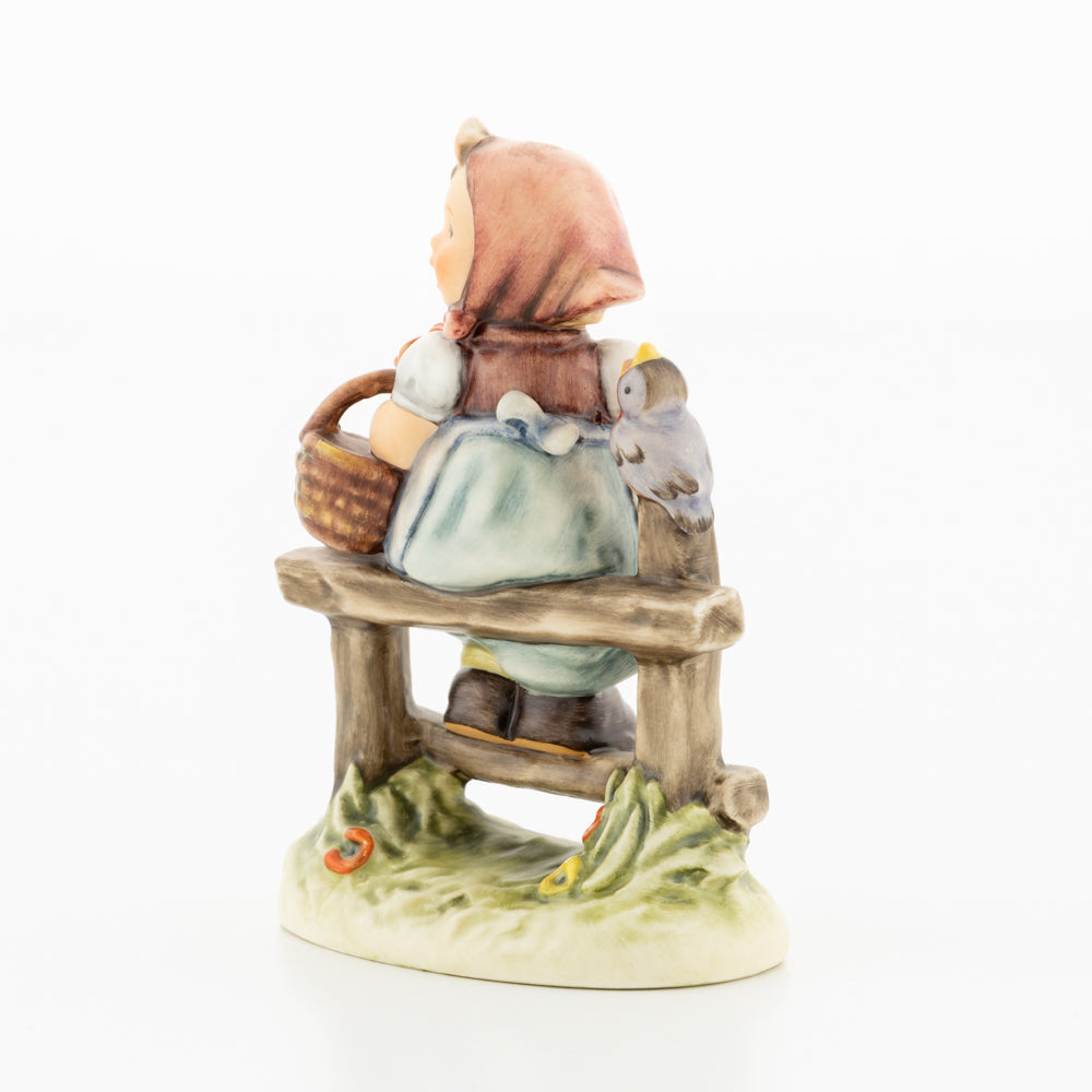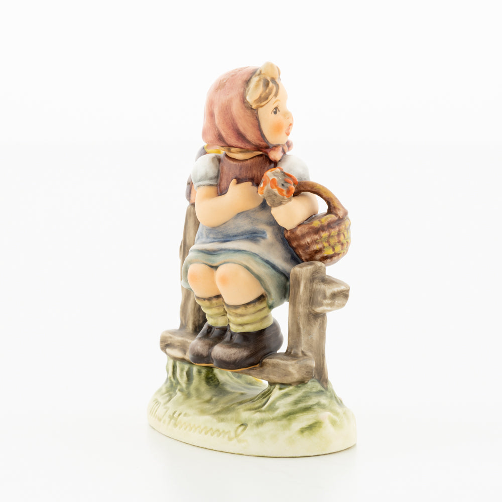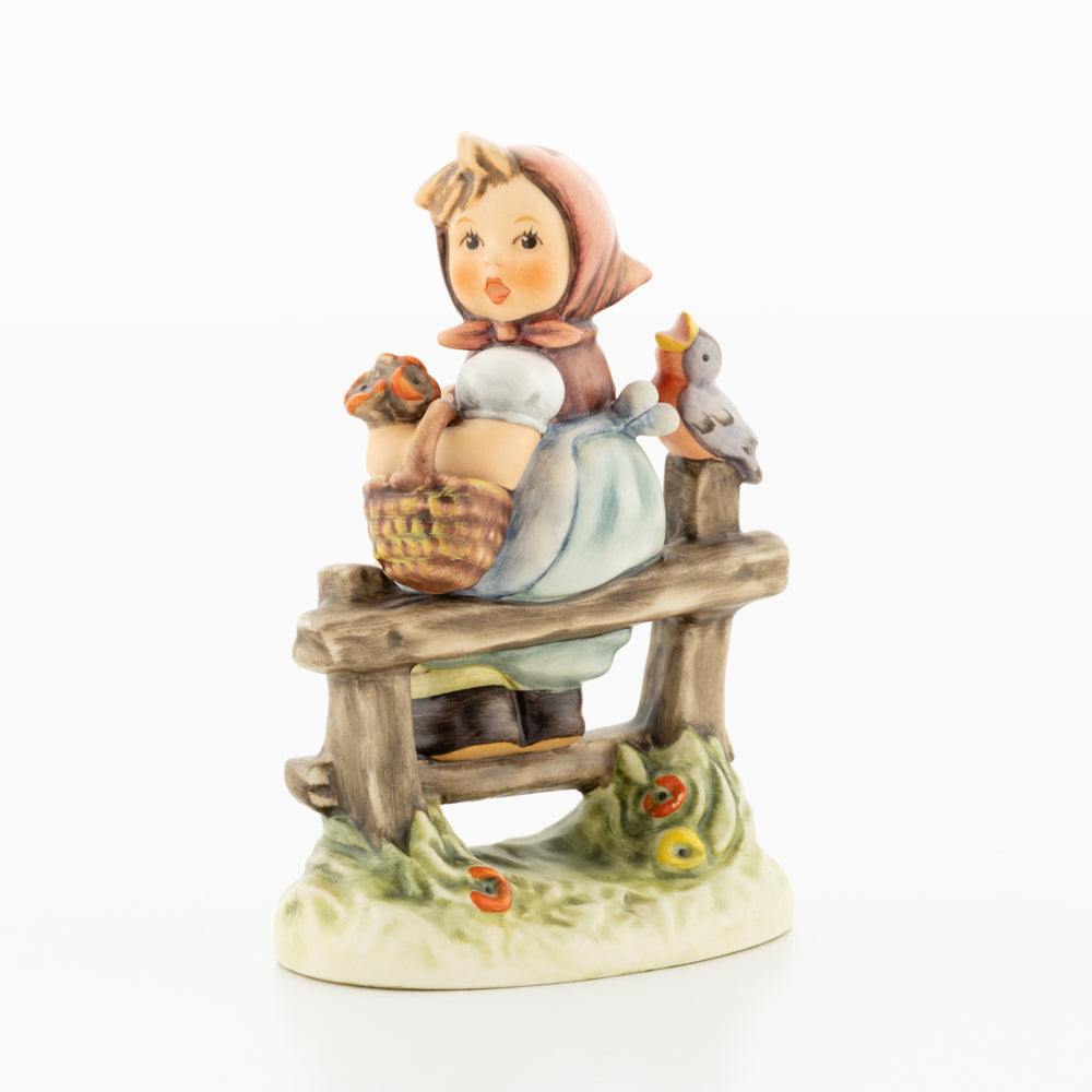 Eine kleine Rast am Wegrand wird doch wohl noch erlaubt sein? Das kleine Hummel-Mädchen hat unterwegs Blumen gepflückt. Ob für den Vater, die Mutter oder die Großeltern. Wer weiß? Ein Vögelchen setzt sich zu dem Mädchen aus dem Hause Hummel und bringt ihm ein Ständchen. Die original M.I. Hummel-Figur wurde 1980 von Meistermodelleur Gerhard Skrobek geschaffen und bezaubert ihren Betrachter durch kindlichen Charme. 1997 wurde ein weiteres Modell dieser original Hummel-Figur von Modelleur Helmut Fischer gestaltet.