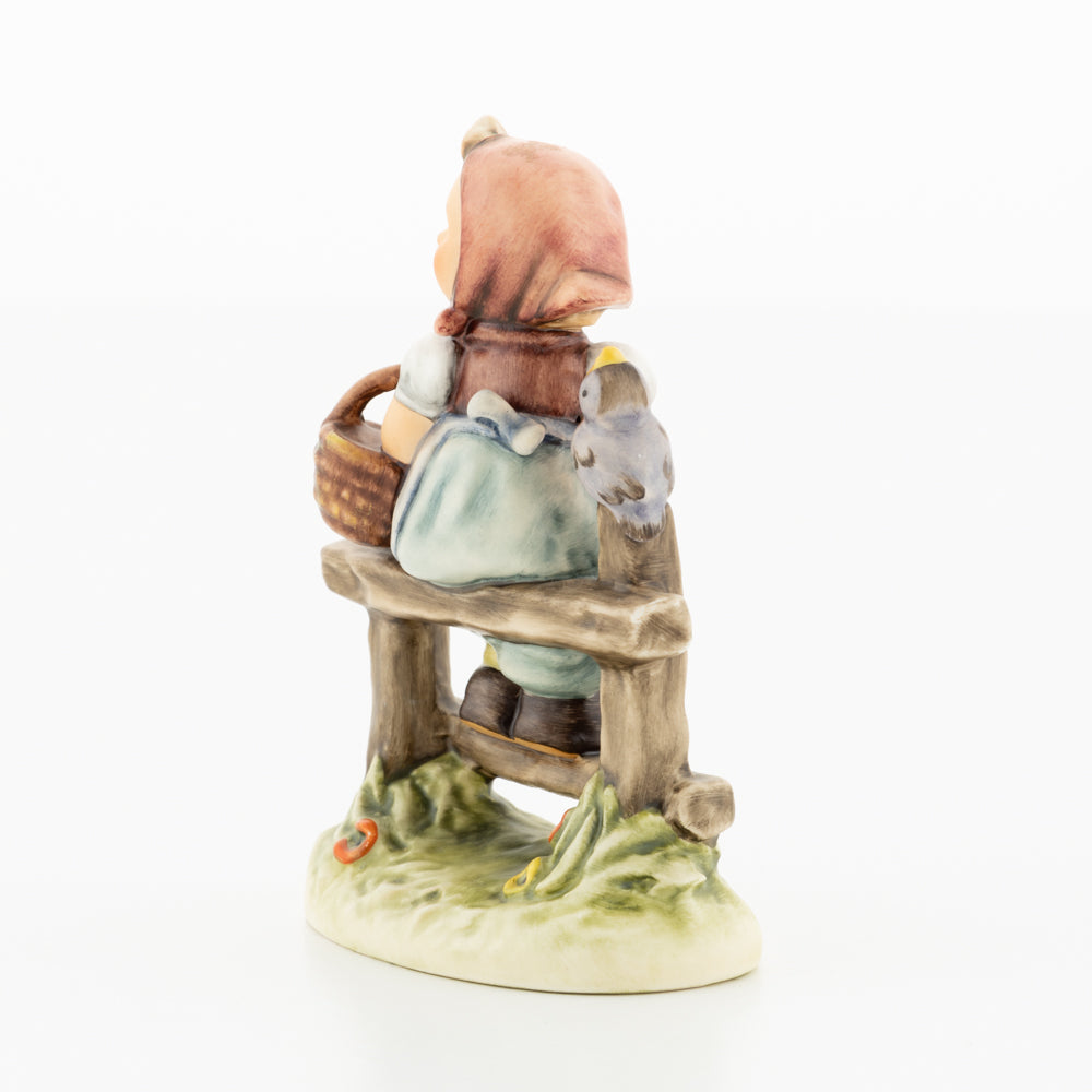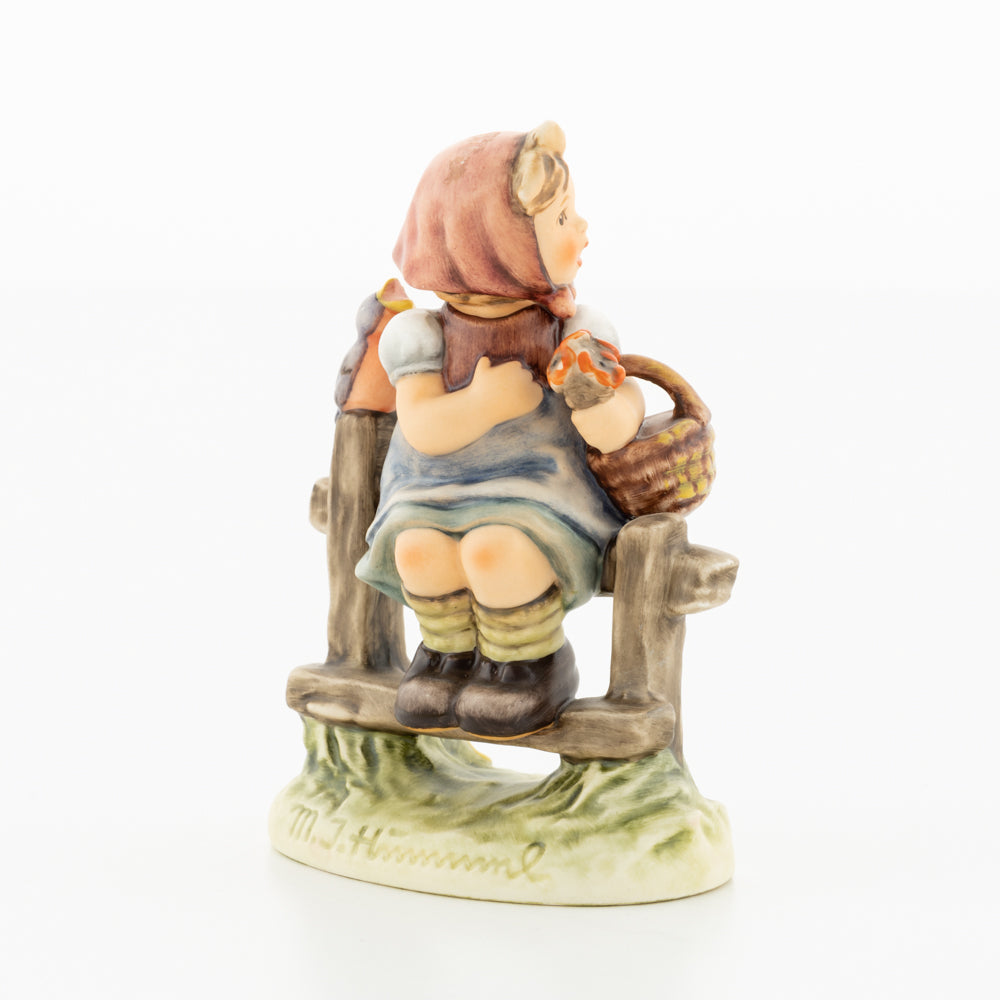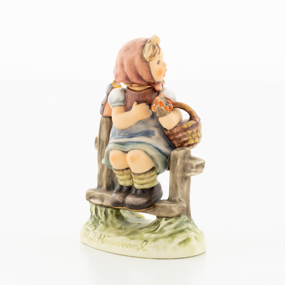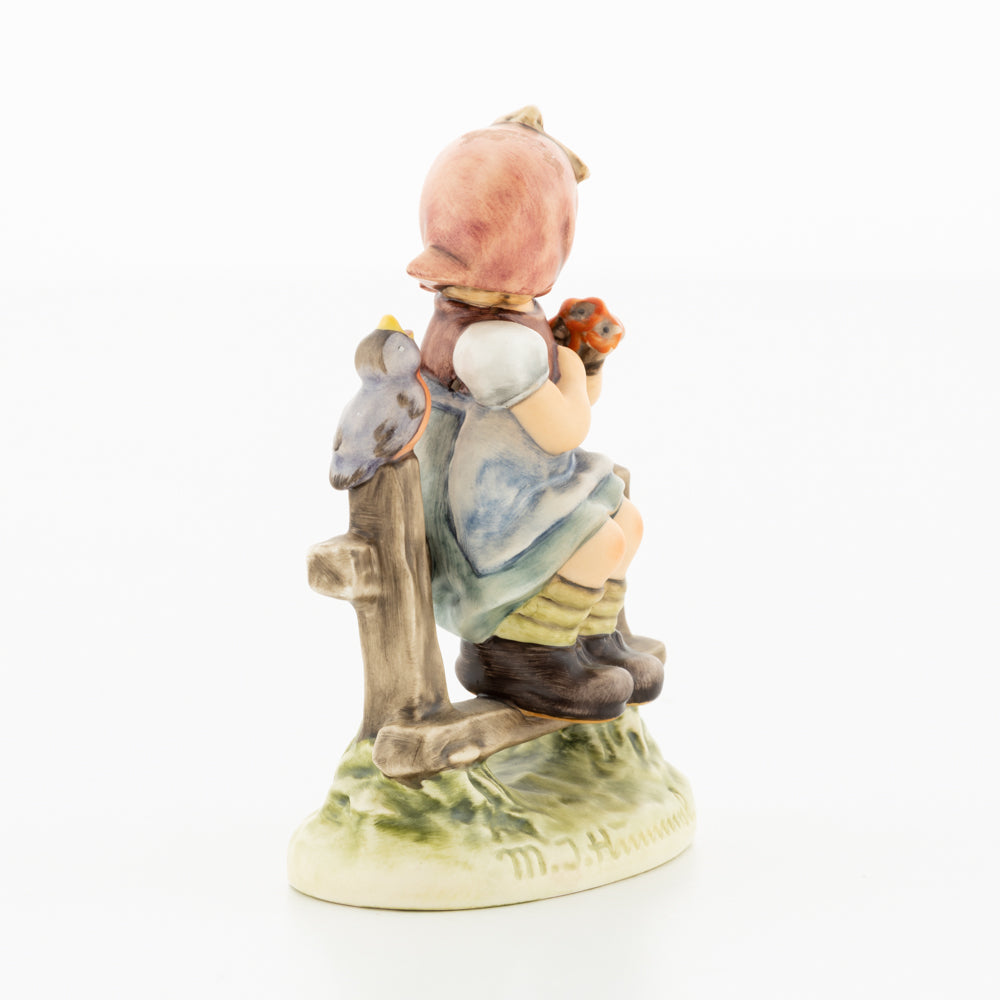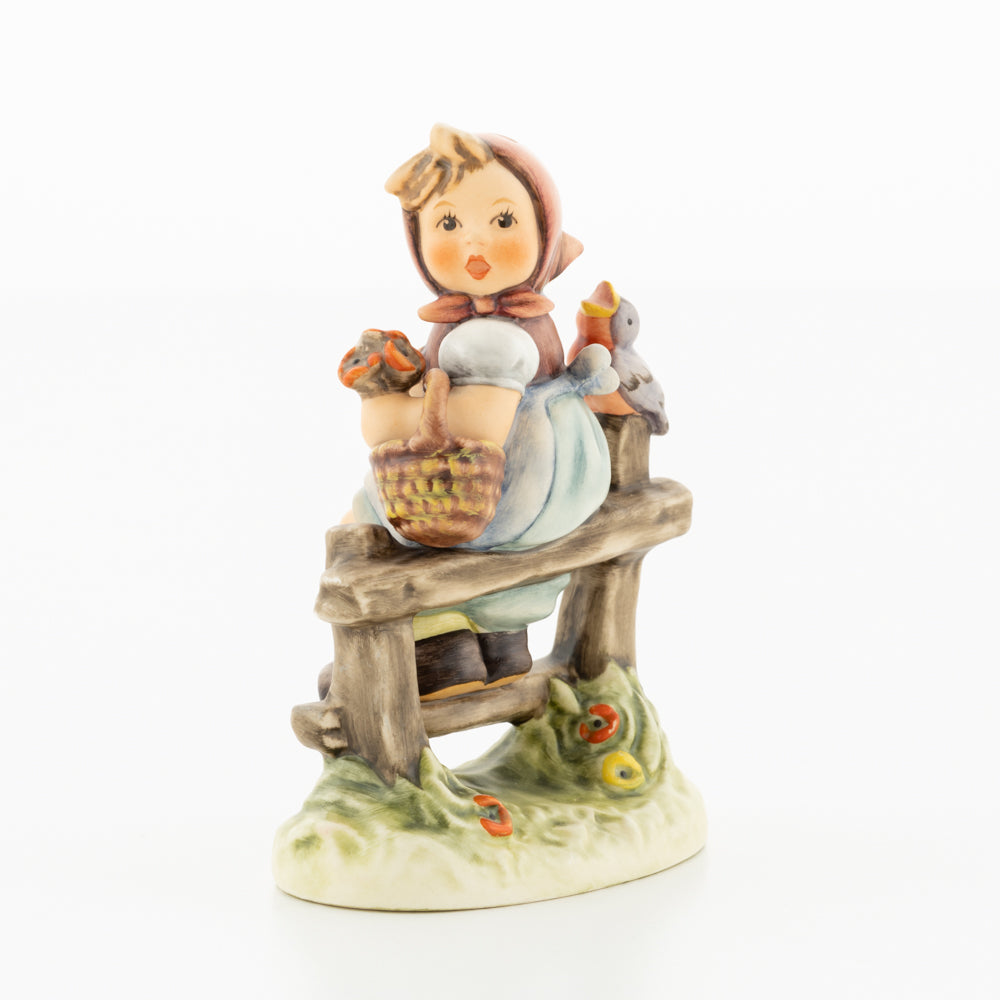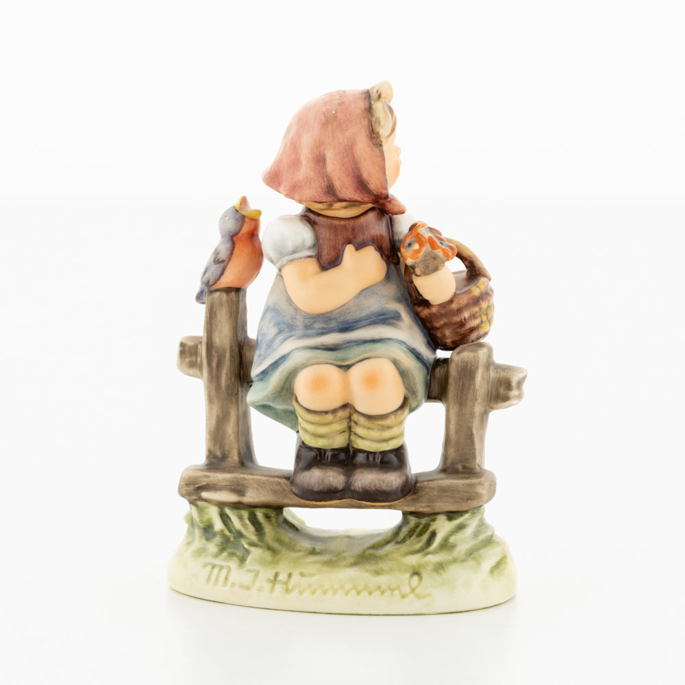 Eine kleine Rast am Wegrand wird doch wohl noch erlaubt sein? Das kleine Hummel-Mädchen hat unterwegs Blumen gepflückt. Ob für den Vater, die Mutter oder die Großeltern. Wer weiß? Ein Vögelchen setzt sich zu dem Mädchen aus dem Hause Hummel und bringt ihm ein Ständchen. Die original M.I. Hummel-Figur wurde 1980 von Meistermodelleur Gerhard Skrobek geschaffen und bezaubert ihren Betrachter durch kindlichen Charme. 1997 wurde ein weiteres Modell dieser original Hummel-Figur von Modelleur Helmut Fischer gestaltet.