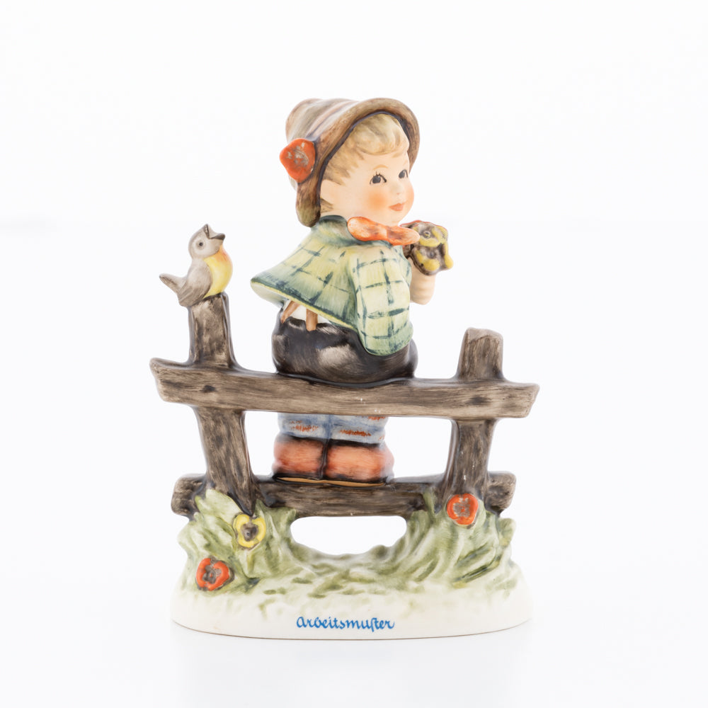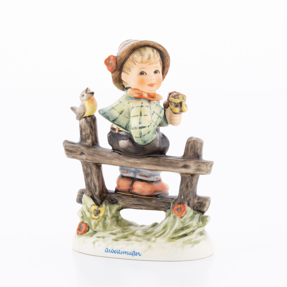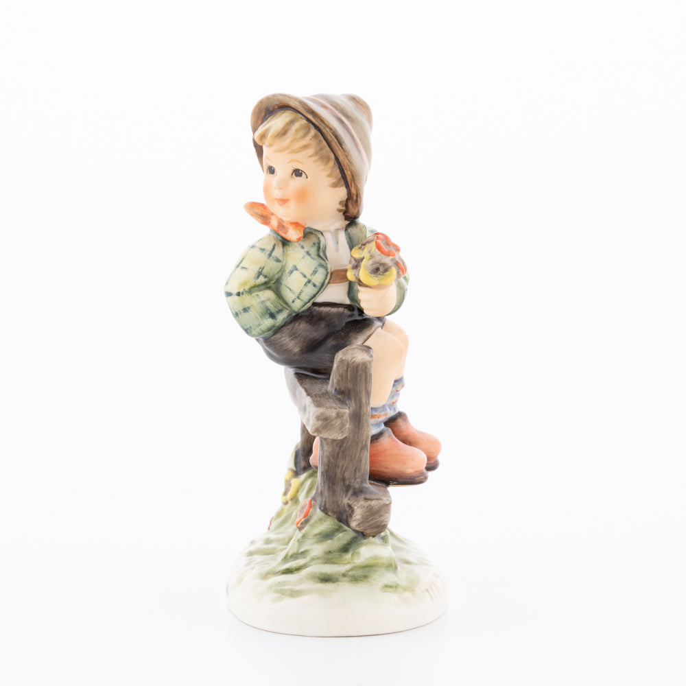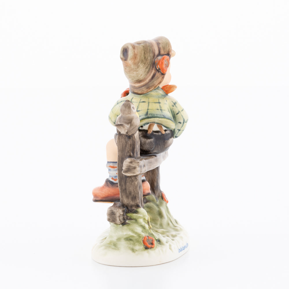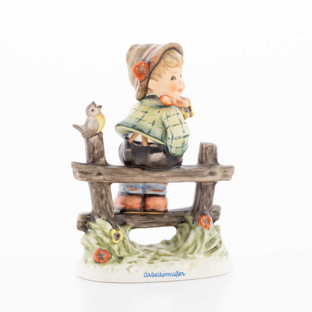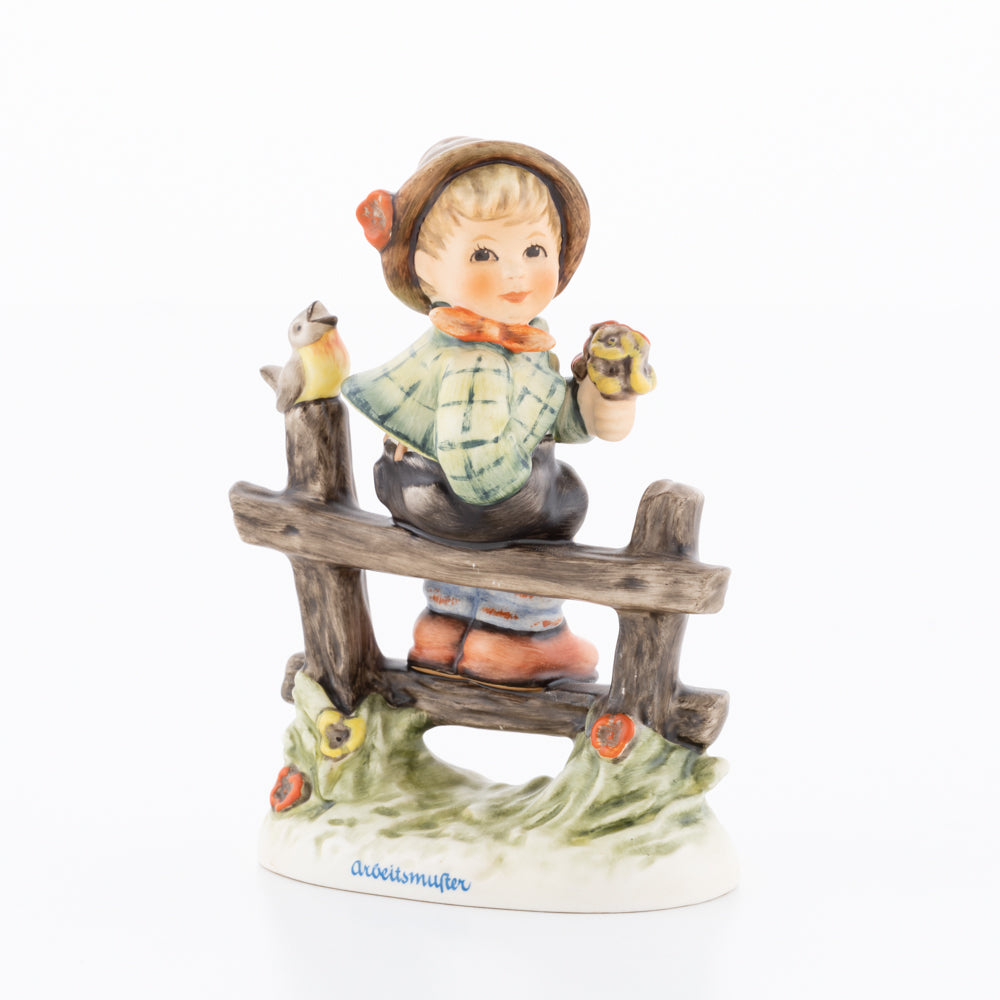 Suchend blickt sich der auf einem Zaun sitzende Junge nach einem Vögelchen um. Modelliert wurde die eine frühlingshafte Stimmung verbreitende Hummel-Figur von Gerhard Skrobek im Jahre 1980. Der kecke Bub mit Hütchen und Halstuch versetzt den Betrachter zurück in die Kindheit. Ob als Erinnerung an Kindheitstage oder als Geschenk zur Geburt, diese original Hummel-Figur ist ein wahres Meisterstück.