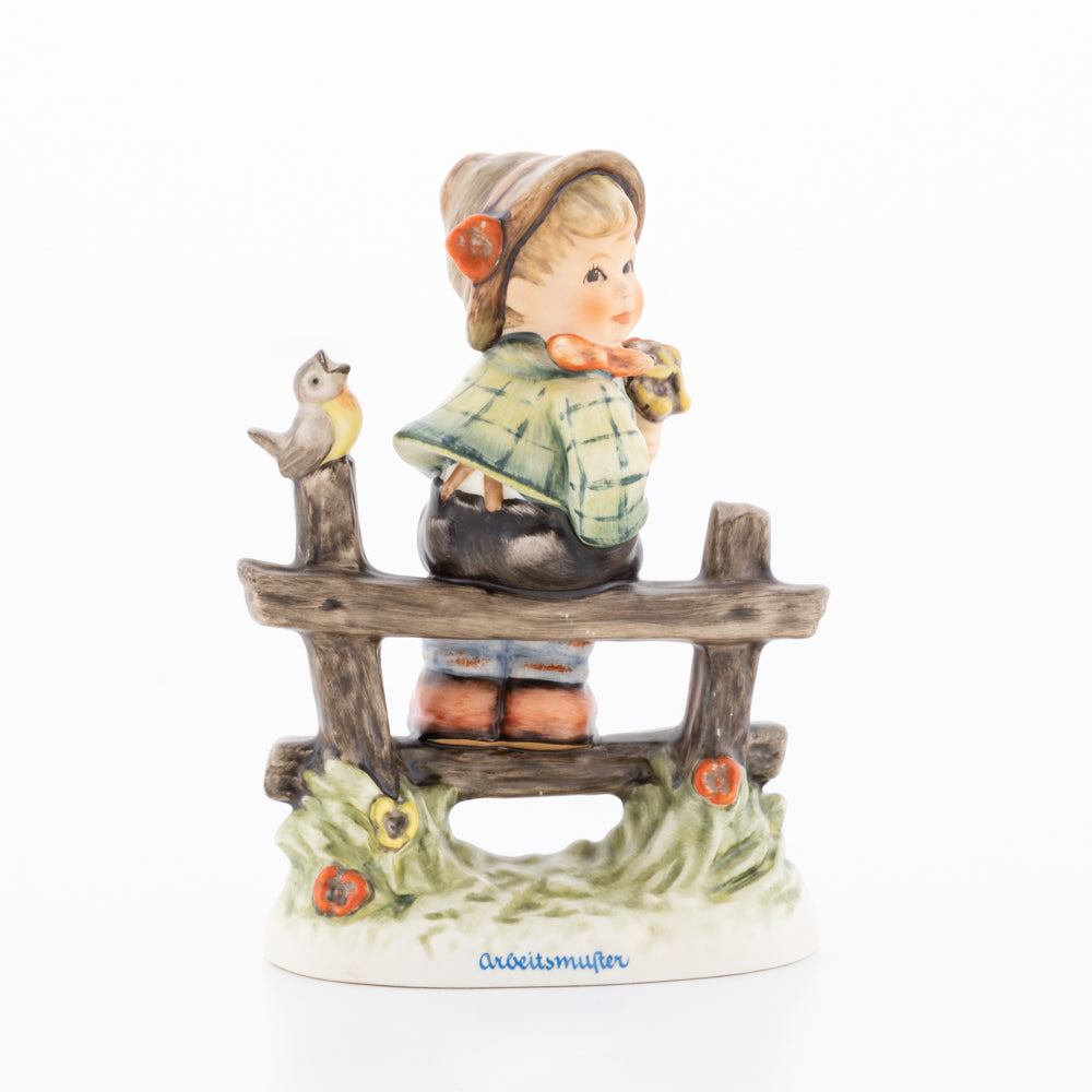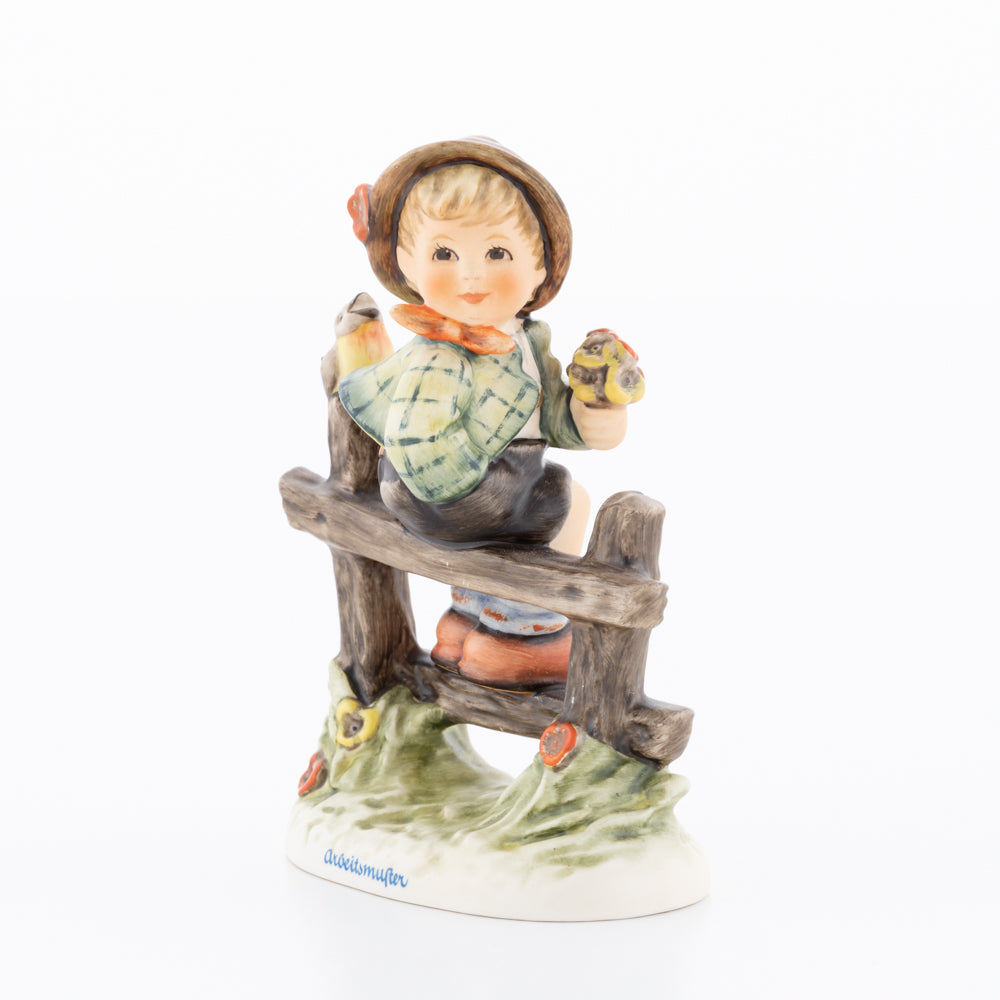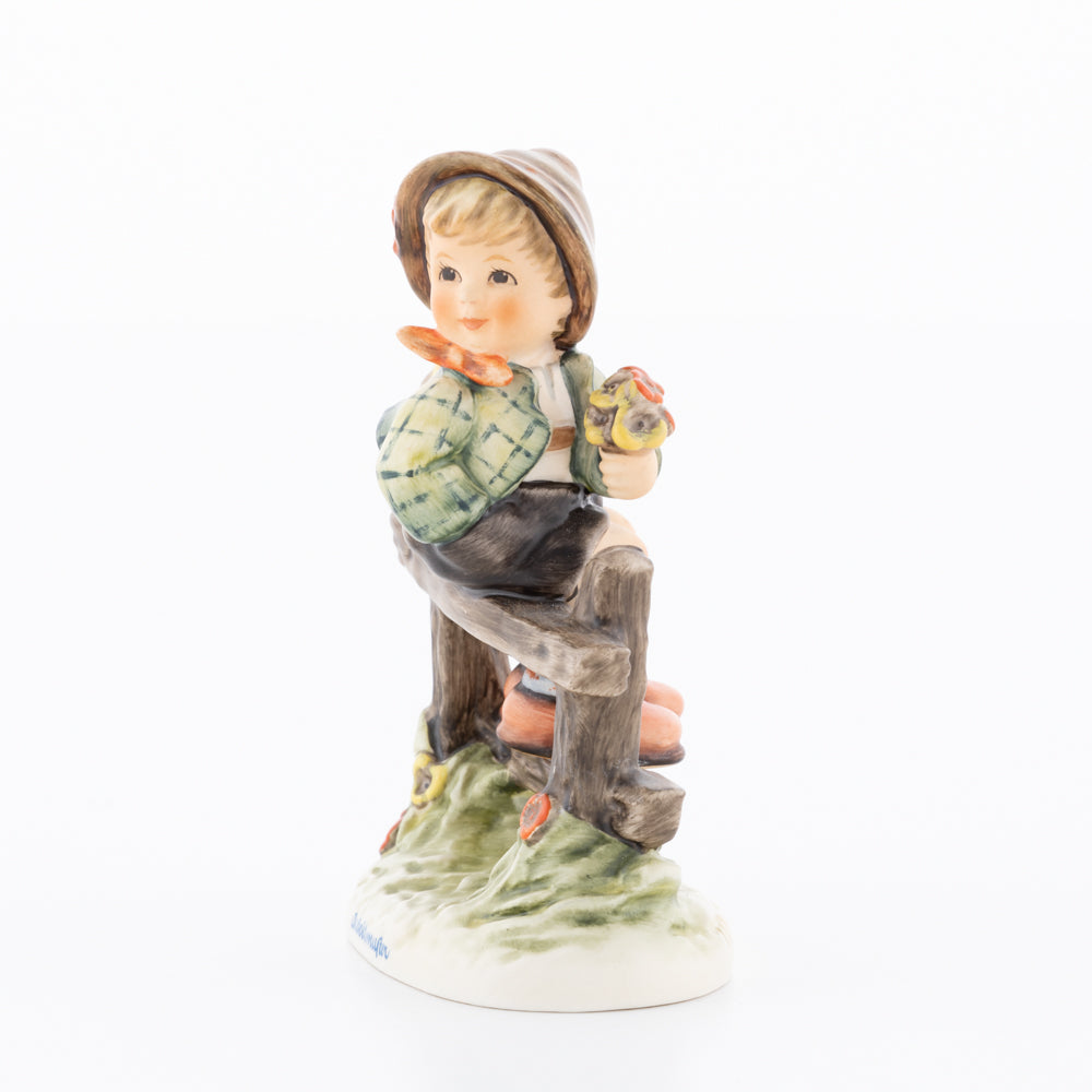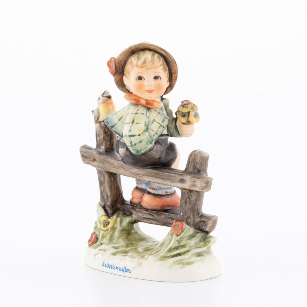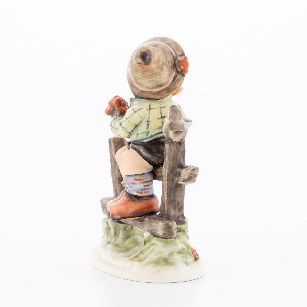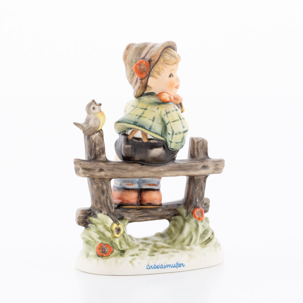 Suchend blickt sich der auf einem Zaun sitzende Junge nach einem Vögelchen um. Modelliert wurde die eine frühlingshafte Stimmung verbreitende Hummel-Figur von Gerhard Skrobek im Jahre 1980. Der kecke Bub mit Hütchen und Halstuch versetzt den Betrachter zurück in die Kindheit. Ob als Erinnerung an Kindheitstage oder als Geschenk zur Geburt, diese original Hummel-Figur ist ein wahres Meisterstück.