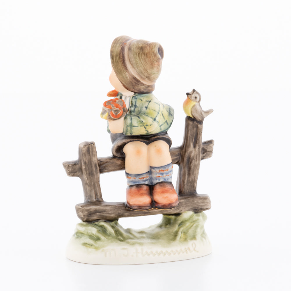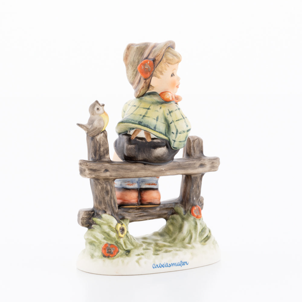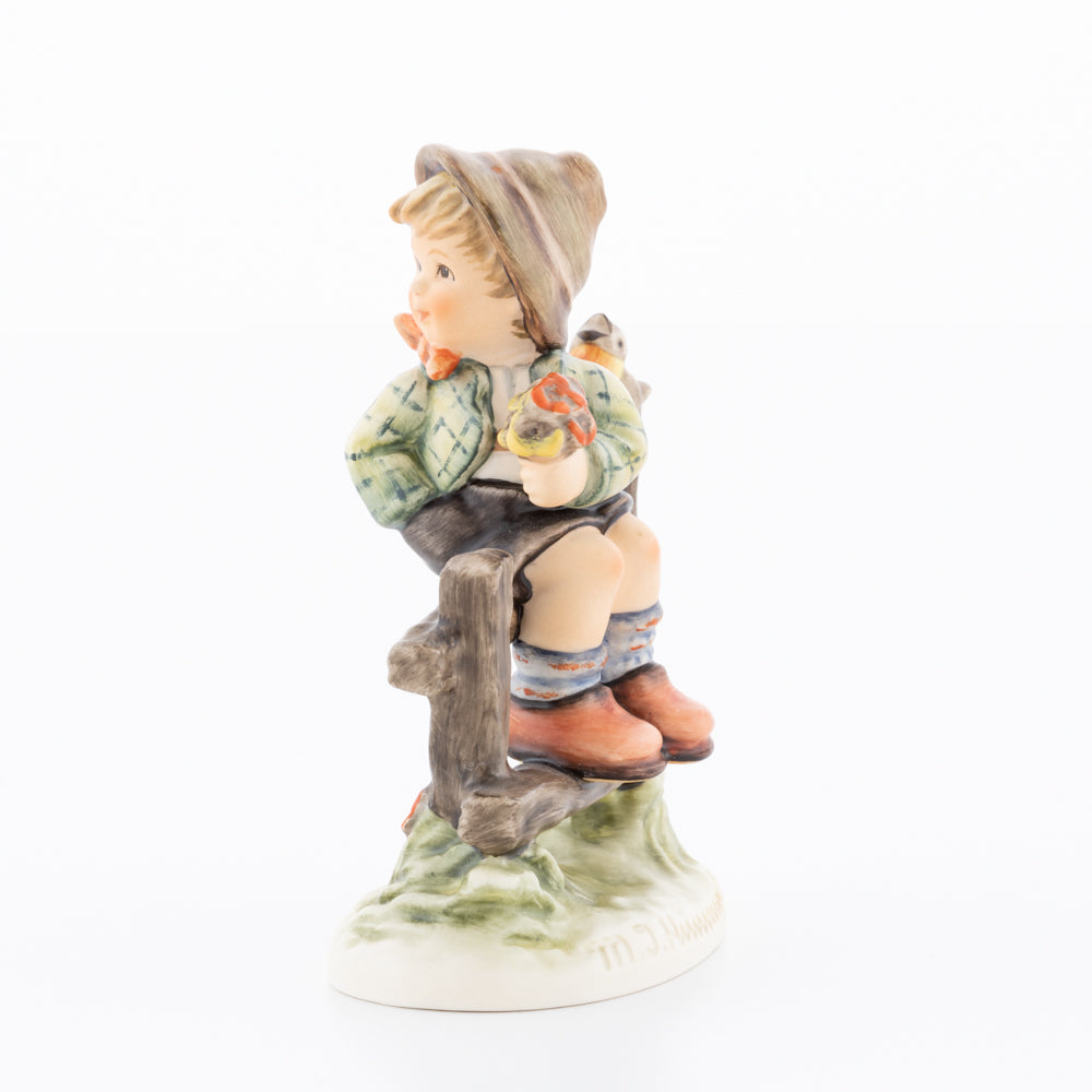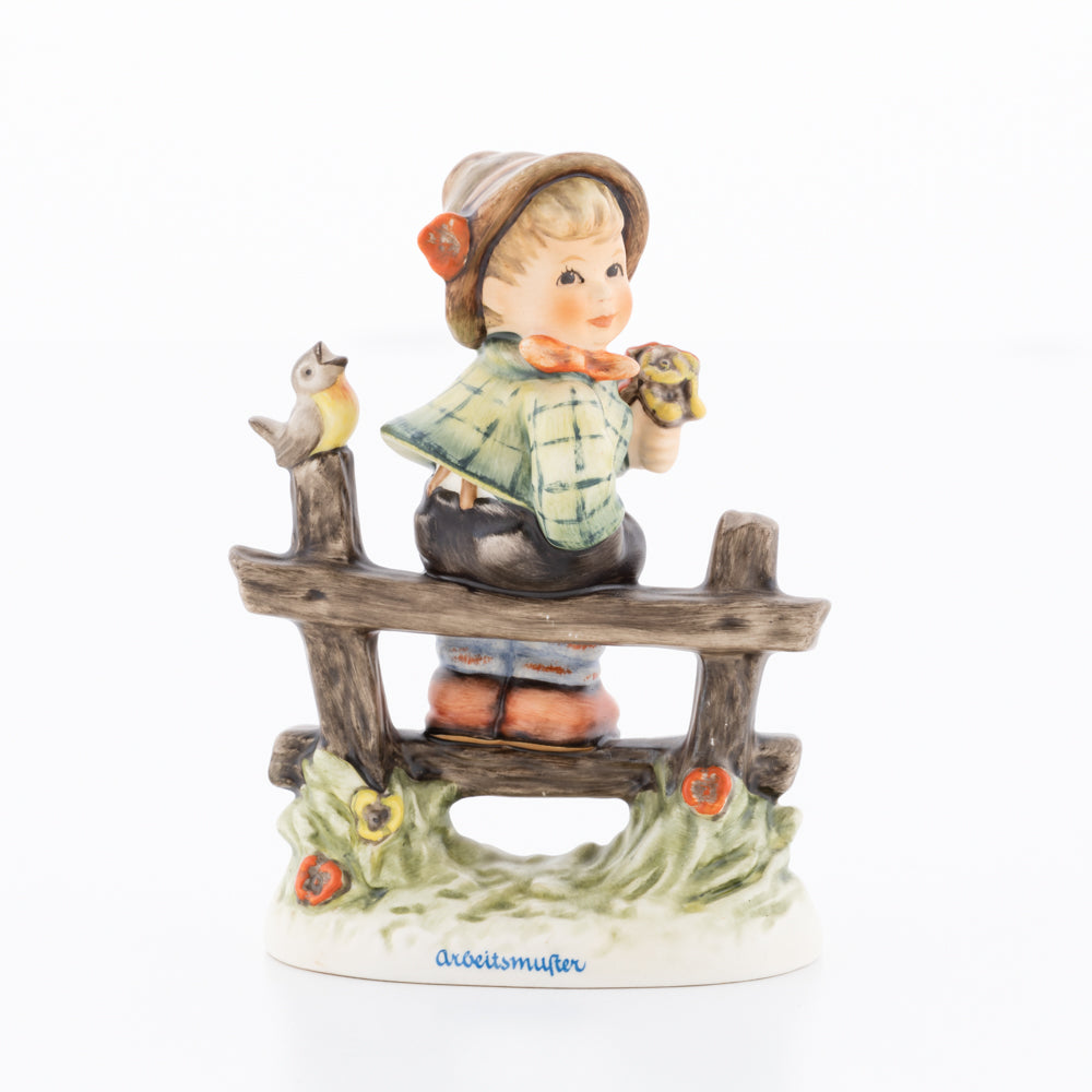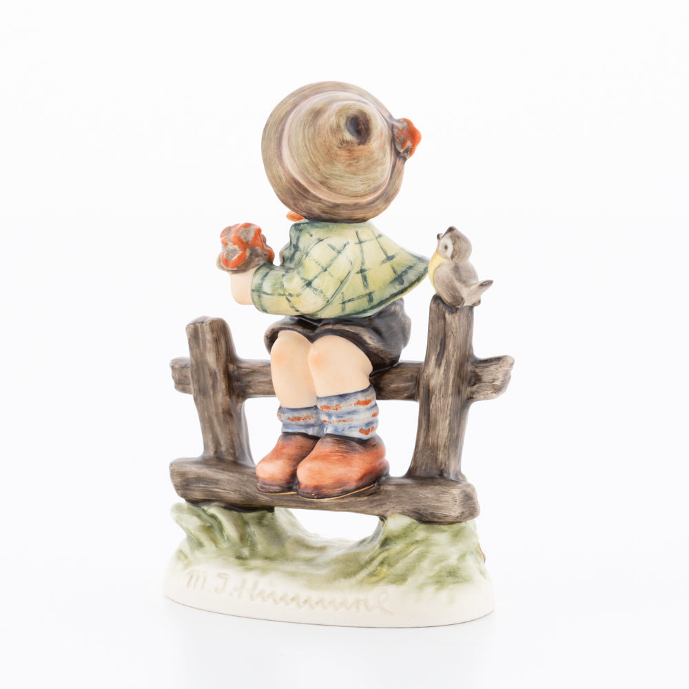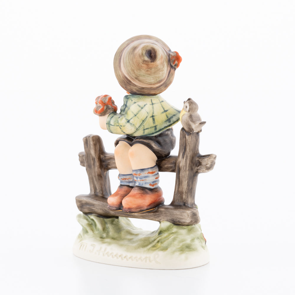 Suchend blickt sich der auf einem Zaun sitzende Junge nach einem Vögelchen um. Modelliert wurde die eine frühlingshafte Stimmung verbreitende Hummel-Figur von Gerhard Skrobek im Jahre 1980. Der kecke Bub mit Hütchen und Halstuch versetzt den Betrachter zurück in die Kindheit. Ob als Erinnerung an Kindheitstage oder als Geschenk zur Geburt, diese original Hummel-Figur ist ein wahres Meisterstück.