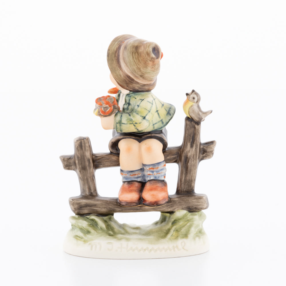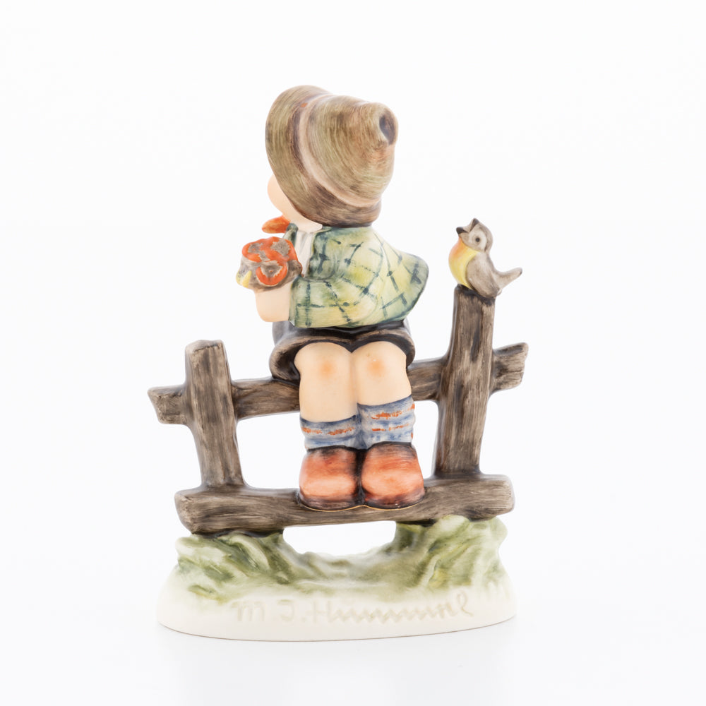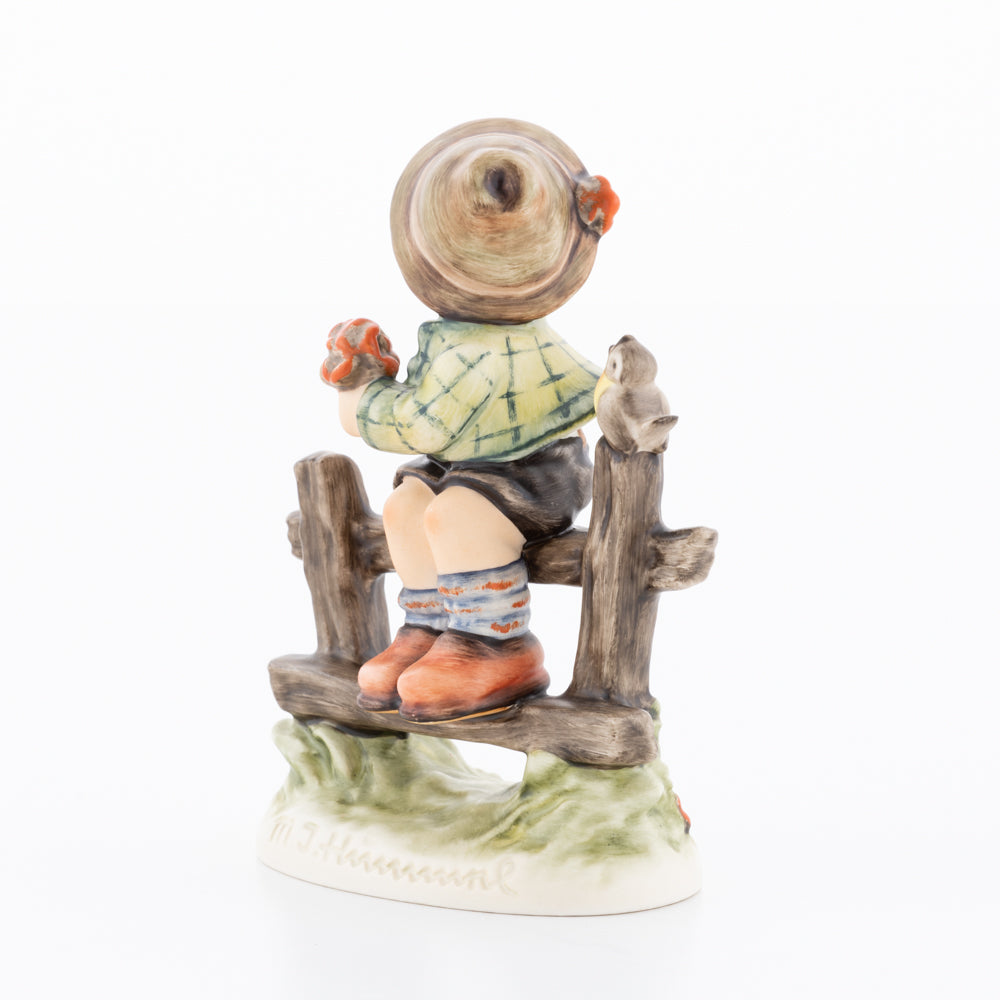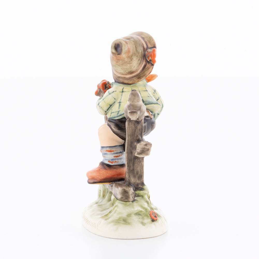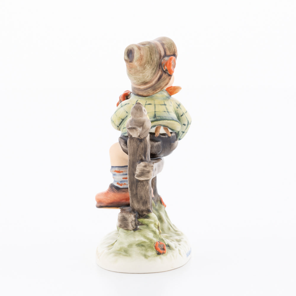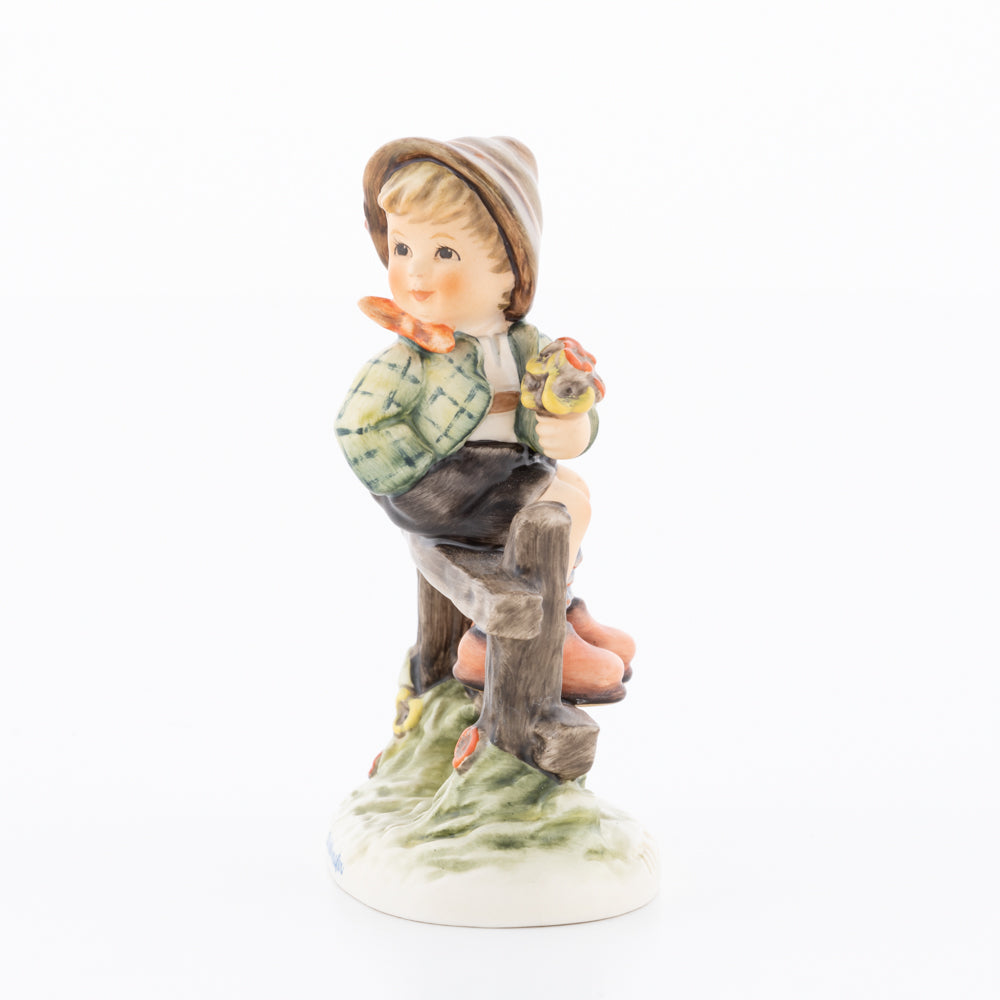 Suchend blickt sich der auf einem Zaun sitzende Junge nach einem Vögelchen um. Modelliert wurde die eine frühlingshafte Stimmung verbreitende Hummel-Figur von Gerhard Skrobek im Jahre 1980. Der kecke Bub mit Hütchen und Halstuch versetzt den Betrachter zurück in die Kindheit. Ob als Erinnerung an Kindheitstage oder als Geschenk zur Geburt, diese original Hummel-Figur ist ein wahres Meisterstück.