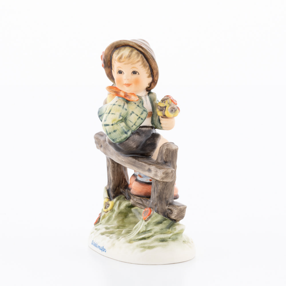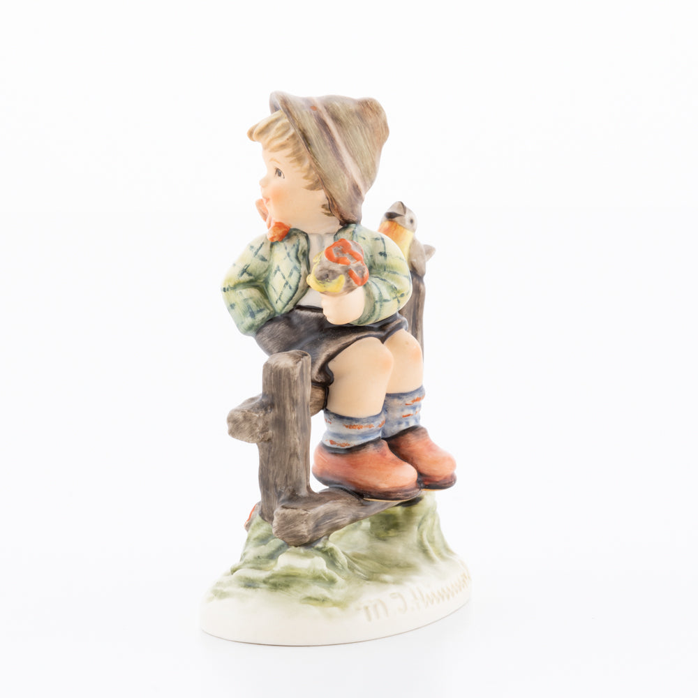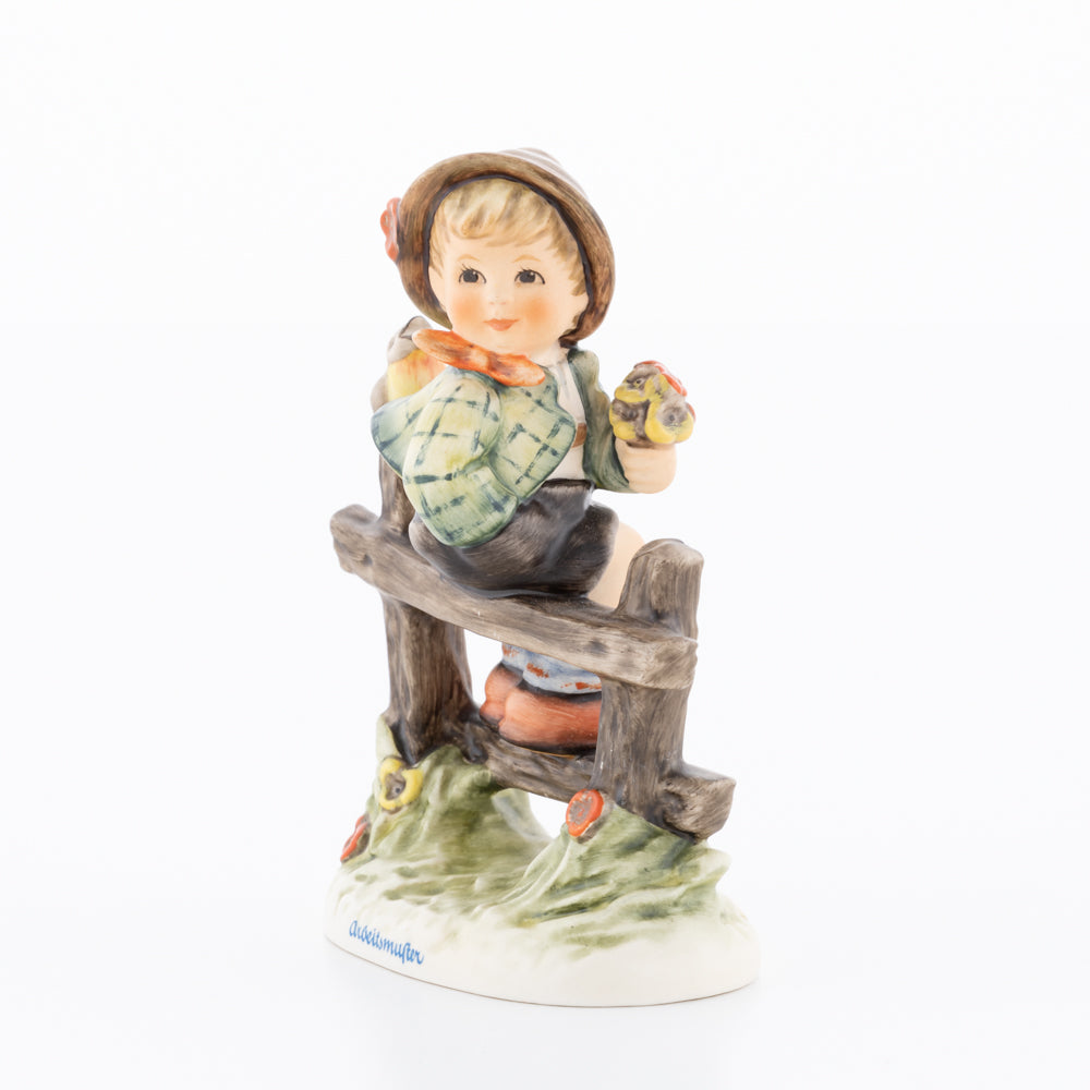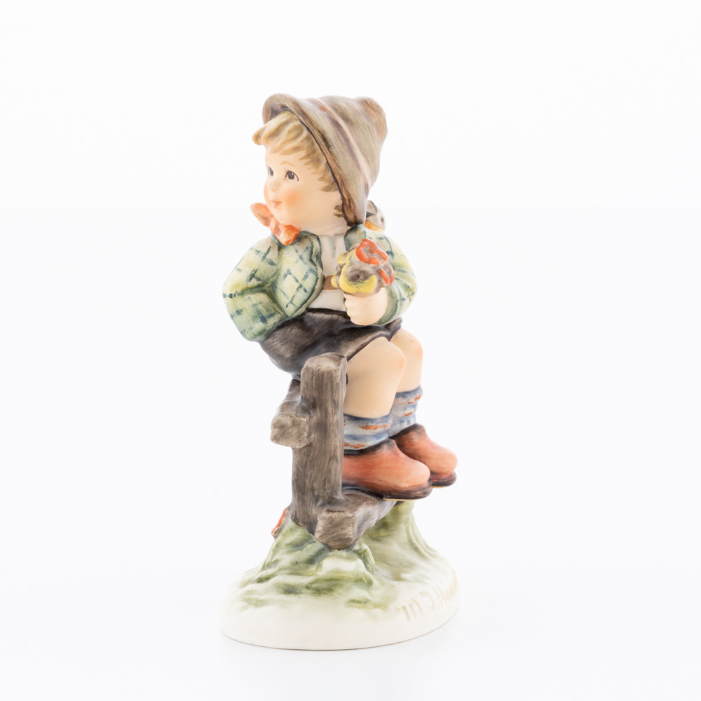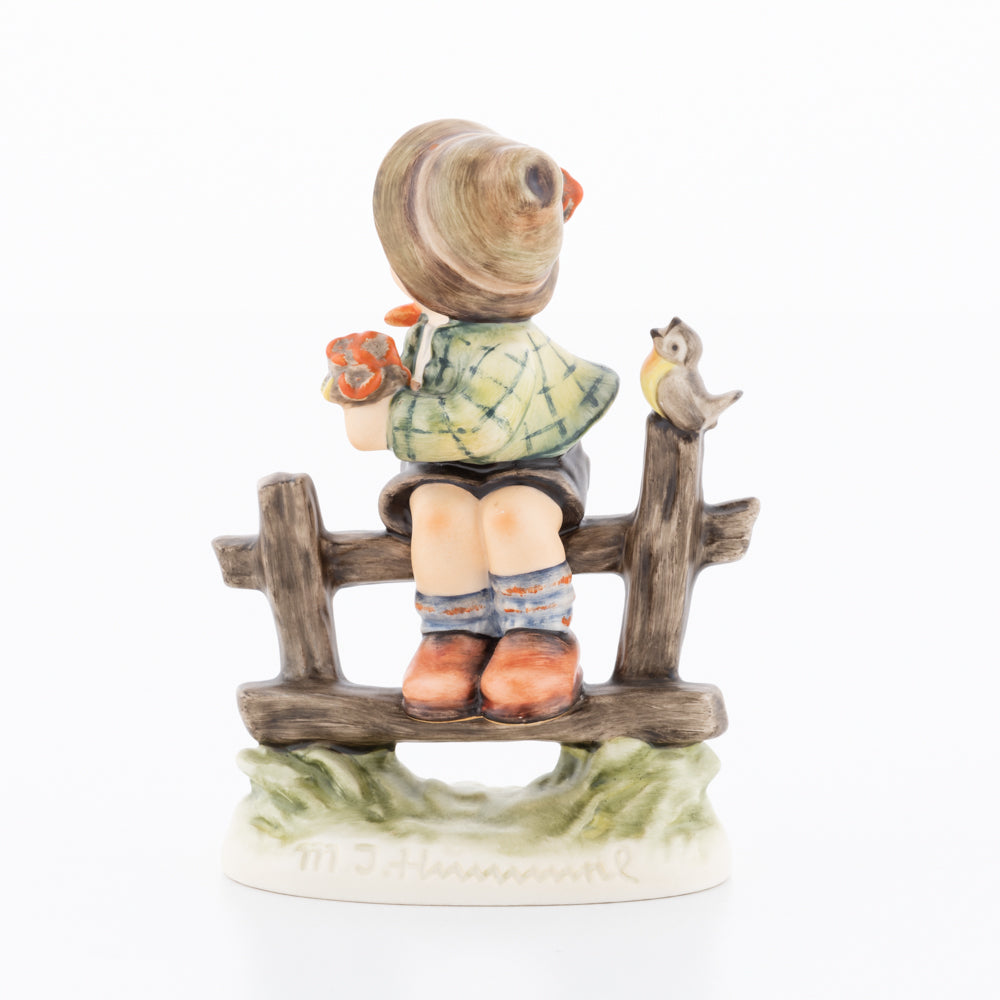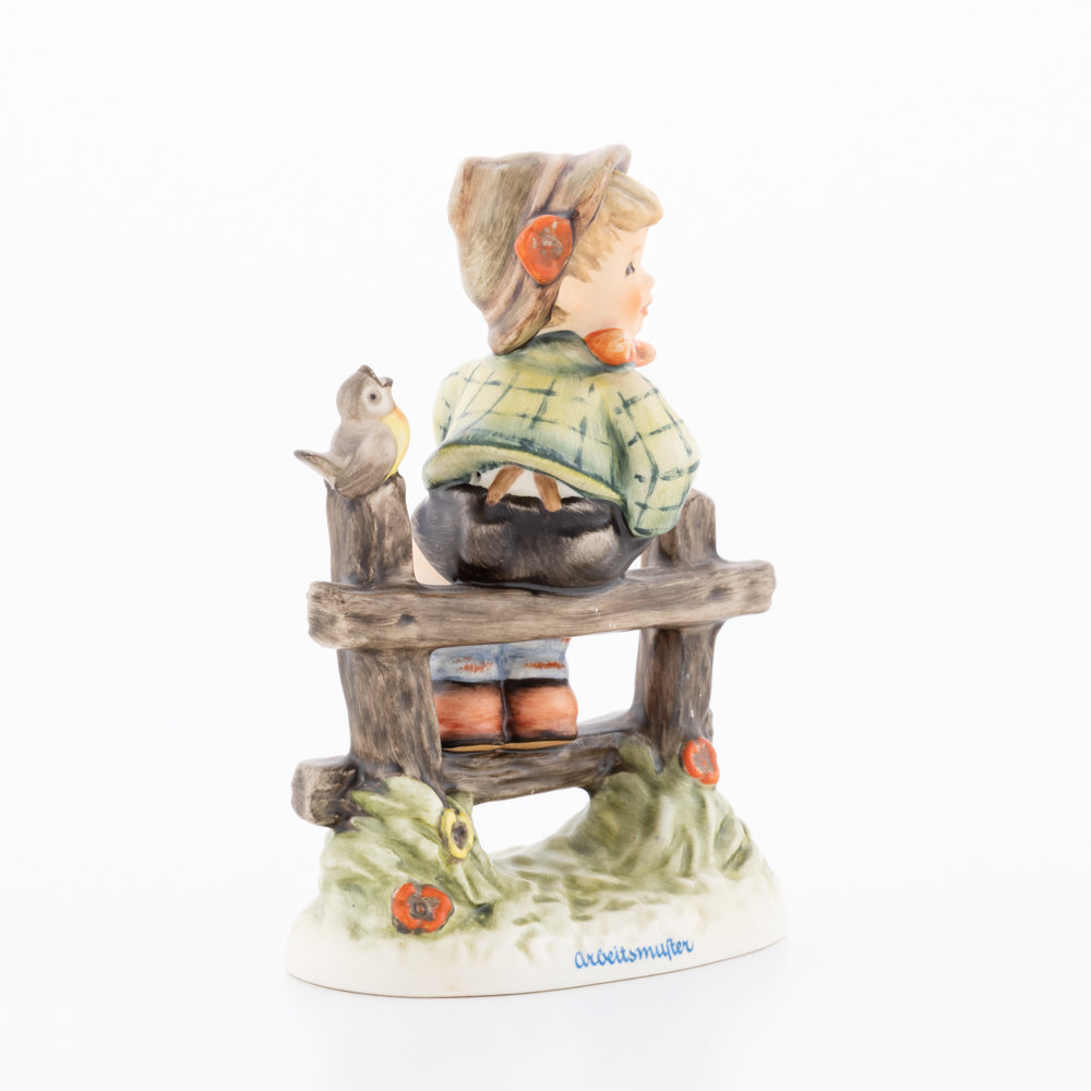 Suchend blickt sich der auf einem Zaun sitzende Junge nach einem Vögelchen um. Modelliert wurde die eine frühlingshafte Stimmung verbreitende Hummel-Figur von Gerhard Skrobek im Jahre 1980. Der kecke Bub mit Hütchen und Halstuch versetzt den Betrachter zurück in die Kindheit. Ob als Erinnerung an Kindheitstage oder als Geschenk zur Geburt, diese original Hummel-Figur ist ein wahres Meisterstück.