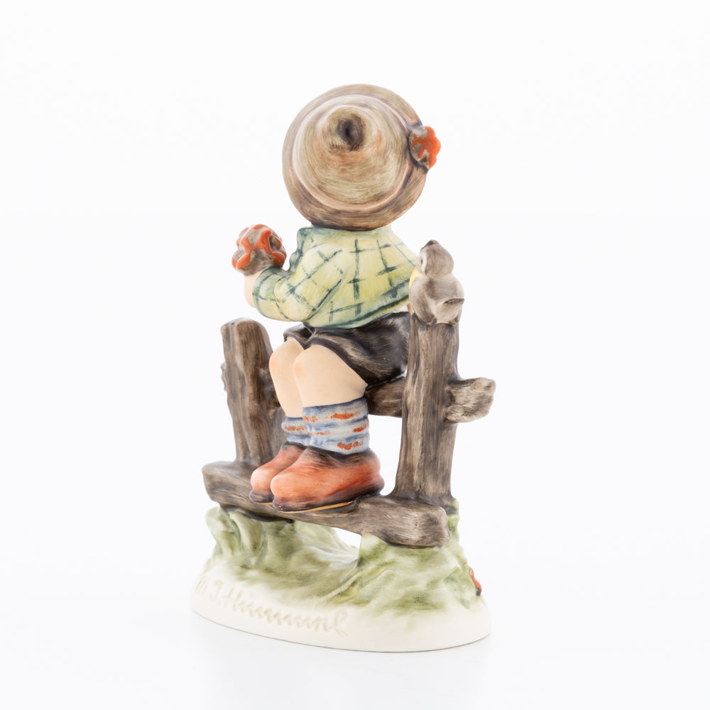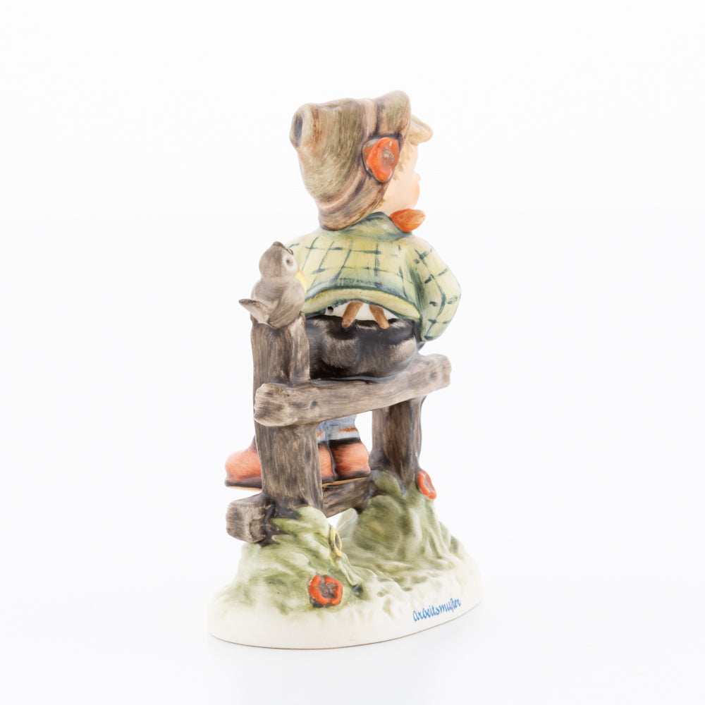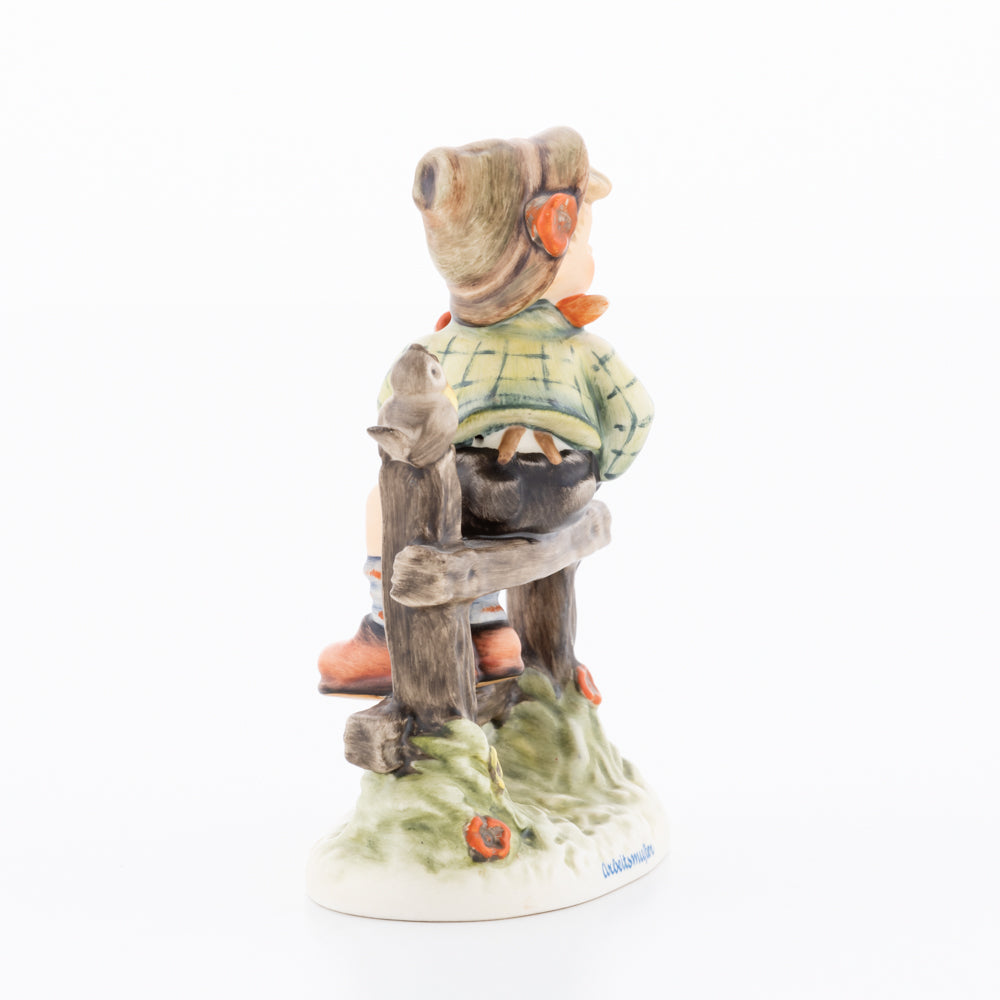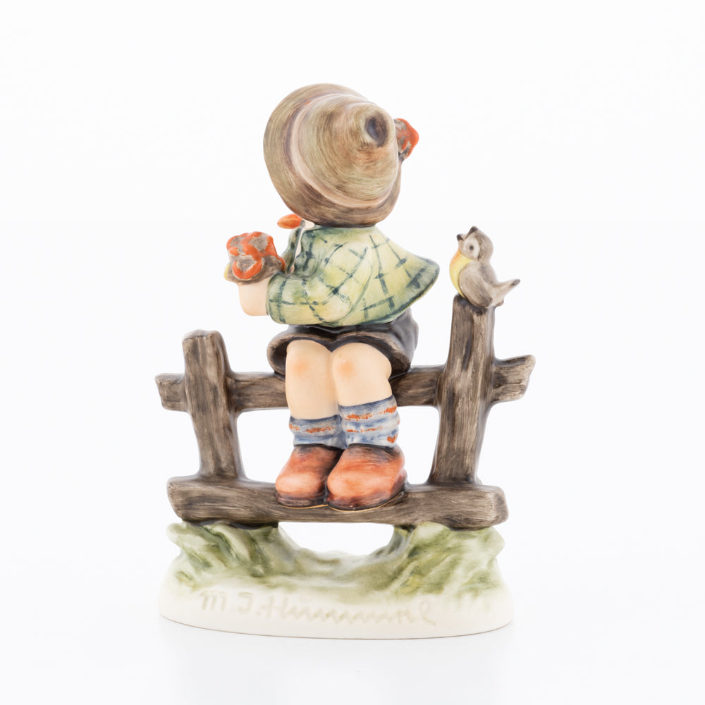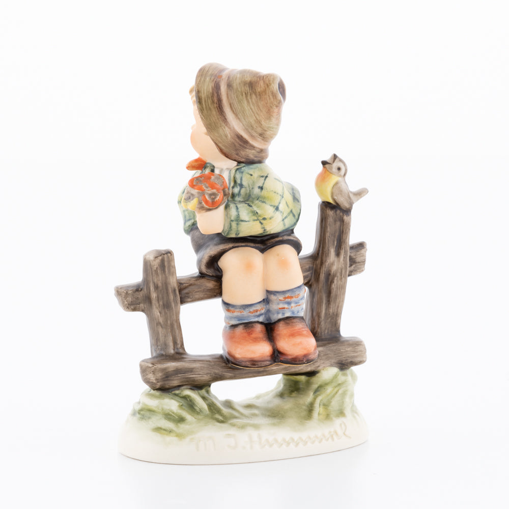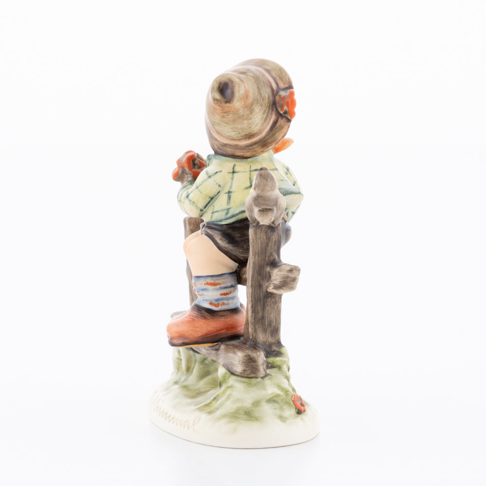 Suchend blickt sich der auf einem Zaun sitzende Junge nach einem Vögelchen um. Modelliert wurde die eine frühlingshafte Stimmung verbreitende Hummel-Figur von Gerhard Skrobek im Jahre 1980. Der kecke Bub mit Hütchen und Halstuch versetzt den Betrachter zurück in die Kindheit. Ob als Erinnerung an Kindheitstage oder als Geschenk zur Geburt, diese original Hummel-Figur ist ein wahres Meisterstück.