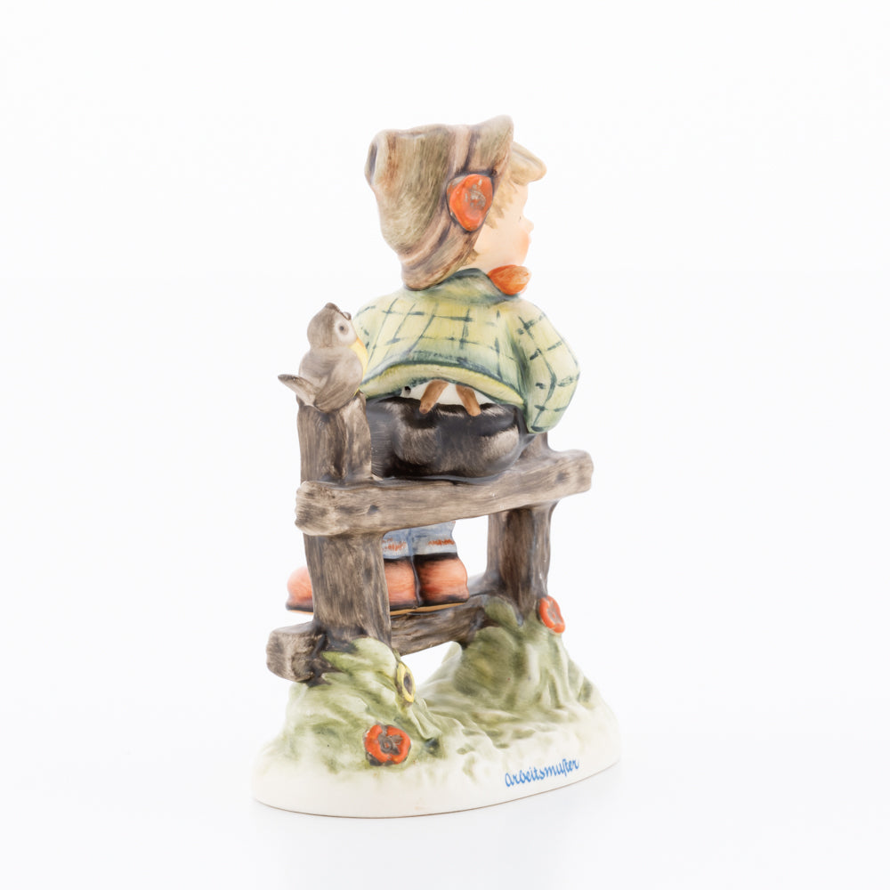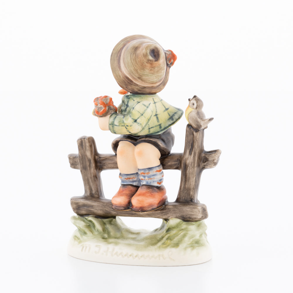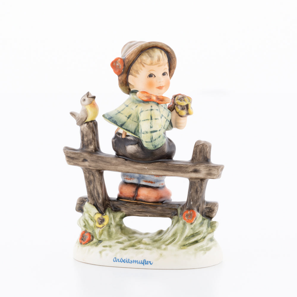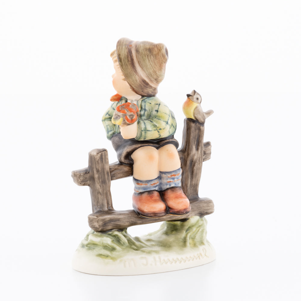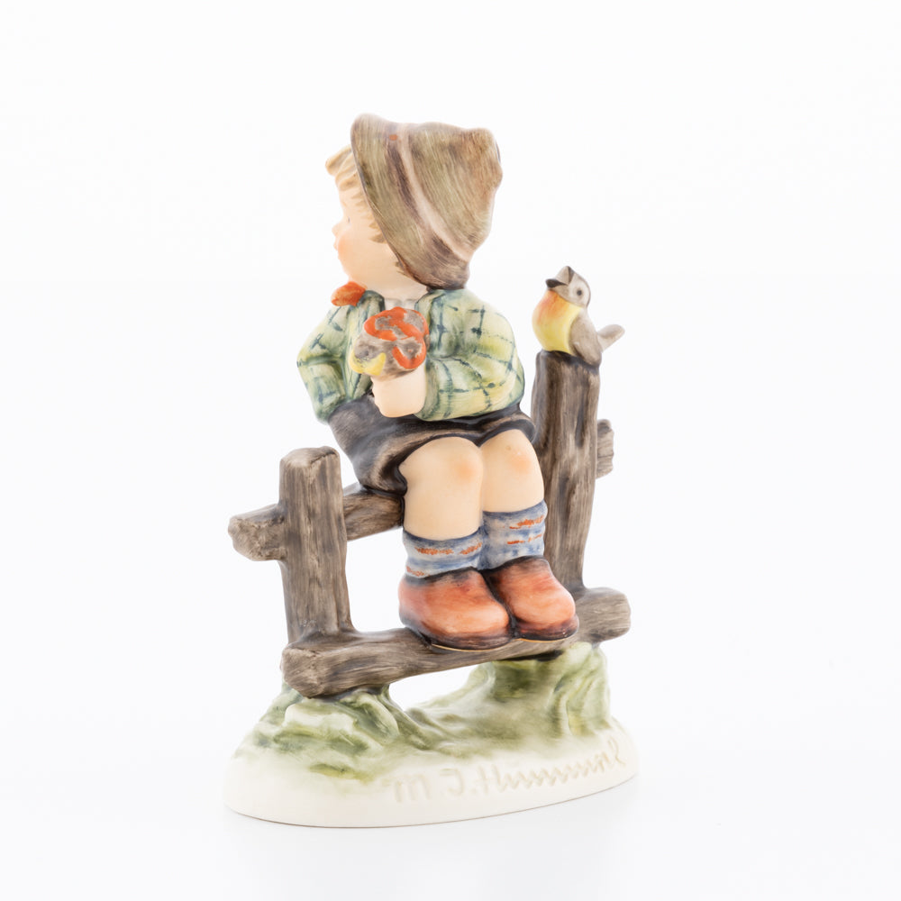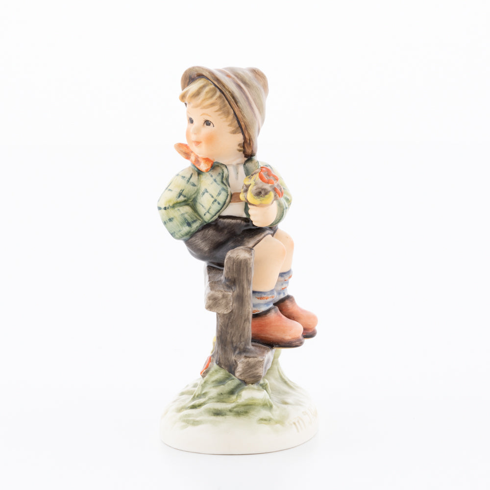 Suchend blickt sich der auf einem Zaun sitzende Junge nach einem Vögelchen um. Modelliert wurde die eine frühlingshafte Stimmung verbreitende Hummel-Figur von Gerhard Skrobek im Jahre 1980. Der kecke Bub mit Hütchen und Halstuch versetzt den Betrachter zurück in die Kindheit. Ob als Erinnerung an Kindheitstage oder als Geschenk zur Geburt, diese original Hummel-Figur ist ein wahres Meisterstück.