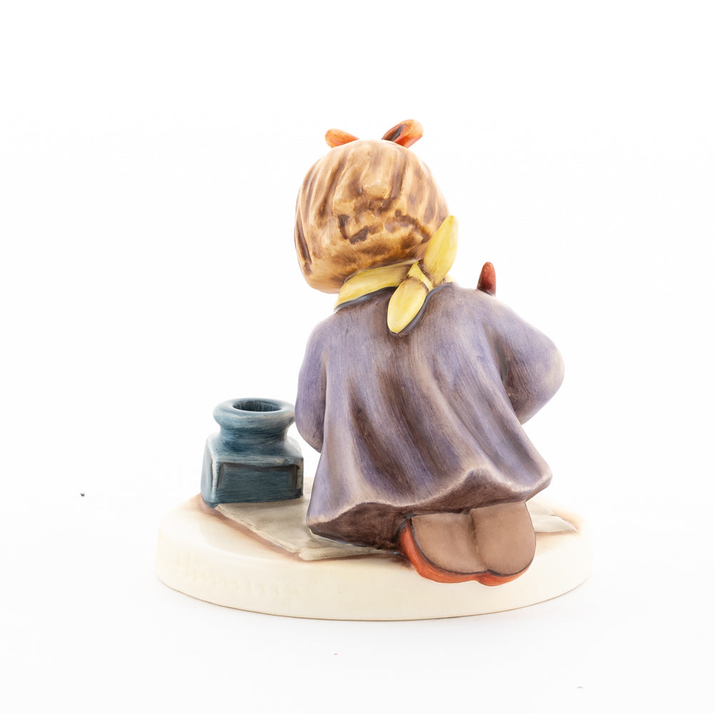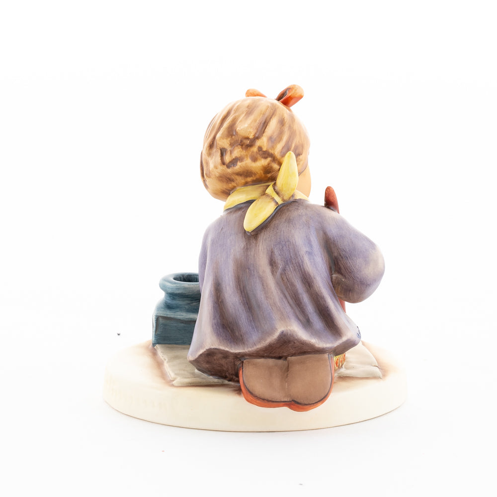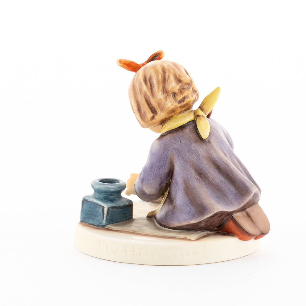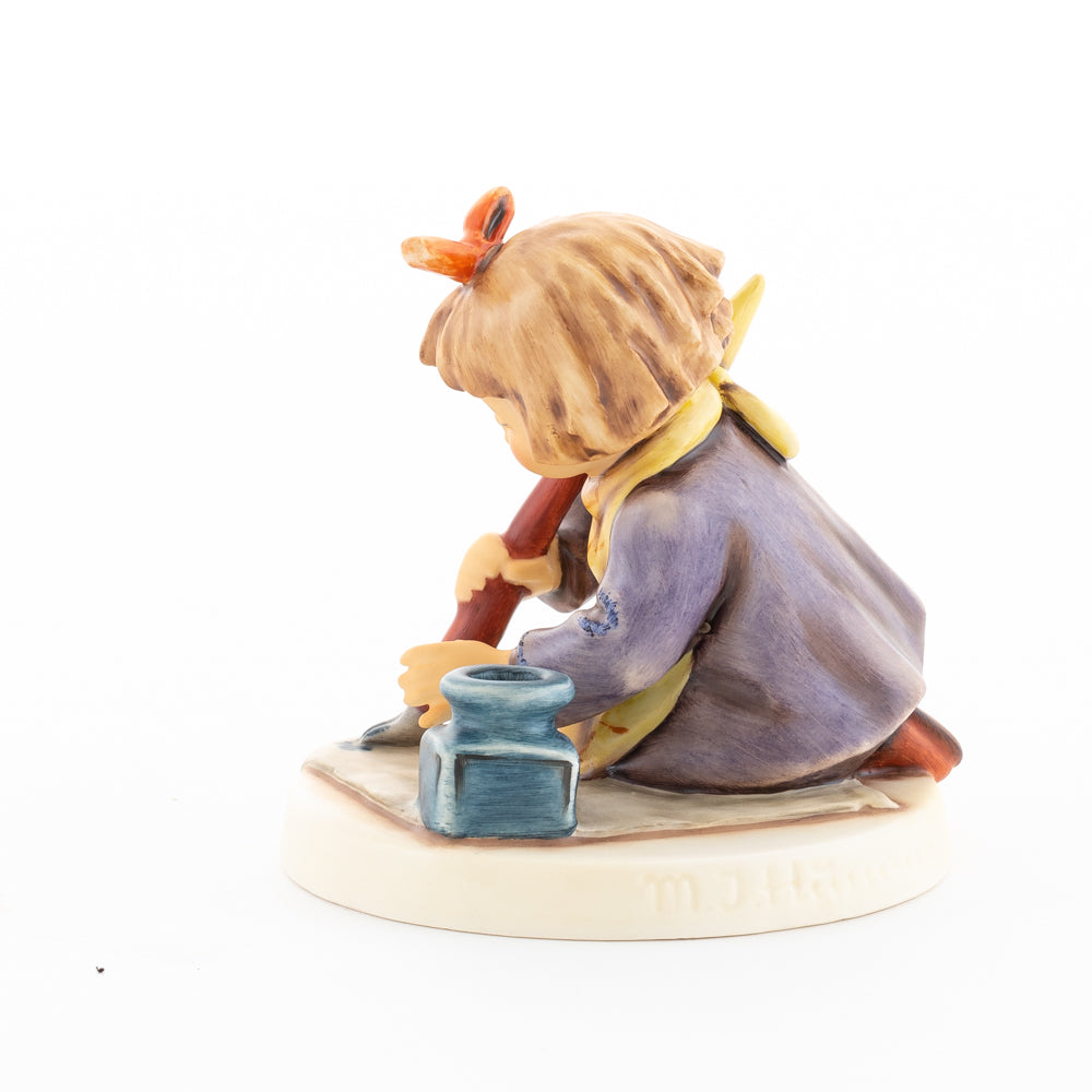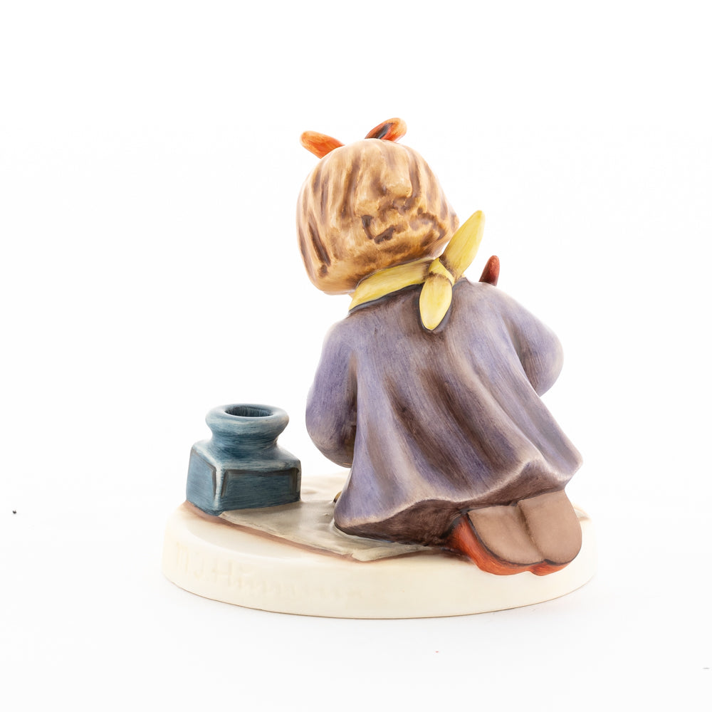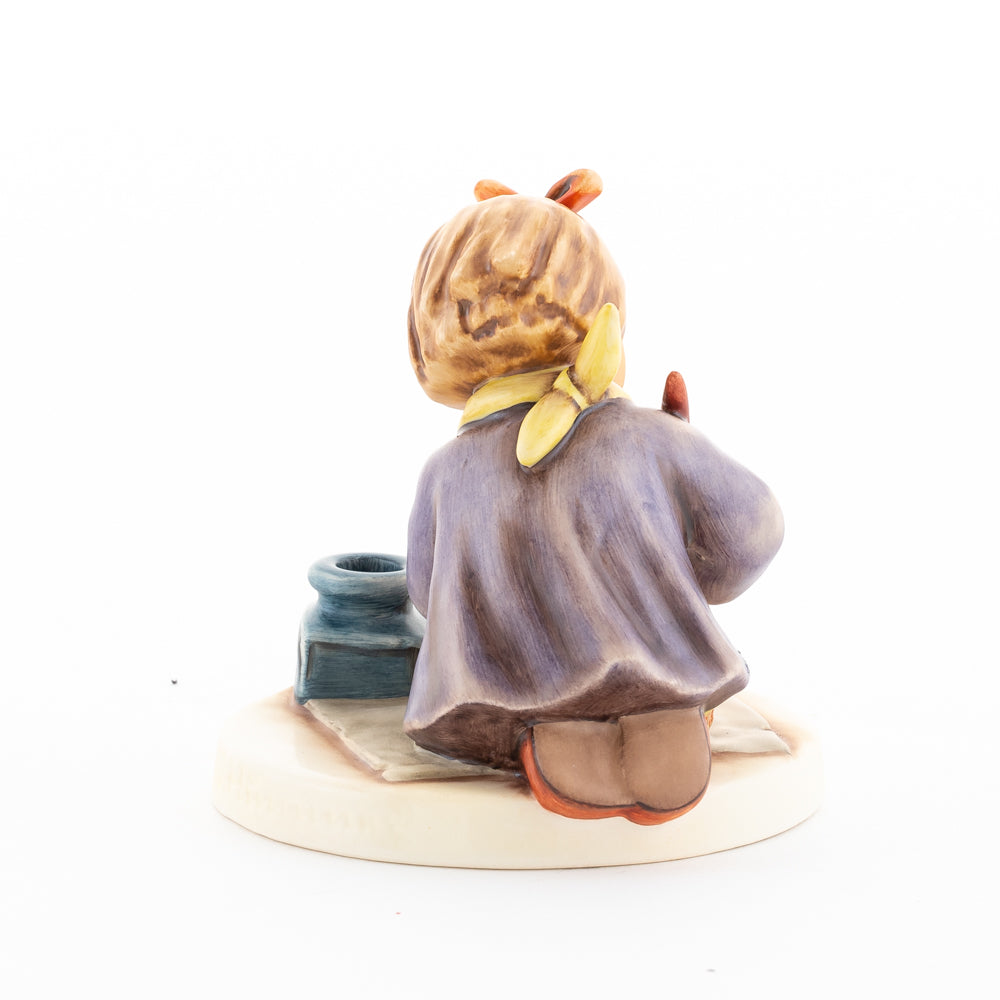 Ganz vertieft in seinen Brief ist das Madl in dieser Szene. Neben ihr das Tintenfass und in der Hand die Feder, schaut die kleine Schreiberin auf ihr Blatt hinunter – fest entschlossen, ein paar liebevolle Zeilen zu hinterlassen. Oder ist es gar ein Liebesbrief, den das Hummel-Mädchen hier verfasst?