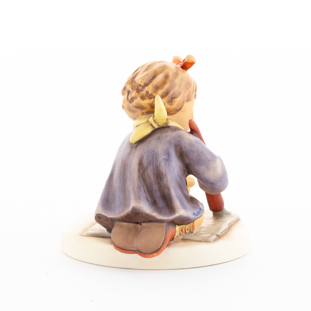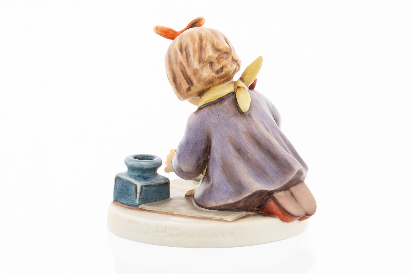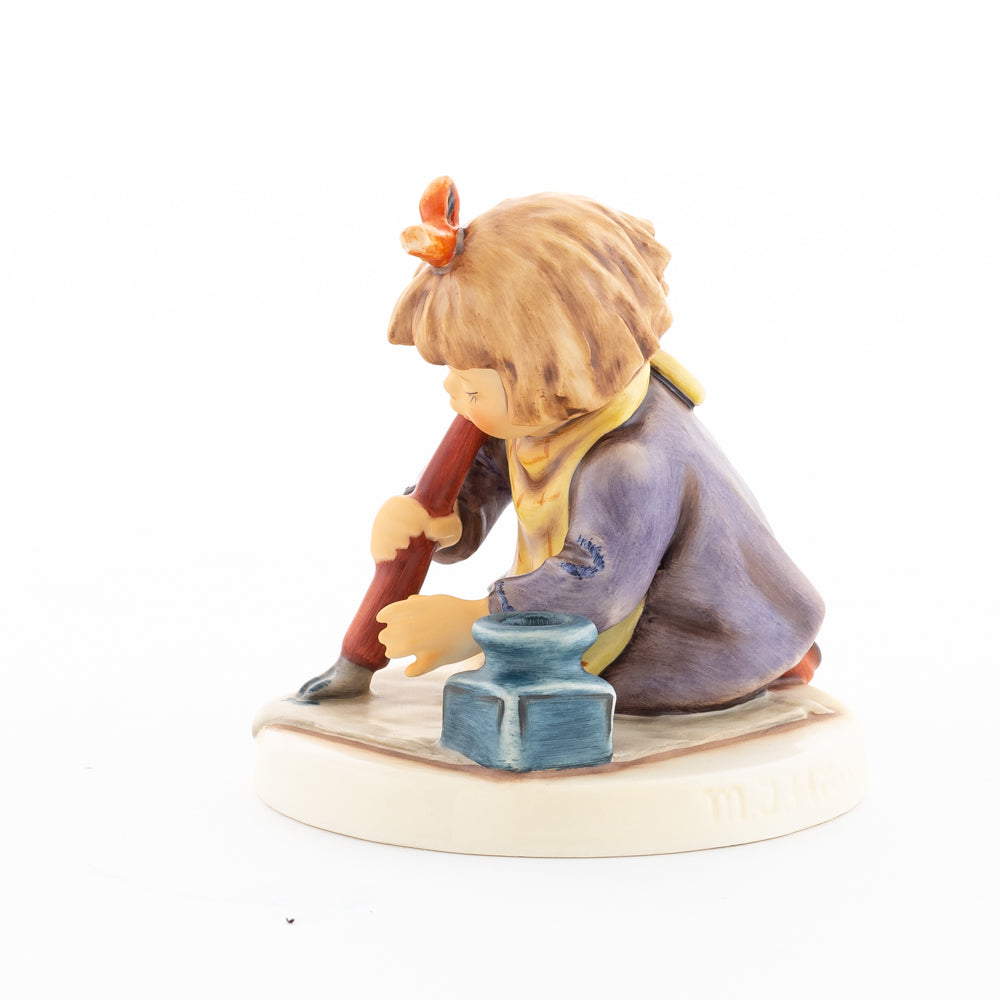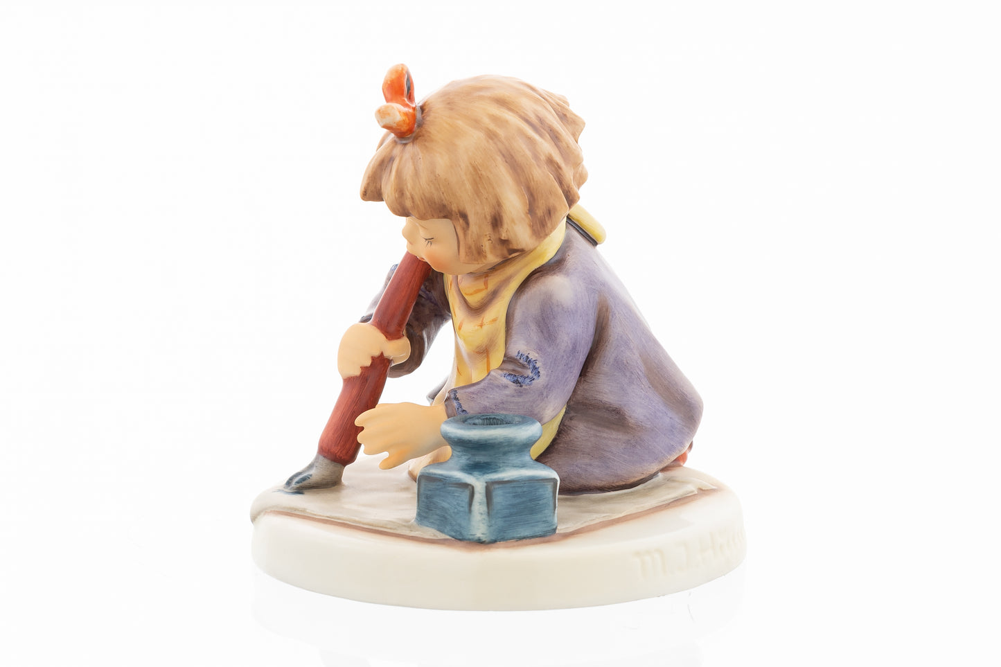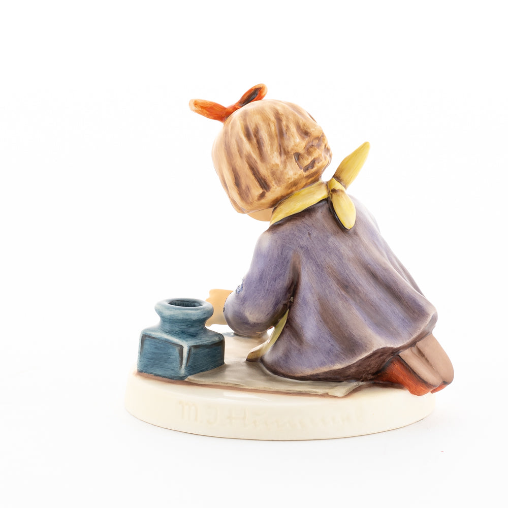 Ganz vertieft in seinen Brief ist das Madl in dieser Szene. Neben ihr das Tintenfass und in der Hand die Feder, schaut die kleine Schreiberin auf ihr Blatt hinunter – fest entschlossen, ein paar liebevolle Zeilen zu hinterlassen. Oder ist es gar ein Liebesbrief, den das Hummel-Mädchen hier verfasst?