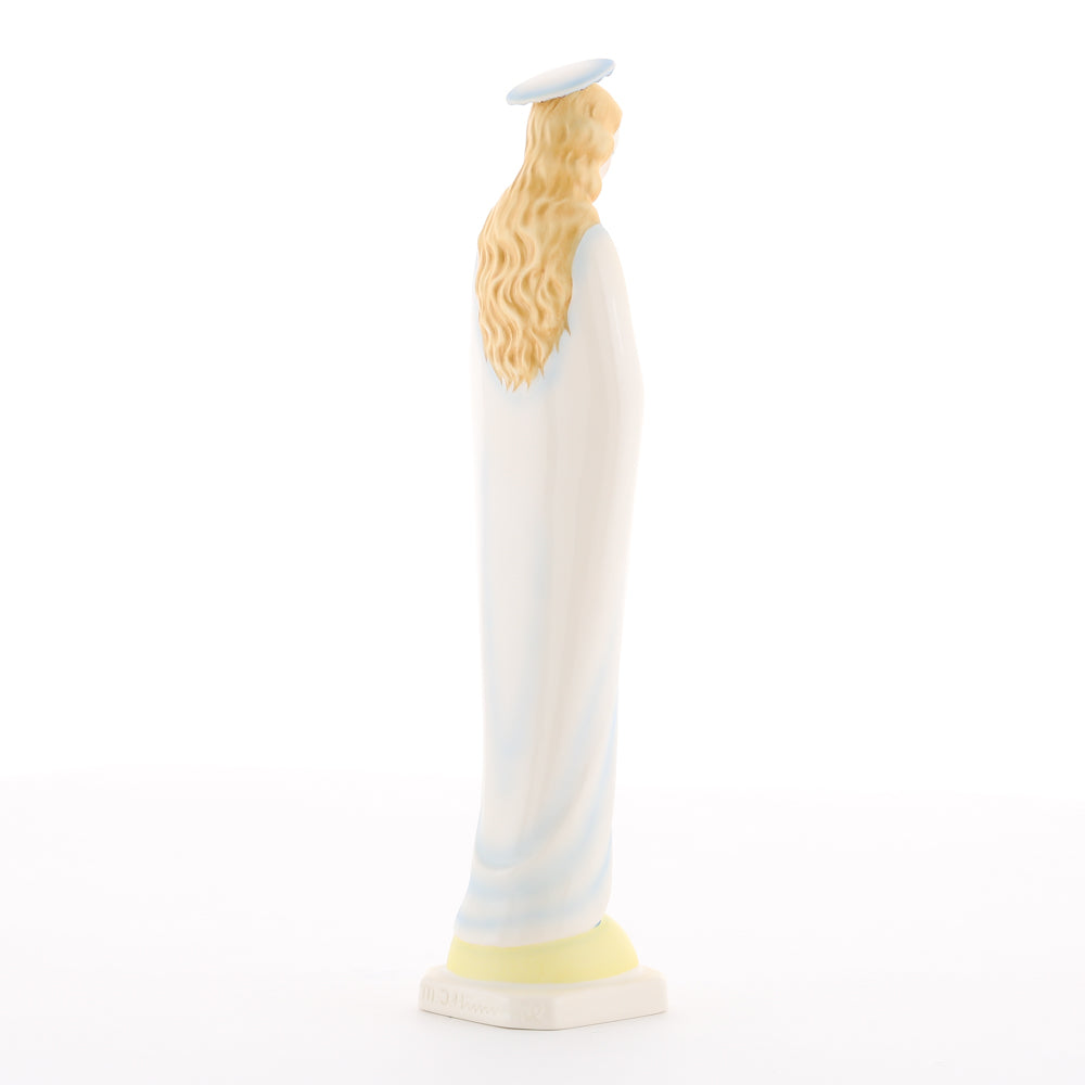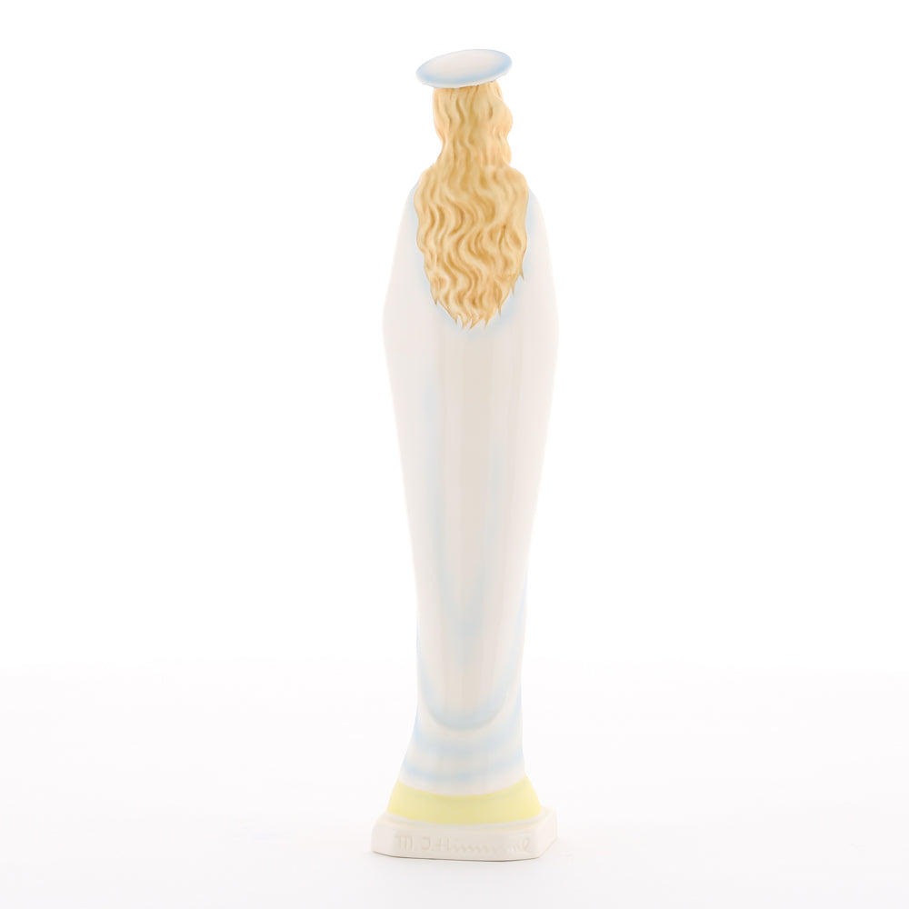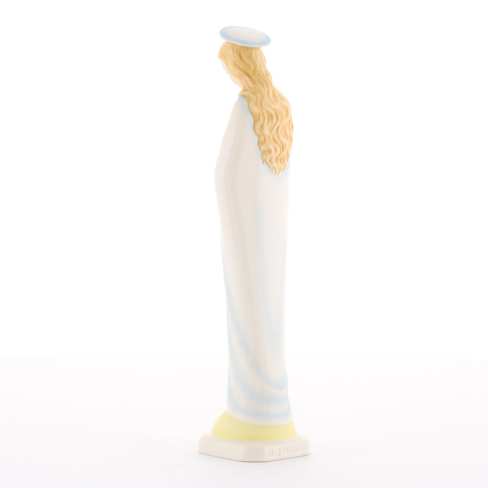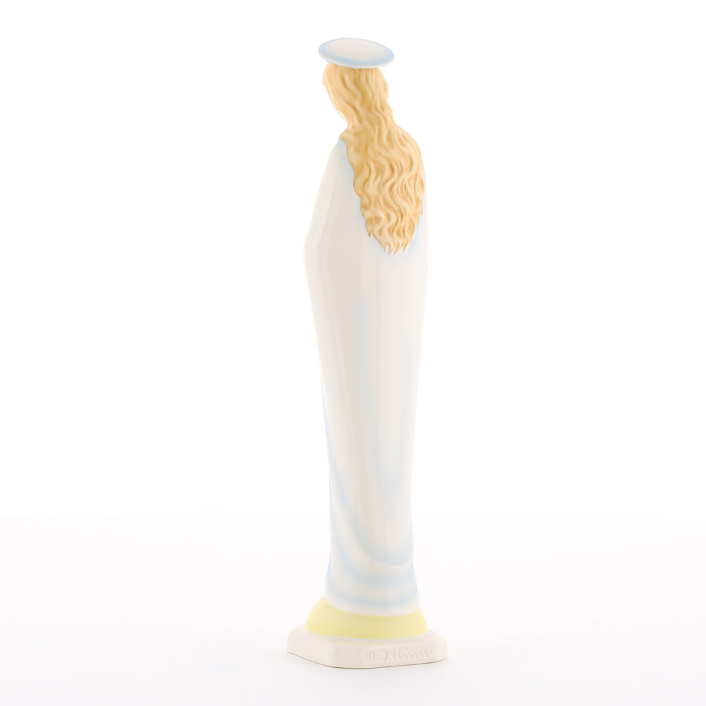 Wie die Blumenmadonna (HUM 10) wurde die Madonna mit Heiligenschein im Jahr 1935 veröffentlicht und zählt damit zu den dienstältesten Schmuckstücken der Hummel Manufaktur. Gestaltet wurde sie von Reinhold Unger, der auch für die weiteren Versionen des Marienbilds verantwortlich zeichnet. Besonderes Kennzeichen dieser Figur: Maria wird ohne Jesuskind gezeigt, hat die Hände zum Gebet gefaltet und den Blick gesenkt. Über ihrem Kopf schwebt ein hellblauer Heiligenschein, während sich der ebenfalls in hellen Blautönen gestaltete Schutzmantel um ihre gesamte Silhouette legt.