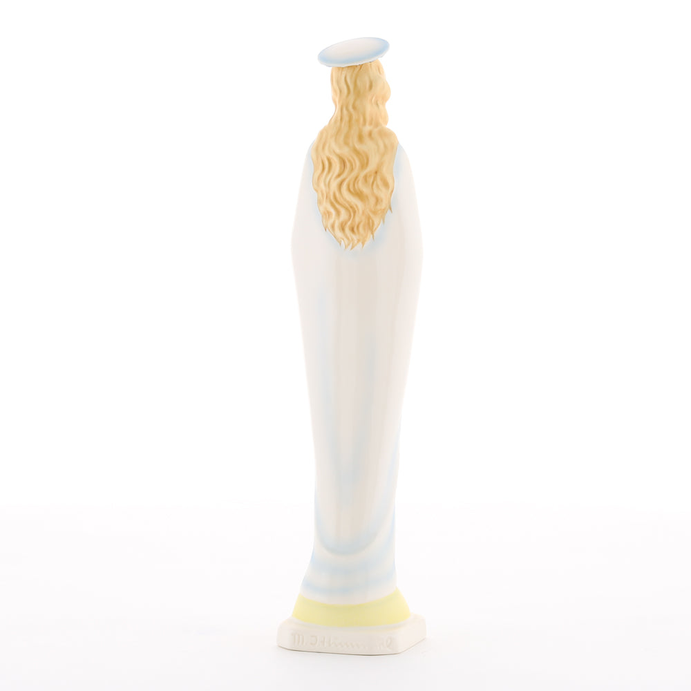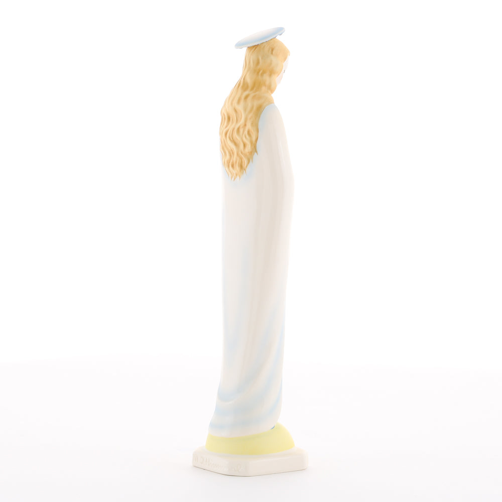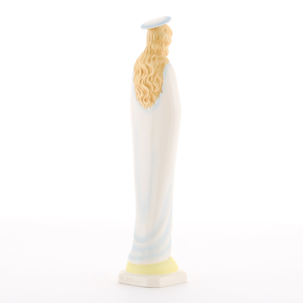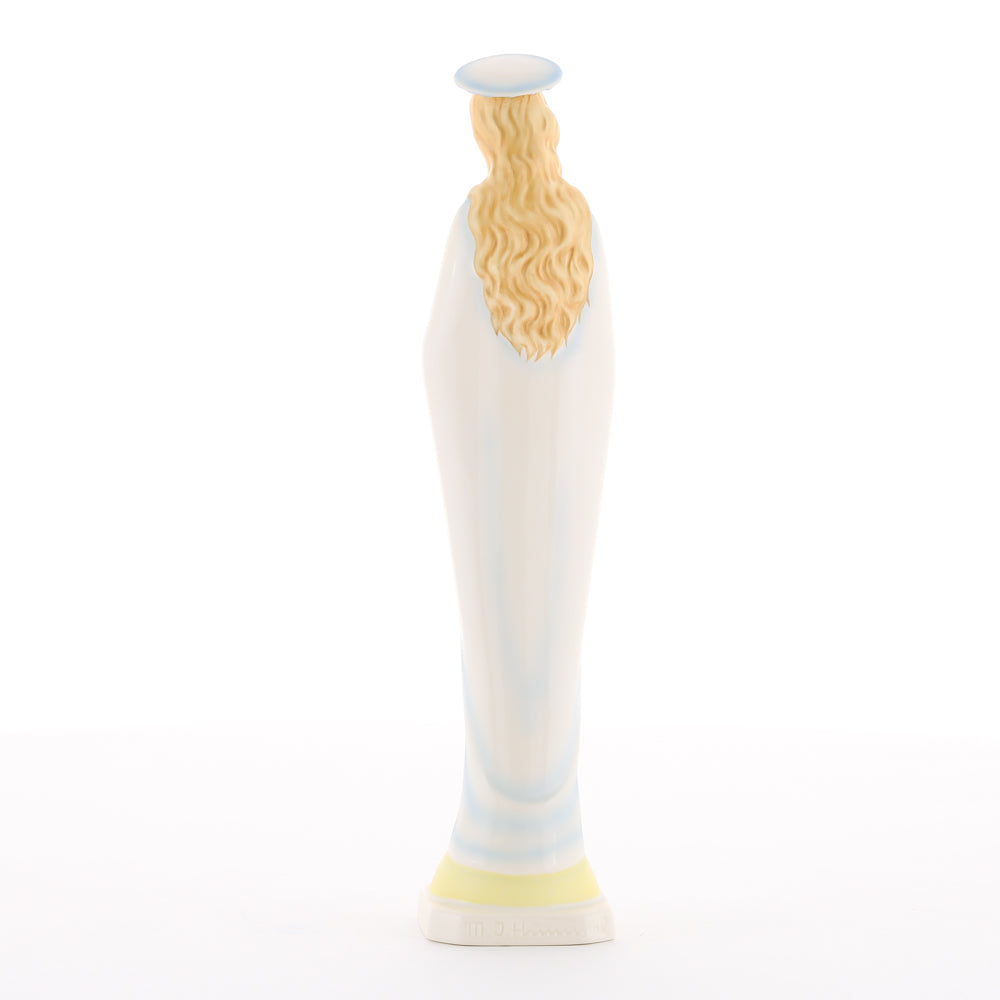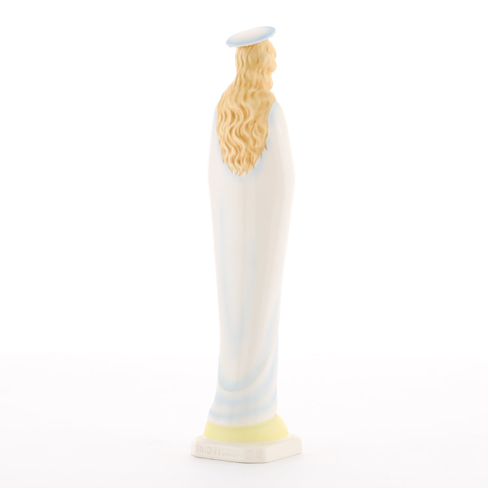 Wie die Blumenmadonna (HUM 10) wurde die Madonna mit Heiligenschein im Jahr 1935 veröffentlicht und zählt damit zu den dienstältesten Schmuckstücken der Hummel Manufaktur. Gestaltet wurde sie von Reinhold Unger, der auch für die weiteren Versionen des Marienbilds verantwortlich zeichnet. Besonderes Kennzeichen dieser Figur: Maria wird ohne Jesuskind gezeigt, hat die Hände zum Gebet gefaltet und den Blick gesenkt. Über ihrem Kopf schwebt ein hellblauer Heiligenschein, während sich der ebenfalls in hellen Blautönen gestaltete Schutzmantel um ihre gesamte Silhouette legt.