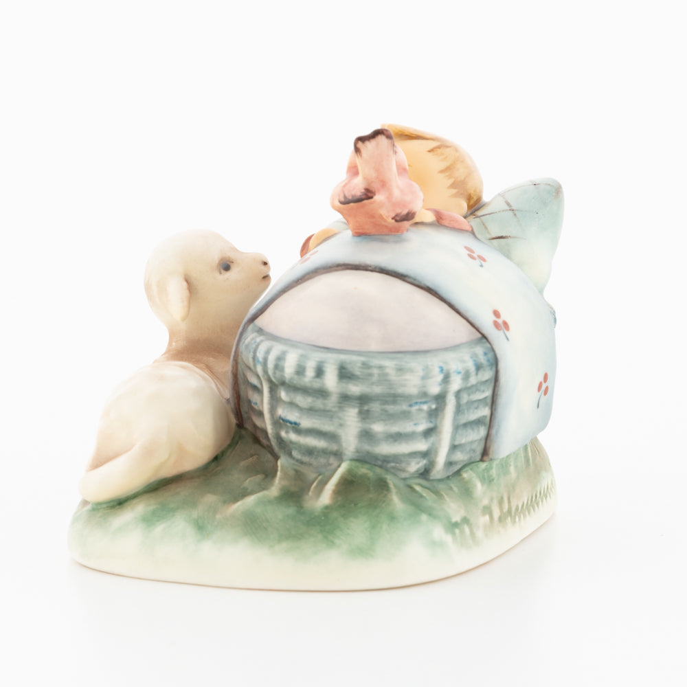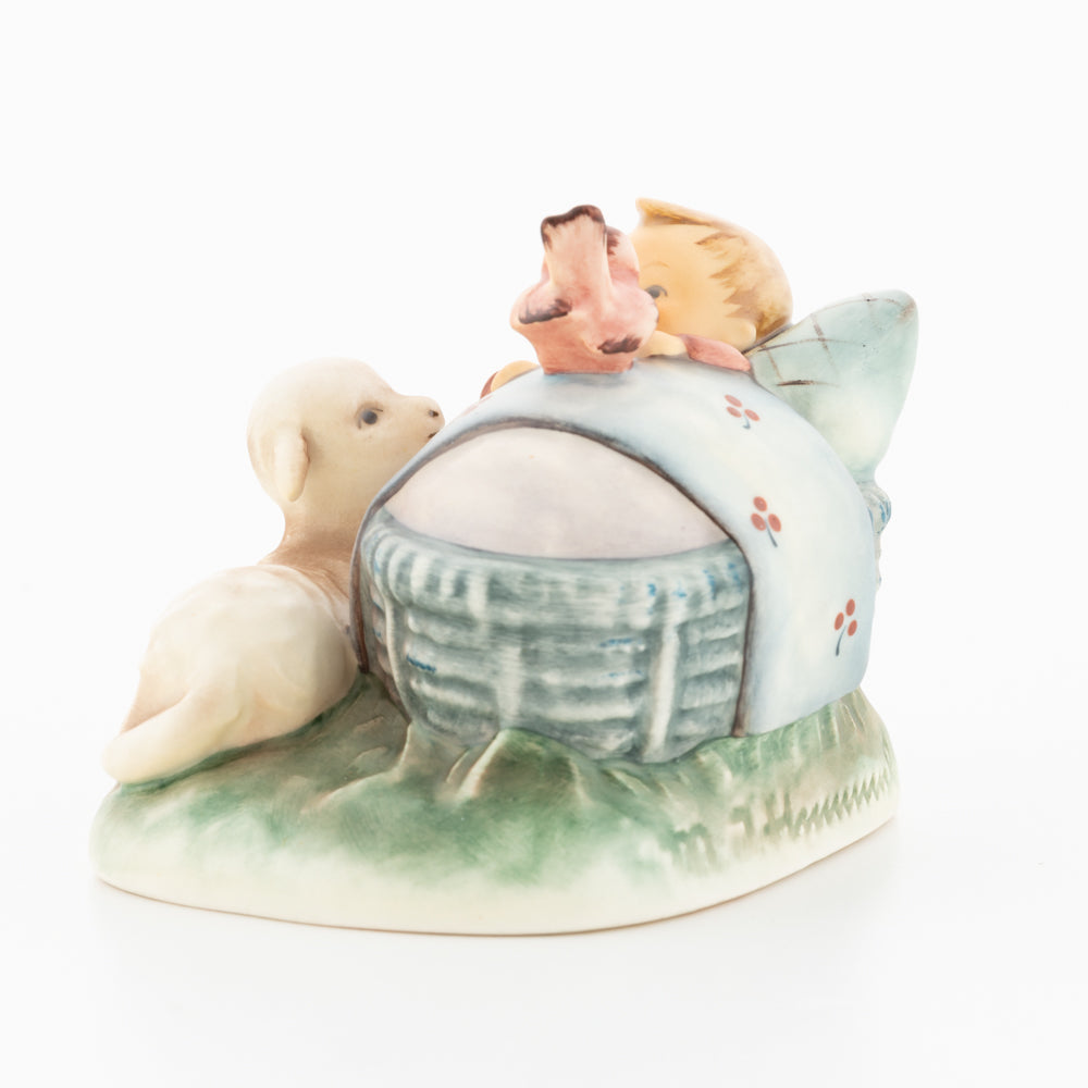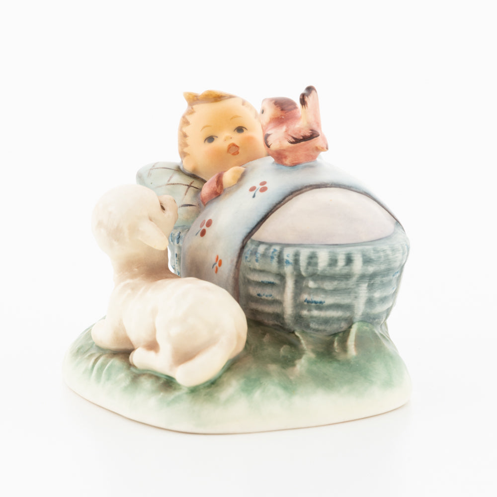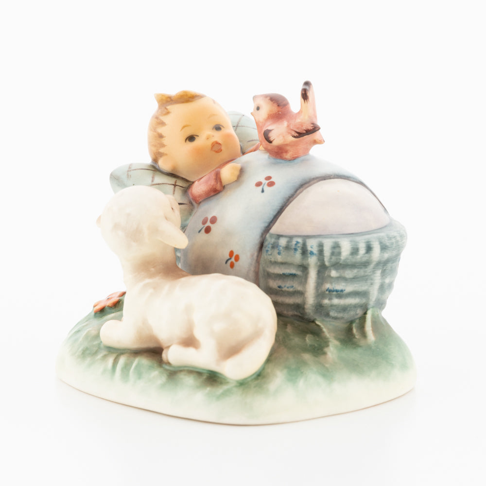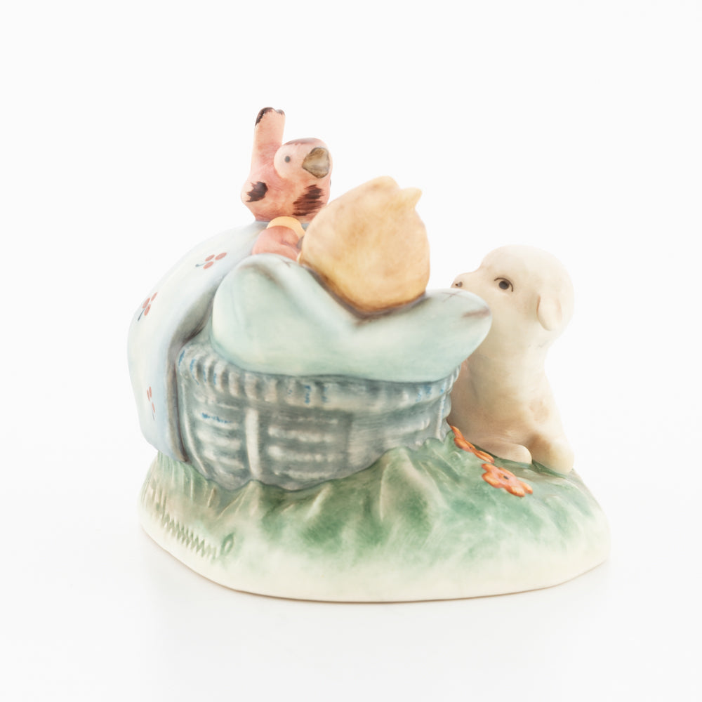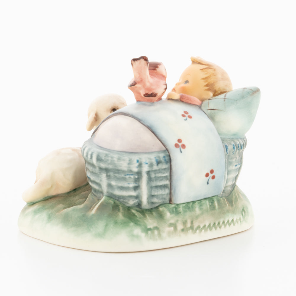 Warm gebettet liegt das Hummel-Baby in seiner Wiege. Ein munterer Vogel zwitschert ihm sein Lied und unterhält es damit auf das Schönste. Ein kleines Schaf leistet dem Kindlein Gesellschaft. „Wohl behütet“ heißt die Figur, die Meistermodelleur Gerhard Srkobek im Jahr 1991 gestaltete. Ein hübscher Blickfang in der Vitrine!