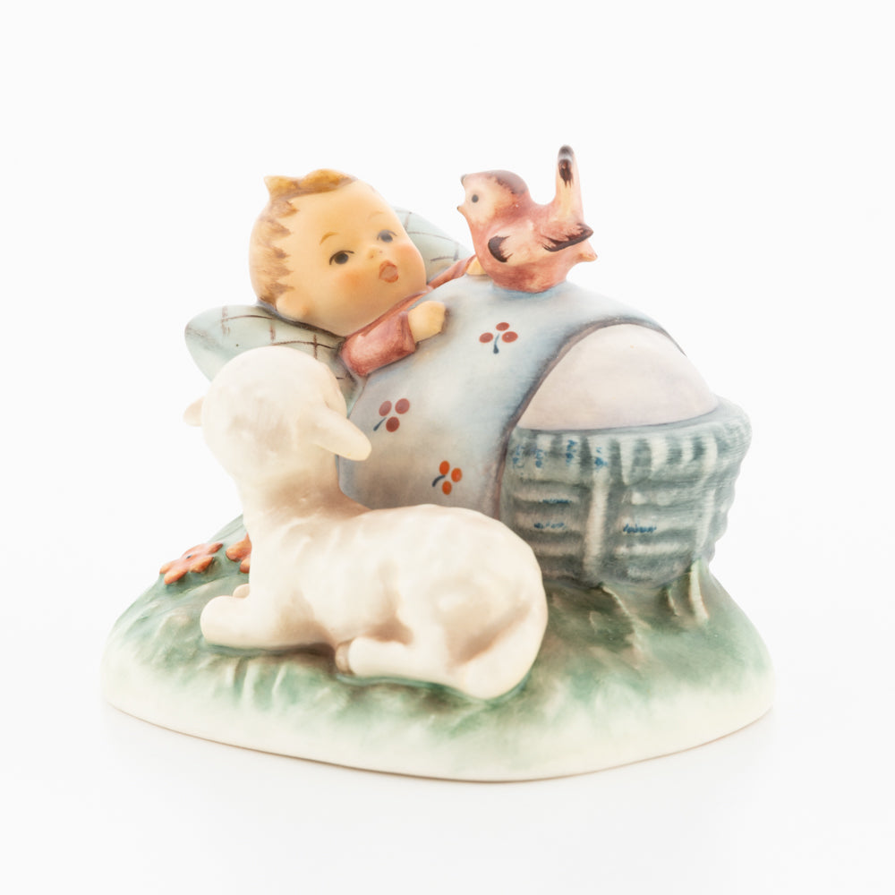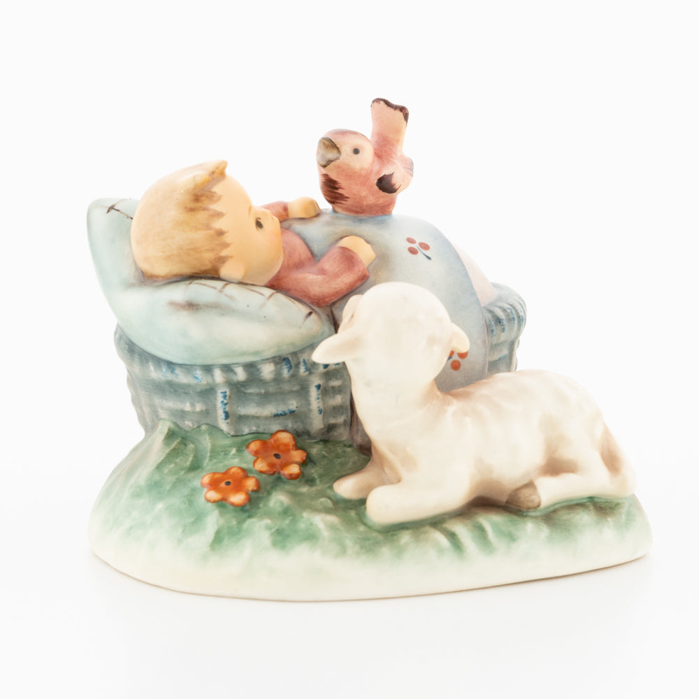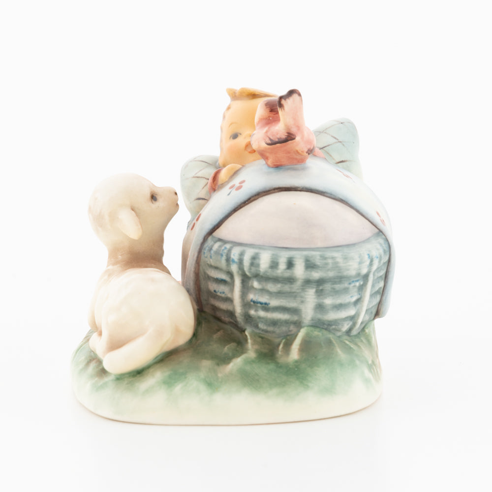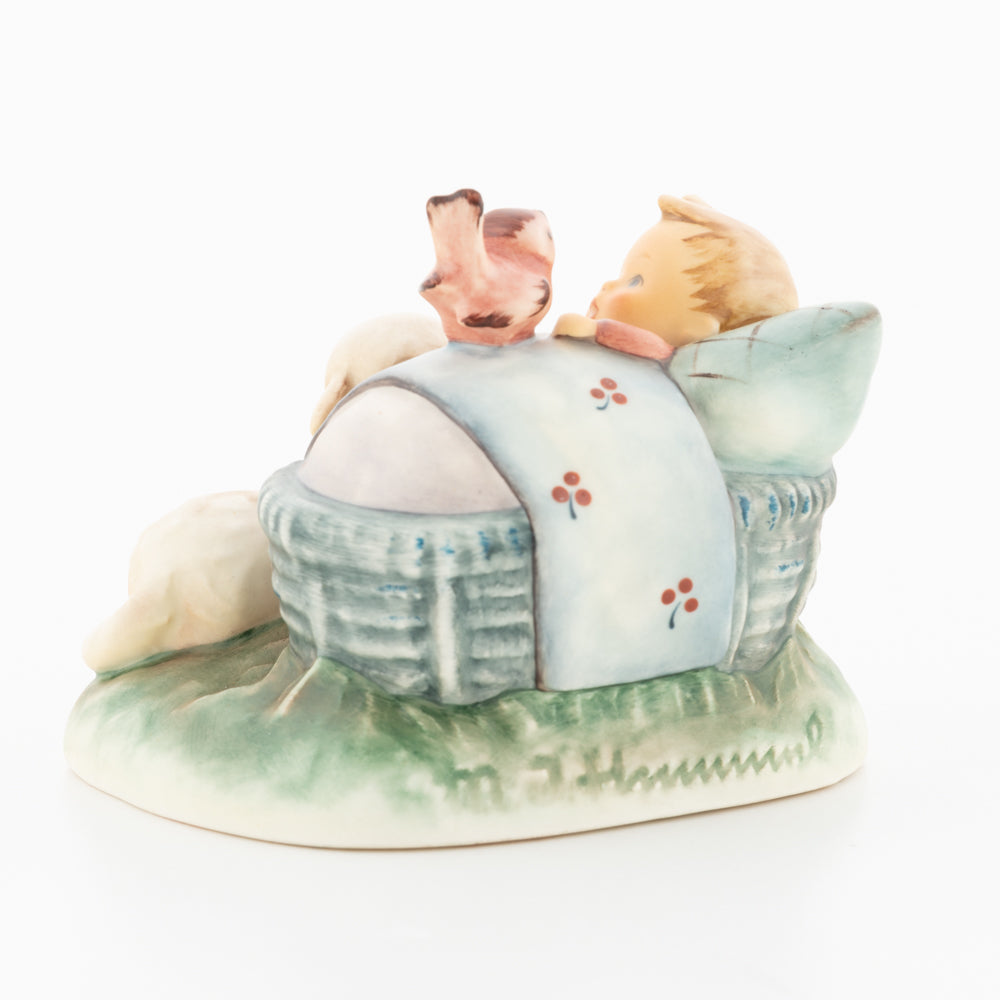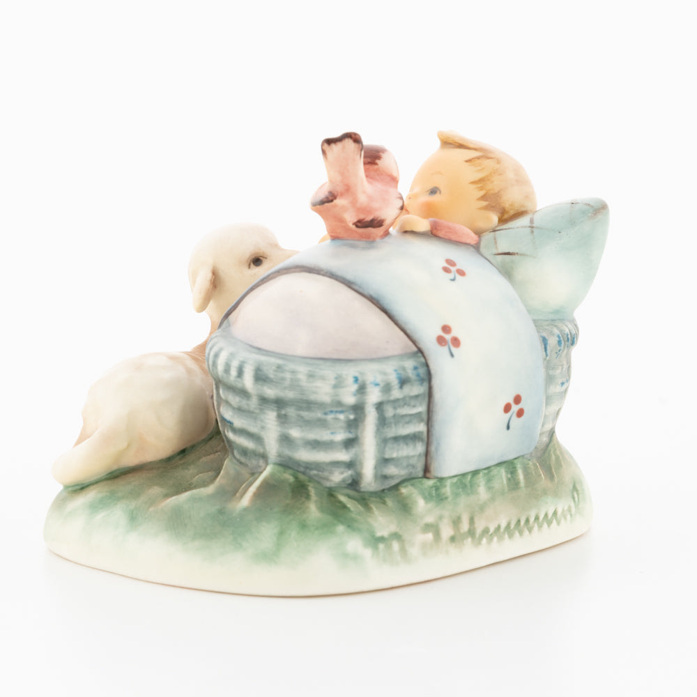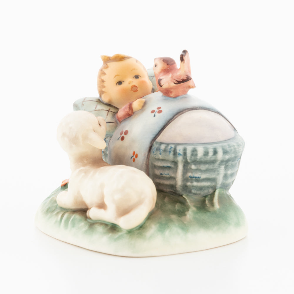Warm gebettet liegt das Hummel-Baby in seiner Wiege. Ein munterer Vogel zwitschert ihm sein Lied und unterhält es damit auf das Schönste. Ein kleines Schaf leistet dem Kindlein Gesellschaft. „Wohl behütet“ heißt die Figur, die Meistermodelleur Gerhard Srkobek im Jahr 1991 gestaltete. Ein hübscher Blickfang in der Vitrine!