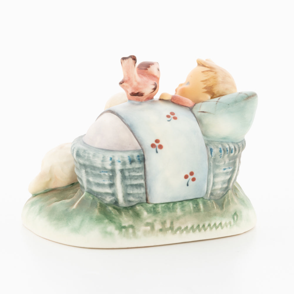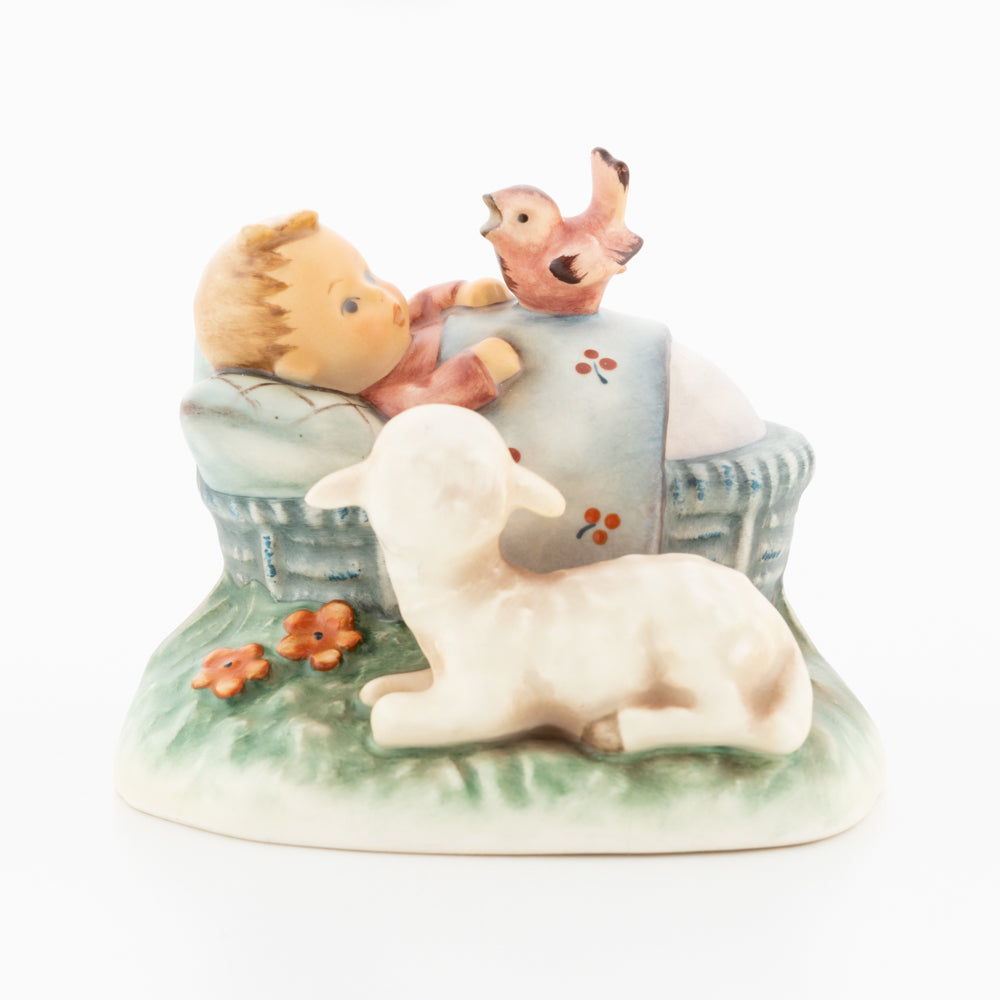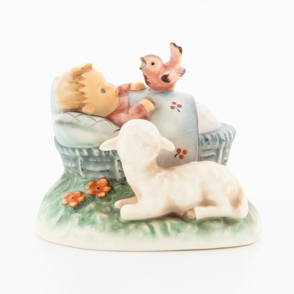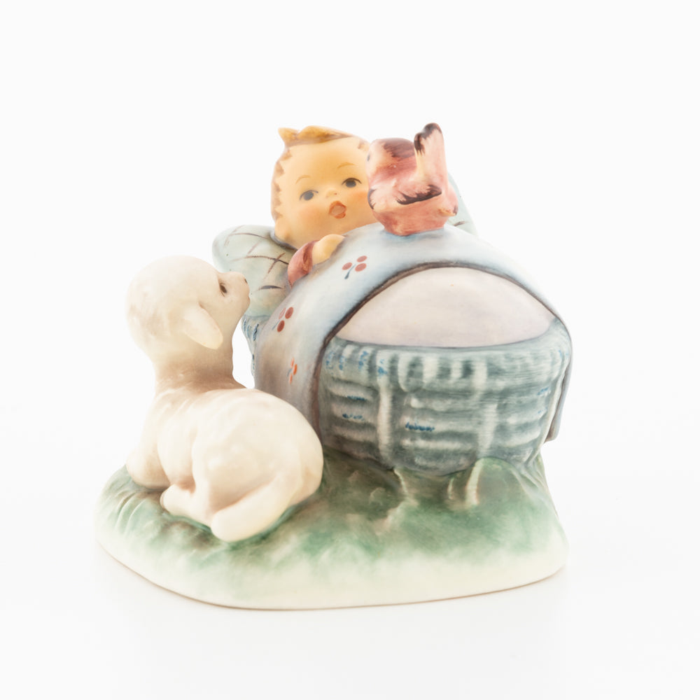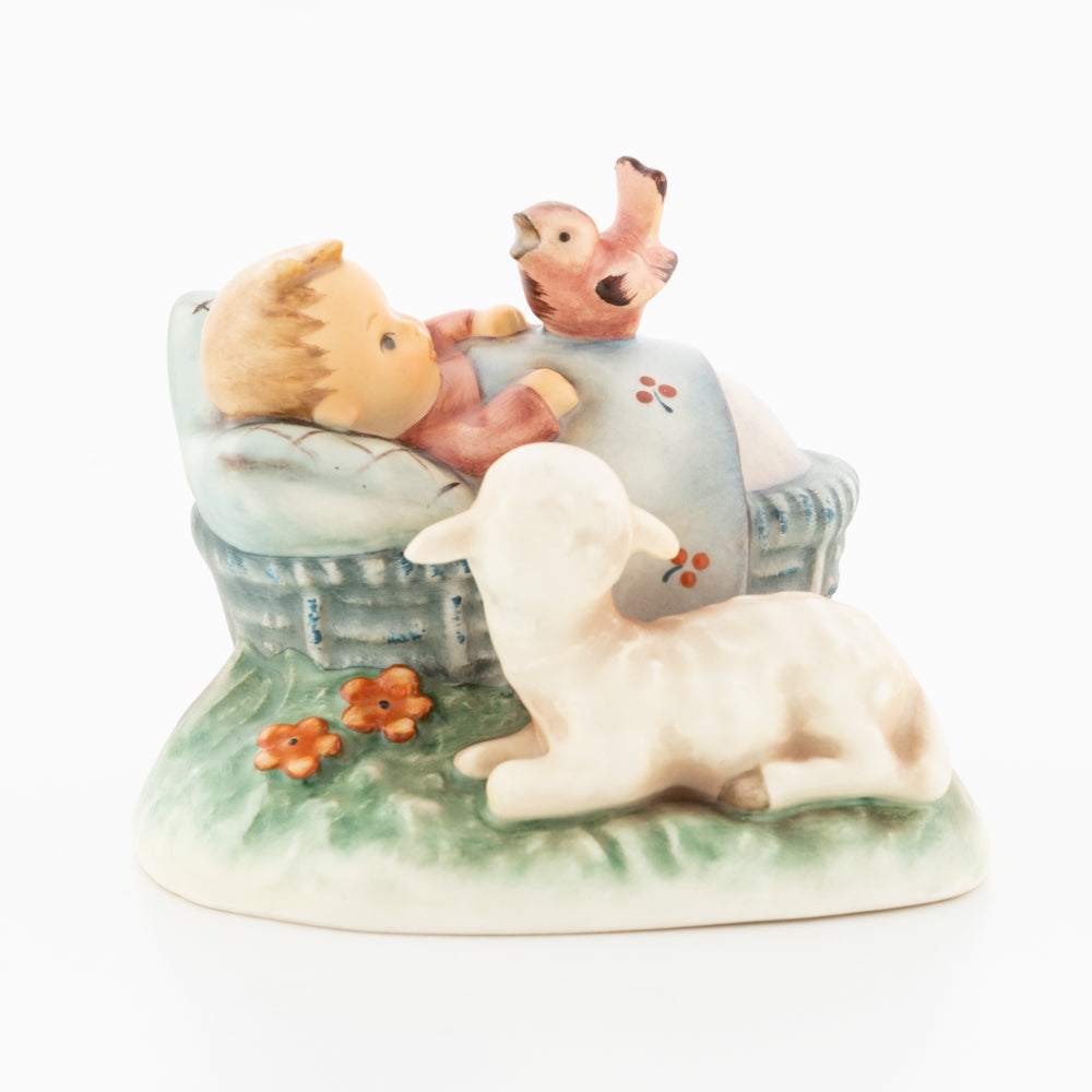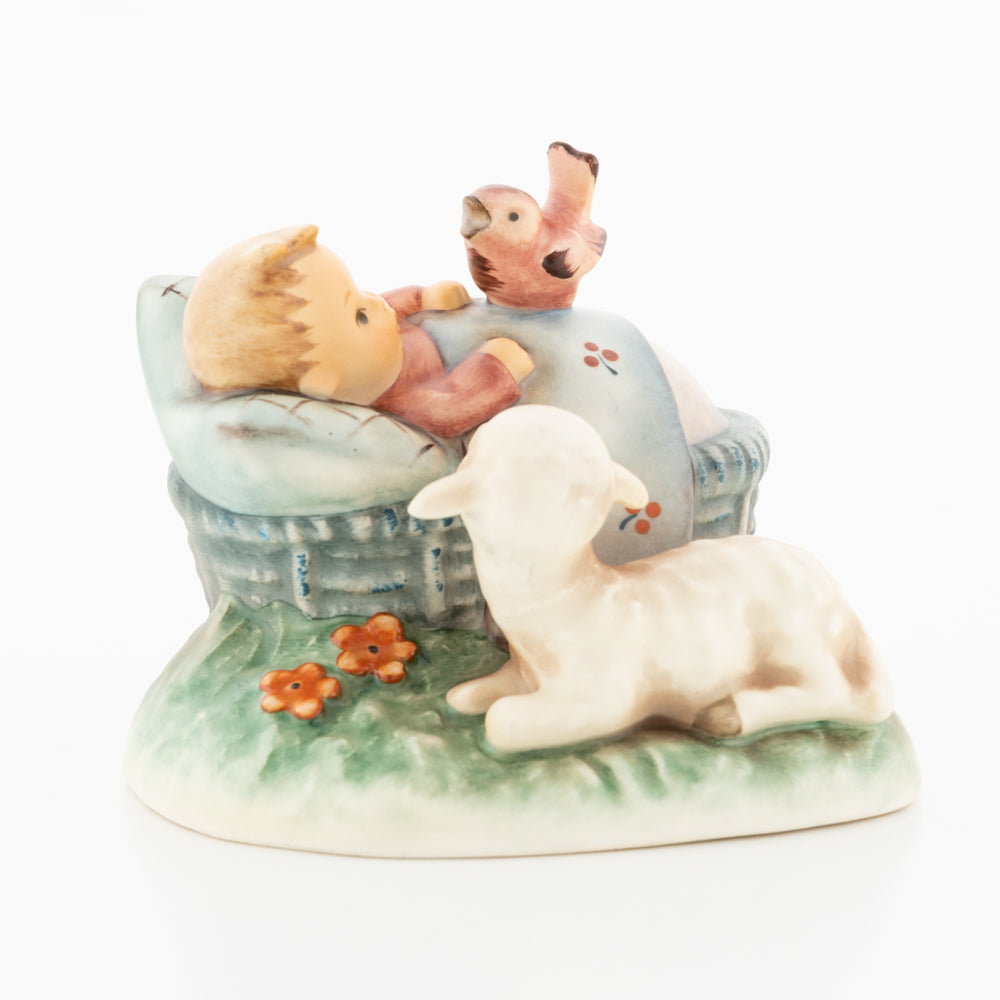 Warm gebettet liegt das Hummel-Baby in seiner Wiege. Ein munterer Vogel zwitschert ihm sein Lied und unterhält es damit auf das Schönste. Ein kleines Schaf leistet dem Kindlein Gesellschaft. „Wohl behütet“ heißt die Figur, die Meistermodelleur Gerhard Srkobek im Jahr 1991 gestaltete. Ein hübscher Blickfang in der Vitrine!