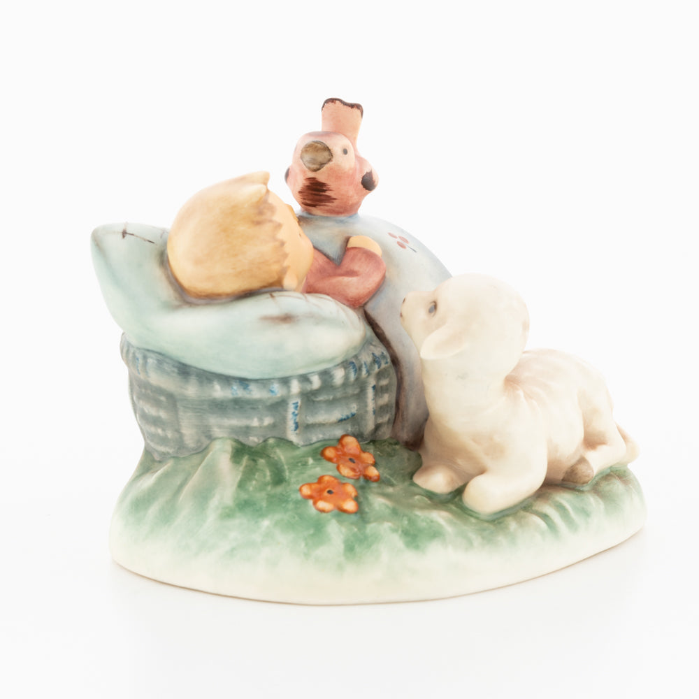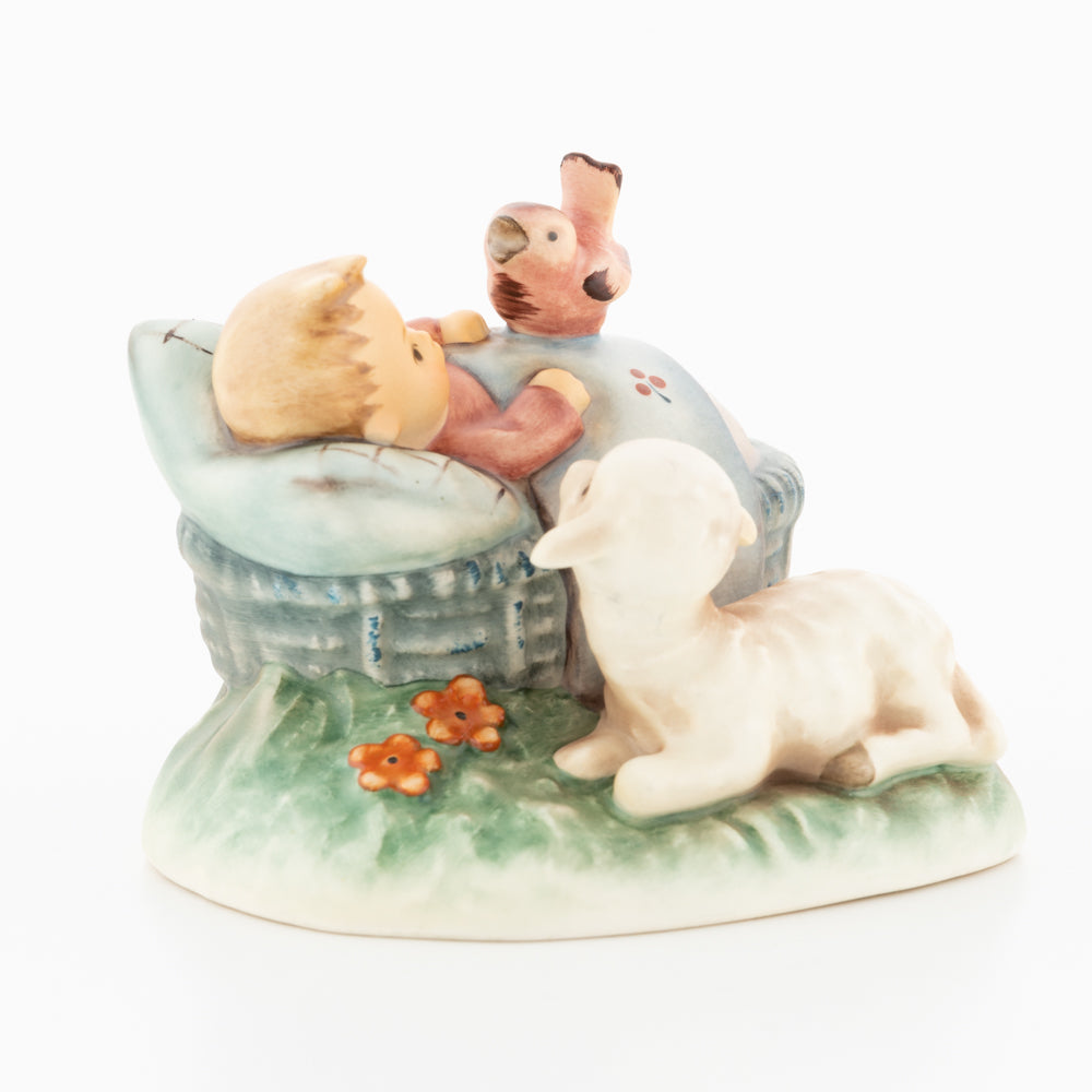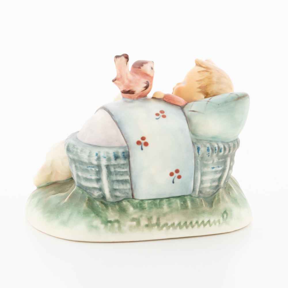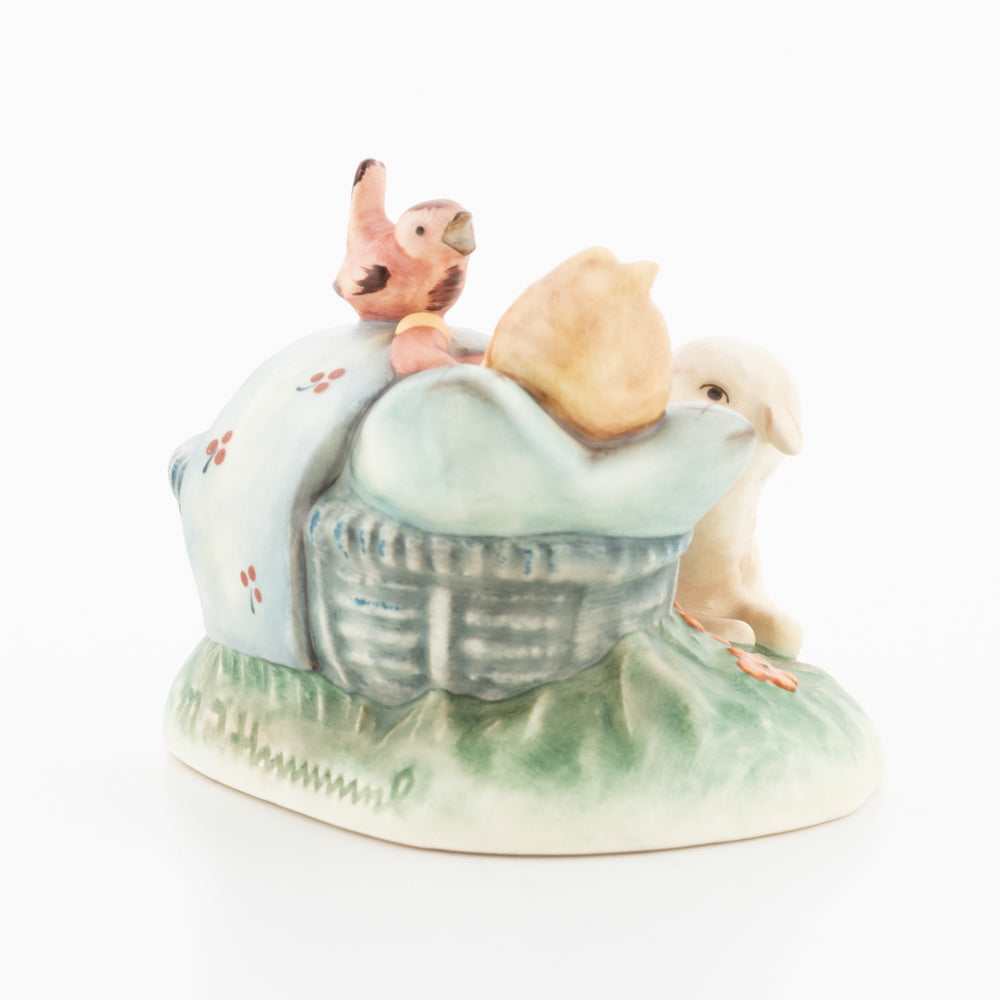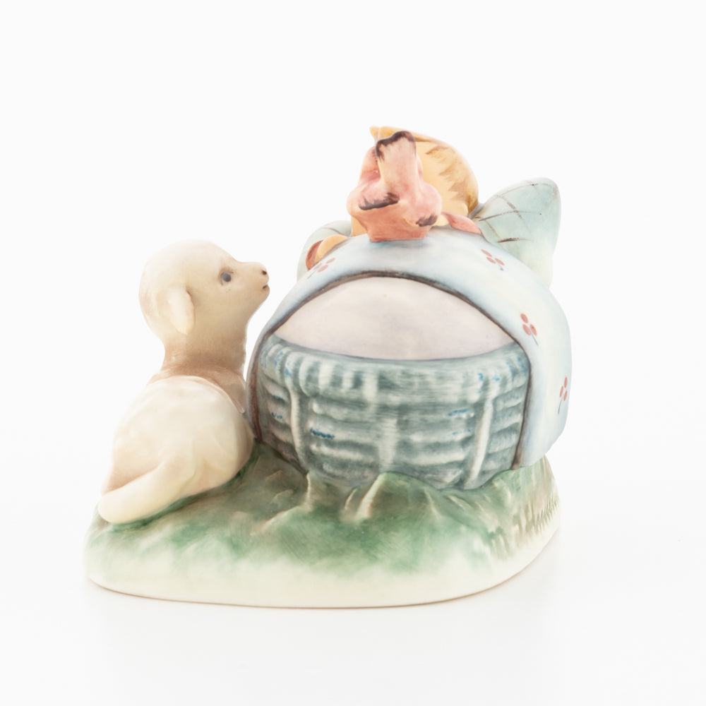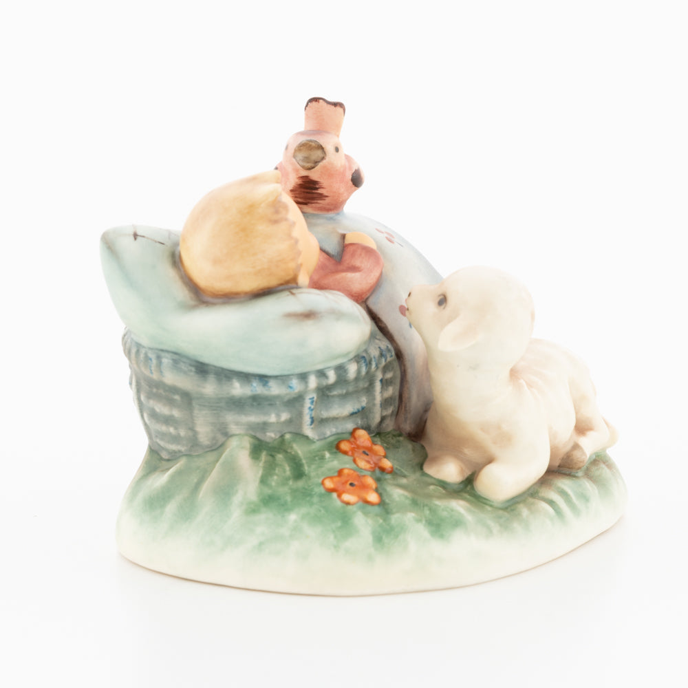 Warm gebettet liegt das Hummel-Baby in seiner Wiege. Ein munterer Vogel zwitschert ihm sein Lied und unterhält es damit auf das Schönste. Ein kleines Schaf leistet dem Kindlein Gesellschaft. „Wohl behütet“ heißt die Figur, die Meistermodelleur Gerhard Srkobek im Jahr 1991 gestaltete. Ein hübscher Blickfang in der Vitrine!