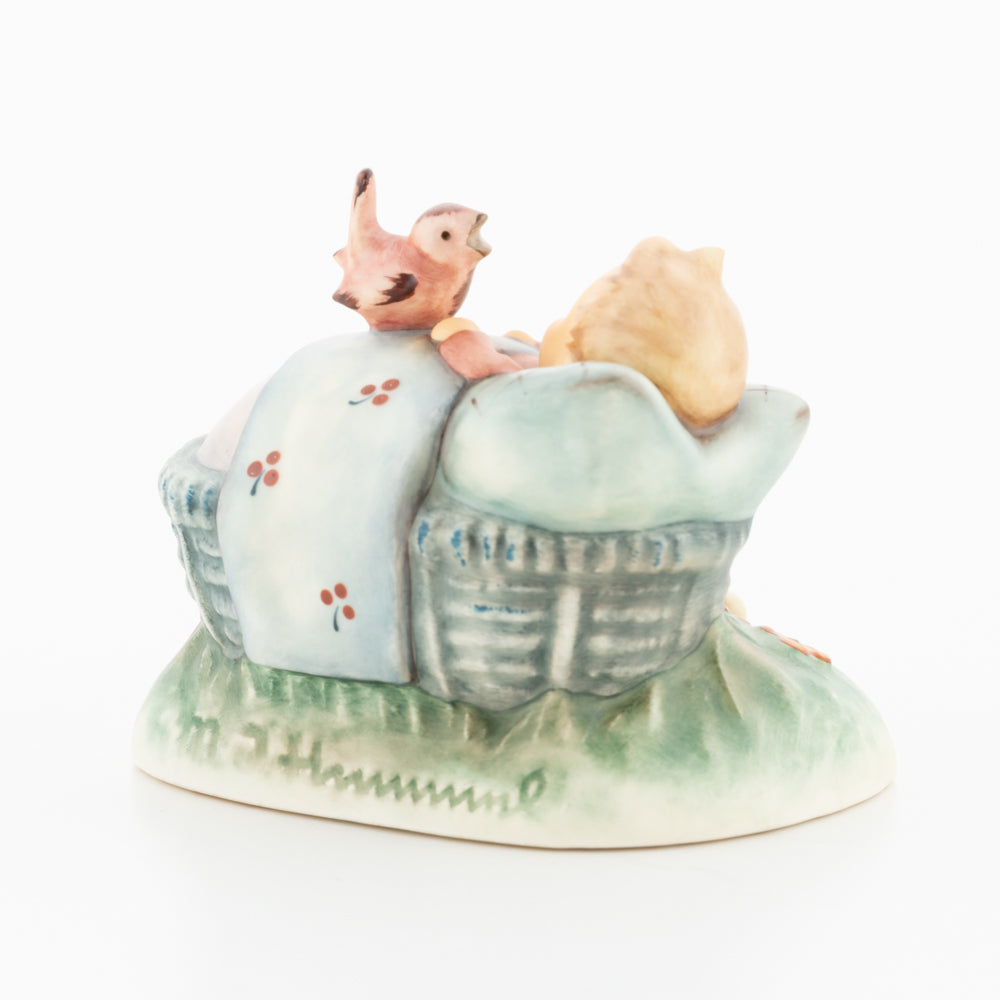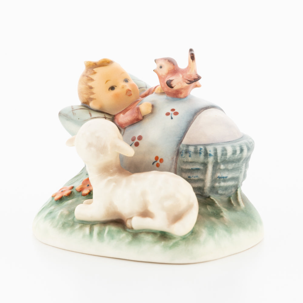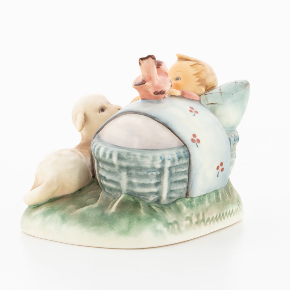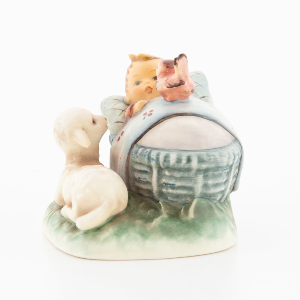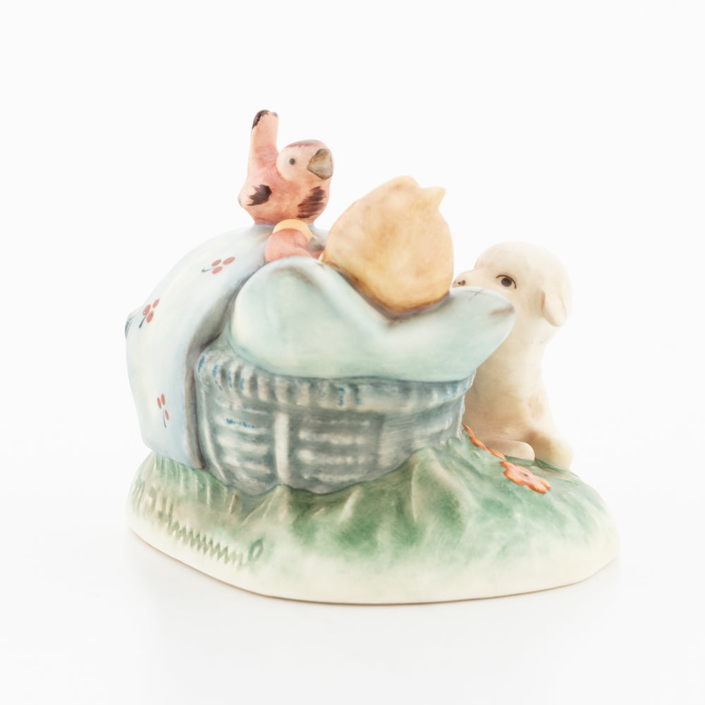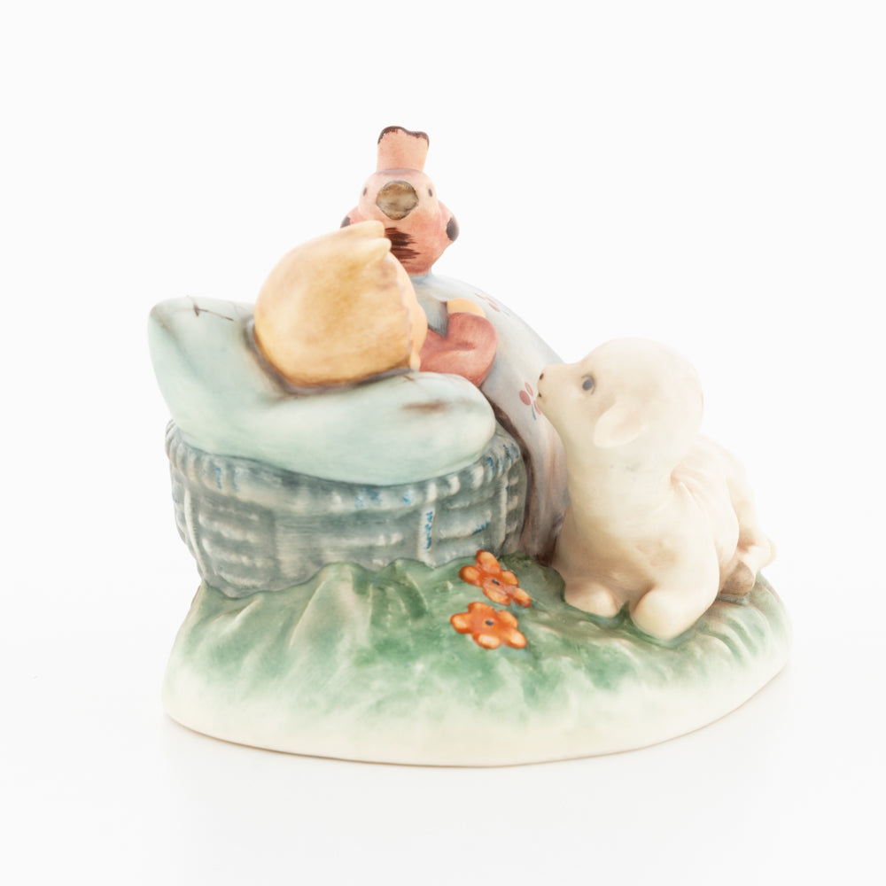 Warm gebettet liegt das Hummel-Baby in seiner Wiege. Ein munterer Vogel zwitschert ihm sein Lied und unterhält es damit auf das Schönste. Ein kleines Schaf leistet dem Kindlein Gesellschaft. „Wohl behütet“ heißt die Figur, die Meistermodelleur Gerhard Srkobek im Jahr 1991 gestaltete. Ein hübscher Blickfang in der Vitrine!