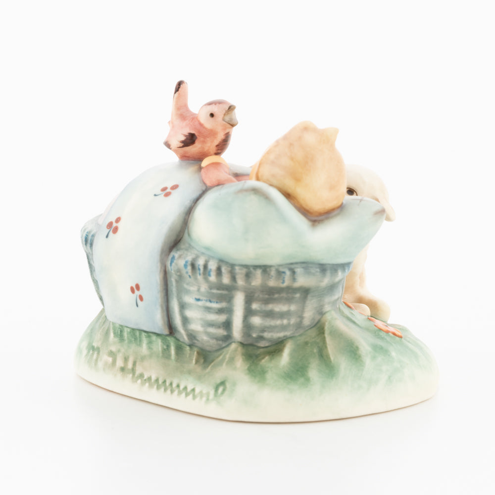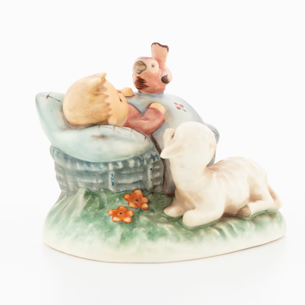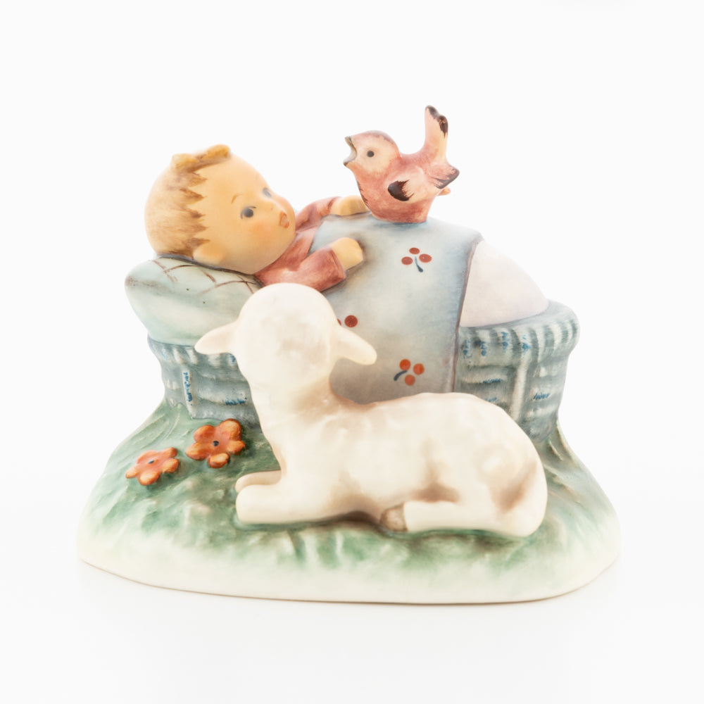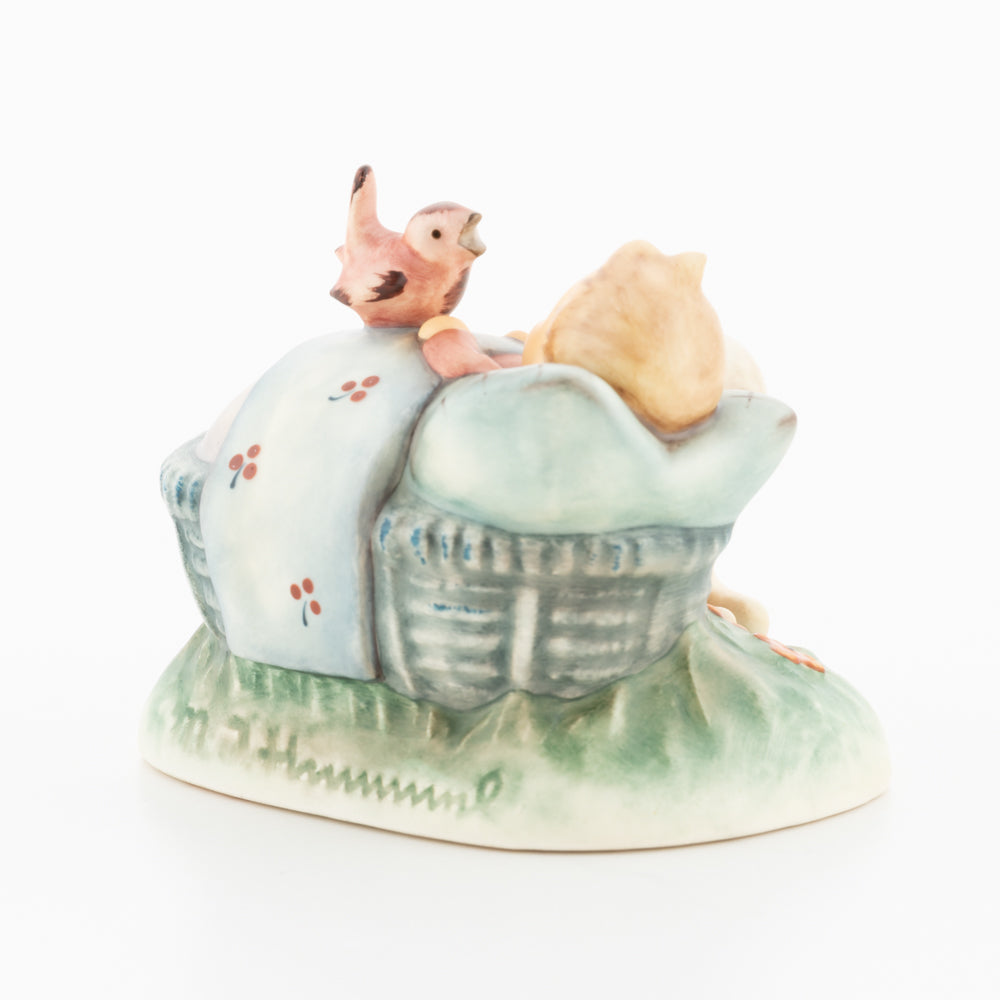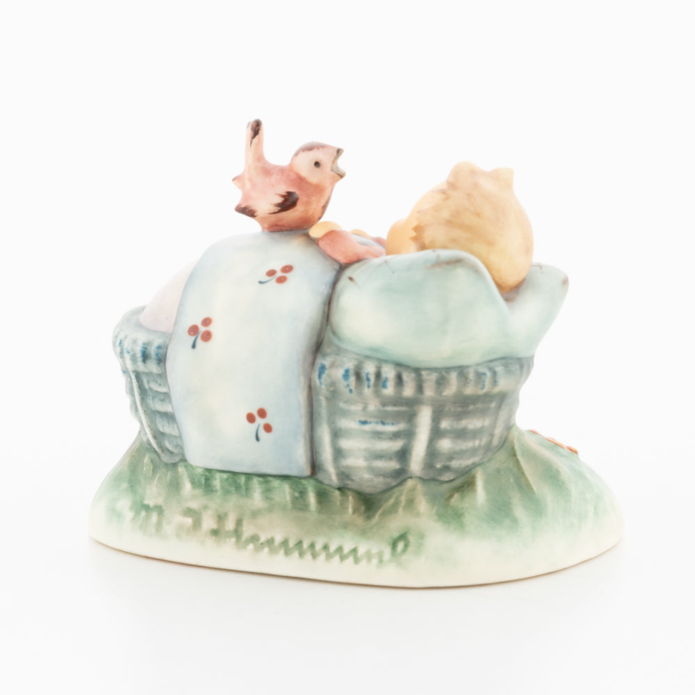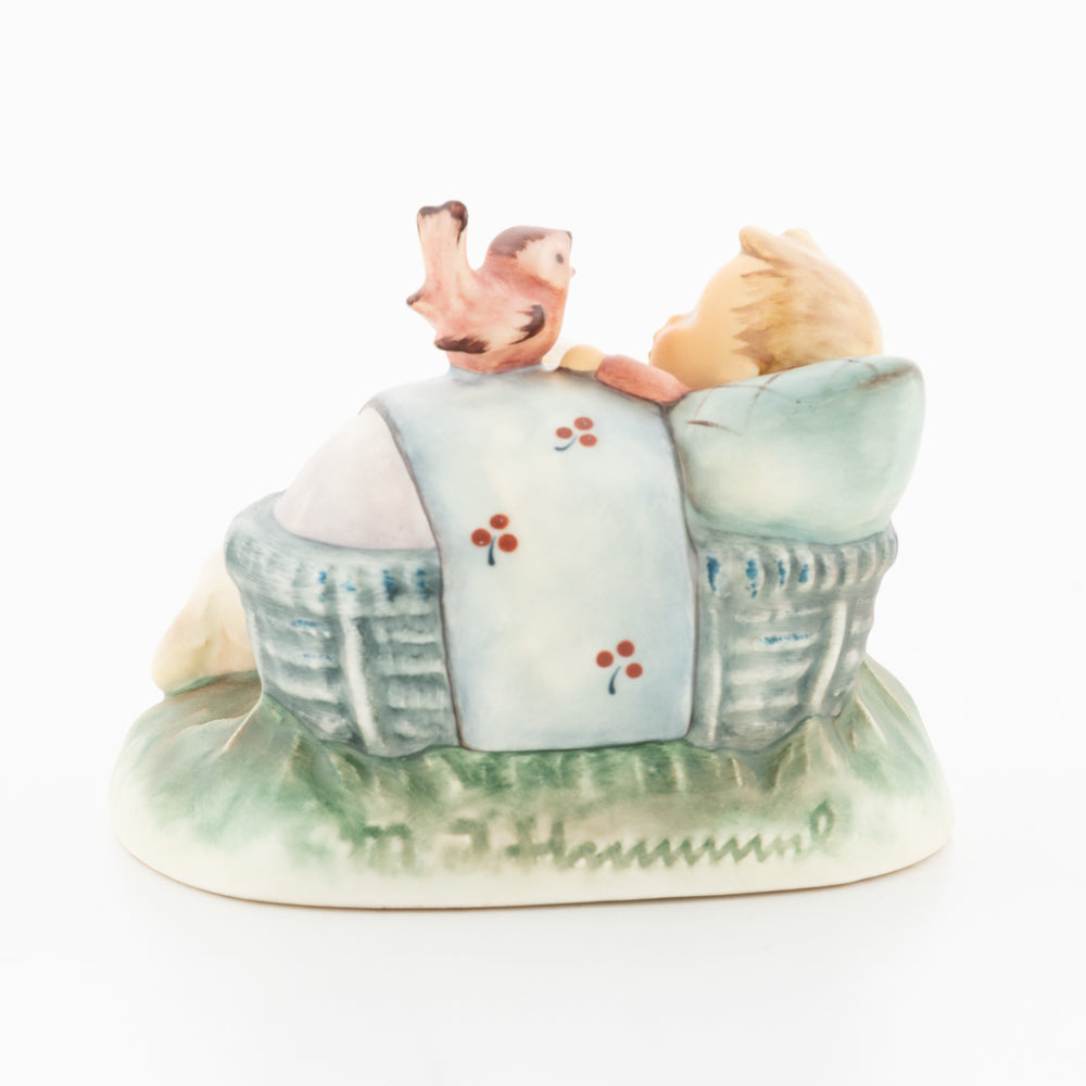 Warm gebettet liegt das Hummel-Baby in seiner Wiege. Ein munterer Vogel zwitschert ihm sein Lied und unterhält es damit auf das Schönste. Ein kleines Schaf leistet dem Kindlein Gesellschaft. „Wohl behütet“ heißt die Figur, die Meistermodelleur Gerhard Srkobek im Jahr 1991 gestaltete. Ein hübscher Blickfang in der Vitrine!