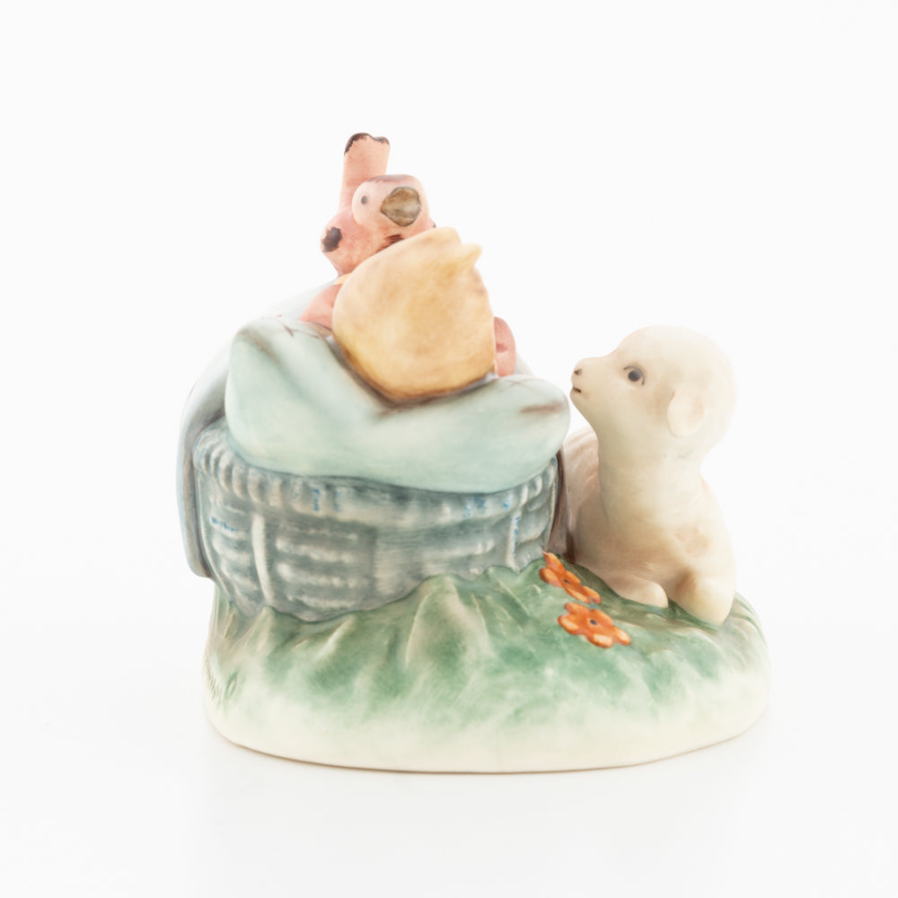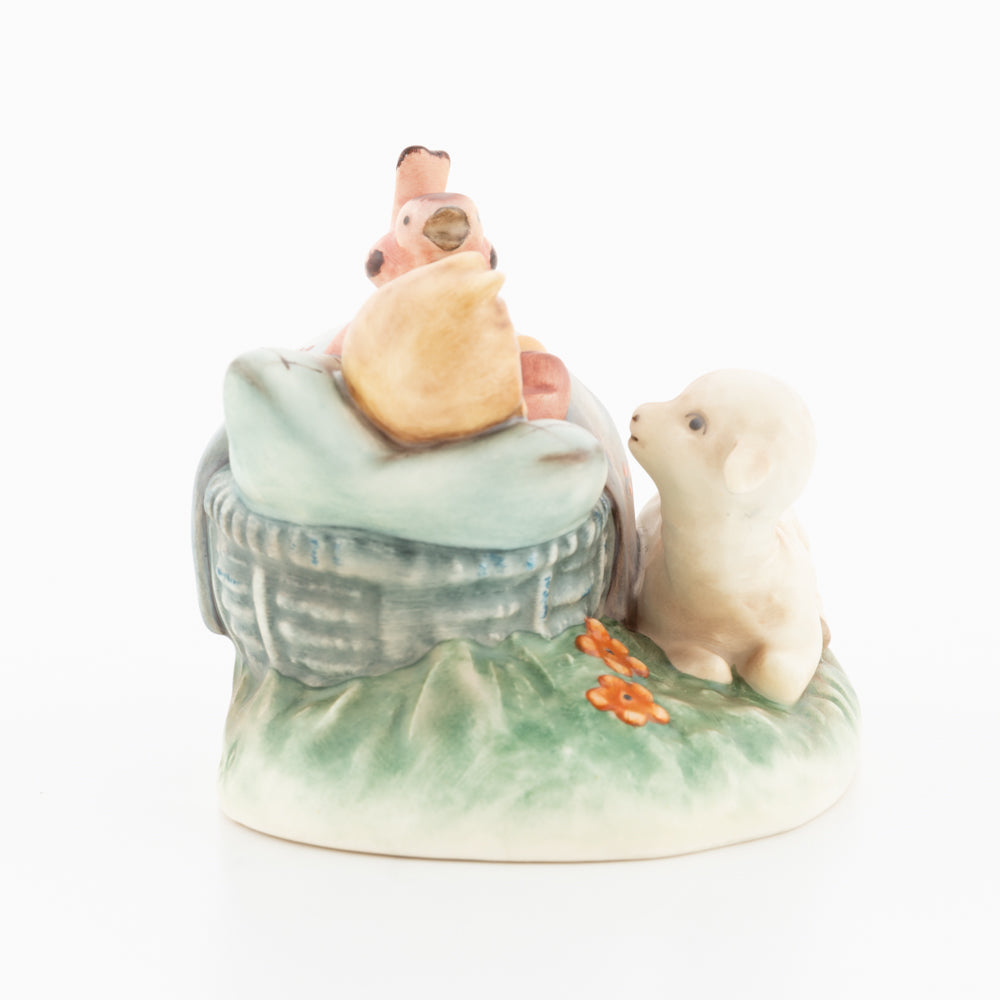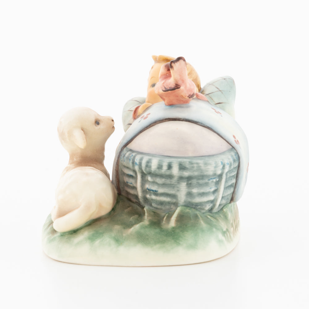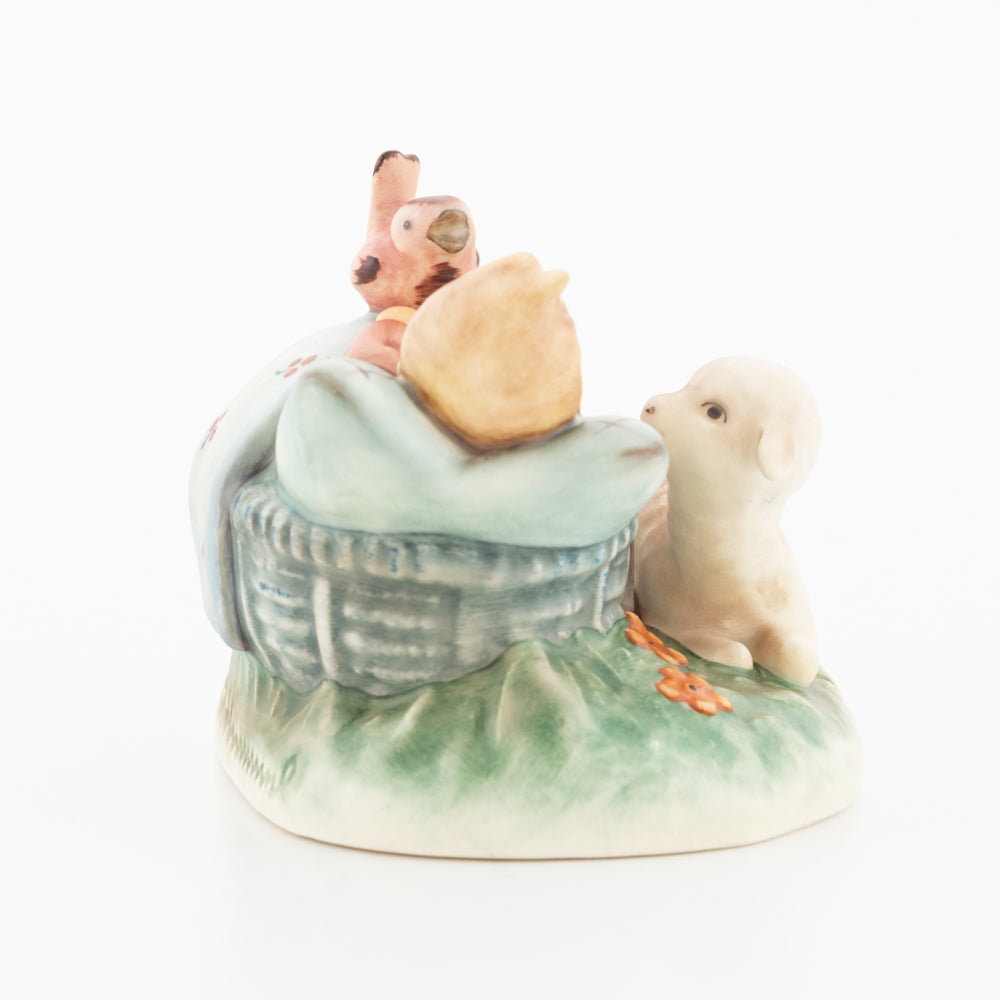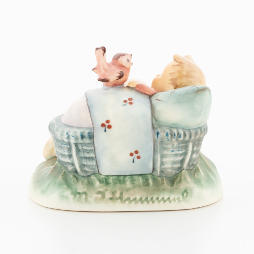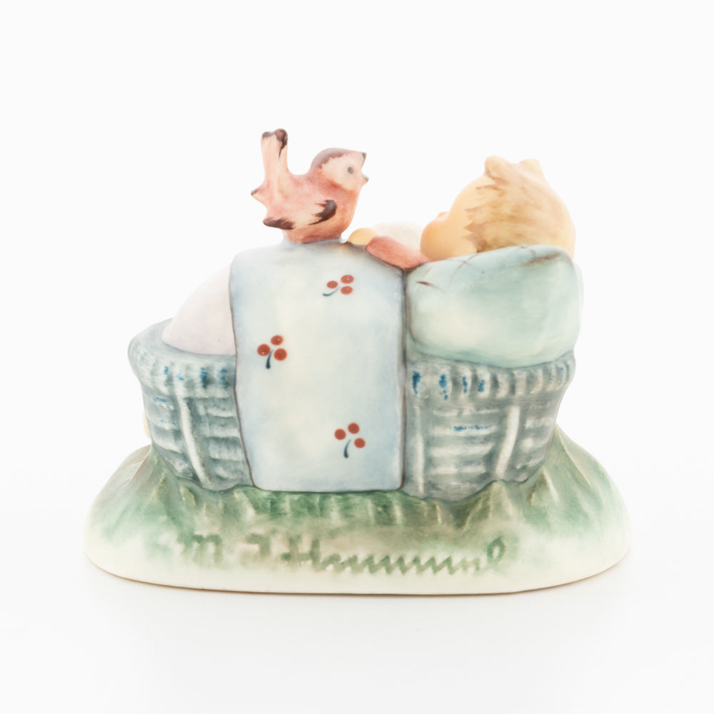 Warm gebettet liegt das Hummel-Baby in seiner Wiege. Ein munterer Vogel zwitschert ihm sein Lied und unterhält es damit auf das Schönste. Ein kleines Schaf leistet dem Kindlein Gesellschaft. „Wohl behütet“ heißt die Figur, die Meistermodelleur Gerhard Srkobek im Jahr 1991 gestaltete. Ein hübscher Blickfang in der Vitrine!