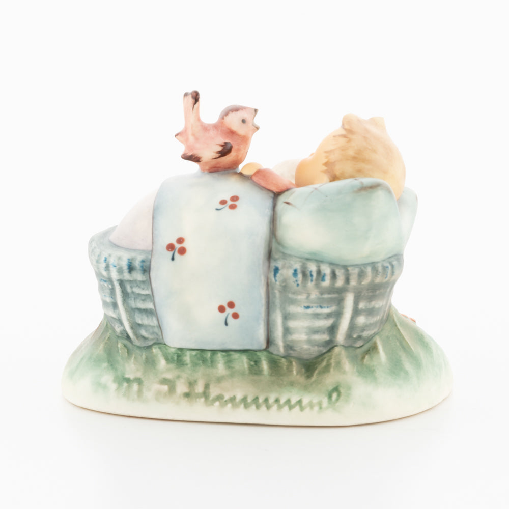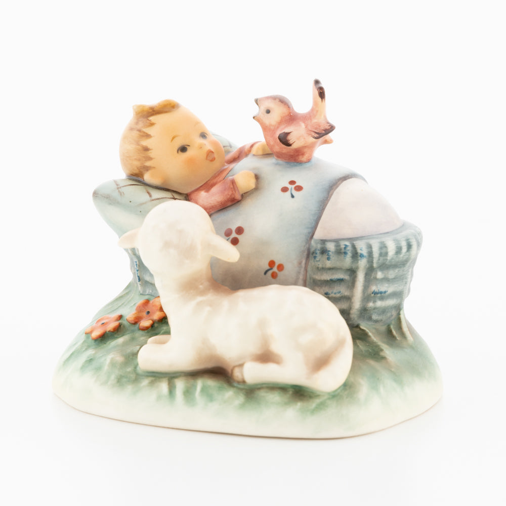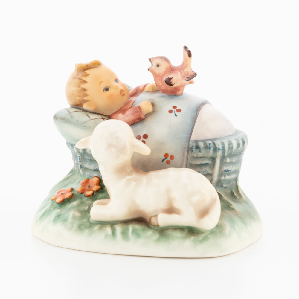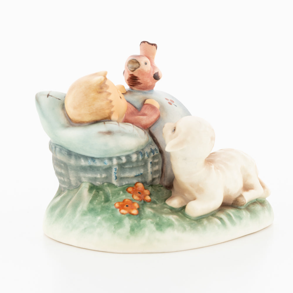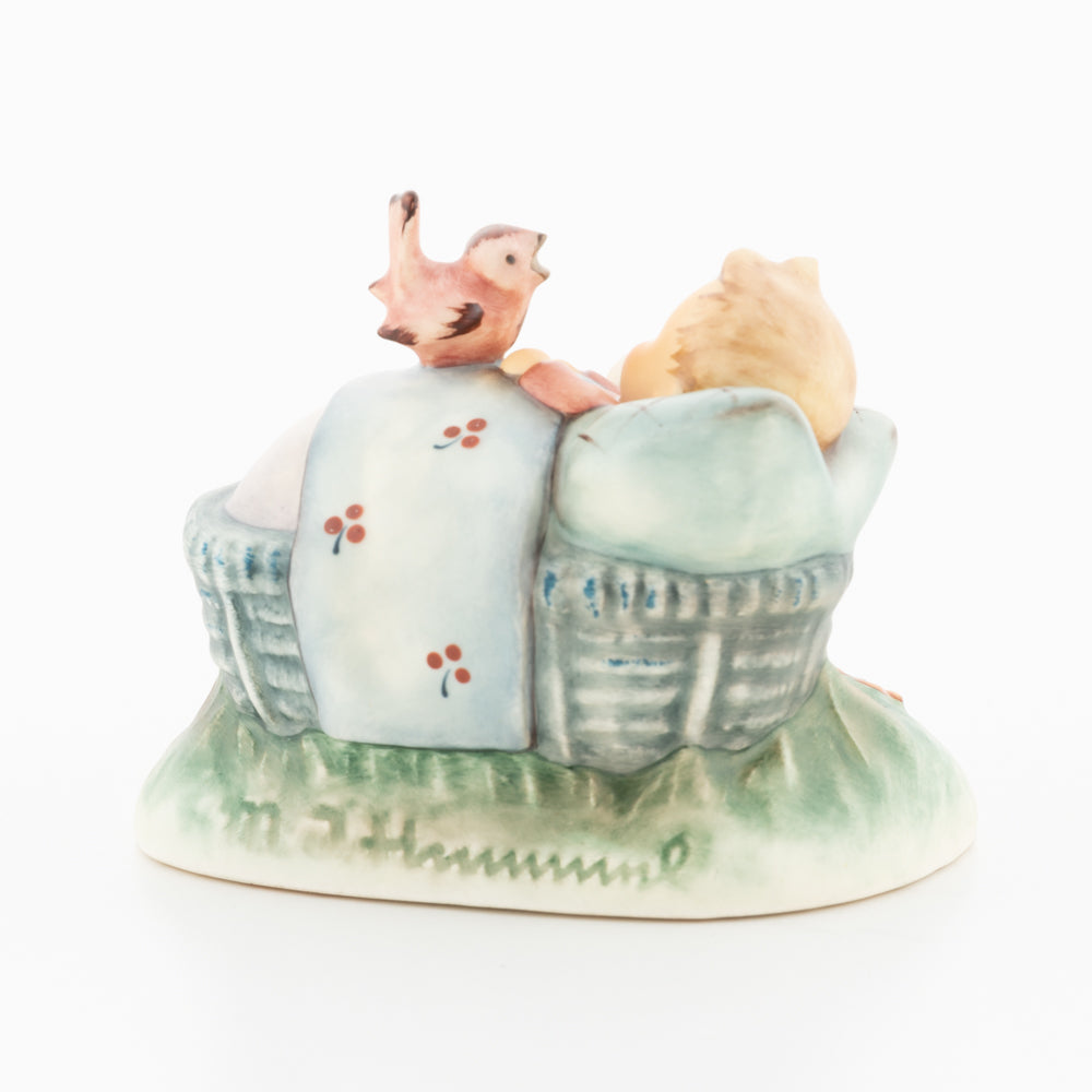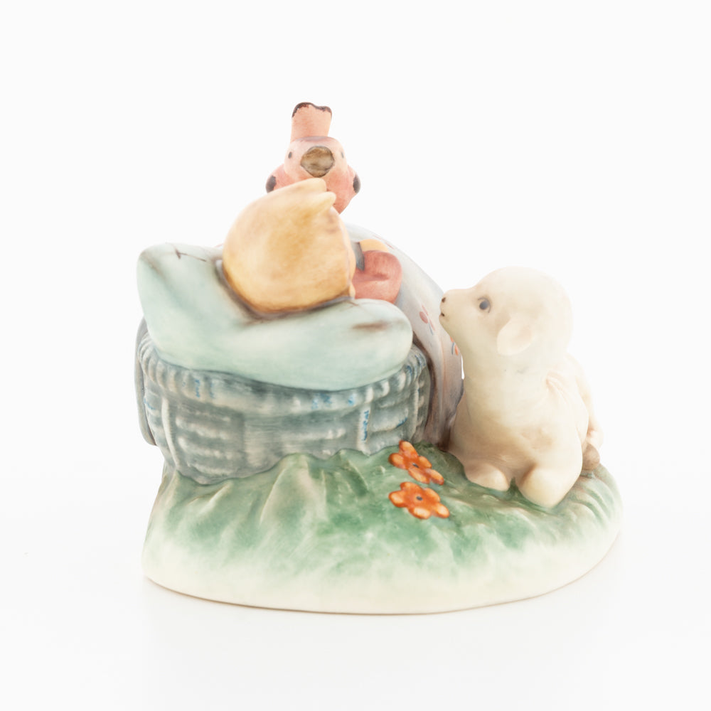 Warm gebettet liegt das Hummel-Baby in seiner Wiege. Ein munterer Vogel zwitschert ihm sein Lied und unterhält es damit auf das Schönste. Ein kleines Schaf leistet dem Kindlein Gesellschaft. „Wohl behütet“ heißt die Figur, die Meistermodelleur Gerhard Srkobek im Jahr 1991 gestaltete. Ein hübscher Blickfang in der Vitrine!