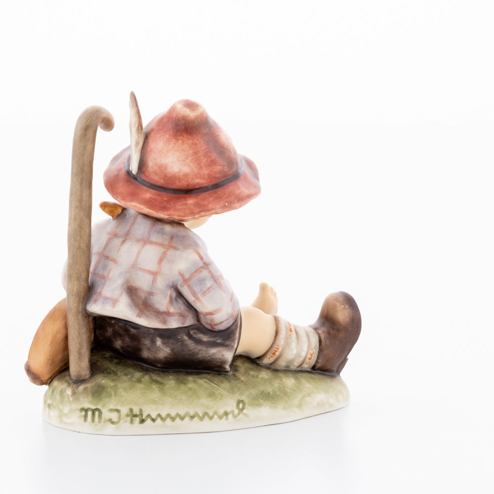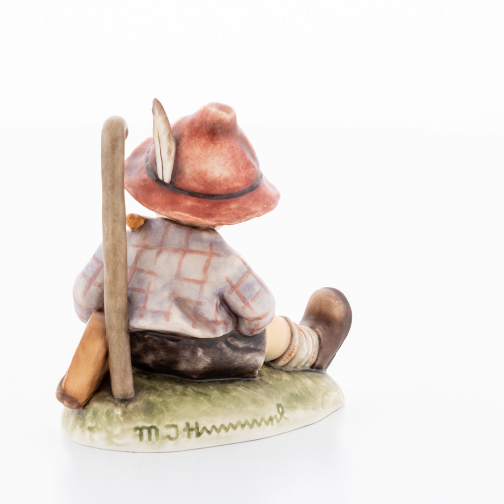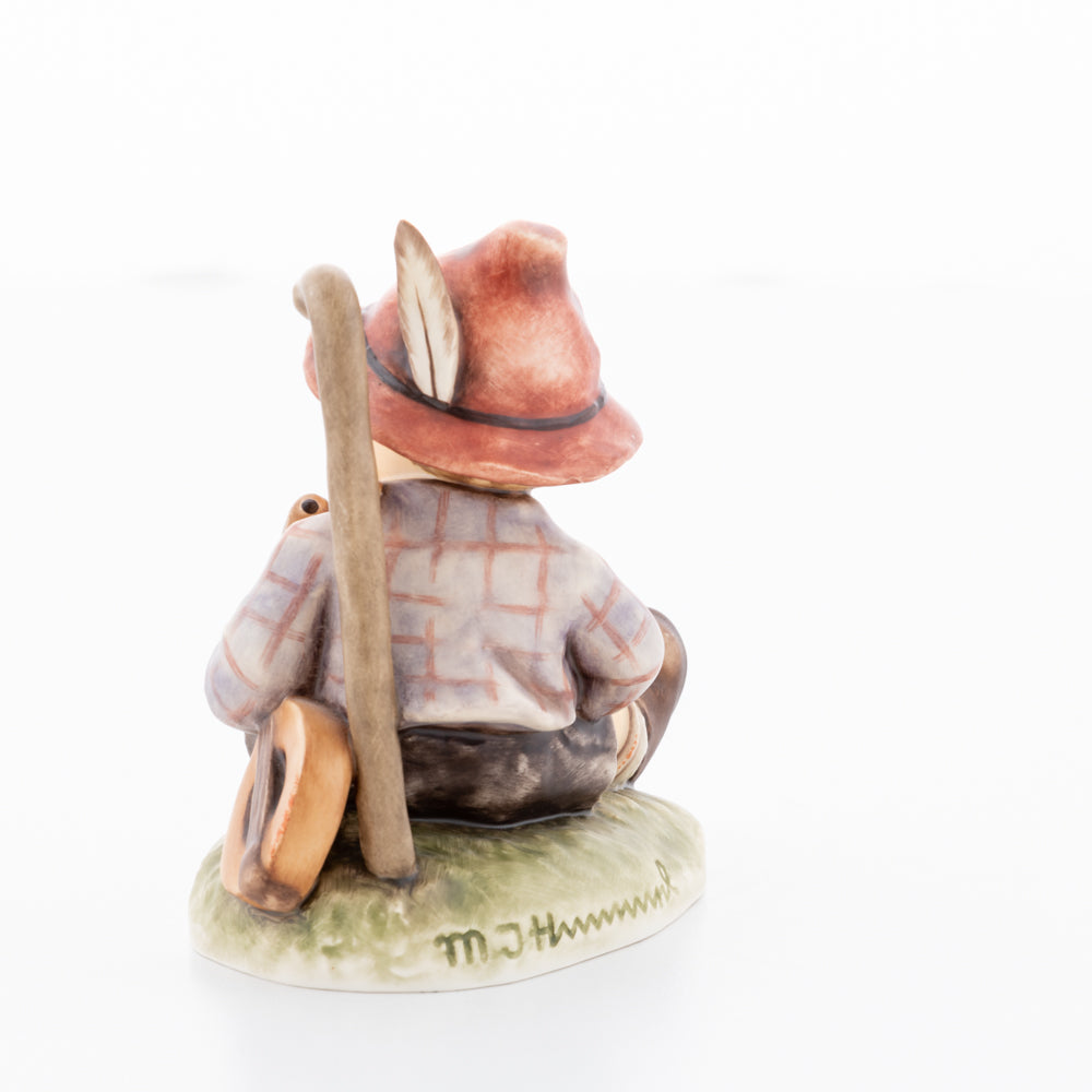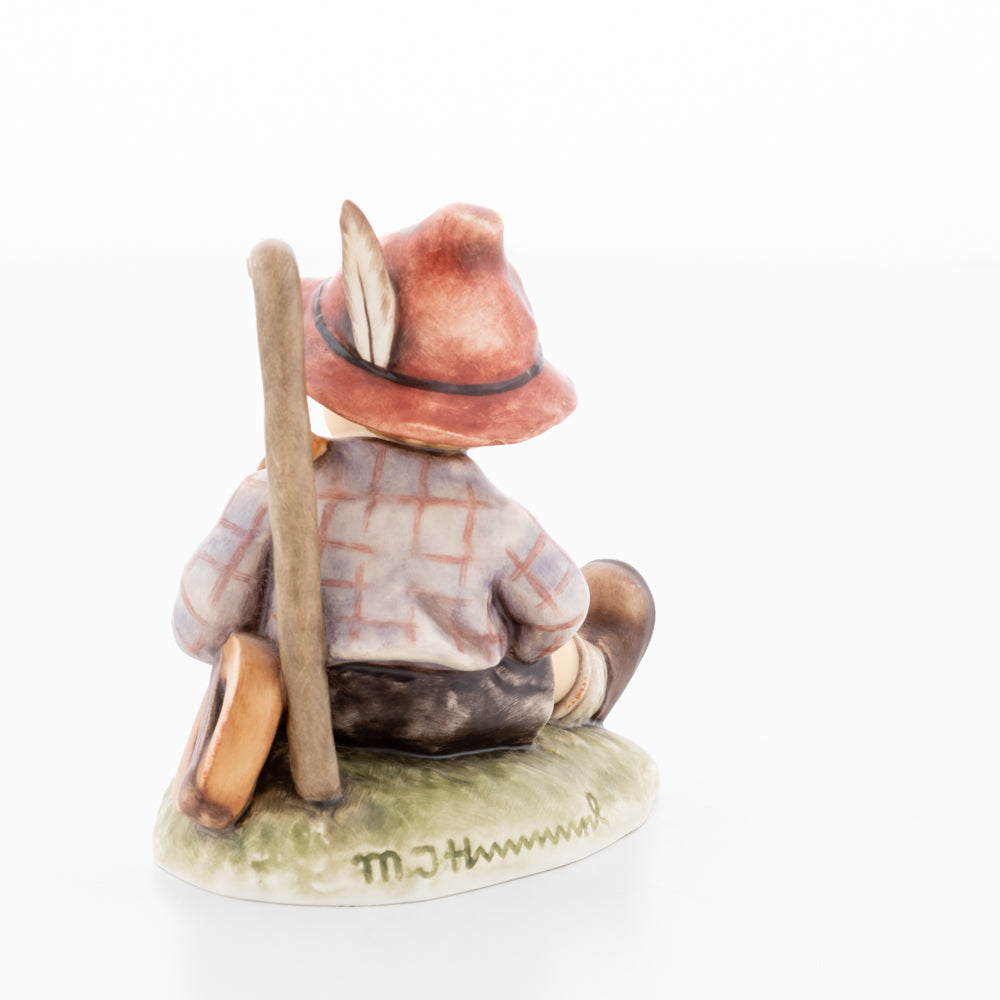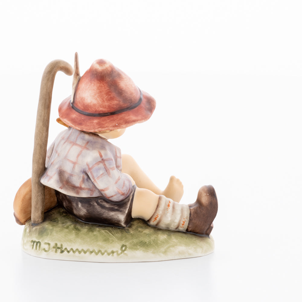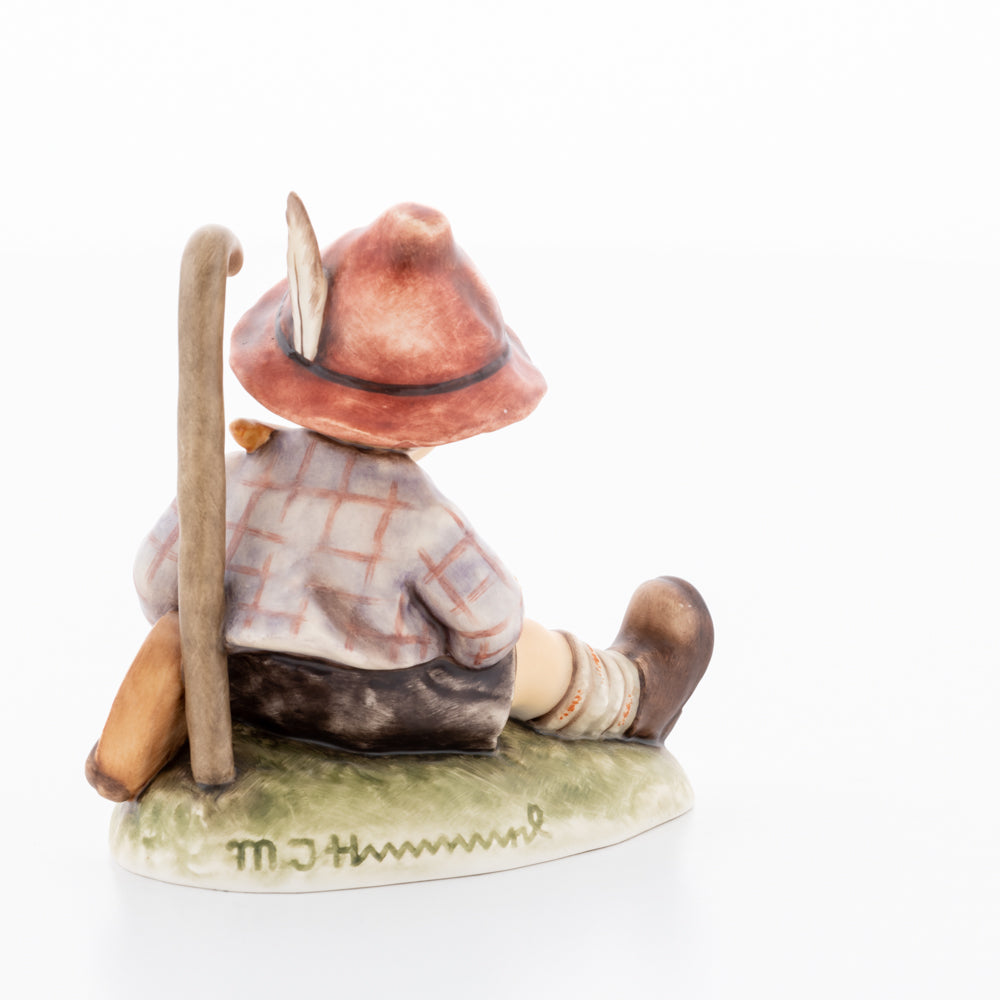 Wie der kleinen Hummel-Figur "So geh i net" ist es schon vielen Wanderern ergangen. Denn der kleine Geselle macht erst einmal Pause, um Strumpf und Schuh auszuziehen, damit ein wenig Luft an den lädierten Fußzeh kommt. Diese original M.I. Hummel-Figur wurde 1986 von Meistermodelleur Gerhard Skrobek geschaffen und verzaubert nun durch die typische Hummel-Optik nicht nur Wanderfreunde mit seinem Charme.