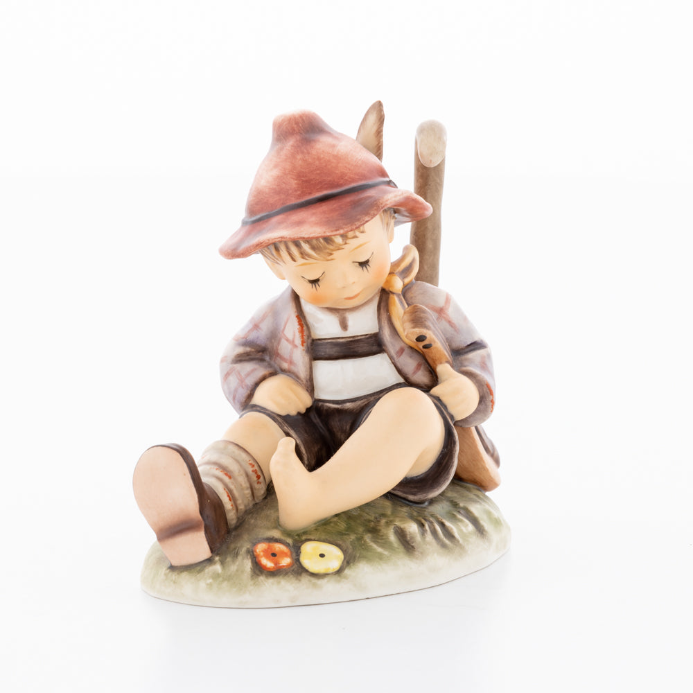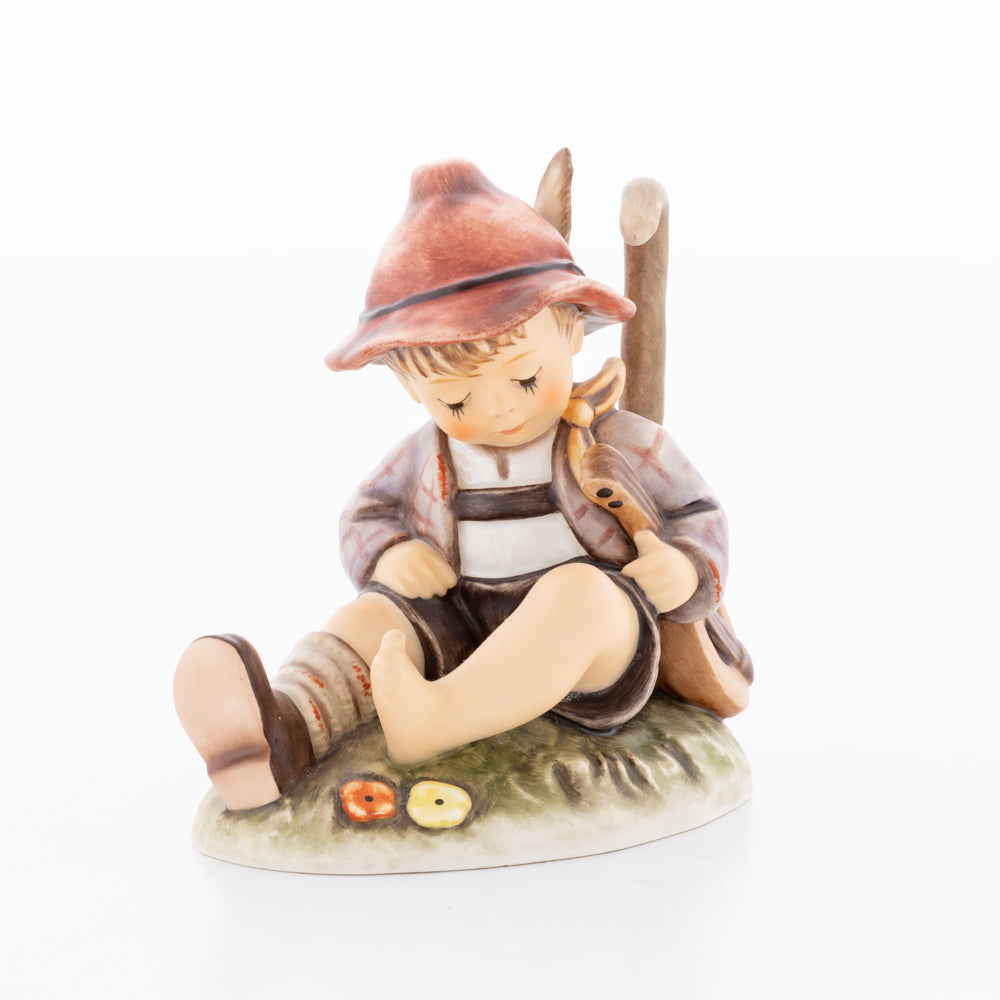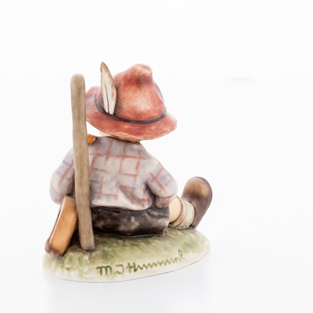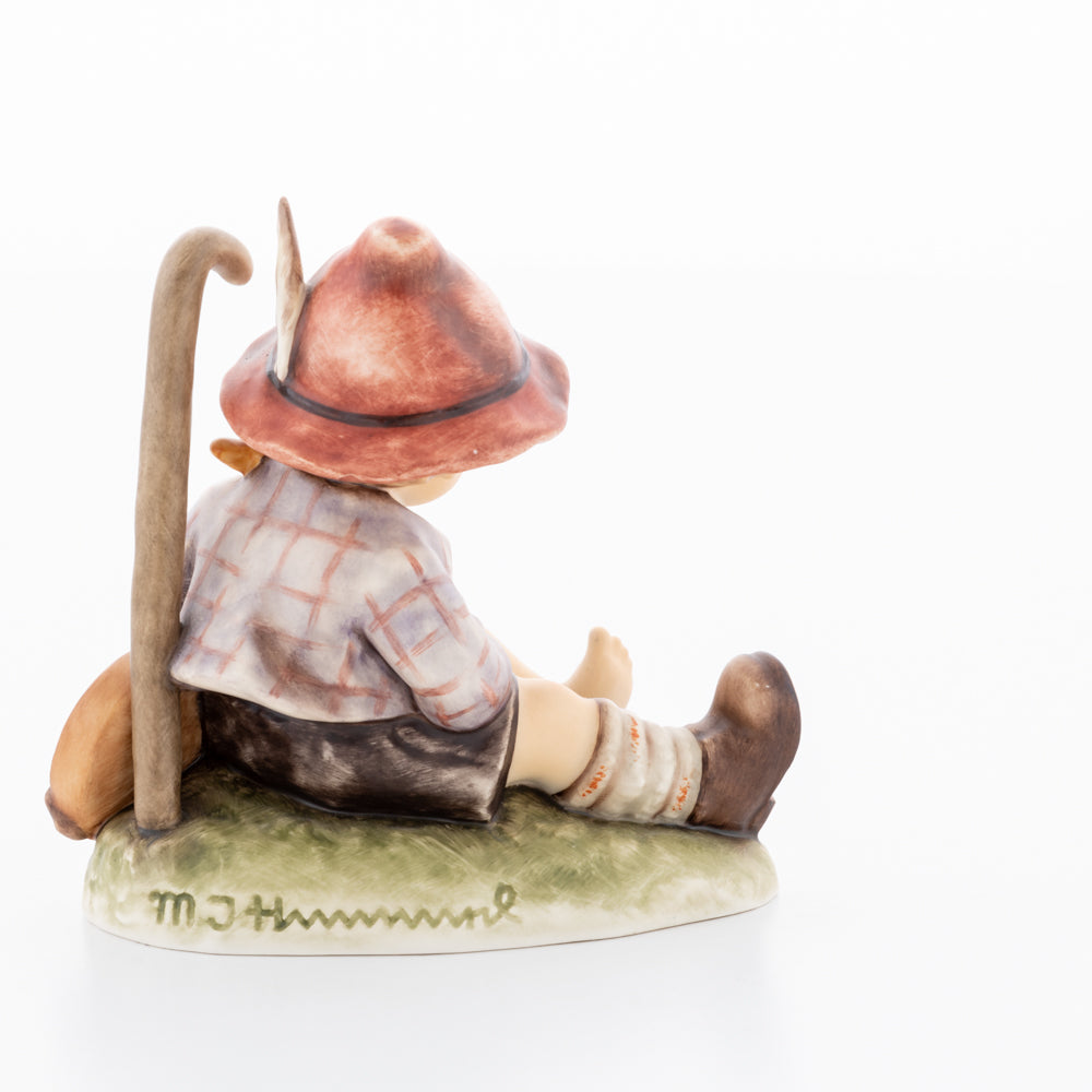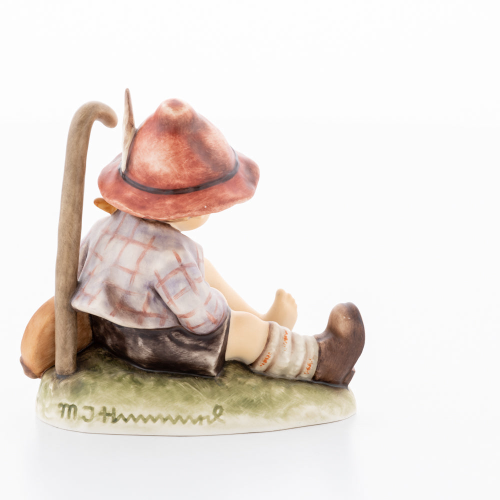 Wie der kleinen Hummel-Figur "So geh i net" ist es schon vielen Wanderern ergangen. Denn der kleine Geselle macht erst einmal Pause, um Strumpf und Schuh auszuziehen, damit ein wenig Luft an den lädierten Fußzeh kommt. Diese original M.I. Hummel-Figur wurde 1986 von Meistermodelleur Gerhard Skrobek geschaffen und verzaubert nun durch die typische Hummel-Optik nicht nur Wanderfreunde mit seinem Charme.