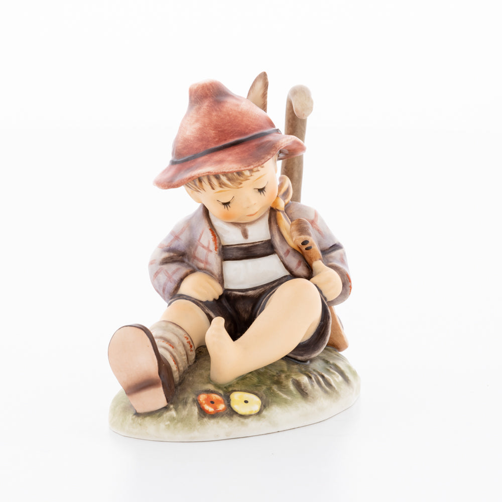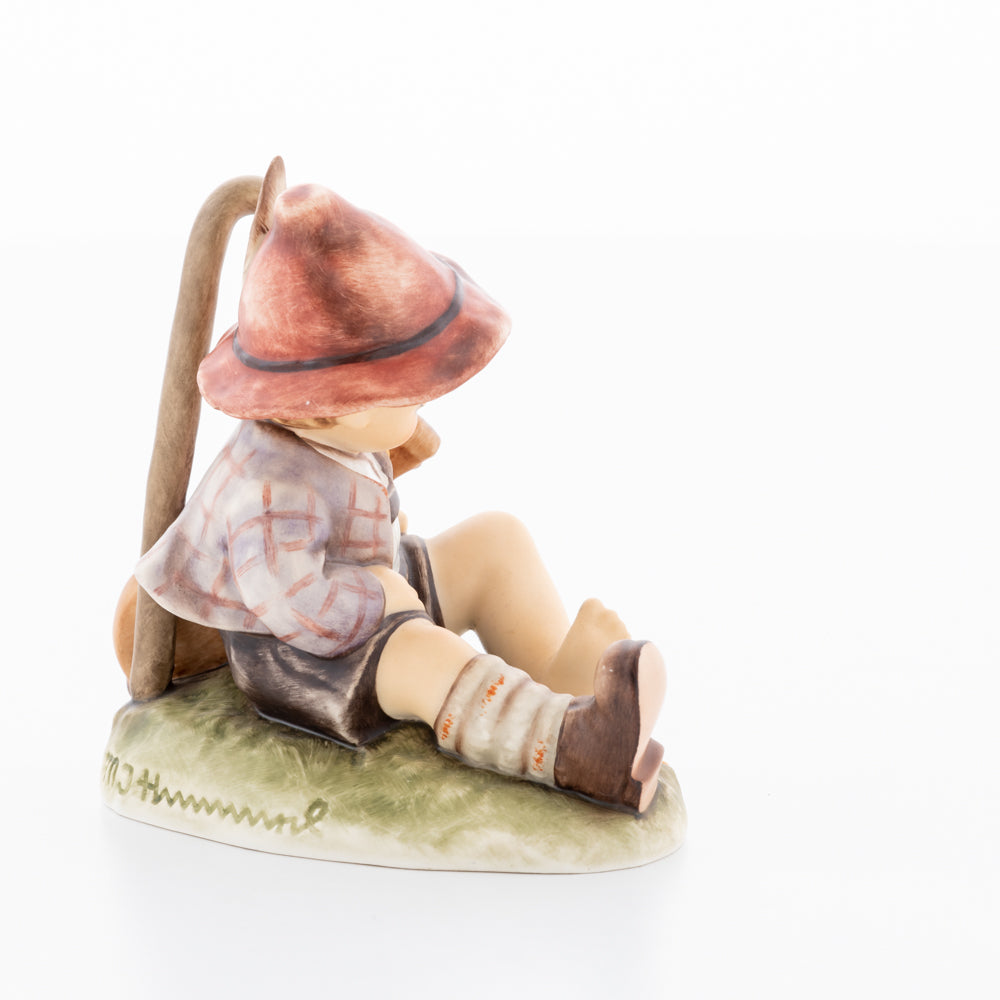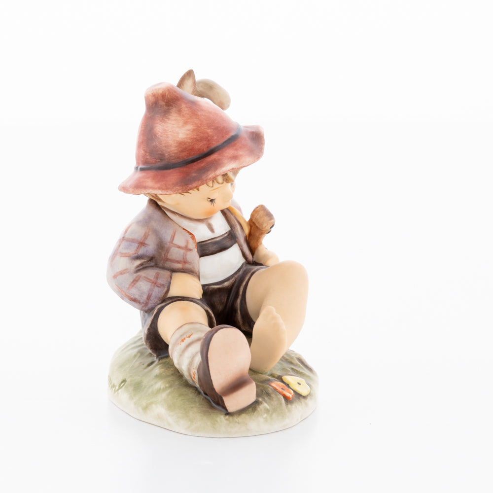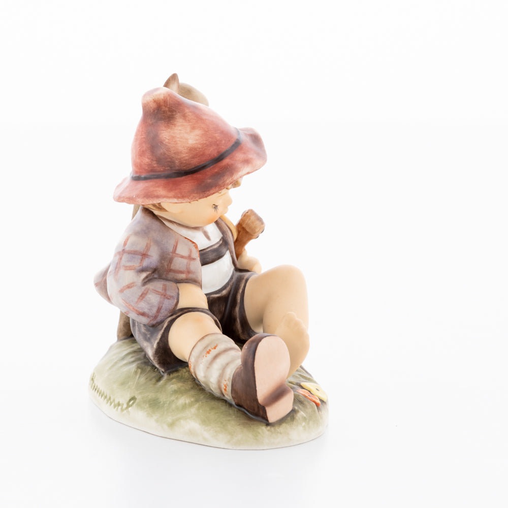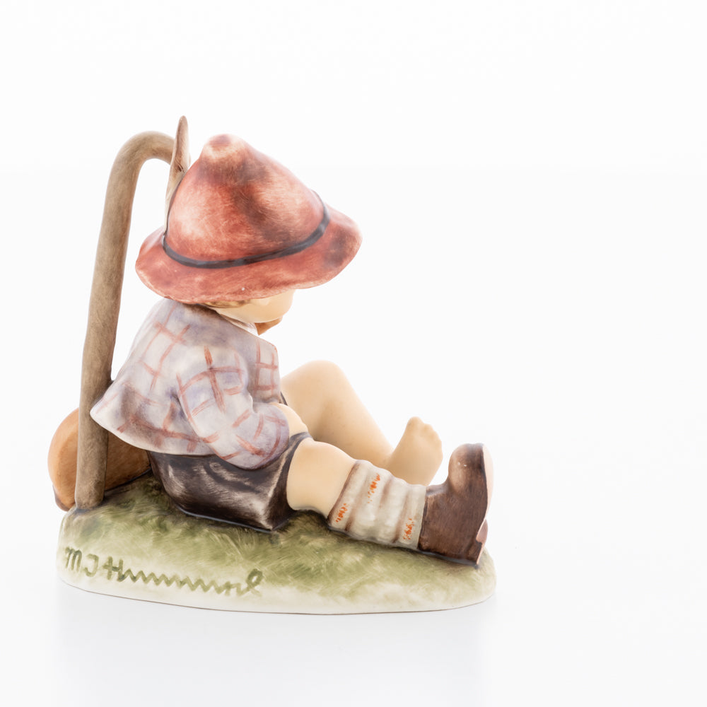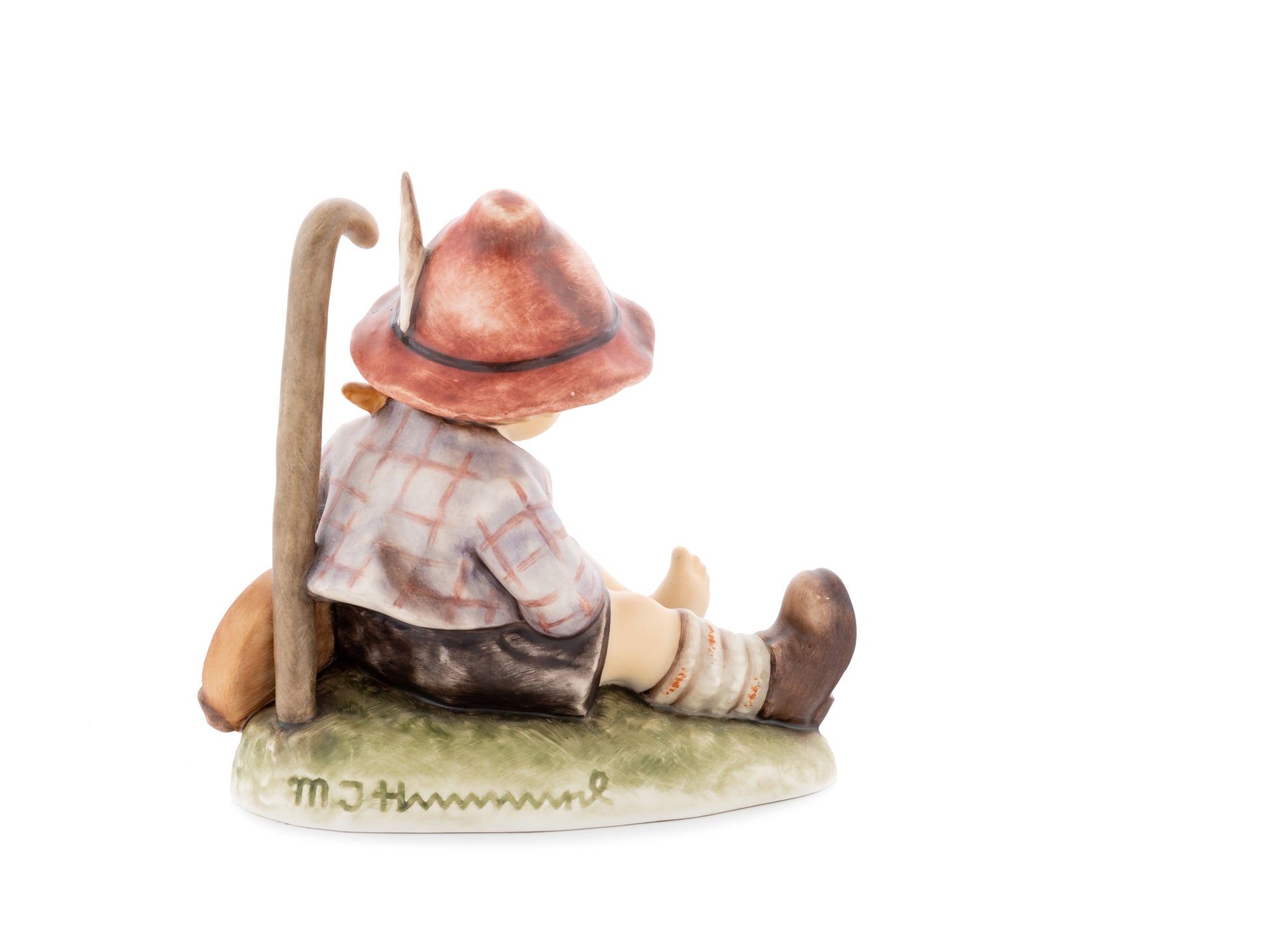 Wie der kleinen Hummel-Figur "So geh i net" ist es schon vielen Wanderern ergangen. Denn der kleine Geselle macht erst einmal Pause, um Strumpf und Schuh auszuziehen, damit ein wenig Luft an den lädierten Fußzeh kommt. Diese original M.I. Hummel-Figur wurde 1986 von Meistermodelleur Gerhard Skrobek geschaffen und verzaubert nun durch die typische Hummel-Optik nicht nur Wanderfreunde mit seinem Charme.