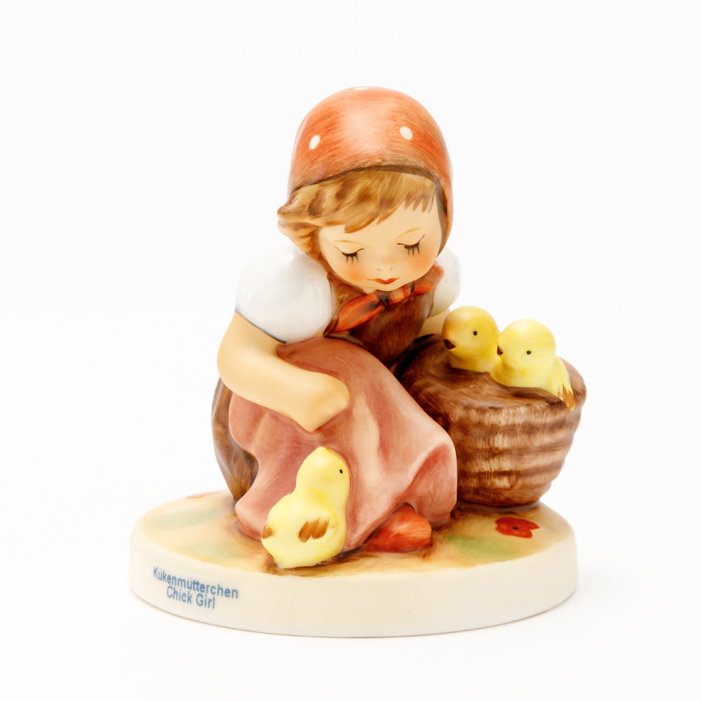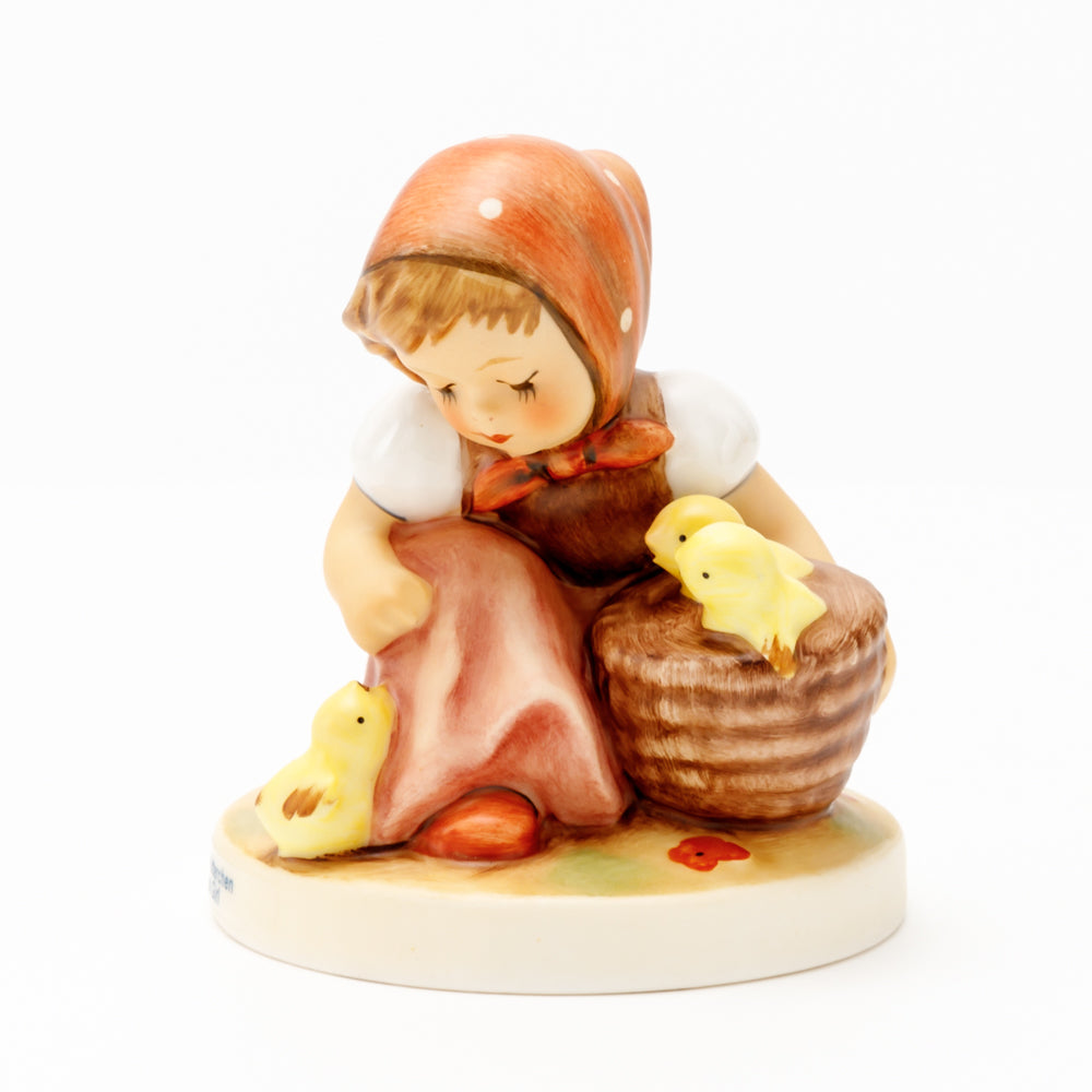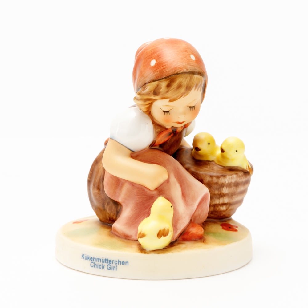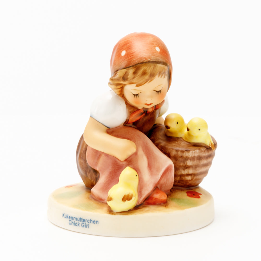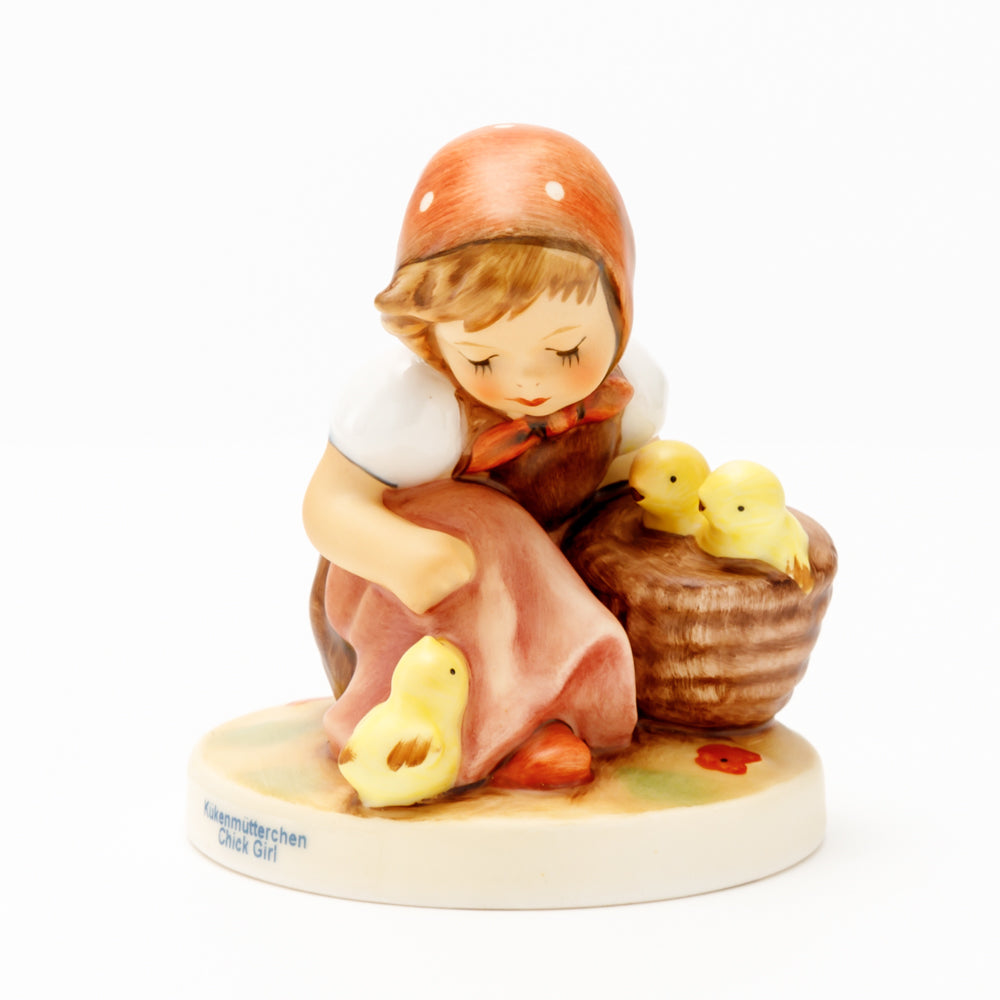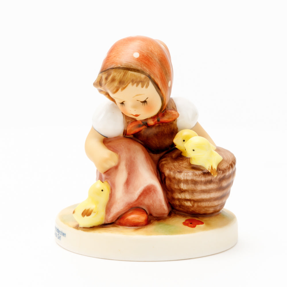 Das erste „Kükenmütterchen“-Modell stammt von Reinhold Unger aus dem Jahr 1936, wurde aber von Gerhard Skrobek 1964 umgestaltet. In dieser Version ist es seither erhältlich und hat sich im Laufe der Zeit zu einem echten Hummel-Klassiker gemausert. Besonders lieblich sind natürlich die kleinen gelben Küken dargestellt. Aber auch die leicht geröteten Wangen, der Korb und das rote Kopftuch verzaubern Hummel-Freunde und -Liebhaber auf der ganzen Welt. Kleine Größen der Figur enthalten zwei Küken im Korb, während bei Größe 57/I drei Küken im Korb sitzen. Diese Größe 57 2/0 kam erstmals 1985 auf den Markt.